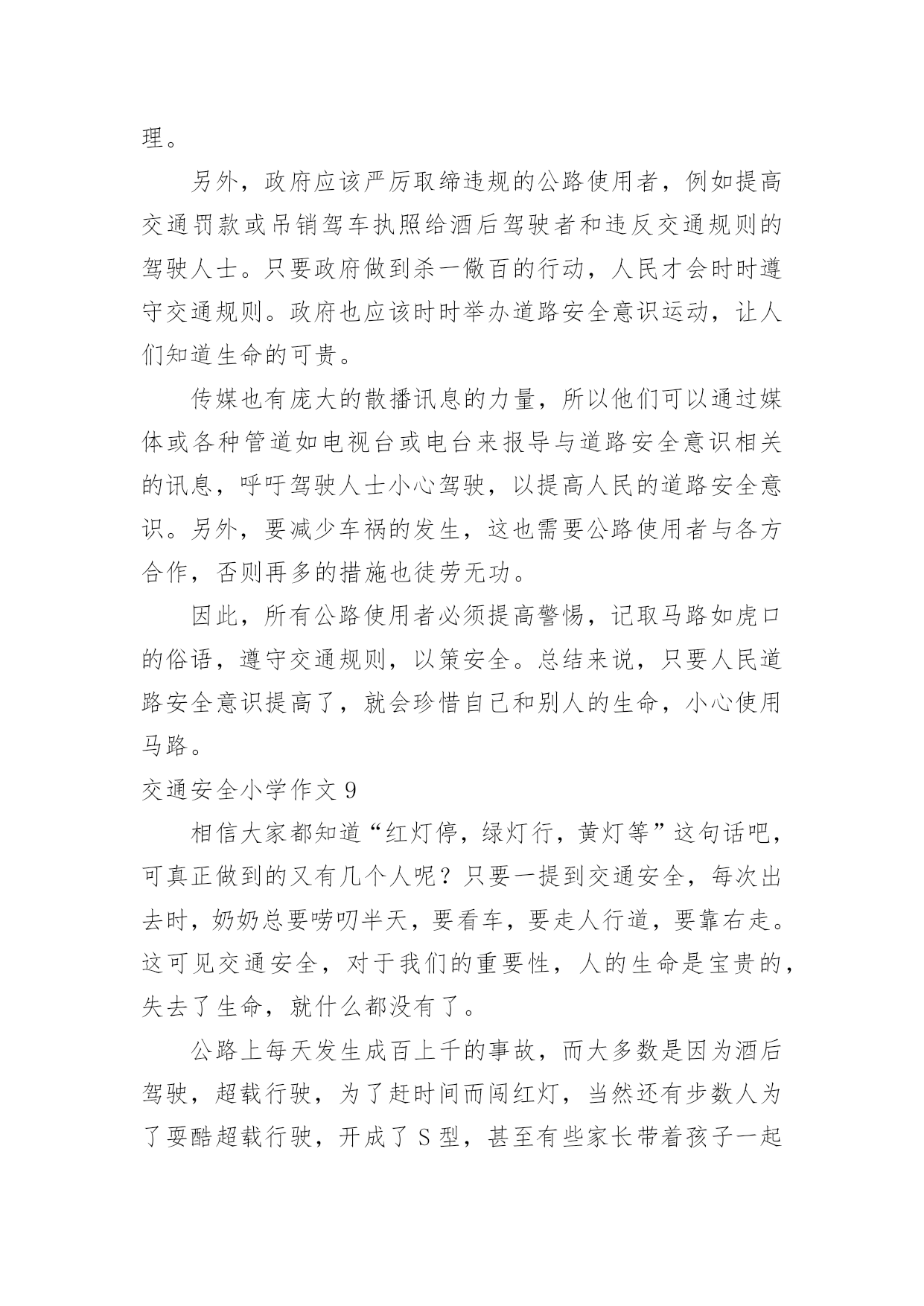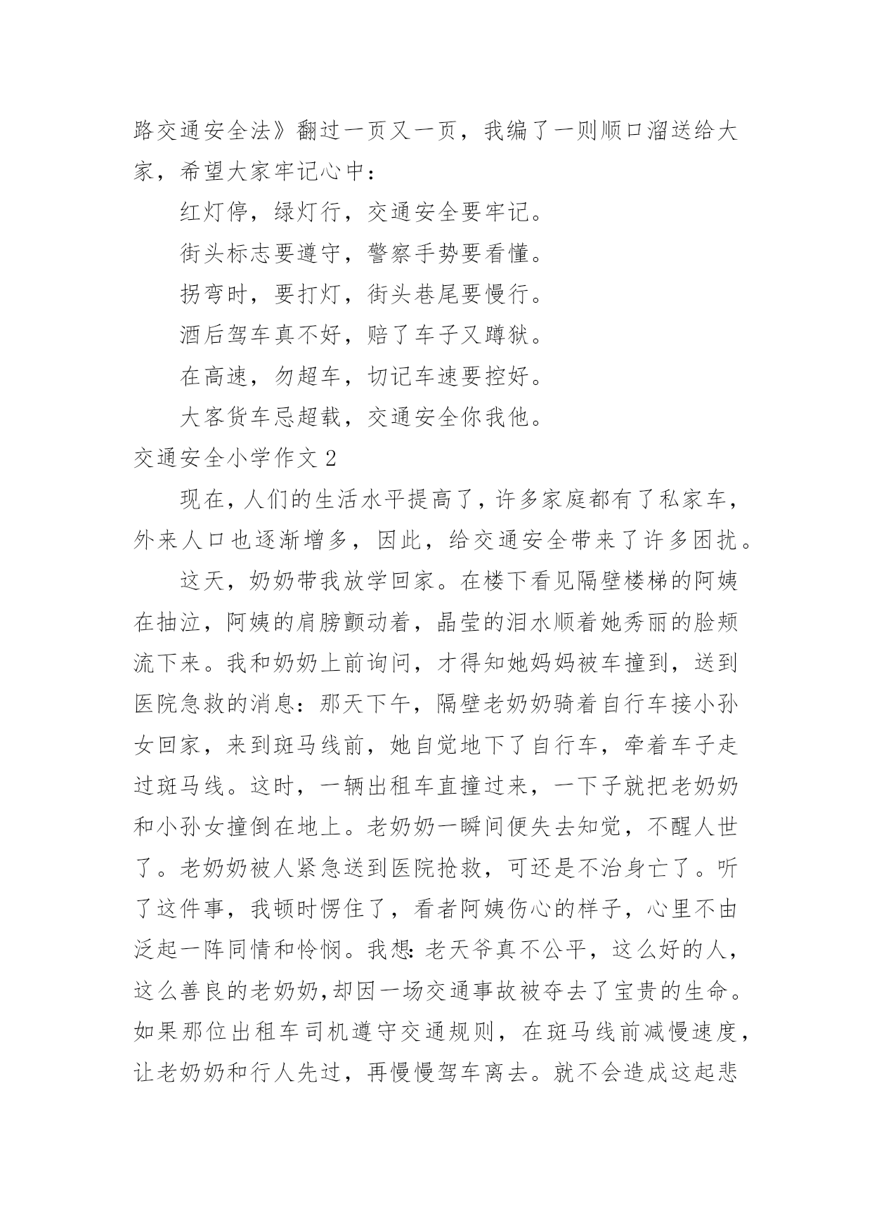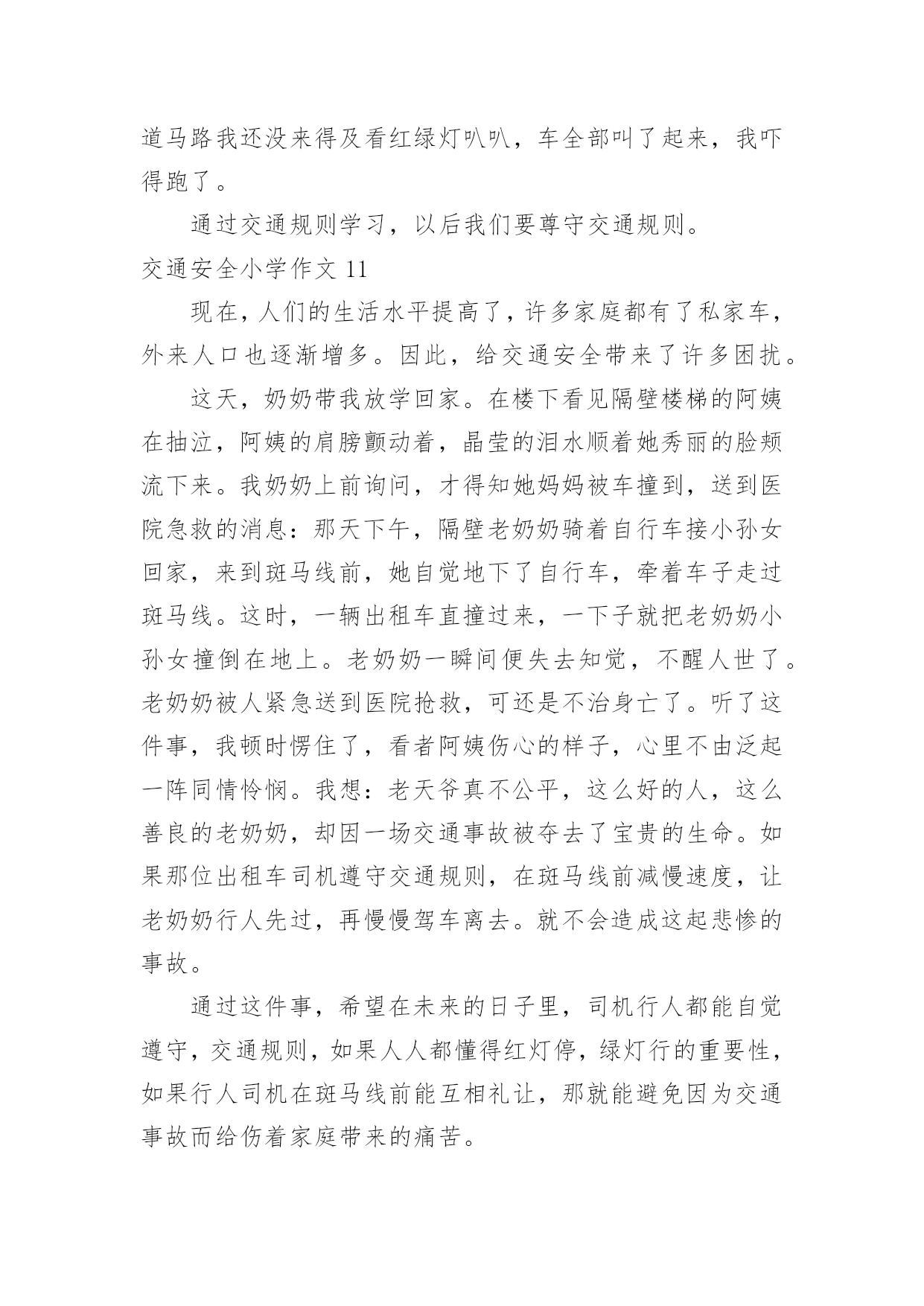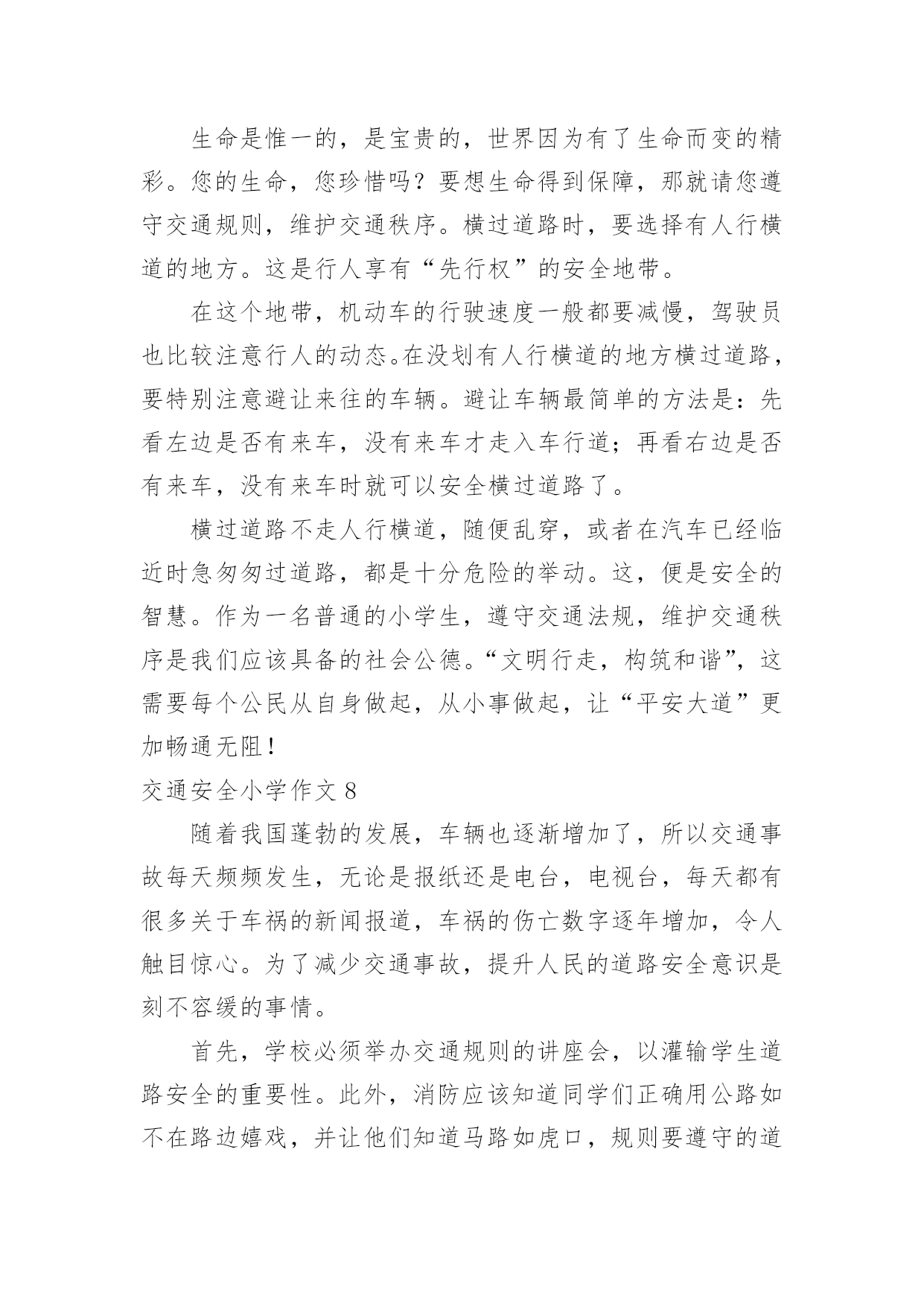 交通安全小学作文交通安全小学作文无论是身处学校还是步入社会,大家都尝试过写作文吧,作文要求篇章结构完整,一定要避免无结尾作文的出现。那么,怎么去写作文呢?下面是小编精心整理的交通安全小学作文,欢迎大家分享。交通安全小学作文1人们的生命总是一去不返,所以我们必须珍惜宝贵的生命,但有时让你丧失生命的却是一场小小的车祸。所以我们要行动起来,把交通安全永远记在心里。今天晚上,我正在收看新闻联播,发现了一起重大的交通事故——在高速公路上有十五辆车连撞造成人员伤亡,这是谁引起的交通事故?还是我们没有遵守交通规则呢?还有时,一些人为了赶时间还常常违章驾驶,我真为那些违章驾驶的人感到可耻,自己为了赶时间,把那一些无辜的人也牵连进来,让他们也受到伤害。有时在上学的路上,我总看见一些驾驶员趁着交警不注意的情况下闯红灯,他们都带着侥幸的心理想蒙混过关。但要是出了交通事故,就要你负责了。俗话说得好“不怕一万,只怕万一。”所以请大家不要因为时间急而闯红灯。闯红灯是一件多么“愚蠢”的事情呀!想到这里,我不禁从书柜里翻出一本书来:《机动车道路交通安全法》翻过一页又一页,我编了一则顺口溜送给大家,希望大家牢记心中:红灯停,绿灯行,交通安全要牢记。街头标志要遵守,警察手势要看懂。拐弯时,要打灯,街头巷尾要慢行。酒后驾车真不好,赔了车子又蹲狱。在高速,勿超车,切记车速要控好。大客货车忌超载,交通安全你我他。交通安全小学作文2现在,人们的生活水平提高了,许多家庭都有了私家车,外来人口也逐渐增多,因此,给交通安全带来了许多困扰。这天,奶奶带我放学回家。在楼下看见隔壁楼梯的阿姨在抽泣,阿姨的肩膀颤动着,晶莹的泪水顺着她秀丽的脸颊流下来。我和奶奶上前询问,才得知她妈妈被车撞到,送到医院急救的消息:那天下午,隔壁老奶奶骑着自行车接小孙女回家,来到斑马线前,她自觉地下了自行车,牵着车子走过斑马线。这时,一辆出租车直撞过来,一下子就把老奶奶和小孙女撞倒在地上。老奶奶一瞬间便失去知觉,不醒人世了。老奶奶被人紧急送到医院抢救,可还是不治身亡了。听了这件事,我顿时愣住了,看者阿姨伤心的样子,心里不由泛起一阵同情和怜悯。我想:老天爷真不公平,这么好的人,这么善良的老奶奶,却因一场交通事故被夺去了宝贵的生命。如果那位出租车司机遵守交通规则,在斑马线前减慢速度,让老奶奶和行人先过,再慢慢驾车离去。就不会造成这起悲惨的事故。通过这件事,希望在未来的日子里,司机和行人都能自觉遵守,交通规则,如果人人都懂得红灯停,绿灯行的重要性,如果行人和司机在斑马线前能互相礼让,那就能避免因为交通事故而给伤着家庭带来的痛苦。交通安全小学作文3交通安全无人不知,无人不晓。但就是这样家喻户晓的法则,许多人不重视,每年都有不少人因为交通事故而让生命划上句号。寒假时,我经常步行去公交车站坐车。在这期间,我发现了不少安全隐患。有一次,一位叔叔为了赶上公交车,一路小跑,他的脸因为赶路微微泛红,嘴里也哈出厚厚的白气,可能是急着去上班吧。他没走斑马线,直接斜穿过马路,这时一辆飞奔的汽车刚好从他身边擦肩而过。我的心提到了嗓子眼,心里真为他捏一把汗,好在有惊无险。虽然这次没有酿成交通事故,但也让我深深体会到“生命宝贵”。我真想对这位叔叔说,不要因为赶时间就无视交通规则,要是出了事,你的家人该有多伤心呀!交通事故往往都是人为的不遵守交通规则造成的。当你骑着车在马路上追逐,当你与伙伴在马路上玩耍时,危险就在身边;当你的亲朋好友不顾一切乱穿马路、闯红灯的时候,死神正在向他们招手……生命只有一次,它是多么宝贵啊!因此,我向每一位同学呼吁:珍惜生命,遵守交通规则。希望同学们高高兴兴上学,平平安安回家!交通安全小学作文4在生活中,左右看,不在路上跑和玩。看见红灯停一停,看见绿灯向前行。幼时,爸爸妈妈常常教导我,不要在马路上玩,不要闯红在学校里,老师也常常教育我们,人车各行其道,走路要走人行道,不要闯红灯,要遵守交通法规。学校也经常举行交通安全活动,让我们收获不少。最近,我也有那一幅惊人的交通故事:那一天,我放学回家,在那个十字路口,我正要过马路,啊,绿灯了,我向左右看了看,见没汽车,就向前走去,只听“唔”的一声,我向右边一看,一辆汽车正向我飞奔而来,我进退两难,这辆车好像并没有停下来,显然,他在闯红灯,我往后一退,那辆汽车在我面前绝尘而去,尾气害得我呛了几下,我回头一看,那辆车已无影无踪,好险哪!后来,我又在报纸上看到了几则重大交通事故:8月6日,沪昆高速特大交通事故至17人死亡。8月9日傍晚,在日湖公园旁的人行道上,13岁的蓉蓉被出租车撞了,在昏迷中……现在我已经将交通规则牢牢地记在心上:当我们走在繁忙的大街上,我会拉着爸爸妈妈的手,靠街道的右边走;穿过马路时,我们先左右看再走在斑马线上;有一天,爸爸送我上学,嗨!又是红灯,虽然我心
