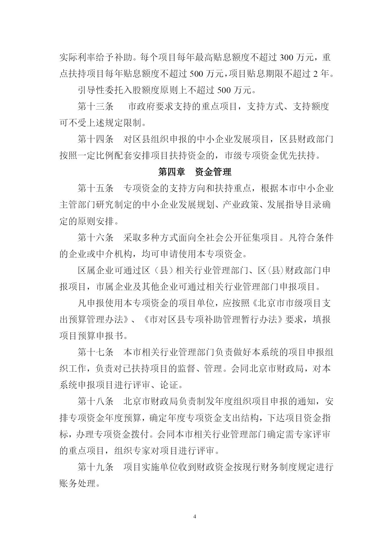 北京市支持中小企业发展专项资金管理暂行办法第一章总则第一条为促进我市中小企业发展,改善中小企业外部经营环境,规范中小企业发展专项资金管理,根据《中华人民共和国预算法》、《中华人民共和国中小企业促进法》和财政预算管理的有关规定,制定本办法。第二条北京市支持中小企业发展专项资金(以下简称专项资金)由北京市财政局在本级预算中安排。中央财政安排专用于支持我市中小企业发展的相关资金纳入专项资金管理。各区县财政部门应建立本区县支持中小企业发展的专项资金,在同级预算中安排。第三条本办法所称中小企业,是指在本市行政区域内依法设立,具有法人资格,有利于满足社会需要,增加就业,符合国家产业政策,生产经营规模属于中小型的各种所有制和各种形式的企业。第四条中小企业的划分标准,按照原国家经贸委、原国家发展计划委员会、财政部、国家统计局联合下发的《中小企业标准暂行规定》(国经贸中小企[2003]143号)执行。第五条专项资金的使用应符合市政府确定的产业和区域发展政策及我市经济发展总体规划,坚持公开、公正、公平的原则,确保专项资金的规范、安全和高效使用。第六条专项资金由北京市财政局会同本市中小企业主管部门及相关行业管理部门,按照职责明确、管理科学、分工合作、强化监督的运作机制共同管理。第七条专项资金的管理使用应起到鼓励和引导各级政府、金融机构、社会资本等多方面资金,共同支持中小企业发展的作用。第二章资金的使用范围第八条专项资金使用范围,主要包括以下项目:(一)中小企业信用担保体系建设项目,支持对象为以中小企业融资担保为主业的信用担保机构,主要包括:1、对中小企业担保机构弥补代偿损失;2、支持中小企业再担保事业发展;3、完善我市中小企业信用担保体系的其他事项。(二)中小企业服务体系建设项目,指为支持中小企业发展构建的具有平台式公共服务职能的服务机构的项目,主要包括:1、为中小企业提供创业辅导、管理、信息、咨询等服务的综合性项目;2、为中小企业提供共性技术及专业化服务的项目;3、中小企业公共服务平台改造、扩建项目;4、促进中小企业公共服务体系建设的其他项目。(三)扶持中小企业发展项目的范围,主要包括:1、拥有自主知识产权的技术创新项目;2、利用先进适用技术改造传统产业项目;3、新技术推广、新产品开发、产业技术成果转化项目;4、为大企业协作配套、专业化发展项目;5、开拓国际市场项目;6、开展特色经营和业态创新、采用新的经营方式和管理技术提升管理水平的项目;7、采用现代流通方式整合社会资源,发展符合政府引导方向的便民服务类项目;8、推进绿色经营和绿色消费,符合发展循环经济的项目;9、市政府要求扶持的其他项目。(四)中小企业清洁生产项目,主要包括:1、实施中小企业清洁生产改造项目;2、组织开展中小企业清洁生产审核项目;3、中小企业清洁生产技术、信息和服务平台项目;4、推进我市中小企业清洁生产工作的其他事项。(五)市政府要求扶持中小企业发展的其他事项。第九条专项资金重点支持为中小企业发展提供信用担保、公共服务平台建设项目,以及中小型高新技术企业具有自主知识产权的技术创新和产业技术成果转化项目。第三章资金支持方式第十条专项资金具体扶持方式,主要有银行贷款贴息、财政拨款补助和引导性委托入股方式:银行贷款贴息,主要用于企业技术改造,以及形成较大产业化规模效益的科技成果转化项目。财政拨款补助,主要用于企业技术研究开发成果转化、新产品研制、公共技术、服务平台建设、企业技术中心、孵化器建设等项目。引导性委托入股,主要用于符合重点发展的产业方向,能较快形成产业规模和经济效益的产业化开发项目。第十一条已享受市政府其他专项资金支持的项目,专项资金在同一年度内不再予以支持。第十二条专项资金支持标准为:财政拨款补助额度,原则上不超过该企业的注册资本金额,最高补助金额不超过200万元。银行贷款贴息额度,根据项目贷款额度及人民银行公布的同期贷款利率确定,项目贷款利率低于人民银行公布的同期贷款利率的,按实际利率给予补助。每个项目每年最高贴息额度不超过300万元,重点扶持项目每年贴息额度不超过500万元,项目贴息期限不超过2年。引导性委托入股额度原则上不超过500万元。第十三条市政府要求支持的重点项目,支持方式、支持额度可不受上述规定限制。第十四条对区县组织申报的中小企业发展项目,区县财政部门按照一定比例配套安排项目扶持资金的,市级专项资金优先扶持。第四章资金管理第十五条专项资金的支持方向和扶持重点,根据本市中小企业主管部门研究制定的中小企业发展规划、产业政策、发展指导目录确定的原则安排。第十六条采取多种方式面向全社会公开征集项目。凡符合条件的企业或中介机构,均可申请使用本专项资金。区