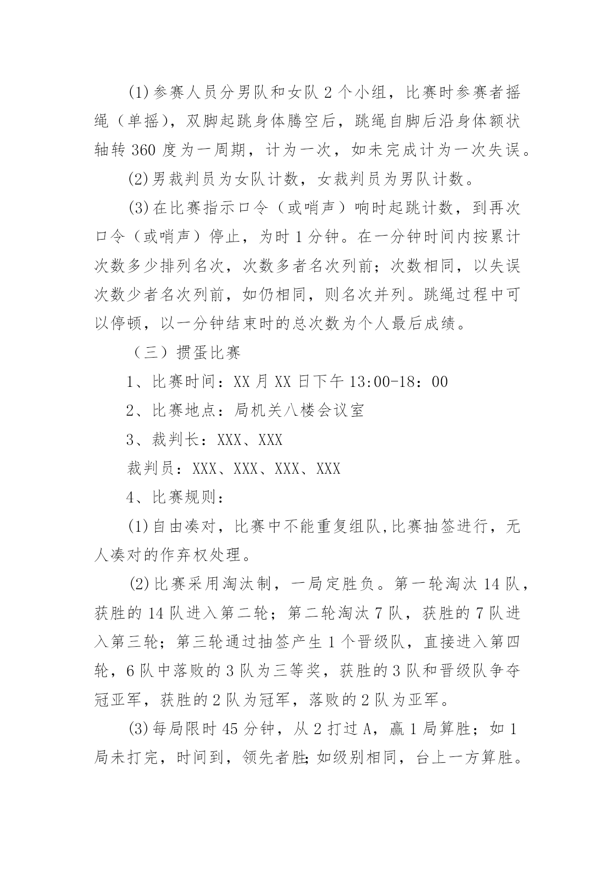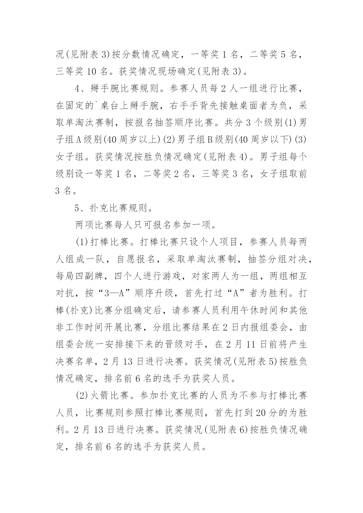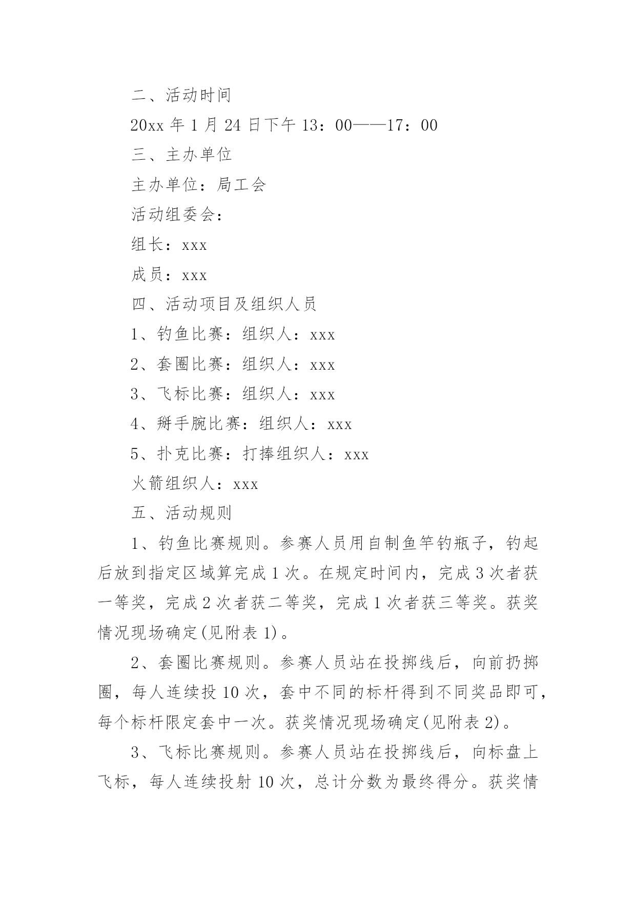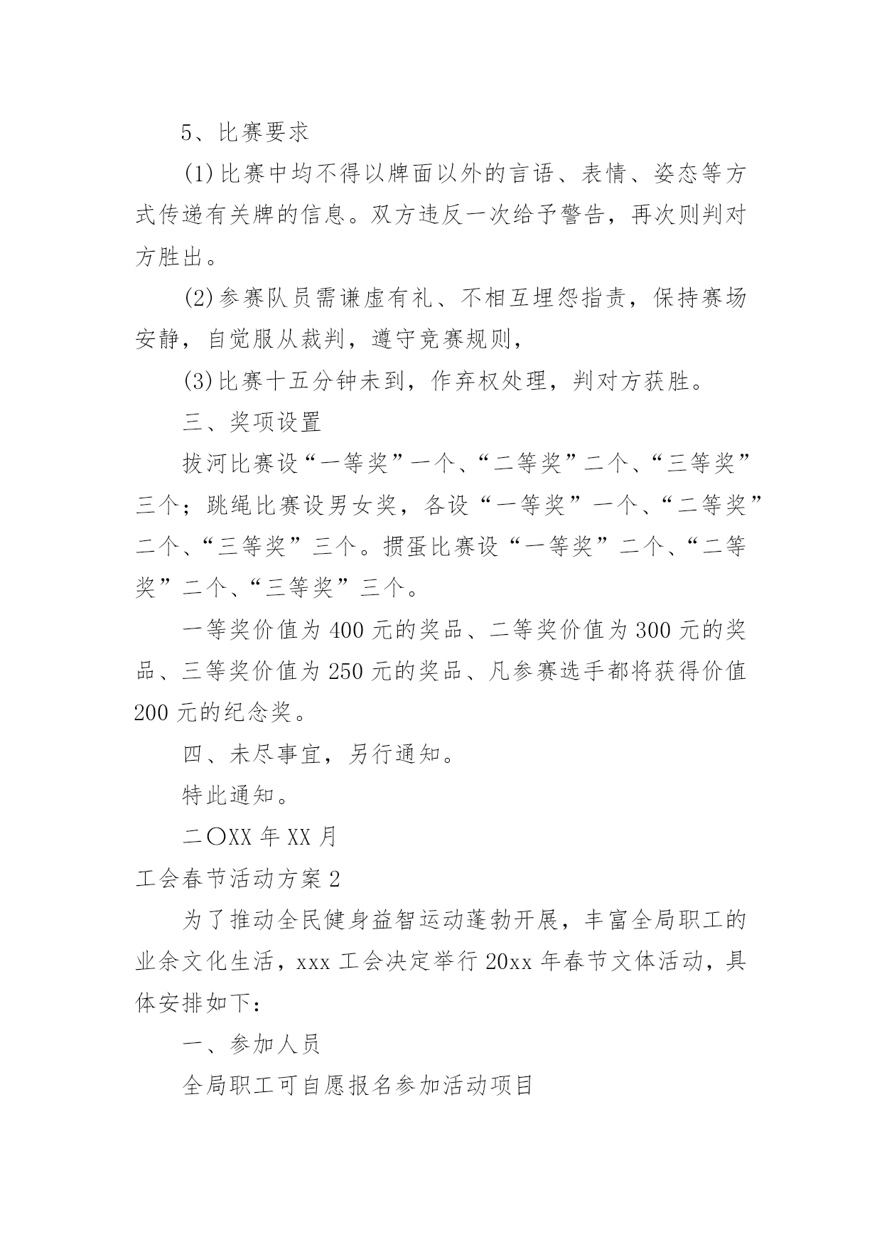 工会春节活动方案工会春节活动方案(12篇)为了确保工作或事情能高效地开展,通常会被要求事先制定方案,方案属于计划类文书的一种。那么制定方案需要注意哪些问题呢?下面是小编为大家整理的工会春节活动方案,仅供参考,大家一起来看看吧。工会春节活动方案1为隆重庆祝20xx年春节,活跃广大干部职工节日文化生活,展现我局职工风采,增强单位的凝聚力和向心力,经研究,拟于春节前夕开展一系列职工文体活动,具体方案安排如下:一、领导小组组长:XXX副组长:XXX成员:XXX、XXX、XXX、XXX二、具体活动安排(一)拔河比赛1、比赛时间:XX月XX日上午9:00-10:002、比赛地点:办公楼前广场3、裁判长:XXX、XXX裁判员:XXX、XXX4、比赛规则:(1)拔河道为地上画3条直线,间隔为1.5M,居中的线为中线,两边的线为河界,绳子中间系有红色标志。比赛中,当一方将绳上的红色标志拉过己方的河界线为获胜。比赛时,除裁判、选手以外,其他人员一律不得进入拔河道。(2)参赛人员按科室、基层所分6组。(人员见附表)(3)比赛以抽签的方式,采用“三局两胜”制,获胜的3队进入下一轮。进入第二轮的3个队通过抽签,产生1、2、3队,1队和2对进行比赛,胜者再和3队比赛,连胜两队者,为一等奖,其余两队为二等奖,第一轮淘汰的三队为三等奖。如第二轮出现三队各赢一场的局面,再次抽签重新比赛。5、比赛要求(1)各参赛队必须提前十分钟到达比赛现场进行热身运动。(2)获胜队伍完成一轮比赛后不得离开比赛现场,必须在比赛现场旁边等候工作人员作出下一轮的`比赛安排。(3)为保证比赛的安全,参赛队员一律不得穿钉鞋参加比赛;不准带手套;裁判未判胜负前,手不能松开绳子。(二)跳绳比赛1、比赛时间:XX月XX日上午10:00-11:30;2、比赛地点:办公楼前广场3、裁判长:XXX、XXX裁判员:XXX、XXX、XXX、XXX4、比赛规则:(1)参赛人员分男队和女队2个小组,比赛时参赛者摇绳(单摇),双脚起跳身体腾空后,跳绳自脚后沿身体额状轴转360度为一周期,计为一次,如未完成计为一次失误。(2)男裁判员为女队计数,女裁判员为男队计数。(3)在比赛指示口令(或哨声)响时起跳计数,到再次口令(或哨声)停止,为时1分钟。在一分钟时间内按累计次数多少排列名次,次数多者名次列前;次数相同,以失误次数少者名次列前,如仍相同,则名次并列。跳绳过程中可以停顿,以一分钟结束时的总次数为个人最后成绩。(三)掼蛋比赛1、比赛时间:XX月XX日下午13:00-18:002、比赛地点:局机关八楼会议室3、裁判长:XXX、XXX裁判员:XXX、XXX、XXX、XXX4、比赛规则:(1)自由凑对,比赛中不能重复组队,比赛抽签进行,无人凑对的作弃权处理。(2)比赛采用淘汰制,一局定胜负。第一轮淘汰14队,获胜的14队进入第二轮;第二轮淘汰7队,获胜的7队进入第三轮;第三轮通过抽签产生1个晋级队,直接进入第四轮,6队中落败的3队为三等奖,获胜的3队和晋级队争夺冠亚军,获胜的2队为冠军,落败的2队为亚军。(3)每局限时45分钟,从2打过A,赢1局算胜;如1局未打完,时间到,领先者胜;如级别相同,台上一方算胜。5、比赛要求(1)比赛中均不得以牌面以外的言语、表情、姿态等方式传递有关牌的信息。双方违反一次给予警告,再次则判对方胜出。(2)参赛队员需谦虚有礼、不相互埋怨指责,保持赛场安静,自觉服从裁判,遵守竞赛规则,(3)比赛十五分钟未到,作弃权处理,判对方获胜。三、奖项设置拔河比赛设“一等奖”一个、“二等奖”二个、“三等奖”三个;跳绳比赛设男女奖,各设“一等奖”一个、“二等奖”二个、“三等奖”三个。掼蛋比赛设“一等奖”二个、“二等奖”二个、“三等奖”三个。一等奖价值为400元的奖品、二等奖价值为300元的奖品、三等奖价值为250元的奖品、凡参赛选手都将获得价值200元的纪念奖。四、未尽事宜,另行通知。特此通知。二〇XX年XX月工会春节活动方案2为了推动全民健身益智运动蓬勃开展,丰富全局职工的业余文化生活,xxx工会决定举行20xx年春节文体活动,具体安排如下:一、参加人员全局职工可自愿报名参加活动项目二、活动时间20xx年1月24日下午13:00——17:00三、主办单位主办单位:局工会活动组委会:组长:xxx成员:xxx四、活动项目及组织人员1、钓鱼比赛:组织人:xxx2、套圈比赛:组织人:xxx3、飞标比赛:组织人:xxx4、掰手腕比赛:组织人:xxx5、扑克比赛:打捧组织人:xxx火箭组织人:xxx五、活动规则1、钓鱼比赛规则。参赛人员用自制鱼竿钓瓶子,钓起后放到指定区域算完成1次。在规定时间内,完成3次者获一等奖,完成2次者获二等奖,完成1次者获三等奖。获奖情况现场确定(见附表1)。2、套圈比赛规则。参赛人