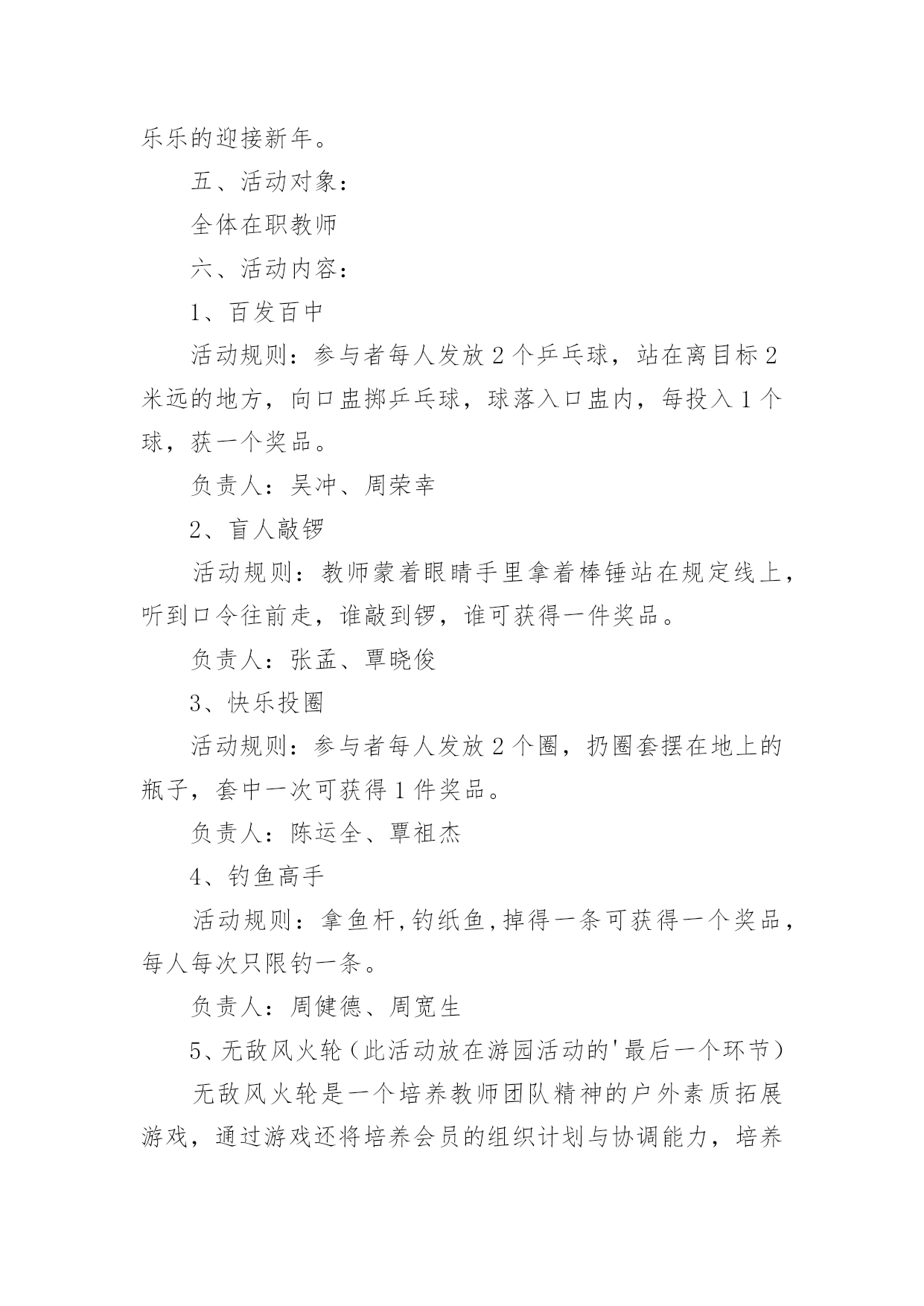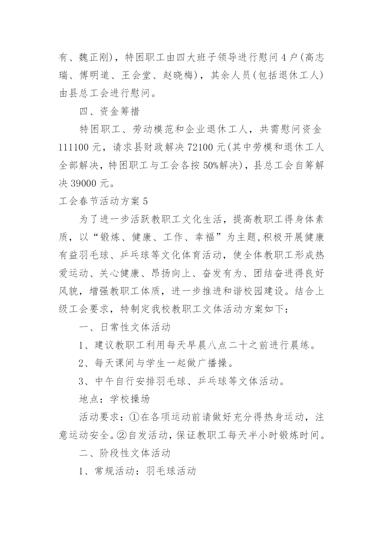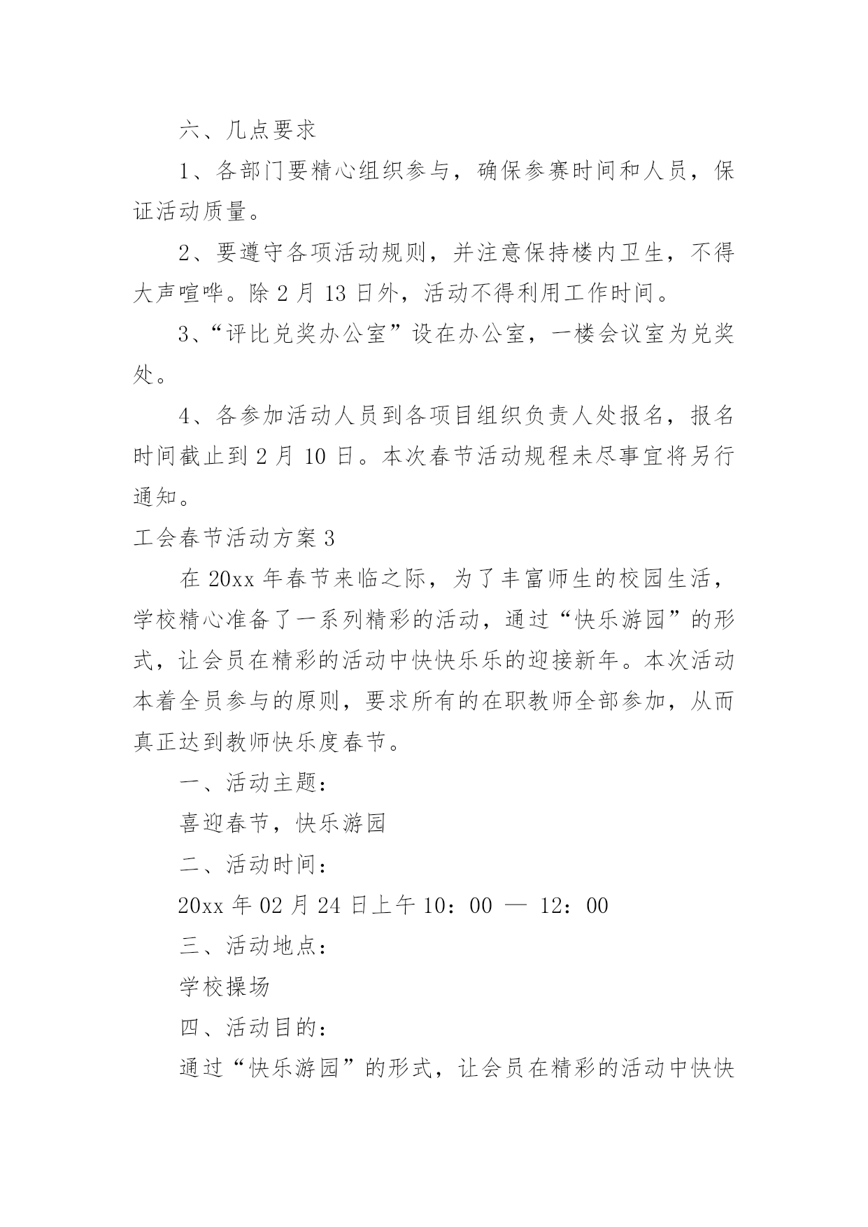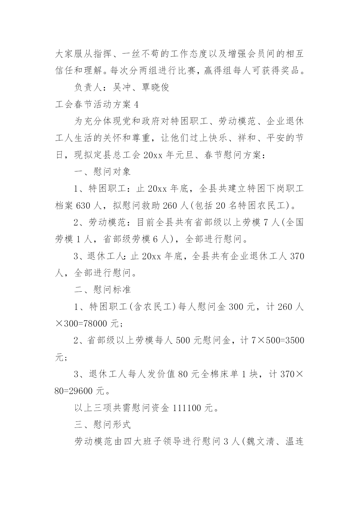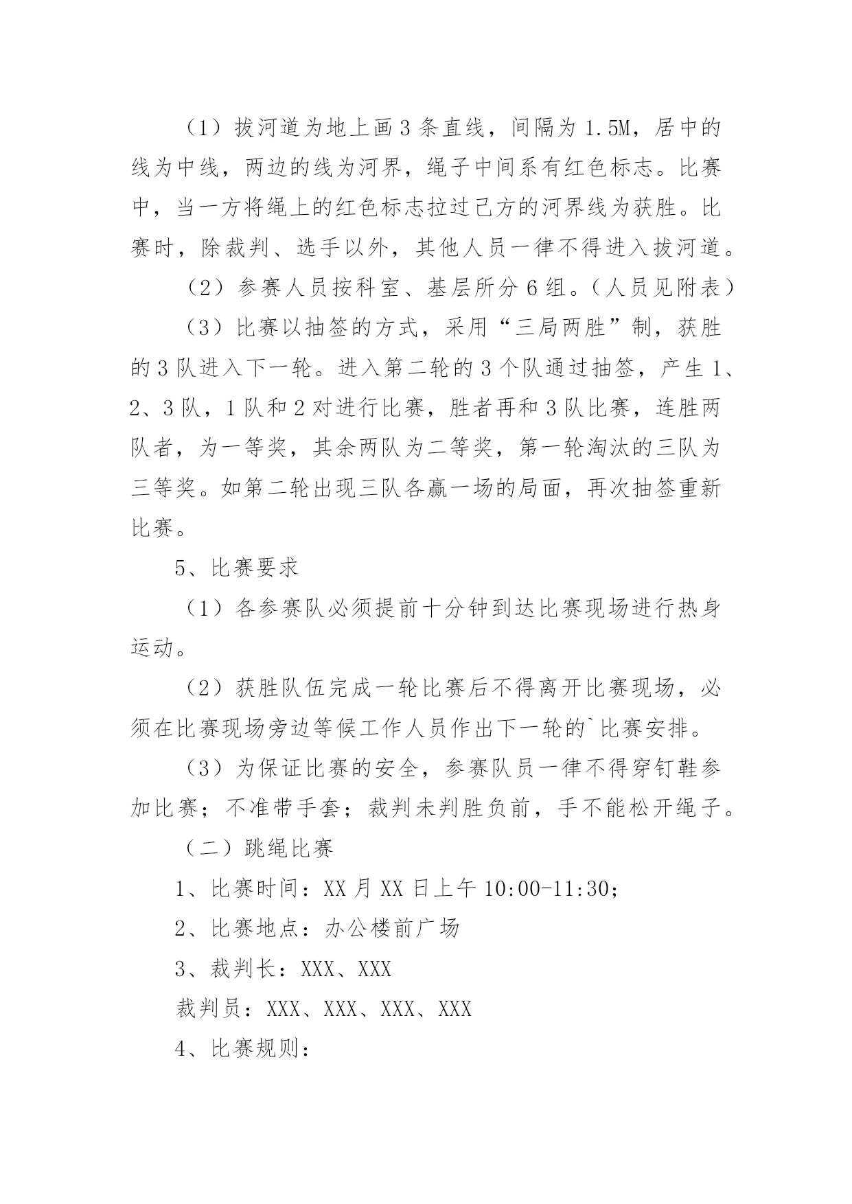 工会春节活动方案工会春节活动方案(12篇)为了确保工作或事情能高效地开展,通常会被要求事先制定方案,方案属于计划类文书的一种。那么制定方案需要注意哪些问题呢?下面是小编为大家整理的工会春节活动方案,仅供参考,大家一起来看看吧。工会春节活动方案1为隆重庆祝20xx年春节,活跃广大干部职工节日文化生活,展现我局职工风采,增强单位的凝聚力和向心力,经研究,拟于春节前夕开展一系列职工文体活动,具体方案安排如下:一、领导小组组长:XXX副组长:XXX成员:XXX、XXX、XXX、XXX二、具体活动安排(一)拔河比赛1、比赛时间:XX月XX日上午9:00-10:002、比赛地点:办公楼前广场3、裁判长:XXX、XXX裁判员:XXX、XXX4、比赛规则:(1)拔河道为地上画3条直线,间隔为1.5M,居中的线为中线,两边的线为河界,绳子中间系有红色标志。比赛中,当一方将绳上的红色标志拉过己方的河界线为获胜。比赛时,除裁判、选手以外,其他人员一律不得进入拔河道。(2)参赛人员按科室、基层所分6组。(人员见附表)(3)比赛以抽签的方式,采用“三局两胜”制,获胜的3队进入下一轮。进入第二轮的3个队通过抽签,产生1、2、3队,1队和2对进行比赛,胜者再和3队比赛,连胜两队者,为一等奖,其余两队为二等奖,第一轮淘汰的三队为三等奖。如第二轮出现三队各赢一场的局面,再次抽签重新比赛。5、比赛要求(1)各参赛队必须提前十分钟到达比赛现场进行热身运动。(2)获胜队伍完成一轮比赛后不得离开比赛现场,必须在比赛现场旁边等候工作人员作出下一轮的`比赛安排。(3)为保证比赛的安全,参赛队员一律不得穿钉鞋参加比赛;不准带手套;裁判未判胜负前,手不能松开绳子。(二)跳绳比赛1、比赛时间:XX月XX日上午10:00-11:30;2、比赛地点:办公楼前广场3、裁判长:XXX、XXX裁判员:XXX、XXX、XXX、XXX4、比赛规则:(1)参赛人员分男队和女队2个小组,比赛时参赛者摇绳(单摇),双脚起跳身体腾空后,跳绳自脚后沿身体额状轴转360度为一周期,计为一次,如未完成计为一次失误。(2)男裁判员为女队计数,女裁判员为男队计数。(3)在比赛指示口令(或哨声)响时起跳计数,到再次口令(或哨声)停止,为时1分钟。在一分钟时间内按累计次数多少排列名次,次数多者名次列前;次数相同,以失误次数少者名次列前,如仍相同,则名次并列。跳绳过程中可以停顿,以一分钟结束时的总次数为个人最后成绩。(三)掼蛋比赛1、比赛时间:XX月XX日下午13:00-18:002、比赛地点:局机关八楼会议室3、裁判长:XXX、XXX裁判员:XXX、XXX、XXX、XXX4、比赛规则:(1)自由凑对,比赛中不能重复组队,比赛抽签进行,无人凑对的作弃权处理。(2)比赛采用淘汰制,一局定胜负。第一轮淘汰14队,获胜的14队进入第二轮;第二轮淘汰7队,获胜的7队进入第三轮;第三轮通过抽签产生1个晋级队,直接进入第四轮,6队中落败的3队为三等奖,获胜的3队和晋级队争夺冠亚军,获胜的2队为冠军,落败的2队为亚军。(3)每局限时45分钟,从2打过A,赢1局算胜;如1局未打完,时间到,领先者胜;如级别相同,台上一方算胜。5、比赛要求(1)比赛中均不得以牌面以外的言语、表情、姿态等方式传递有关牌的信息。双方违反一次给予警告,再次则判对方胜出。(2)参赛队员需谦虚有礼、不相互埋怨指责,保持赛场安静,自觉服从裁判,遵守竞赛规则,(3)比赛十五分钟未到,作弃权处理,判对方获胜。三、奖项设置拔河比赛设“一等奖”一个、“二等奖”二个、“三等奖”三个;跳绳比赛设男女奖,各设“一等奖”一个、“二等奖”二个、“三等奖”三个。掼蛋比赛设“一等奖”二个、“二等奖”二个、“三等奖”三个。一等奖价值为400元的奖品、二等奖价值为300元的奖品、三等奖价值为250元的奖品、凡参赛选手都将获得价值200元的纪念奖。四、未尽事宜,另行通知。特此通知。二〇XX年XX月工会春节活动方案2为了推动全民健身益智运动蓬勃开展,丰富全局职工的业余文化生活,xxx工会决定举行20xx年春节文体活动,具体安排如下:一、参加人员全局职工可自愿报名参加活动项目二、活动时间20xx年1月24日下午13:00——17:00三、主办单位主办单位:局工会活动组委会:组长:xxx成员:xxx四、活动项目及组织人员1、钓鱼比赛:组织人:xxx2、套圈比赛:组织人:xxx3、飞标比赛:组织人:xxx4、掰手腕比赛:组织人:xxx5、扑克比赛:打捧组织人:xxx火箭组织人:xxx五、活动规则1、钓鱼比赛规则。参赛人员用自制鱼竿钓瓶子,钓起后放到指定区域算完成1次。在规定时间内,完成3次者获一等奖,完成2次者获二等奖,完成1次者获三等奖。获奖情况现场确定(见附表1)。2、套圈比赛规则。参赛人