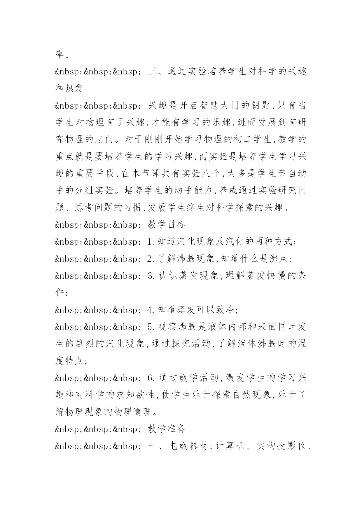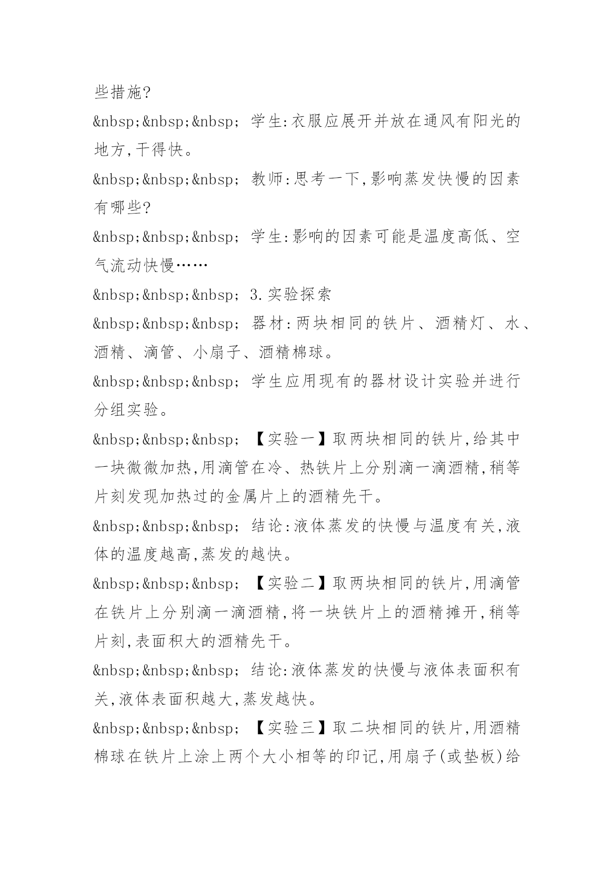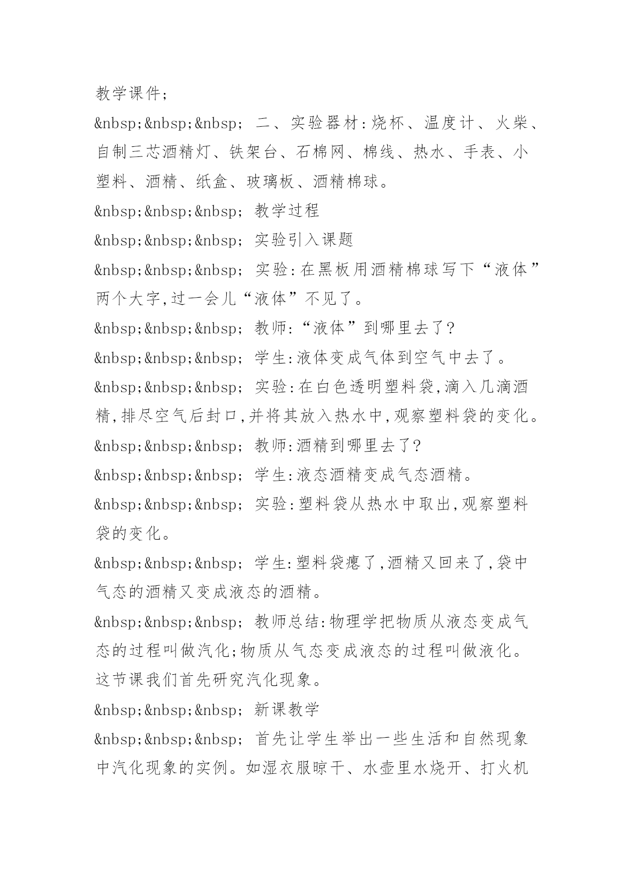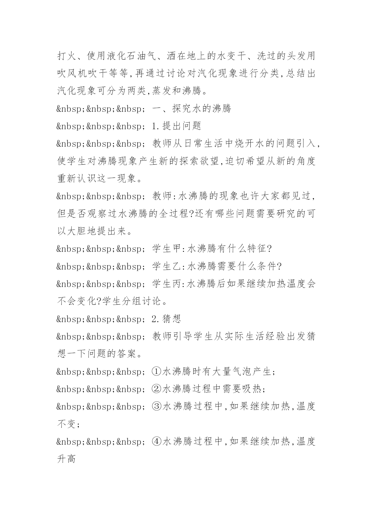 “汽化”教学设计“汽化”教学设计 “汽化”教学设计 江苏省无锡市江南中学童丽瑾 设计思想 一、充分体现“从生活到物理,从物理到社会”的教学理念 “汽化”这节课的教学内容与日常生活联系紧密,学生体验非常丰富,所以在教学过程中始终将生活和自然界中的一些物理现象与汽化联系起来,让学生进一步感受到物理就在我们的身边,物理不仅有趣,而且非常有用,从而激发学生求知欲望,培养学生的学习兴趣。 二、注重科学探究,注意教学方式的多样化 科学探究既是学生的学习目标,又是重要的教学方式之一。本节课通过“探究水的沸腾”、“探究蒸发与什么因素有关”两个探究过程,引导学生提出问题,培养学生善于发问、质疑的良好习惯,鼓励学生制订简单的科学探究计划,培养学生处理信息的能力,体验科学探究的乐趣,领悟科学探究的思想和精神,为学生的终身学习建立基础。教学过程中通过多媒体技术优化课堂教学,提高教学效率。 三、通过实验培养学生对科学的兴趣和热爱 兴趣是开启智慧大门的钥匙,只有当学生对物理有了兴趣,才能有学习的乐趣,进而发展到有研究物理的志向。对于刚刚开始学习物理的初二学生,教学的重点就是要培养学生的学习兴趣,而实验是培养学生学习兴趣的重要手段,在本节课共有实验八个,大多是学生亲自动手的分组实验。培养学生的动手能力,养成通过实验研究问题、思考问题的习惯,发展学生终生对科学探索的兴趣。 教学目标 1.知道汽化现象及汽化的两种方式; 2.了解沸腾现象,知道什么是沸点; 3.认识蒸发现象,理解蒸发快慢的条件; 4.知道蒸发可以致冷; 5.观察沸腾是液体内部和表面同时发生的剧烈的汽化现象,通过探究活动,了解液体沸腾时的温度特点; 6.通过教学活动,激发学生的学习兴趣和对科学的求知欲性,使学生乐于探索自然现象,乐于了解物理现象的物理道理。 教学准备 一、电教器材:计算机、实物投影仪、教学课件; 二、实验器材:烧杯、温度计、火柴、自制三芯酒精灯、铁架台、石棉网、棉线、热水、手表、小塑料、酒精、纸盒、玻璃板、酒精棉球。 教学过程 实验引入课题 实验:在黑板用酒精棉球写下“液体”两个大字,过一会儿“液体”不见了。 教师:“液体”到哪里去了? 学生:液体变成气体到空气中去了。 实验:在白色透明塑料袋,滴入几滴酒精,排尽空气后封口,并将其放入热水中,观察塑料袋的变化。 教师:酒精到哪里去了? 学生:液态酒精变成气态酒精。 实验:塑料袋从热水中取出,观察塑料袋的变化。 学生:塑料袋瘪了,酒精又回来了,袋中气态的酒精又变成液态的酒精。 教师总结:物理学把物质从液态变成气态的过程叫做汽化;物质从气态变成液态的过程叫做液化。这节课我们首先研究汽化现象。 新课教学 首先让学生举出一些生活和自然现象中汽化现象的实例。如湿衣服晾干、水壶里水烧开、打火机打火、使用液化石油气、洒在地上的水变干、洗过的头发用吹风机吹干等等,再通过讨论对汽化现象进行分类,总结出汽化现象可分为两类,蒸发和沸腾。 一、探究水的沸腾 1.提出问题 教师从日常生活中烧开水的问题引入,使学生对沸腾现象产生新的探索欲望,迫切希望从新的角度重新认识这一现象。 教师:水沸腾的现象也许大家都见过,但是否观察过水沸腾的全过程?还有哪些问题需要研究的可以大胆地提