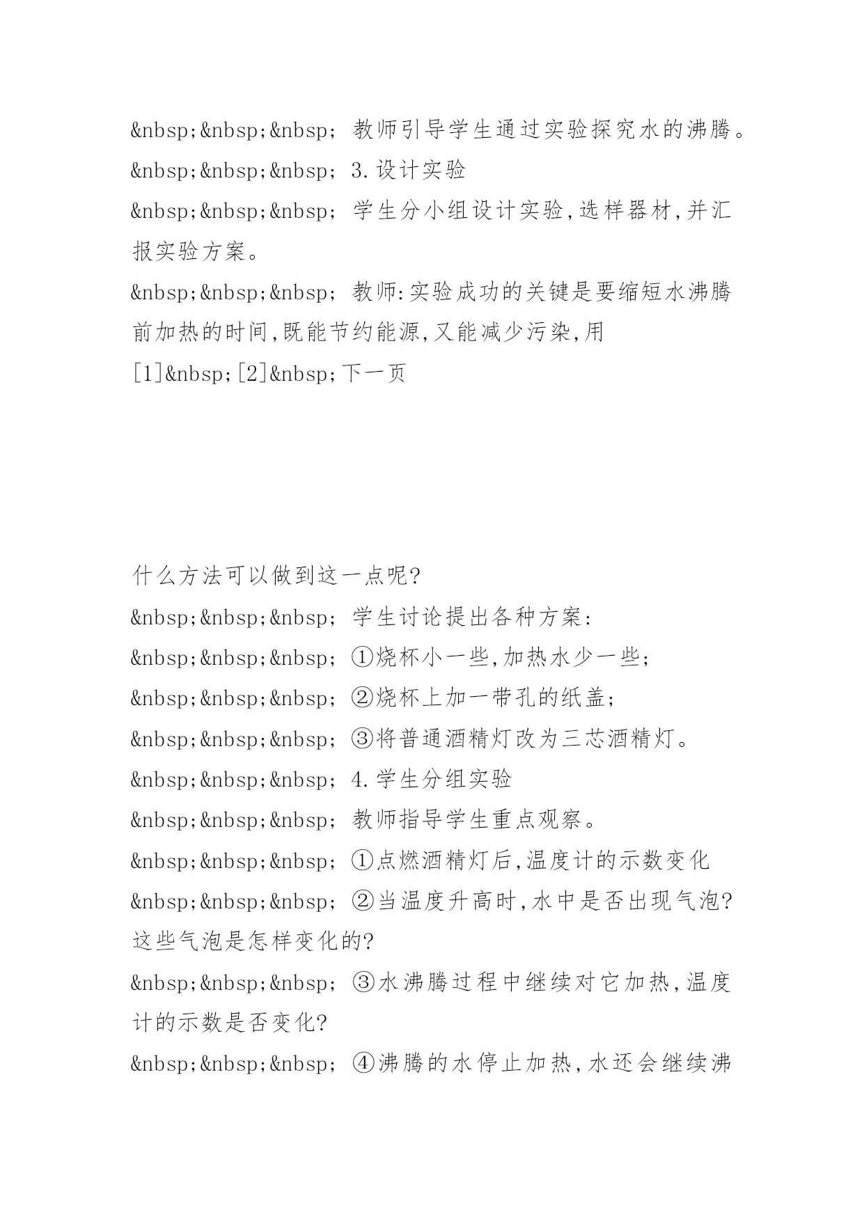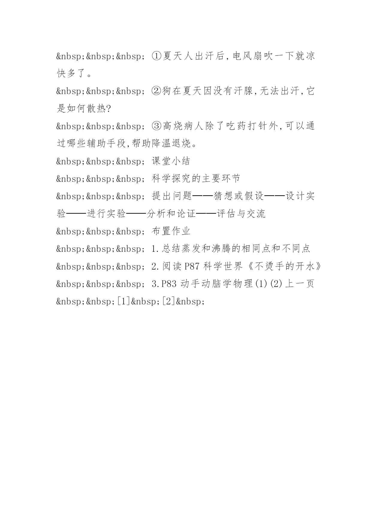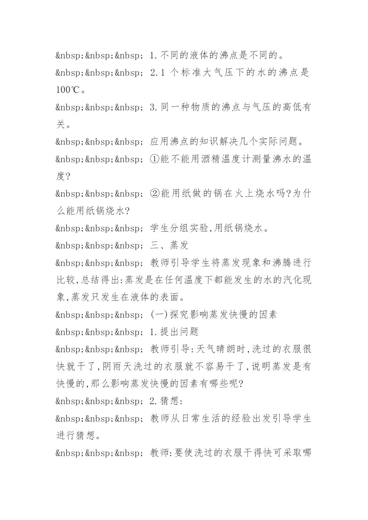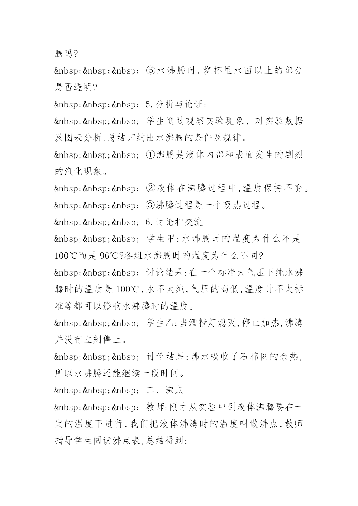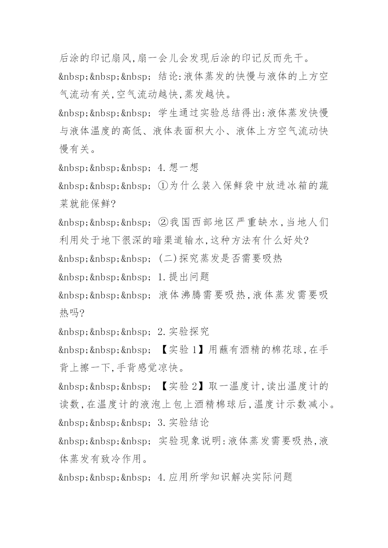 “汽化”教学设计“汽化”教学设计 “汽化”教学设计 江苏省无锡市江南中学童丽瑾 设计思想 一、充分体现“从生活到物理,从物理到社会”的教学理念 “汽化”这节课的教学内容与日常生活联系紧密,学生体验非常丰富,所以在教学过程中始终将生活和自然界中的一些物理现象与汽化联系起来,让学生进一步感受到物理就在我们的身边,物理不仅有趣,而且非常有用,从而激发学生求知欲望,培养学生的学习兴趣。 二、注重科学探究,注意教学方式的多样化 科学探究既是学生的学习目标,又是重要的教学方式之一。本节课通过“探究水的沸腾”、“探究蒸发与什么因素有关”两个探究过程,引导学生提出问题,培养学生善于发问、质疑的良好习惯,鼓励学生制订简单的科学探究计划,培养学生处理信息的能力,体验科学探究的乐趣,领悟科学探究的思想和精神,为学生的终身学习建立基础。教学过程中通过多媒体技术优化课堂教学,提高教学效率。 三、通过实验培养学生对科学的兴趣和热爱 兴趣是开启智慧大门的钥匙,只有当学生对物理有了兴趣,才能有学习的乐趣,进而发展到有研究物理的志向。对于刚刚开始学习物理的初二学生,教学的重点就是要培养学生的学习兴趣,而实验是培养学生学习兴趣的重要手段,在本节课共有实验八个,大多是学生亲自动手的分组实验。培养学生的动手能力,养成通过实验研究问题、思考问题的习惯,发展学生终生对科学探索的兴趣。 教学目标 1.知道汽化现象及汽化的两种方式; 2.了解沸腾现象,知道什么是沸点; 3.认识蒸发现象,理解蒸发快慢的条件; 4.知道蒸发可以致冷; 5.观察沸腾是液体内部和表面同时发生的剧烈的汽化现象,通过探究活动,了解液体沸腾时的温度特点; 6.通过教学活动,激发学生的学习兴趣和对科学的求知欲性,使学生乐于探索自然现象,乐于了解物理现象的物理道理。 教学准备 一、电教器材:计算机、实物投影仪、教学课件; 二、实验器材:烧杯、温度计、火柴、自制三芯酒精灯、铁架台、石棉网、棉线、热水、手表、小塑料、酒精、纸盒、玻璃板、酒精棉球。 教学过程 实验引入课题 实验:在黑板用酒精棉球写下“液体”两个大字,过一会儿“液体”不见了。 教师:“液体”到哪里去了? 学生:液体变成气体到空气中去了。 实验:在白色透明塑料袋,滴入几滴酒精,排尽空气后封口,并将其放入热水中,观察塑料袋的变化。 教师:酒精到哪里去了? 学生:液态酒精变成气态酒精。 实验:塑料袋从热水中取出,观察塑料袋的变化。 学生:塑料袋瘪了,酒精又回来了,袋中气态的酒精又变成液态的酒精。 教师总结:物理学把物质从液态变成气态的过程叫做汽化;物质从气态变成液态的过程叫做液化。这节课我们首先研究汽化现象。 新课教学 首先让学生举出一些生活和自然现象中汽化现象的实例。如湿衣服晾干、水壶里水烧开、打火机打火、使用液化石油气、洒在地上的水变干、洗过的头发用吹风机吹干等等,再通过讨论对汽化现象进行分类,总结出汽化现象可分为两类,蒸发和沸腾。 一、探究水的沸腾 1.提出问题 教师从日常生活中烧开水的问题引入,使学生对沸腾现象产生新的探索欲望,迫切希望从新的角度重新认识这一现象。 教师:水沸腾的现象也许大家都见过,但是否观察过水沸腾的全过程?还有哪些问题需要研究的可以大胆地提