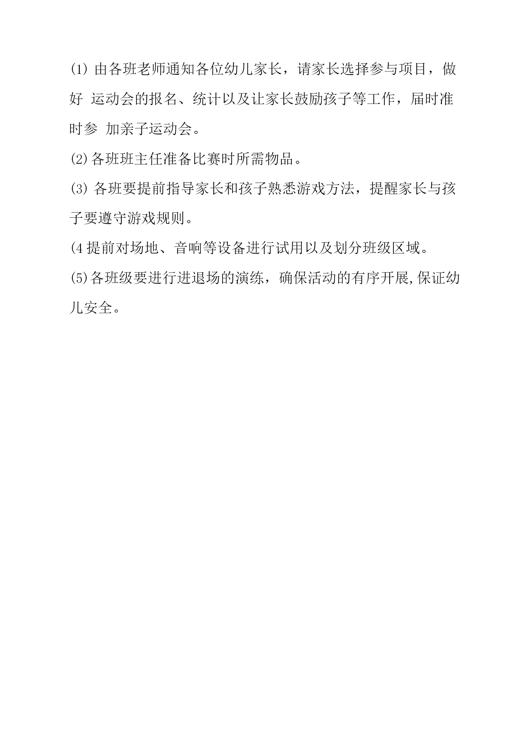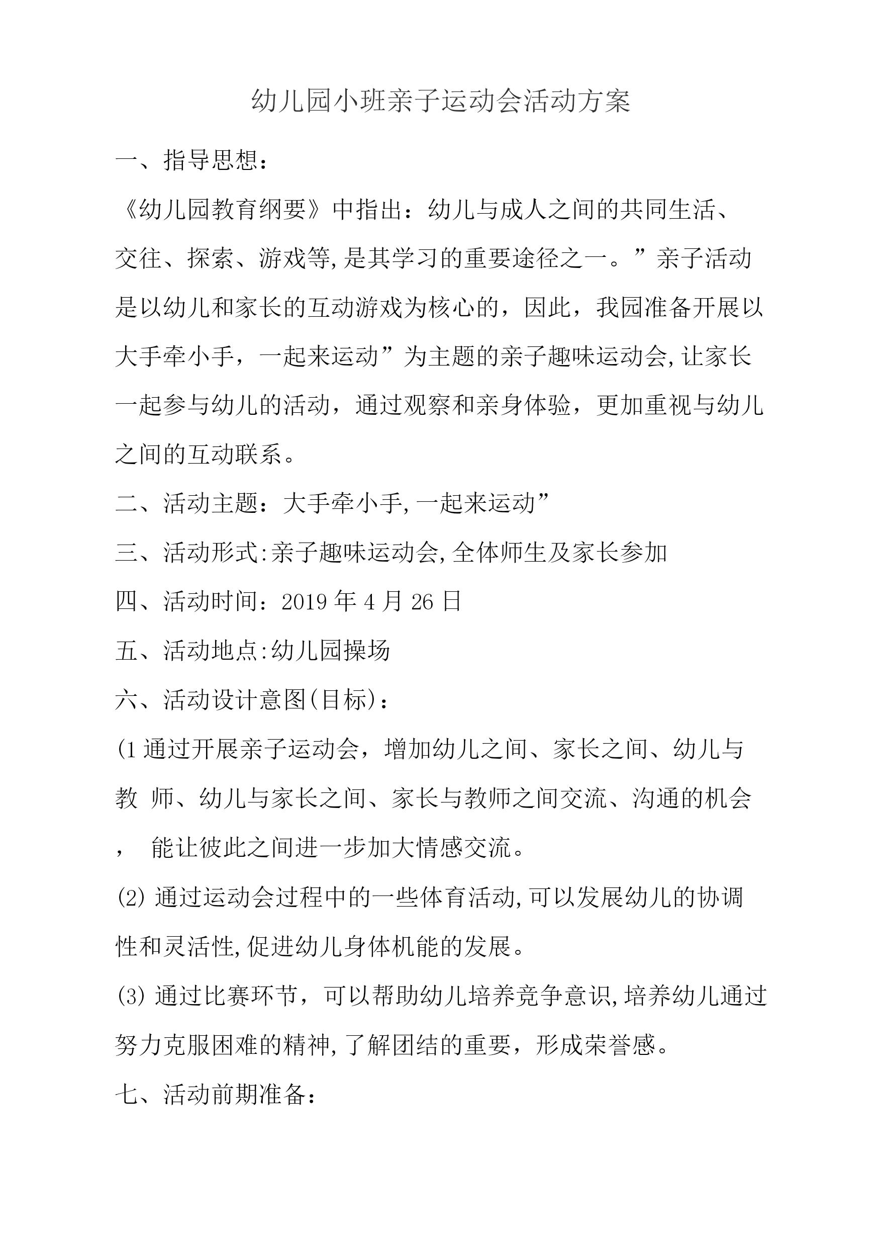 幼儿园小班亲子运动会活动方案一、指导思想:《幼儿园教育纲要》中指出:幼儿与成人之间的共同生活、交往、探索、游戏等,是其学习的重要途径之一。”亲子活动是以幼儿和家长的互动游戏为核心的,因此,我园准备开展以大手牵小手,一起来运动”为主题的亲子趣味运动会,让家长一起参与幼儿的活动,通过观察和亲身体验,更加重视与幼儿之间的互动联系。二、活动主题:大手牵小手,一起来运动”三、活动形式:亲子趣味运动会,全体师生及家长参加四、活动时间:2019年4月26日五、活动地点:幼儿园操场六、活动设计意图(目标):(1通过开展亲子运动会,增加幼儿之间、家长之间、幼儿与教师、幼儿与家长之间、家长与教师之间交流、沟通的机会,能让彼此之间进一步加大情感交流。通过运动会过程中的一些体育活动,可以发展幼儿的协调性和灵活性,促进幼儿身体机能的发展。通过比赛环节,可以帮助幼儿培养竞争意识,培养幼儿通过努力克服困难的精神,了解团结的重要,形成荣誉感。七、活动前期准备:由各班老师通知各位幼儿家长,请家长选择参与项目,做好运动会的报名、统计以及让家长鼓励孩子等工作,届时准时参加亲子运动会。各班班主任准备比赛时所需物品。各班要提前指导家长和孩子熟悉游戏方法,提醒家长与孩子要遵守游戏规则。(4提前对场地、音响等设备进行试用以及划分班级区域。(5)各班级要进行进退场的演练,确保活动的有序开展,保证幼儿安全。
