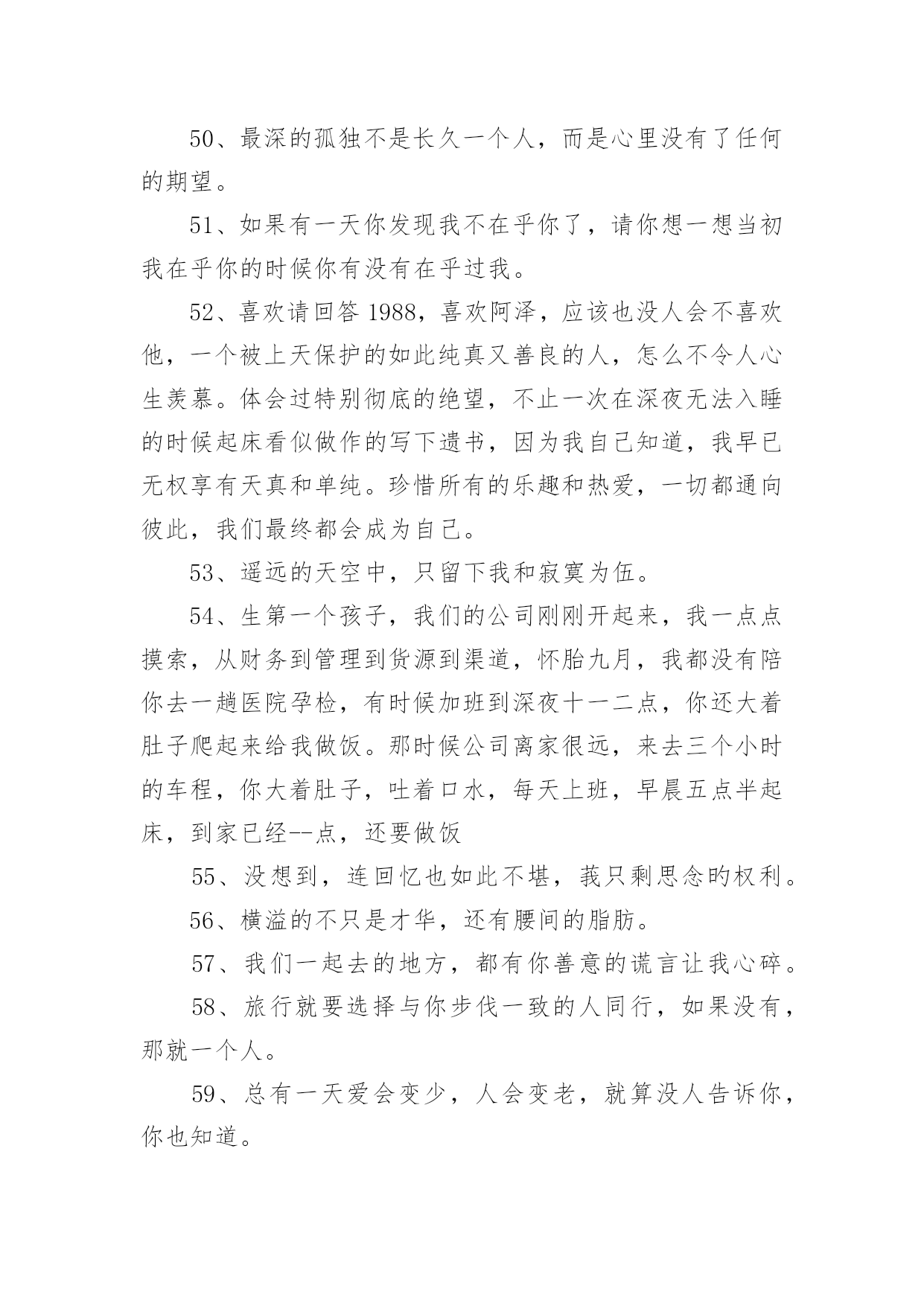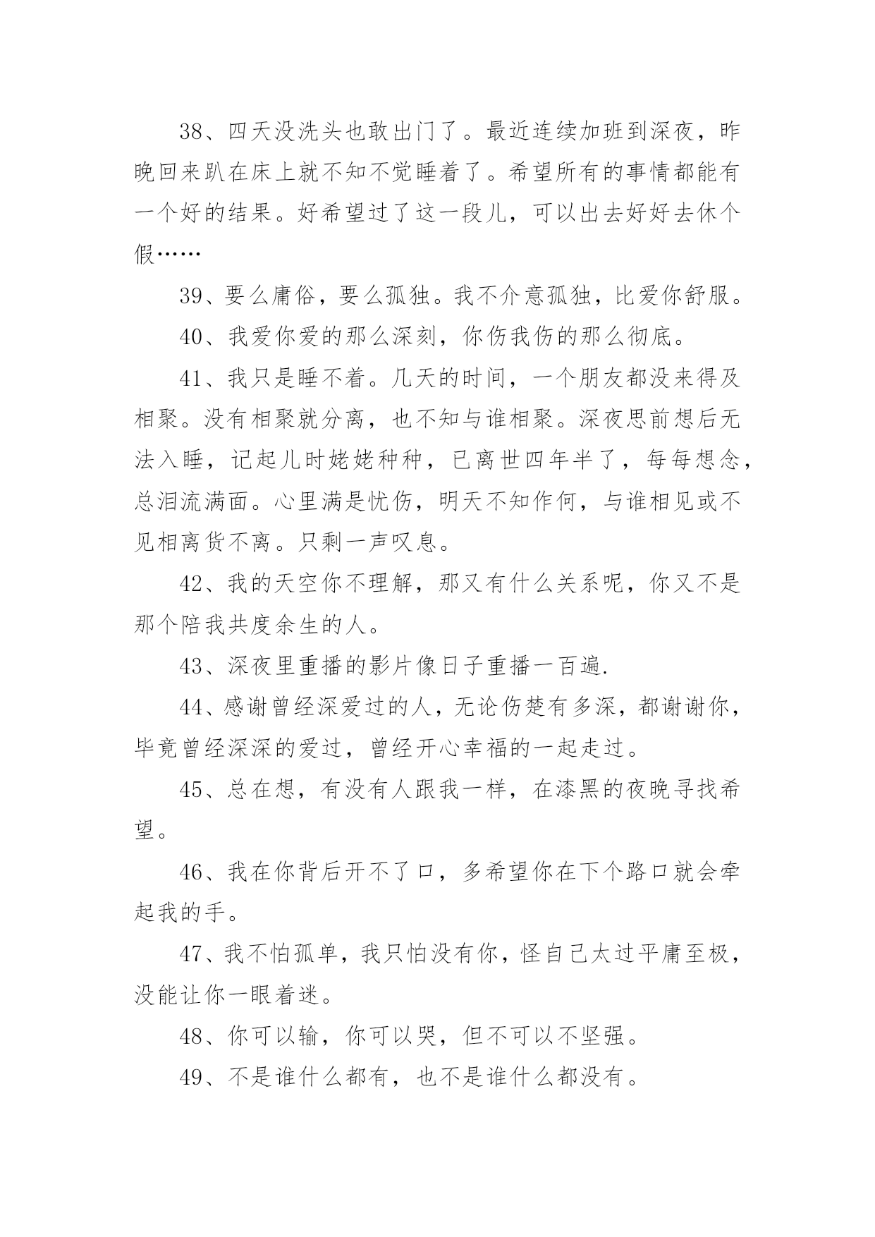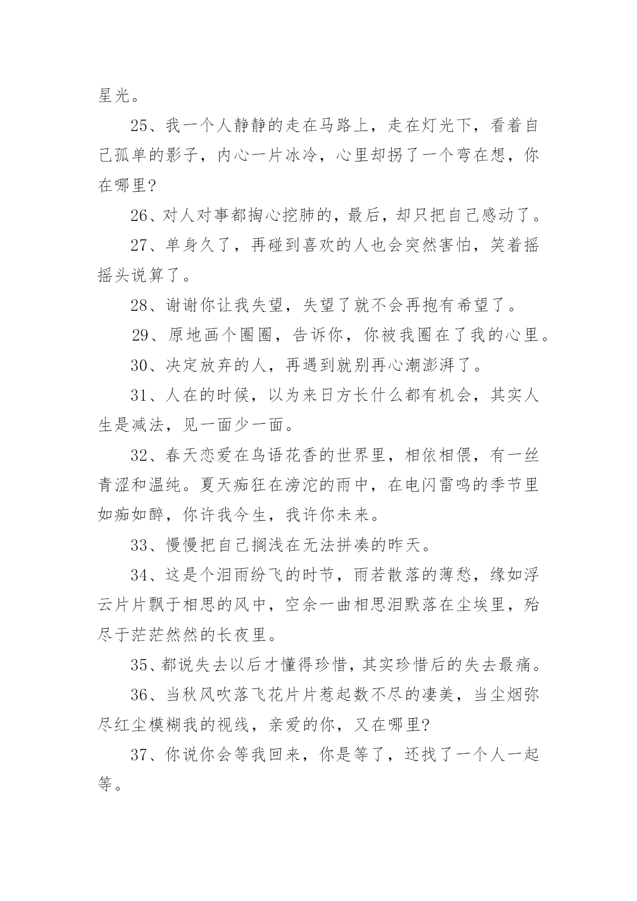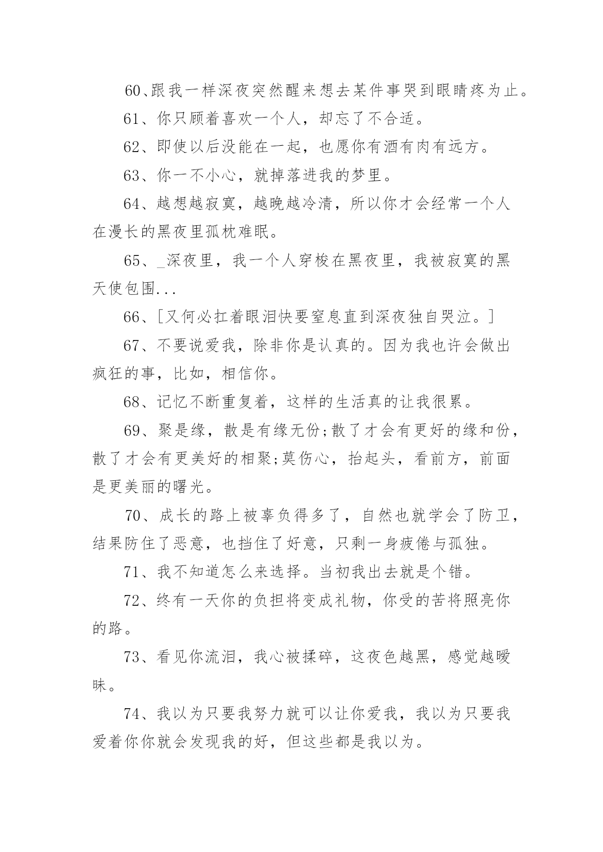 夜晚单身伤感说说文案夜晚单身伤感说说文案大全随着线上的、虚拟的社交的迅猛发展,越来越多人喜欢在网上发布文案,文案用以分享自己生活中值得纪念的小确幸。你还在找寻优秀经典的文案吗?下面是小编帮大家整理的夜晚单身伤感说说文案大全,仅供参考,大家一起来看看吧。1、我喜欢最初的自己,因为那时的我很天真也不会悲伤。2、拿出你的真心付出,才会得到别人真心的回报。3、矛盾像首尾互接的鱼,在这个世界中长久地存活着。4、我有一千种一万种想见你的理由,却唯独没有一个能见你的身份。5、我的所有伤痛和难受,在你的眼里都是轻描淡写的八个字,莫名其妙,无理取闹。6、我有时会莫名奇妙的笑,也会莫明的一种痛,只因为想到了你。7、你对俄许下的一时承诺,让俄一世都在回忆中蹉跎。8、愿你是那只刺猬,我予你柔软的环怀抱,你与我鲜血淋漓的爱。9、那些爱,那些年感谢有你一直相伴相守。10、这个世界已经有很多人和事会让你失望,而最不应该的,就是自己还令自己失望。请记住,社会很残酷,你要活得有温度!11、我曾给过你闭上眼睛捂起耳朵的信任,就算全世界都说你有错,只要你否认,我就相信。但是,你却负了它。12、一个人的时候,常常会想刹那芳华的孤寂,最终会属于青灯古刹。13、余生千万不要再见,我怕失了体面。14、这辈子最对不起的就是自己的心了,让它疼了一次又一次。15、等一个人就是拿时间去赌,然后输的一塌糊涂。16、你要去变得更好,不要总是回头看那些曾经伤害过你的人,路还很长,温暖的事情以后一定会发生,希望熬过孤独的你,能活成自己喜欢的样子。17、爱情是一个精心设计的谎言。18、人生的矛盾就是,一个人怕孤独,两个人怕辜负。19、被抛弃时,才明显感到孤独的重量。20、友情大过天,支离破碎时什么都是废话。21、岁月,匆匆而逝的光阴,多少寂寞呈几番黯然的绽放,惊醒的落叶,没有方向的漂泊,不知何处是终点。22、黑夜,无情的笼罩着整个城市,逐渐蔓延我的世界。23、这世上只有一种成功,叫:用自己喜欢的方式过一生。24、后来许多人问我一个人夜晚踟蹰路上的心情,我想起的却不是孤单和路长,而是波澜壮阔的海和天空中闪耀的星光。25、我一个人静静的走在马路上,走在灯光下,看着自己孤单的影子,内心一片冰冷,心里却拐了一个弯在想,你在哪里?26、对人对事都掏心挖肺的,最后,却只把自己感动了。27、单身久了,再碰到喜欢的人也会突然害怕,笑着摇摇头说算了。28、谢谢你让我失望,失望了就不会再抱有希望了。29、原地画个圈圈,告诉你,你被我圈在了我的心里。30、决定放弃的人,再遇到就别再心潮澎湃了。31、人在的时候,以为来日方长什么都有机会,其实人生是减法,见一面少一面。32、春天恋爱在鸟语花香的世界里,相依相偎,有一丝青涩和温纯。夏天痴狂在滂沱的雨中,在电闪雷鸣的季节里如痴如醉,你许我今生,我许你未来。33、慢慢把自己搁浅在无法拼凑的昨天。34、这是个泪雨纷飞的时节,雨若散落的薄愁,缘如浮云片片飘于相思的风中,空余一曲相思泪默落在尘埃里,殆尽于茫茫然然的长夜里。35、都说失去以后才懂得珍惜,其实珍惜后的失去最痛。36、当秋风吹落飞花片片惹起数不尽的凄美,当尘烟弥尽红尘模糊我的视线,亲爱的你,又在哪里?37、你说你会等我回来,你是等了,还找了一个人一起等。38、四天没洗头也敢出门了。最近连续加班到深夜,昨晚回来趴在床上就不知不觉睡着了。希望所有的事情都能有一个好的结果。好希望过了这一段儿,可以出去好好去休个假……39、要么庸俗,要么孤独。我不介意孤独,比爱你舒服。40、我爱你爱的那么深刻,你伤我伤的那么彻底。41、我只是睡不着。几天的时间,一个朋友都没来得及相聚。没有相聚就分离,也不知与谁相聚。深夜思前想后无法入睡,记起儿时姥姥种种,已离世四年半了,每每想念,总泪流满面。心里满是忧伤,明天不知作何,与谁相见或不见相离货不离。只剩一声叹息。42、我的天空你不理解,那又有什么关系呢,你又不是那个陪我共度余生的人。43、深夜里重播的影片像日子重播一百遍.44、感谢曾经深爱过的人,无论伤楚有多深,都谢谢你,毕竟曾经深深的爱过,曾经开心幸福的一起走过。45、总在想,有没有人跟我一样,在漆黑的夜晚寻找希望。46、我在你背后开不了口,多希望你在下个路口就会牵起我的手。47、我不怕孤单,我只怕没有你,怪自己太过平庸至极,没能让你一眼着迷。48、你可以输,你可以哭,但不可以不坚强。49、不是谁什么都有,也不是谁什么都没有。50、最深的孤独不是长久一个人,而是心里没有了任何的期望。51、如果有一天你发现我不在乎你了,请你想一想当初我在乎你的时候你有没有在乎过我。52、喜欢请回答1988,喜欢阿泽,应该也没人会不喜欢他,一个被上天保护的如此纯真又善良的人,怎么不令人心生羡慕。体会过特别彻底的绝望,不止一次在深夜无法入睡的时候起床看似做