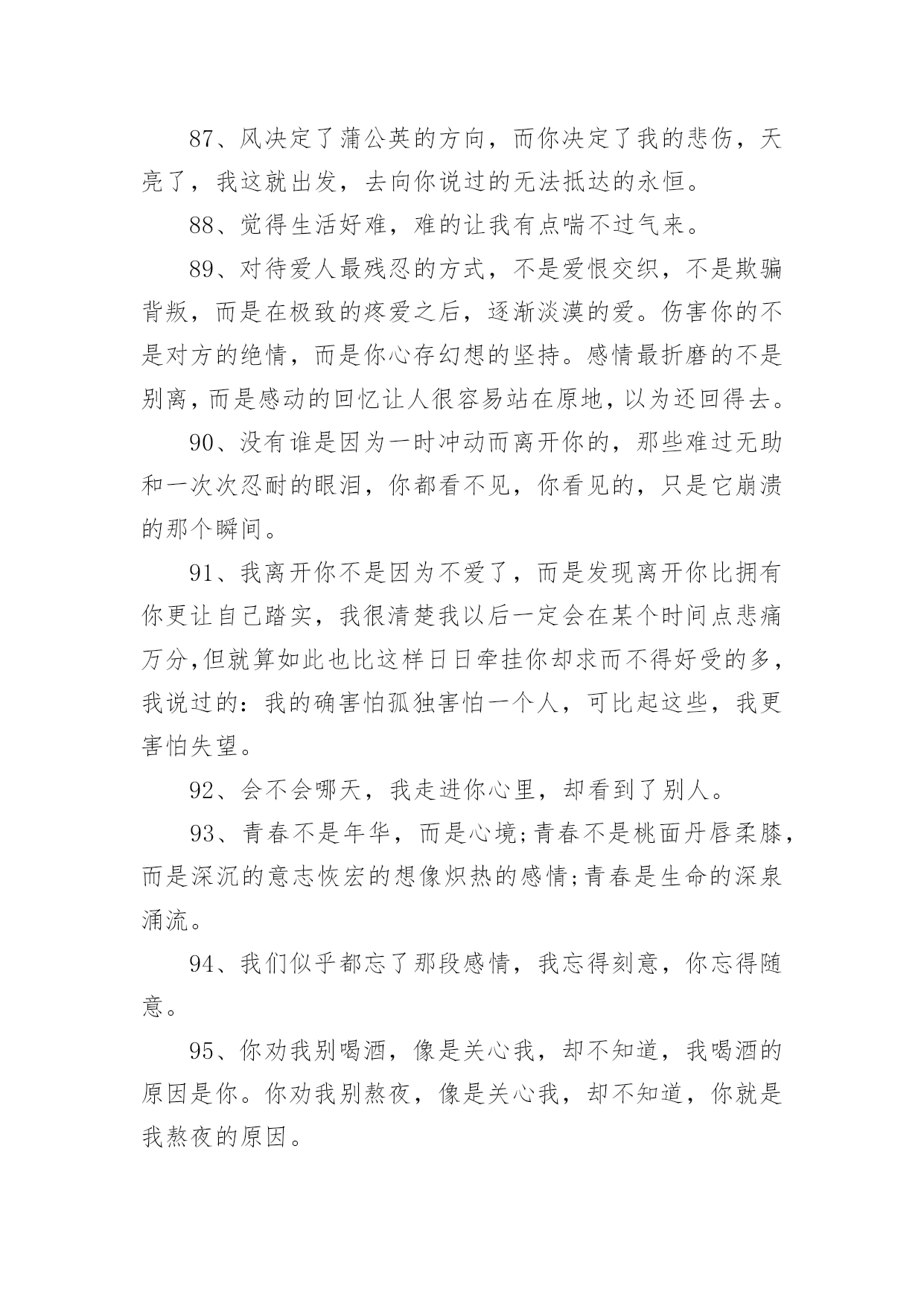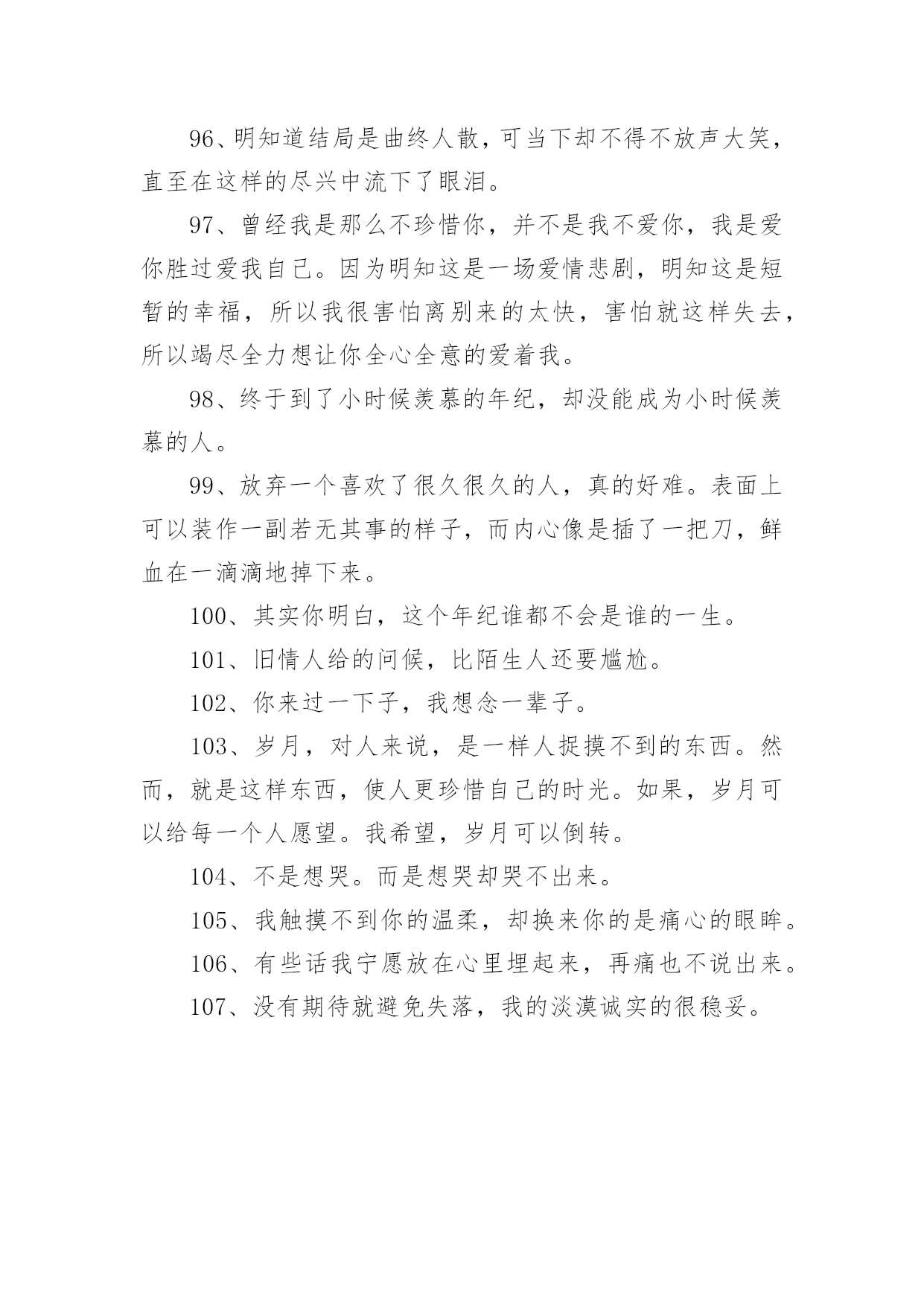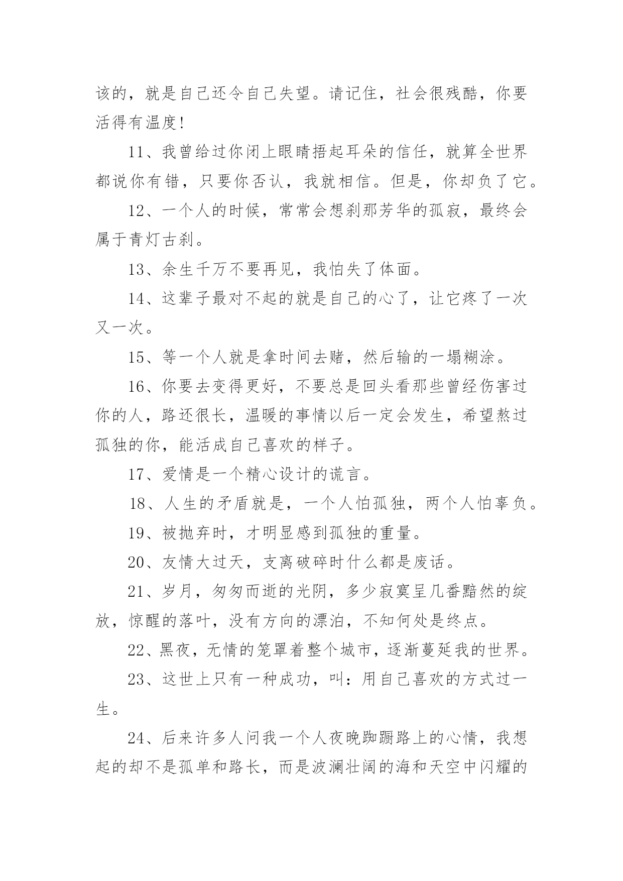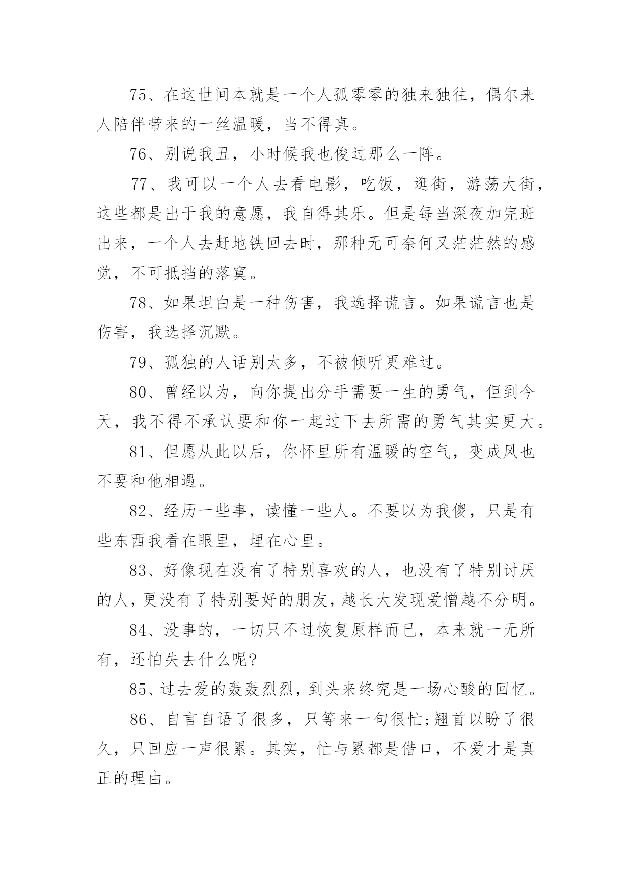 夜晚单身伤感说说文案夜晚单身伤感说说文案大全随着线上的、虚拟的社交的迅猛发展,越来越多人喜欢在网上发布文案,文案用以分享自己生活中值得纪念的小确幸。你还在找寻优秀经典的文案吗?下面是小编帮大家整理的夜晚单身伤感说说文案大全,仅供参考,大家一起来看看吧。1、我喜欢最初的自己,因为那时的我很天真也不会悲伤。2、拿出你的真心付出,才会得到别人真心的回报。3、矛盾像首尾互接的鱼,在这个世界中长久地存活着。4、我有一千种一万种想见你的理由,却唯独没有一个能见你的身份。5、我的所有伤痛和难受,在你的眼里都是轻描淡写的八个字,莫名其妙,无理取闹。6、我有时会莫名奇妙的笑,也会莫明的一种痛,只因为想到了你。7、你对俄许下的一时承诺,让俄一世都在回忆中蹉跎。8、愿你是那只刺猬,我予你柔软的环怀抱,你与我鲜血淋漓的爱。9、那些爱,那些年感谢有你一直相伴相守。10、这个世界已经有很多人和事会让你失望,而最不应该的,就是自己还令自己失望。请记住,社会很残酷,你要活得有温度!11、我曾给过你闭上眼睛捂起耳朵的信任,就算全世界都说你有错,只要你否认,我就相信。但是,你却负了它。12、一个人的时候,常常会想刹那芳华的孤寂,最终会属于青灯古刹。13、余生千万不要再见,我怕失了体面。14、这辈子最对不起的就是自己的心了,让它疼了一次又一次。15、等一个人就是拿时间去赌,然后输的一塌糊涂。16、你要去变得更好,不要总是回头看那些曾经伤害过你的人,路还很长,温暖的事情以后一定会发生,希望熬过孤独的你,能活成自己喜欢的样子。17、爱情是一个精心设计的谎言。18、人生的矛盾就是,一个人怕孤独,两个人怕辜负。19、被抛弃时,才明显感到孤独的重量。20、友情大过天,支离破碎时什么都是废话。21、岁月,匆匆而逝的光阴,多少寂寞呈几番黯然的绽放,惊醒的落叶,没有方向的漂泊,不知何处是终点。22、黑夜,无情的笼罩着整个城市,逐渐蔓延我的世界。23、这世上只有一种成功,叫:用自己喜欢的方式过一生。24、后来许多人问我一个人夜晚踟蹰路上的心情,我想起的却不是孤单和路长,而是波澜壮阔的海和天空中闪耀的星光。25、我一个人静静的走在马路上,走在灯光下,看着自己孤单的影子,内心一片冰冷,心里却拐了一个弯在想,你在哪里?26、对人对事都掏心挖肺的,最后,却只把自己感动了。27、单身久了,再碰到喜欢的人也会突然害怕,笑着摇摇头说算了。28、谢谢你让我失望,失望了就不会再抱有希望了。29、原地画个圈圈,告诉你,你被我圈在了我的心里。30、决定放弃的人,再遇到就别再心潮澎湃了。31、人在的时候,以为来日方长什么都有机会,其实人生是减法,见一面少一面。32、春天恋爱在鸟语花香的世界里,相依相偎,有一丝青涩和温纯。夏天痴狂在滂沱的雨中,在电闪雷鸣的季节里如痴如醉,你许我今生,我许你未来。33、慢慢把自己搁浅在无法拼凑的昨天。34、这是个泪雨纷飞的时节,雨若散落的薄愁,缘如浮云片片飘于相思的风中,空余一曲相思泪默落在尘埃里,殆尽于茫茫然然的长夜里。35、都说失去以后才懂得珍惜,其实珍惜后的失去最痛。36、当秋风吹落飞花片片惹起数不尽的凄美,当尘烟弥尽红尘模糊我的视线,亲爱的你,又在哪里?37、你说你会等我回来,你是等了,还找了一个人一起等。38、四天没洗头也敢出门了。最近连续加班到深夜,昨晚回来趴在床上就不知不觉睡着了。希望所有的事情都能有一个好的结果。好希望过了这一段儿,可以出去好好去休个假……39、要么庸俗,要么孤独。我不介意孤独,比爱你舒服。40、我爱你爱的那么深刻,你伤我伤的那么彻底。41、我只是睡不着。几天的时间,一个朋友都没来得及相聚。没有相聚就分离,也不知与谁相聚。深夜思前想后无法入睡,记起儿时姥姥种种,已离世四年半了,每每想念,总泪流满面。心里满是忧伤,明天不知作何,与谁相见或不见相离货不离。只剩一声叹息。42、我的天空你不理解,那又有什么关系呢,你又不是那个陪我共度余生的人。43、深夜里重播的影片像日子重播一百遍.44、感谢曾经深爱过的人,无论伤楚有多深,都谢谢你,毕竟曾经深深的爱过,曾经开心幸福的一起走过。45、总在想,有没有人跟我一样,在漆黑的夜晚寻找希望。46、我在你背后开不了口,多希望你在下个路口就会牵起我的手。47、我不怕孤单,我只怕没有你,怪自己太过平庸至极,没能让你一眼着迷。48、你可以输,你可以哭,但不可以不坚强。49、不是谁什么都有,也不是谁什么都没有。50、最深的孤独不是长久一个人,而是心里没有了任何的期望。51、如果有一天你发现我不在乎你了,请你想一想当初我在乎你的时候你有没有在乎过我。52、喜欢请回答1988,喜欢阿泽,应该也没人会不喜欢他,一个被上天保护的如此纯真又善良的人,怎么不令人心生羡慕。体会过特别彻底的绝望,不止一次在深夜无法入睡的时候起床看似做