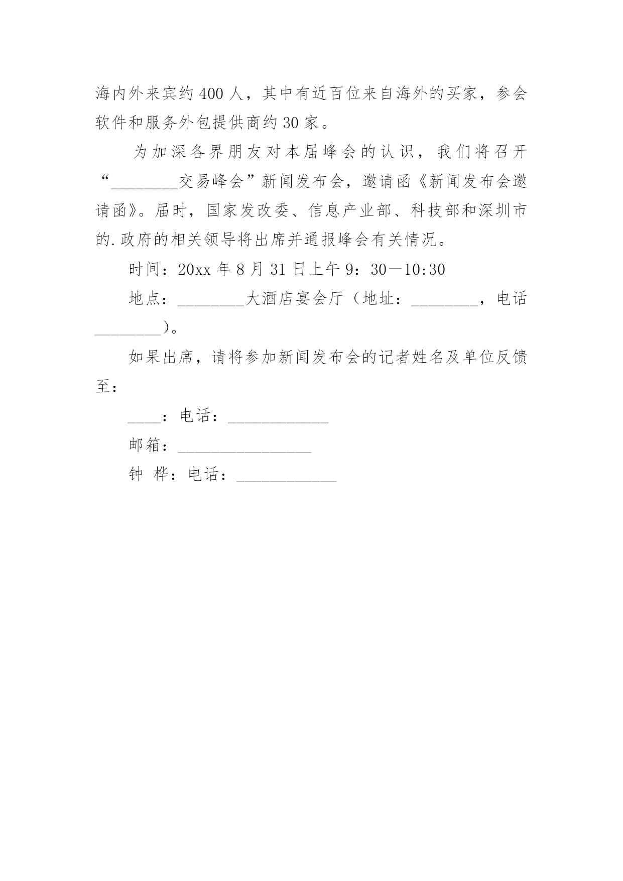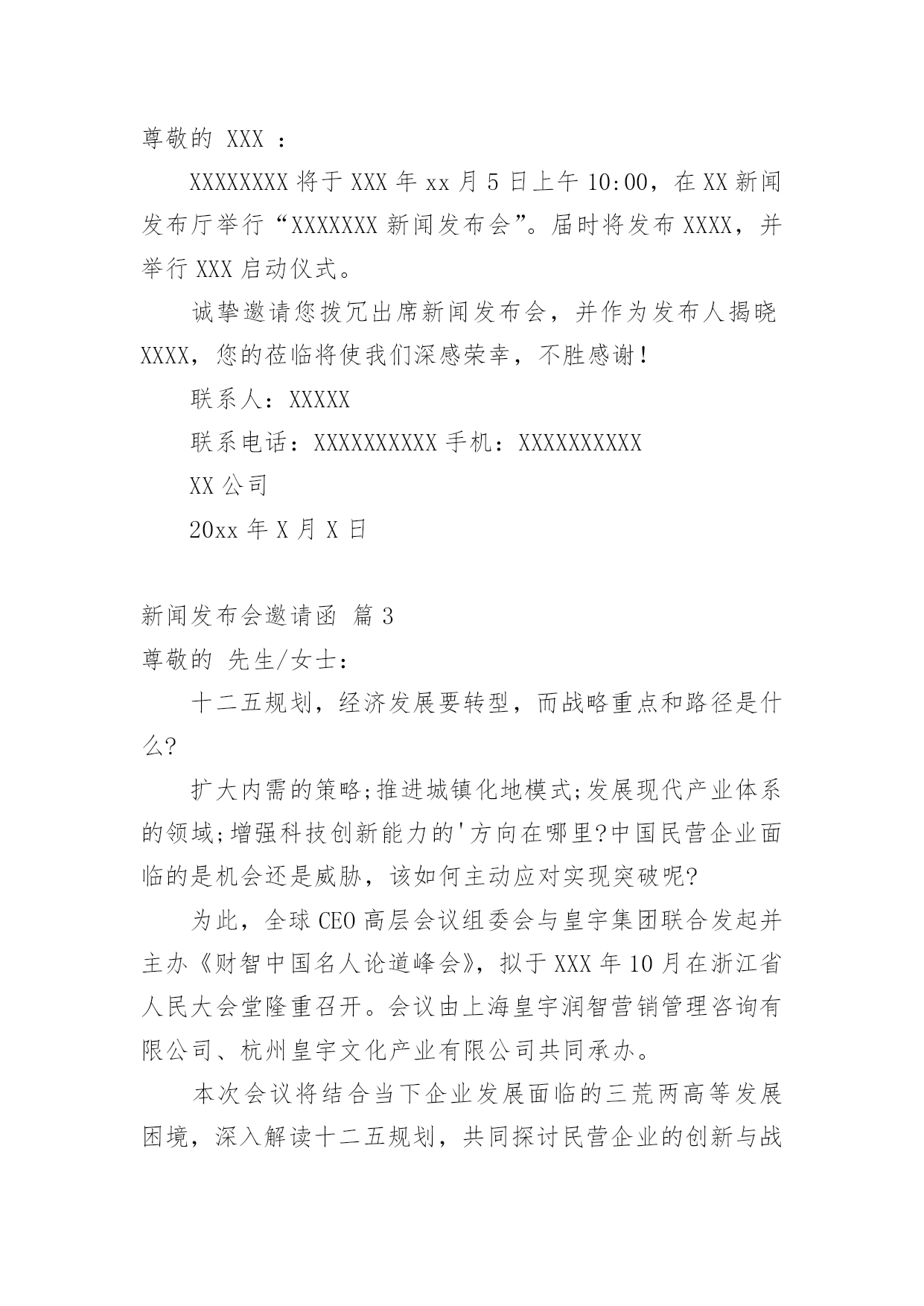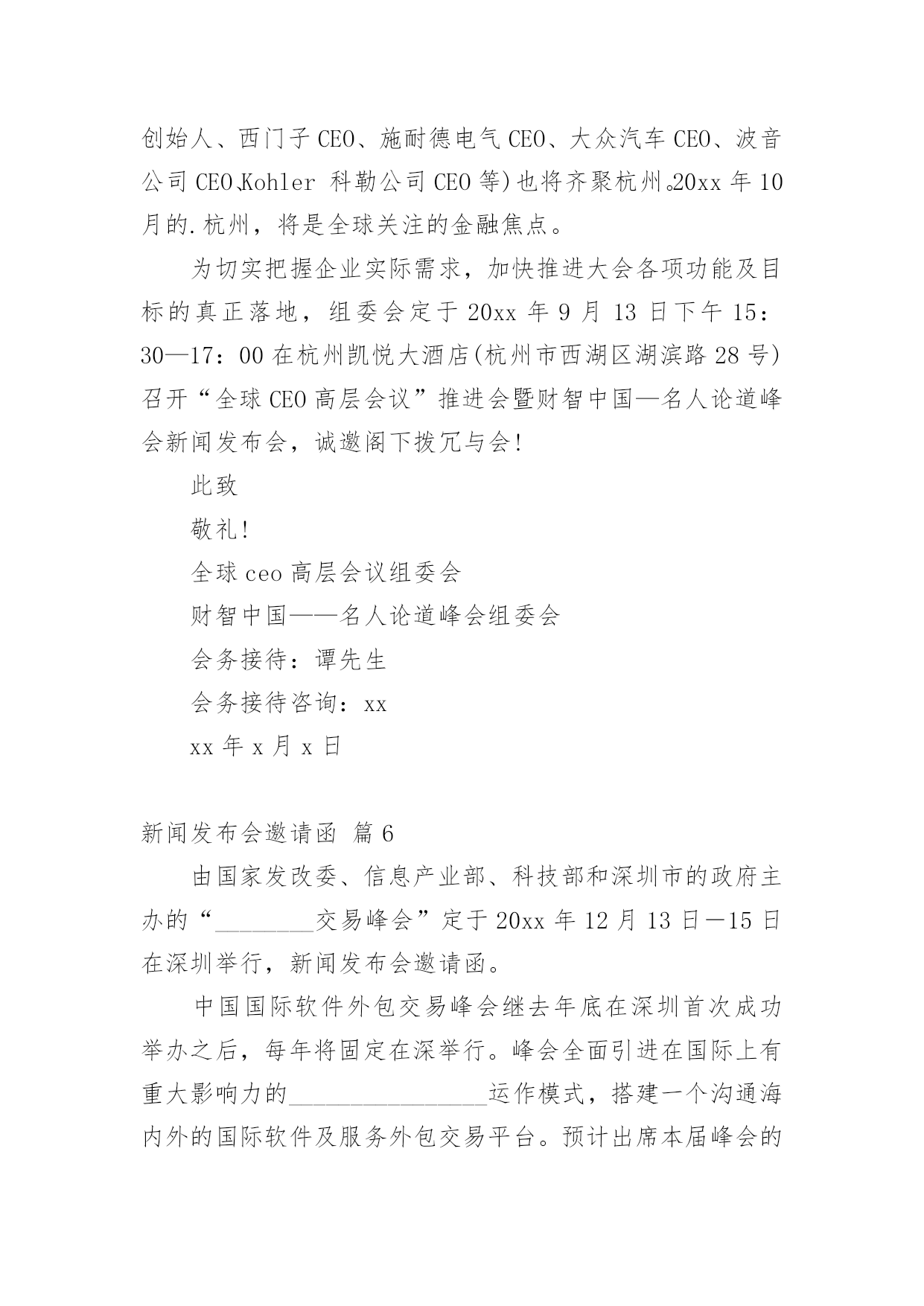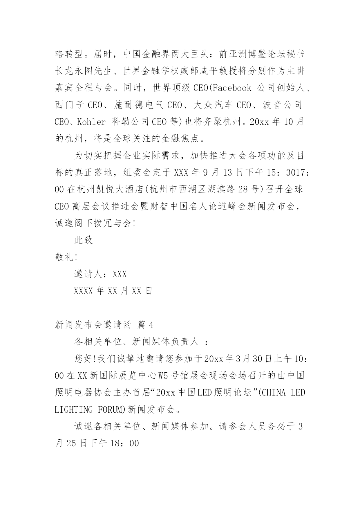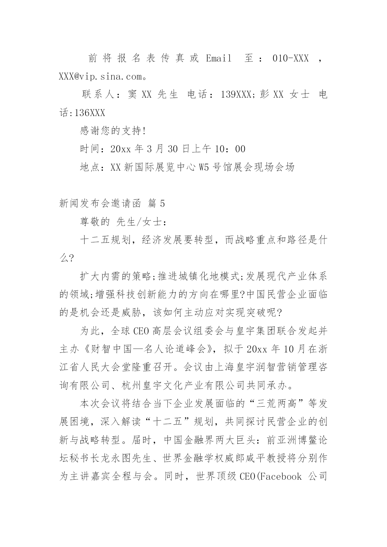 新闻发布会邀请函新闻发布会邀请函锦集6篇邀请函书写应该简要精练,大方得体,首尾呼应。在生活中,邀请函使用的次数愈发增长,我们该怎么拟定邀请函呢?下面是小编精心整理的新闻发布会邀请函6篇,希望对大家有所帮助。新闻发布会邀请函篇1尊敬的先生/女士:您好!我们诚挚邀请您参加于年月日时在召开的,由XX公司主办的“XX新闻发布会”。本次活动力邀多位政府领导、行业专家、众多知名商家,共同探讨XX行业XX之路的.机遇和挑战,见证XX的未来发展,届时将有众多具有重大影响力的媒体进行全程跟踪报道。谨此,我们诚挚邀请您拨冗出席发布会活动,衷心感谢您的支持和指导!并请于年月日填妥参会回执,电邮或传真至,以便为您安排参会相关事宜。详情请参见附件会议议程,欢迎垂询。XX公司20xx年X月X日新闻发布会邀请函篇2尊敬的XXX:XXXXXXXX将于XXX年xx月5日上午10:00,在XX新闻发布厅举行“XXXXXXX新闻发布会”。届时将发布XXXX,并举行XXX启动仪式。诚挚邀请您拨冗出席新闻发布会,并作为发布人揭晓XXXX,您的莅临将使我们深感荣幸,不胜感谢!联系人:XXXXX联系电话:XXXXXXXXXX手机:XXXXXXXXXXXX公司20xx年X月X日新闻发布会邀请函篇3尊敬的先生/女士:十二五规划,经济发展要转型,而战略重点和路径是什么?扩大内需的策略;推进城镇化地模式;发展现代产业体系的领域;增强科技创新能力的'方向在哪里?中国民营企业面临的是机会还是威胁,该如何主动应对实现突破呢?为此,全球CEO高层会议组委会与皇宇集团联合发起并主办《财智中国名人论道峰会》,拟于XXX年10月在浙江省人民大会堂隆重召开。会议由上海皇宇润智营销管理咨询有限公司、杭州皇宇文化产业有限公司共同承办。本次会议将结合当下企业发展面临的三荒两高等发展困境,深入解读十二五规划,共同探讨民营企业的创新与战略转型。届时,中国金融界两大巨头:前亚洲博鳖论坛秘书长龙永图先生、世界金融学权威郎咸平教授将分别作为主讲嘉宾全程与会。同时,世界顶级CEO(Facebook公司创始人、西门子CEO、施耐德电气CEO、大众汽车CEO、波音公司CEO、Kohler科勒公司CEO等)也将齐聚杭州。20xx年10月的杭州,将是全球关注的金融焦点。为切实把握企业实际需求,加快推进大会各项功能及目标的真正落地,组委会定于XXX年9月13日下午15:3017:00在杭州凯悦大酒店(杭州市西湖区湖滨路28号)召开全球CEO高层会议推进会暨财智中国名人论道峰会新闻发布会,诚邀阁下拨冗与会!此致敬礼!邀请人:XXXXXXX年XX月XX日新闻发布会邀请函篇4各相关单位、新闻媒体负责人:您好!我们诚挚地邀请您参加于20xx年3月30日上午10:00在XX新国际展览中心W5号馆展会现场会场召开的由中国照明电器协会主办首届“20xx中国LED照明论坛”(CHINALEDLIGHTINGFORUM)新闻发布会。诚邀各相关单位、新闻媒体参加。请参会人员务必于3月25日下午18:00前将报名表传真或Email至:010-XXX,XXX@vip.sina.com。联系人:窦XX先生电话:139XXX;彭XX女士电话:136XXX感谢您的支持!时间:20xx年3月30日上午10:00地点:XX新国际展览中心W5号馆展会现场会场新闻发布会邀请函篇5尊敬的先生/女士:十二五规划,经济发展要转型,而战略重点和路径是什么?扩大内需的策略;推进城镇化地模式;发展现代产业体系的领域;增强科技创新能力的方向在哪里?中国民营企业面临的是机会还是威胁,该如何主动应对实现突破呢?为此,全球CEO高层会议组委会与皇宇集团联合发起并主办《财智中国—名人论道峰会》,拟于20xx年10月在浙江省人民大会堂隆重召开。会议由上海皇宇润智营销管理咨询有限公司、杭州皇宇文化产业有限公司共同承办。本次会议将结合当下企业发展面临的“三荒两高”等发展困境,深入解读“十二五”规划,共同探讨民营企业的创新与战略转型。届时,中国金融界两大巨头:前亚洲博鳖论坛秘书长龙永图先生、世界金融学权威郎咸平教授将分别作为主讲嘉宾全程与会。同时,世界顶级CEO(Facebook公司创始人、西门子CEO、施耐德电气CEO、大众汽车CEO、波音公司CEO、Kohler科勒公司CEO等)也将齐聚杭州。20xx年10月的.杭州,将是全球关注的金融焦点。为切实把握企业实际需求,加快推进大会各项功能及目标的真正落地,组委会定于20xx年9月13日下午15:30—17:00在杭州凯悦大酒店(杭州市西湖区湖滨路28号)召开“全球CEO高层会议”推进会暨财智中国—名人论道峰会新闻发布会,诚邀阁下拨冗与会!此致敬礼!全球ceo高层会议组委会财智中国——名人论道峰会组委会会务接待:谭先生会务接待咨询:xx