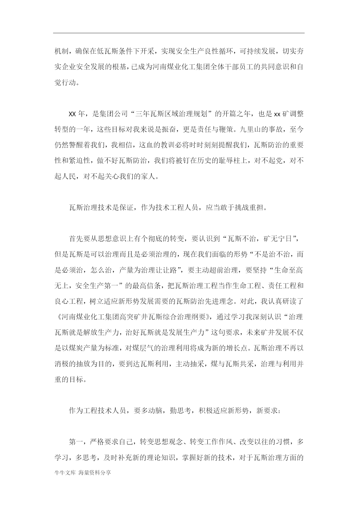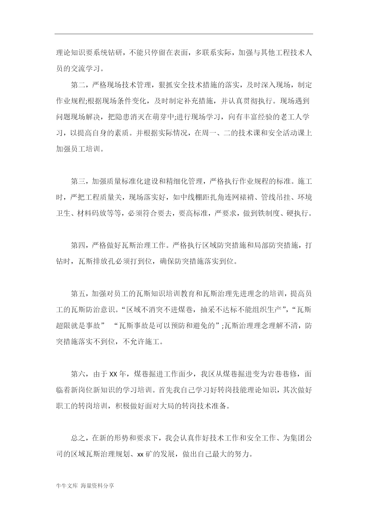 牛牛文库海量资料分享煤矿工程技术人员个人自我总结我叫xxx,XX年8月我来到xx矿工作,在xx矿的三年多,我学会了很多书本上没有的经验,掌握了很多实践技能,这三年我的进步与成长与领导的关爱、同事的团结协作是分不开的。这次对我来说,是一个积极反省自身的不足和接受领导的批评指正的机会,是一个可以与同事们一起讨论瓦斯防治业务的机会,更是我提高技术水平的一次机会。回顾在近一年的工作,我发现了自身的很多不足,借此机会,希望领导和同志们给予批评与指正:第一,学习态度不端正,作为技术员,理论技术是我的长项,可是我没有抱着谦虚的态度去继续学习,理论知识掌握不精进,没有更深层次的去钻研。对上级政策、文件和精神学习时间不够,学习深度不够,认识理解还不是很到位。第二,工作方法上,有很多需要提高,比如,与职工群众的交流不够,没有及时深入职工之间了解所需所求。工作中有时心急气躁,没能够注意方式和方法,不够沉稳练达。第三,思想认识不到位,转变观念不及时,不能积极地适应新形势的变化。面对新的形势,我必须深刻认识到自身的不足,认真的改正,降低姿态,审时度势,脚踏实地应对“区域瓦斯治理三年规划”的发展要求。我们xx矿区地质条件复杂,瓦斯治理难度大,瓦斯问题已成为严重制约xx矿安全高效发展的核心问题和重要瓶颈。学习淮南、更新观念、痛下决心、完善机制,确保在低瓦斯条件下开采,实现安全生产良性循环,可持续发展,切实夯实企业安全发展的根基,已成为河南煤业化工集团全体干部员工的共同意识和自觉行动。XX年,是集团公司“三年瓦斯区域治理规划”的开篇之年,也是xx矿调整转型的一年,这些目标对我来说是振奋,更是责任与鞭策。九里山的事故,至今仍然警醒着我们,我相信,这血的教训必将时时刻刻提醒我们,瓦斯防治的重要性和紧迫性,做不好瓦斯防治,我们将被钉在历史的耻辱柱上,对不起党,对不起人民,对不起关心我们的家人。瓦斯治理技术是保证,作为技术工程人员,应当敢于挑战重担。首先要从思想意识上有个彻底的转变,要认识到“瓦斯不治,矿无宁日”,但是瓦斯是可以治理而且是必须治理的,现在我们面临的形势“不是治不治,而是必须治,怎么治,产量为治理让让路”,要主动超前治理,要坚持“生命至高无上,安全生产第一”的最高信条,把瓦斯治理工程当作生命工程、责任工程和良心工程,树立适应新形势发展需要的瓦斯防治先进理念。对此,我认真研读了《河南煤业化工集团高突矿井瓦斯综合治理纲要》,通过学习我深刻认识“治理瓦斯就是解放生产力,治好瓦斯就是发展生产力”这句要求,未来矿井发展不仅是以煤炭产量为标准,对煤层气的治理利用将成为新的增长点。瓦斯治理不再以消极的抽放为目的,要到达瓦斯利用,主动抽采,煤与瓦斯共采,治理与利用并重的目标。作为工程技术人员,要多动脑,勤思考,积极适应新形势,新要求:第一,严格要求自己,转变思想观念、转变工作作风、改变以往的习惯,多学习,多思考,及时补充新的理论知识,掌握好新的技术,对于瓦斯治理方面的理论知识要系统钻研,不能只停留在表面,多联系实际,加强与其他工程技术人员的交流学习。第二,严格现场技术管理,狠抓安全技术措施的落实,及时深入现场,制定作业规程;根据现场条件变化,及时制定补充措施,并认真贯彻执行。现场遇到问题现场解决,把隐患消灭在萌芽中;进行现场学习,向有丰富经验的老工人学习,以提高自身的素质。并根据实际情况,在周一、二的技术课和安全活动课上加强员工培训。第三,加强质量标准化建设和精细化管理,严格执行作业规程的标准。施工时,严把工程质量关,现场落实好,如中线棚距扎角连网裱褙、管线吊挂、环境卫生、材料码放等等,必须符合要去,要高标准,严要求,做到铁制度、硬执行。第四,严格做好瓦斯治理工作。严格执行区域防突措施和局部防突措施,打钻时,瓦斯排放孔必须打到位,确保防突措施落实到位。第五,加强对员工的瓦斯知识培训教育和瓦斯治理先进理念的培训,提高员工的瓦斯防治意识。“区域不消突不进煤巷,抽采不达标不能组织生产”,“瓦斯超限就是事故”“瓦斯事故是可以预防和避免的”;瓦斯治理理念理解不清,防突措施落实不到位,不允许施工。第六,由于XX年,煤巷掘进工作面少,我区从煤巷掘进变为岩巷巷修,面临着新岗位新知识的学习培训。首先我自己学习好转岗技能理论知识,其次做好职工的转岗培训,积极做好面对大局的转岗技术准备。总之,在新的形势和要求下,我会认真作好技术工作和安全工作、为集团公司的区域瓦斯治理规划、xx矿的发展,做出自己最大的努力。
