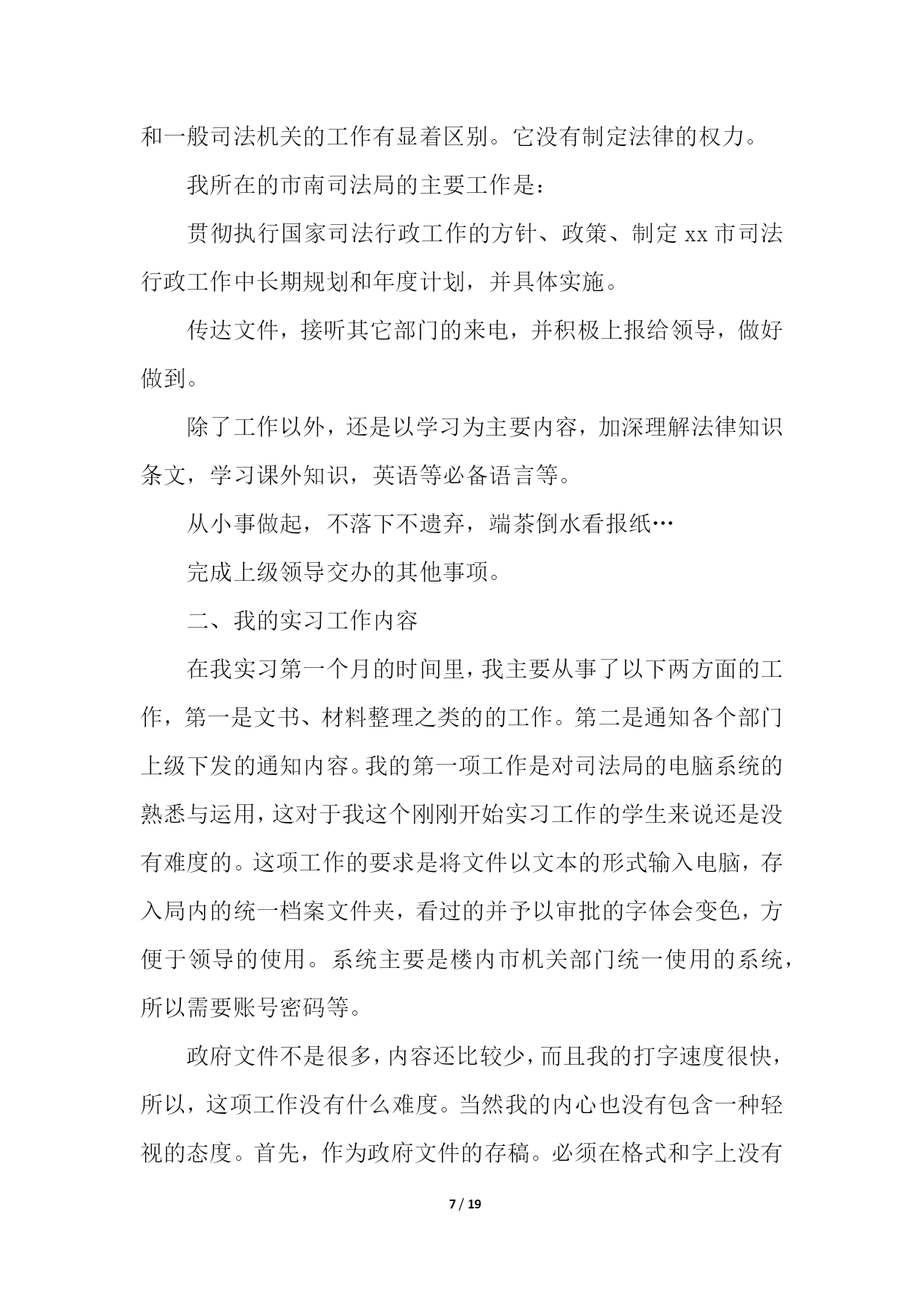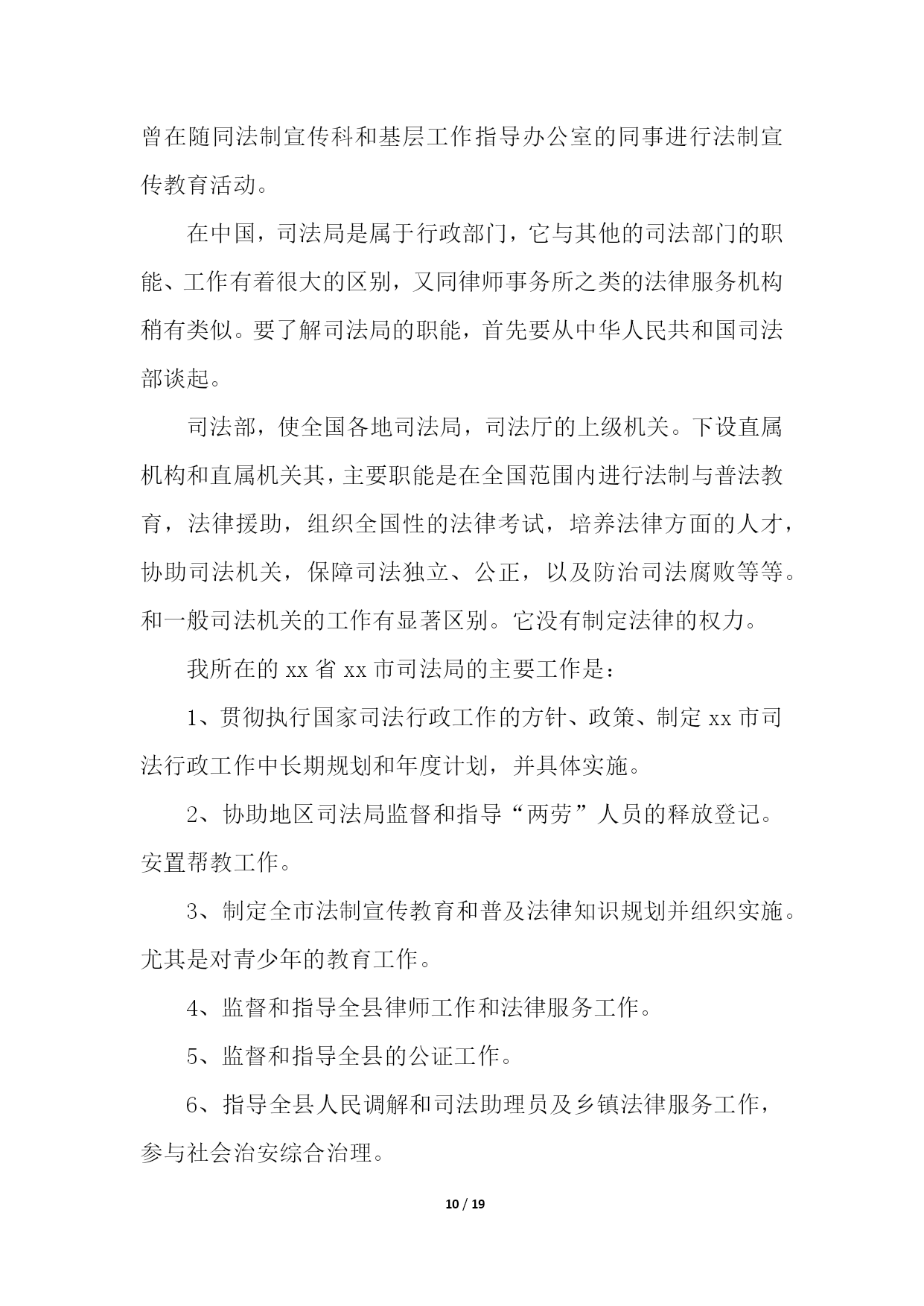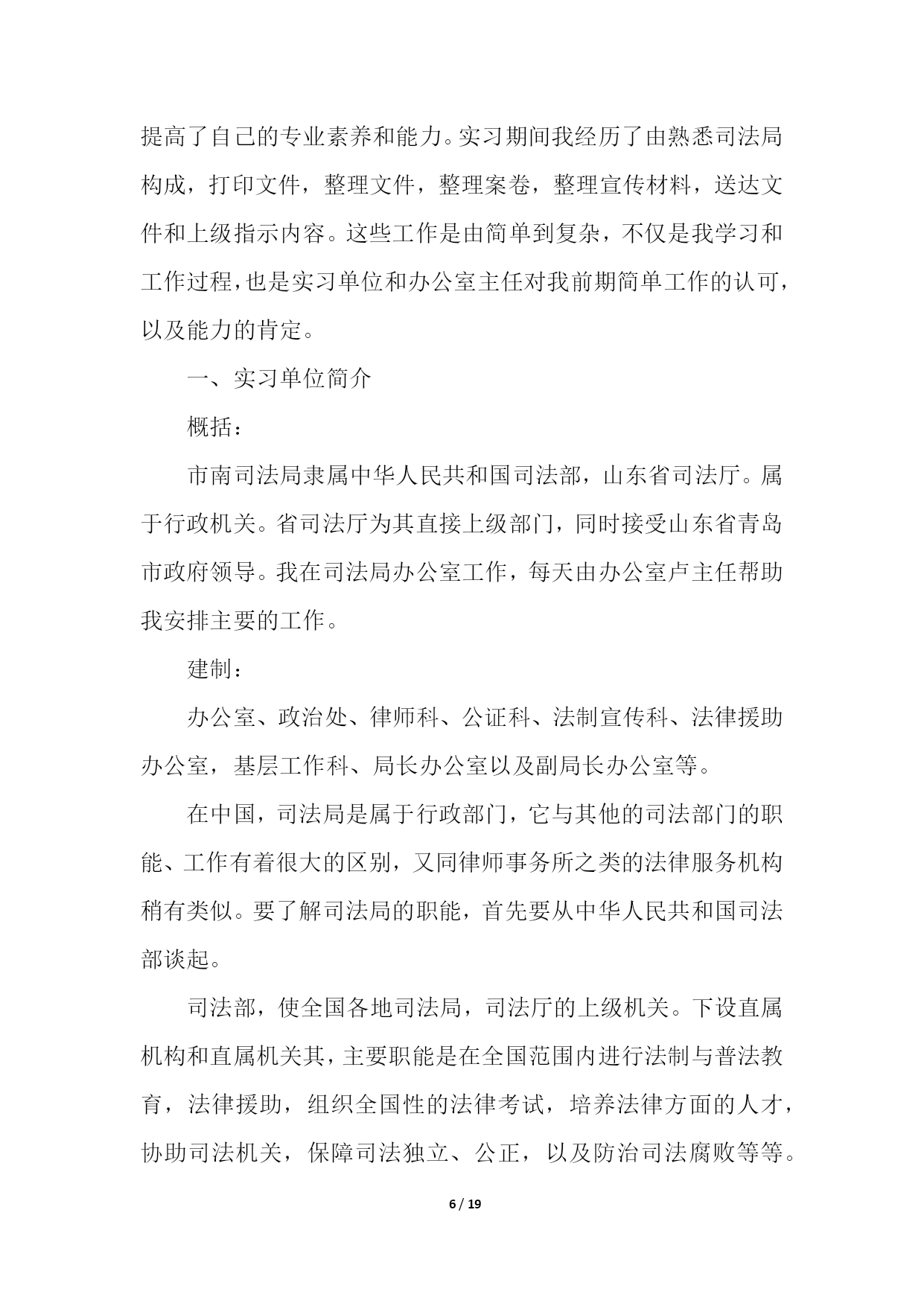 PAGE19/NUMPAGES19司法局的实习报告模板汇总五篇司法局的实习报告篇1我在市南司法局进行了为期半年的实习工作,在这6个月左右的时间里,我在的办公室主任的帮助下,在经历了几多尴尬和困难下,顺利地完成了实习任务,并获得了丰富的工作经验,巩固并检验了自己几年来本科学习的知识,提高了自己的专业素养和能力。实习期间我经历了由熟悉司法局构成,打印文件,整理文件,整理案卷,整理宣传材料,送达文件和上级指示内容。这些工作是由简单到复杂,不仅是我学习和工作过程,也是实习单位和办公室主任对我前期简单工作的认可,以及能力的肯定。一、实习单位简介概括:市南司法局隶属中华人民共和国司法部,山东省司法厅。属于行政机关。省司法厅为其直接上级部门,同时接受山东省青岛市政府领导。我在司法局办公室工作,每天由办公室卢主任帮助我安排主要的工作。建制:办公室、政治处、律师科、公证科、法制宣传科、法律援助办公室,基层工作科、局长办公室以及副局长办公室等。在中国,司法局是属于行政部门,它与其他的司法部门的职能、工作有着很大的区别,又同律师事务所之类的法律服务机构稍有类似。要了解司法局的职能,首先要从中华人民共和国司法部谈起。司法部,使全国各地司法局,司法厅的上级机关。下设直属机构和直属机关其,主要职能是在全国范围内进行法制与普法教育,法律援助,组织全国性的法律考试,培养法律方面的人才,协助司法机关,保障司法独立、公正,以及防治司法腐败等等。和一般司法机关的工作有显著区别。它没有制定法律的权力。我所在的市南司法局的主要工作是:1、贯彻执行国家司法行政工作的方针、政策、制定xx市司法行政工作中长期规划和年度计划,并具体实施。2、传达文件,接听其它部门的来电,并积极上报给领导,做好做到。3、除了工作以外,还是以学习为主要内容,加深理解法律知识条文,学习课外知识,英语等必备语言等。4、从小事做起,不落下不遗弃,端茶倒水看报纸…5、完成上级领导交办的其他事项。二、我的实习工作内容在我实习第一个月的时间里,我主要从事了以下两方面的工作,第一是文书、材料整理之类的的工作。第二是通知各个部门上级下发的通知内容。我的第一项工作是对司法局的电脑系统的熟悉与运用,这对于我这个刚刚开始实习工作的学生来说还是没有难度的。这项工作的要求是将文件以文本的形式输入电脑,存入局内的统一档案文件夹,看过的并予以审批的字体会变色,方便于领导的使用。系统主要是楼内市机关部门统一使用的系统,所以需要账号密码等。政府文件不是很多,内容还比较少,而且我的打字速度很快,所以,这项工作没有什么难度。当然我的内心也没有包含一种轻视的态度。首先,作为政府文件的存稿。必须在格式和字上没有丝毫的错误,必须怀着严谨的态度和认真负责的精神将它完成。其次,作为我实习的第一项工作,必须要将它做好,给实习单位留下好的印象。进入立秋时节,由省司法厅省,公安厅统一下发文件,组织各地方司法局,公安局,在市区,社区开展丰富的文体活动。接到市政府的通知以后,市南区司法局内,办公室,法制宣传科的人员开始行动了起来,作为一名实习人员,在卢主任的安排下,我也参与到了这次行动中。积极参与各项活动,帮忙打下手。三、实习总结在整个实习期间,我接触了大量的专业人员,和专业知识,通过亲自实践进行宣传活动。是我对大学里学习到的专业知识有了更为深刻和生动的理解,通过理论和实践了结合,更加准确的掌握了法律知识的内涵。这次实习经验并不是能够可以通过学校书本知识就可以掌握到的。在实践中,我领会到了,专业知识与实际实践应用上的差别。当前我们国家的法律法规在不断的完善,每天都会有新的法律法规的出台,各种政府文件数不胜数,因此只有每一天,每一刻不断的吸收新的知识,不断完善自己才能够在法律这一行业立足脚步,寻求新的成就。司法局的实习报告篇2实习时间:××年×月×日——××年×月×日实习地点:我市司法局实习目的和任务:通过暑假在司法局实习,巩固自己的专业知识,把理论知识和实践技能相结合,积累丰富的工作经验,检验自己多年所学的专业知识,提高专业能力和素养,为将来踏上社会奠定坚实的基础。实习单位概况:市司法局属于行政机关,有办公室、公证科、政治处、法制宣传科、法律援助办公室、律师科、局长办公室以及副局长办公室等部门。我实习的司法局主要工作就是接发文件,接听其它部门的电话,并主动上报给领导。实习内容和过程:暑假我在司法局实习的第一个月主要就是从事文书、材料的整理工作以及通知各部门领导下发的通知等,在实习中要求对司法局电脑系统能够熟练的操作和应用,这对我刚刚开始实习的大学生来说还不算特别难。我要把文件用文本的方式输入电脑,存在档案夹里,方便领导的查阅,政府文件相对不对,内容也比较简单比较少,我打字速度也算快,所以做起来并不感觉到有什么压力,当然我也不敢有一丝