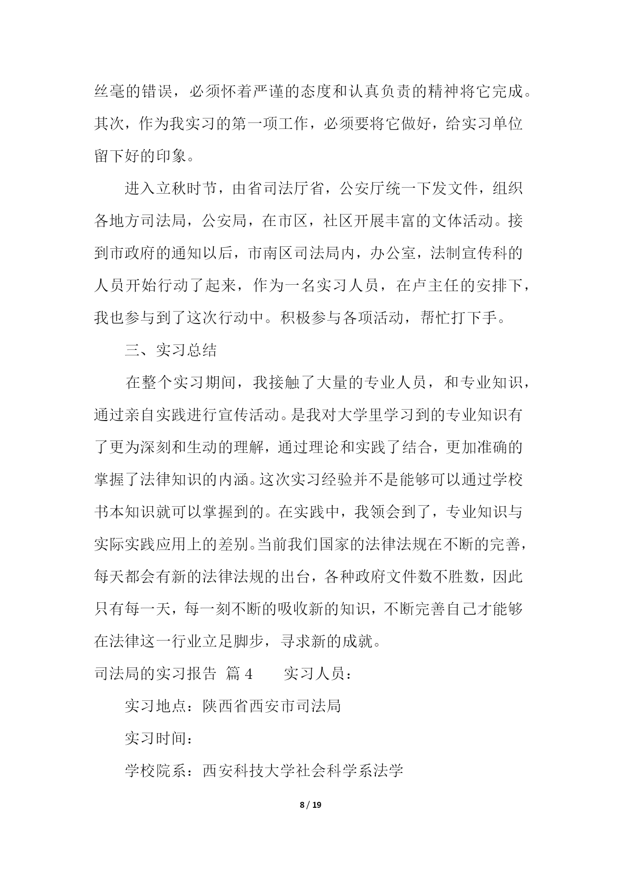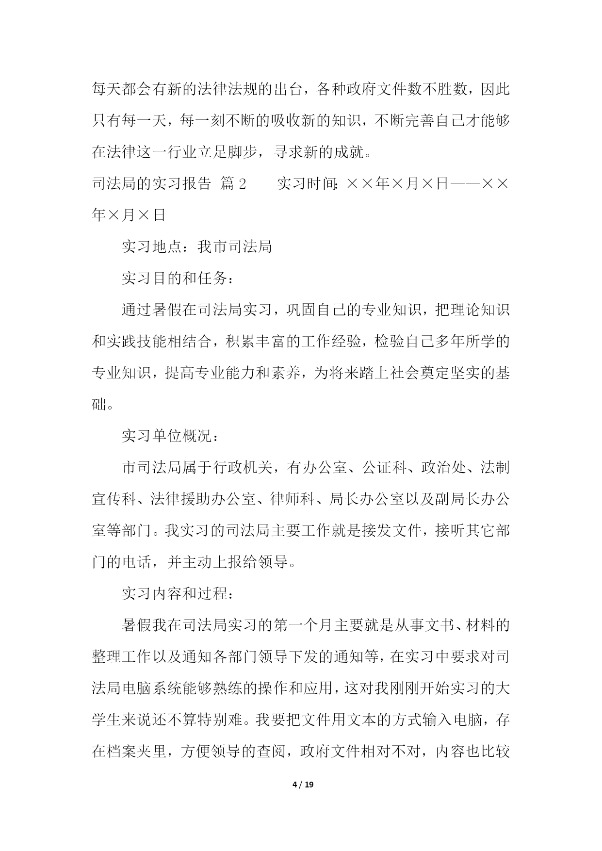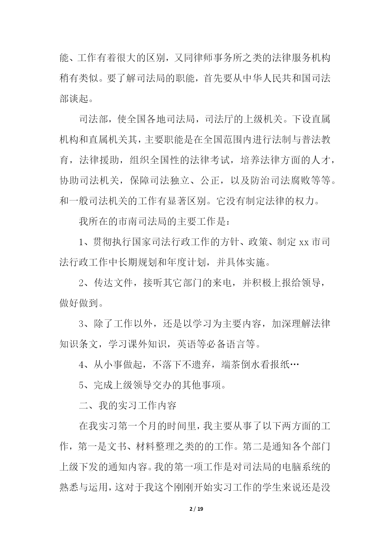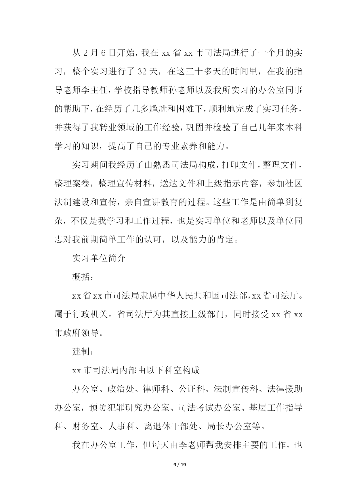 PAGE19/NUMPAGES19司法局的实习报告模板汇总五篇司法局的实习报告篇1我在市南司法局进行了为期半年的实习工作,在这6个月左右的时间里,我在的办公室主任的帮助下,在经历了几多尴尬和困难下,顺利地完成了实习任务,并获得了丰富的工作经验,巩固并检验了自己几年来本科学习的知识,提高了自己的专业素养和能力。实习期间我经历了由熟悉司法局构成,打印文件,整理文件,整理案卷,整理宣传材料,送达文件和上级指示内容。这些工作是由简单到复杂,不仅是我学习和工作过程,也是实习单位和办公室主任对我前期简单工作的认可,以及能力的肯定。一、实习单位简介概括:市南司法局隶属中华人民共和国司法部,山东省司法厅。属于行政机关。省司法厅为其直接上级部门,同时接受山东省青岛市政府领导。我在司法局办公室工作,每天由办公室卢主任帮助我安排主要的工作。建制:办公室、政治处、律师科、公证科、法制宣传科、法律援助办公室,基层工作科、局长办公室以及副局长办公室等。在中国,司法局是属于行政部门,它与其他的司法部门的职能、工作有着很大的区别,又同律师事务所之类的法律服务机构稍有类似。要了解司法局的职能,首先要从中华人民共和国司法部谈起。司法部,使全国各地司法局,司法厅的上级机关。下设直属机构和直属机关其,主要职能是在全国范围内进行法制与普法教育,法律援助,组织全国性的法律考试,培养法律方面的人才,协助司法机关,保障司法独立、公正,以及防治司法腐败等等。和一般司法机关的工作有显著区别。它没有制定法律的权力。我所在的市南司法局的主要工作是:1、贯彻执行国家司法行政工作的方针、政策、制定xx市司法行政工作中长期规划和年度计划,并具体实施。2、传达文件,接听其它部门的来电,并积极上报给领导,做好做到。3、除了工作以外,还是以学习为主要内容,加深理解法律知识条文,学习课外知识,英语等必备语言等。4、从小事做起,不落下不遗弃,端茶倒水看报纸…5、完成上级领导交办的其他事项。二、我的实习工作内容在我实习第一个月的时间里,我主要从事了以下两方面的工作,第一是文书、材料整理之类的的工作。第二是通知各个部门上级下发的通知内容。我的第一项工作是对司法局的电脑系统的熟悉与运用,这对于我这个刚刚开始实习工作的学生来说还是没有难度的。这项工作的要求是将文件以文本的形式输入电脑,存入局内的统一档案文件夹,看过的并予以审批的字体会变色,方便于领导的使用。系统主要是楼内市机关部门统一使用的系统,所以需要账号密码等。政府文件不是很多,内容还比较少,而且我的打字速度很快,所以,这项工作没有什么难度。当然我的内心也没有包含一种轻视的态度。首先,作为政府文件的存稿。必须在格式和字上没有丝毫的错误,必须怀着严谨的态度和认真负责的精神将它完成。其次,作为我实习的第一项工作,必须要将它做好,给实习单位留下好的印象。进入立秋时节,由省司法厅省,公安厅统一下发文件,组织各地方司法局,公安局,在市区,社区开展丰富的文体活动。接到市政府的通知以后,市南区司法局内,办公室,法制宣传科的人员开始行动了起来,作为一名实习人员,在卢主任的安排下,我也参与到了这次行动中。积极参与各项活动,帮忙打下手。三、实习总结在整个实习期间,我接触了大量的专业人员,和专业知识,通过亲自实践进行宣传活动。是我对大学里学习到的专业知识有了更为深刻和生动的理解,通过理论和实践了结合,更加准确的掌握了法律知识的内涵。这次实习经验并不是能够可以通过学校书本知识就可以掌握到的。在实践中,我领会到了,专业知识与实际实践应用上的差别。当前我们国家的法律法规在不断的完善,每天都会有新的法律法规的出台,各种政府文件数不胜数,因此只有每一天,每一刻不断的吸收新的知识,不断完善自己才能够在法律这一行业立足脚步,寻求新的成就。司法局的实习报告篇2实习时间:××年×月×日——××年×月×日实习地点:我市司法局实习目的和任务:通过暑假在司法局实习,巩固自己的专业知识,把理论知识和实践技能相结合,积累丰富的工作经验,检验自己多年所学的专业知识,提高专业能力和素养,为将来踏上社会奠定坚实的基础。实习单位概况:市司法局属于行政机关,有办公室、公证科、政治处、法制宣传科、法律援助办公室、律师科、局长办公室以及副局长办公室等部门。我实习的司法局主要工作就是接发文件,接听其它部门的电话,并主动上报给领导。实习内容和过程:暑假我在司法局实习的第一个月主要就是从事文书、材料的整理工作以及通知各部门领导下发的通知等,在实习中要求对司法局电脑系统能够熟练的操作和应用,这对我刚刚开始实习的大学生来说还不算特别难。我要把文件用文本的方式输入电脑,存在档案夹里,方便领导的查阅,政府文件相对不对,内容也比较简单比较少,我打字速度也算快,所以做起来并不感觉到有什么压力,当然我也不敢有一丝
