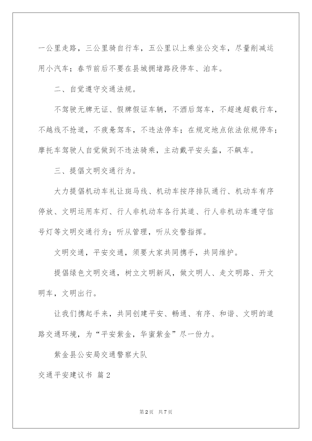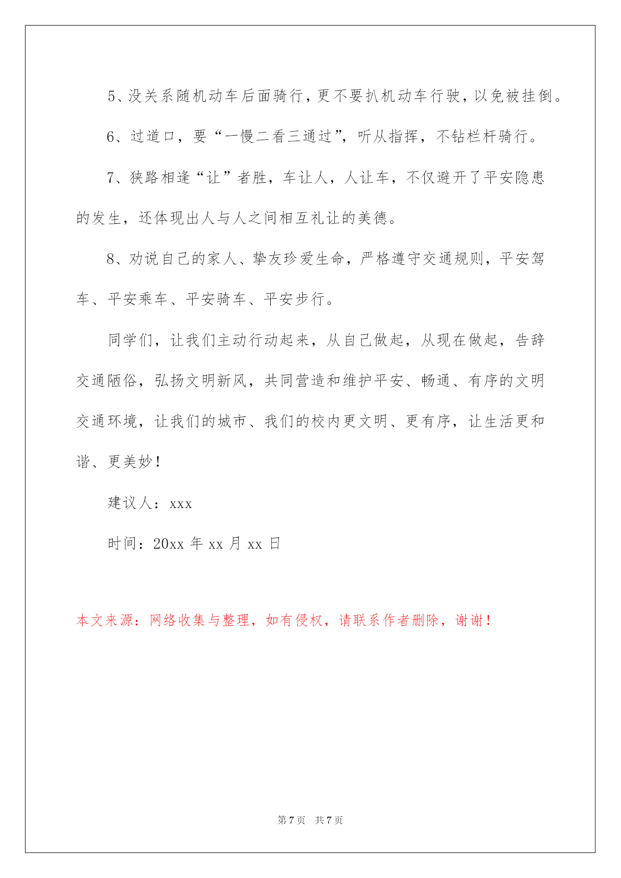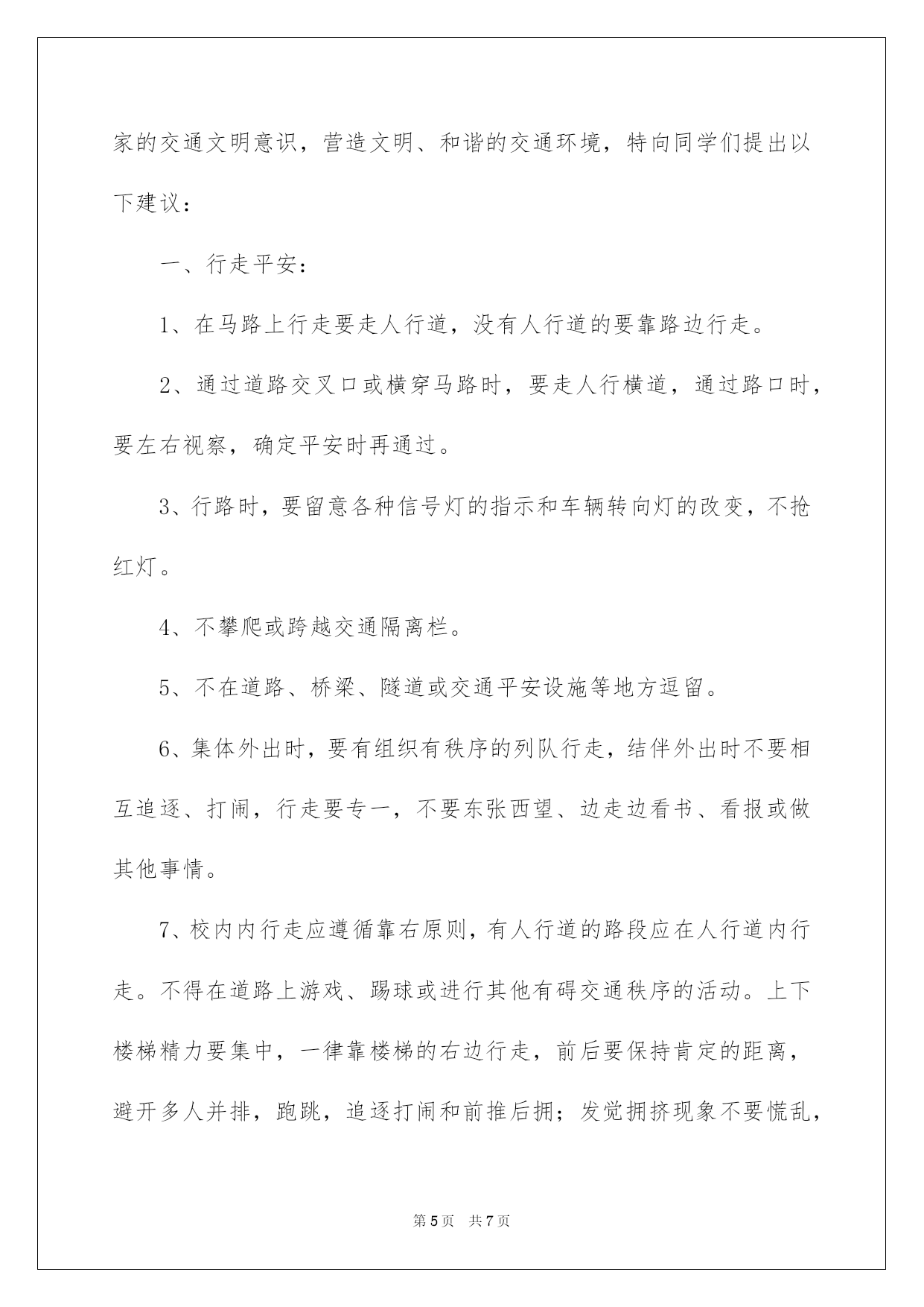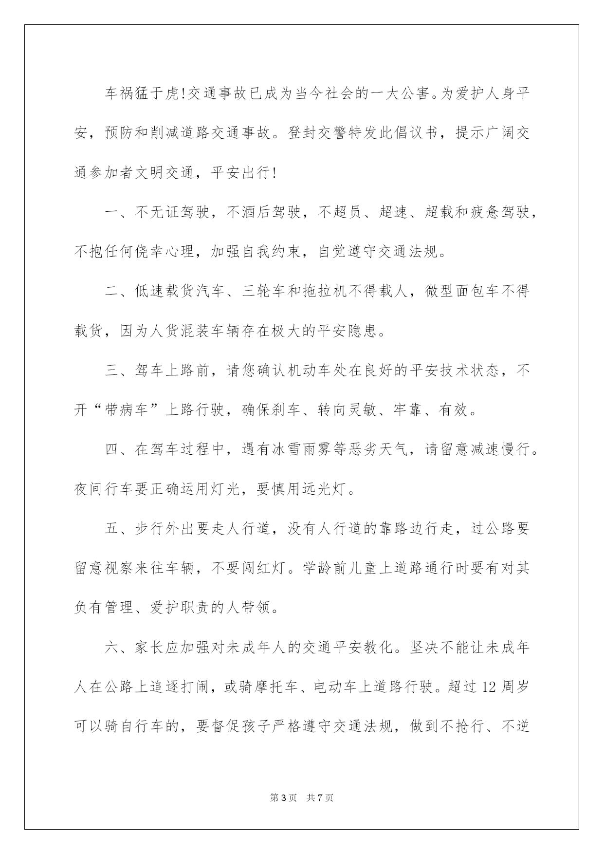 第PAGE\*Arabic\*MERGEFORMAT7页共NUMPAGES\*Arabic\*MERGEFORMAT7页第PAGE\*MERGEFORMAT7页共NUMPAGES\*MERGEFORMAT7页第PAGE\*MERGEFORMAT7页共NUMPAGES\*MERGEFORMAT7页第PAGE\*MERGEFORMAT7页共NUMPAGES\*MERGEFORMAT7页第PAGE\*MERGEFORMAT7页共NUMPAGES\*MERGEFORMAT7页第PAGE\*MERGEFORMAT7页共NUMPAGES\*MERGEFORMAT7页第PAGE\*MERGEFORMAT7页共NUMPAGES\*MERGEFORMAT7页第PAGE\*MERGEFORMAT7页共NUMPAGES\*MERGEFORMAT7页第PAGE\*MERGEFORMAT7页共NUMPAGES\*MERGEFORMAT7页第PAGE\*MERGEFORMAT7页共NUMPAGES\*MERGEFORMAT7页第PAGE\*MERGEFORMAT7页共NUMPAGES\*MERGEFORMAT7页2022交通安全建议书交通平安建议书3篇在日常生活和工作中,建议书对我们的作用越来越大,建议书是个人或者单位有关方面为了开展某项工作,完成某项任务或进行某种活动而倡议大家一起做什么事情,或提出合理化的看法、建议时运用的一种文体。那么一般建议书是怎么写的呢?下面是我帮大家整理的交通平安建议书3篇,欢迎阅读与保藏。交通平安建议书篇1广阔交通参加者:一年一度的春节即将来临。为使春运期间广阔市民出行平安,削减交通事故,确保道路平安、有序、畅通,请大家主动行动起来,从我做起,从现在做起,争做文明交通平安春运的提倡者、参加者、践行者。现建议如下:一、提倡文明低碳出行。转变出行方式,变更出行习惯,每天外出时尽可能低碳环保出行:一公里走路,三公里骑自行车,五公里以上乘坐公交车,尽量削减运用小汽车;春节前后不要在县城拥堵路段停车、泊车。二、自觉遵守交通法规。不驾驶无牌无证、假牌假证车辆,不酒后驾车,不超速超载行车,不越线不抢道,不疲惫驾车,不违法停车;在规定地点依法依规停车;摩托车驾驶人自觉做到不违法骑乘,主动戴平安头盔,不飙车。三、提倡文明交通行为。大力提倡机动车礼让斑马线、机动车按序排队通行、机动车有序停放、文明运用车灯、行人非机动车各行其道、行人非机动车遵守信号灯等文明交通行为;听从管理,听从交警指挥。文明交通,平安交通,须要大家共同携手,共同维护。提倡绿色文明交通,树立文明新风,做文明人、走文明路、开文明车,文明出行。让我们携起手来,共同创建平安、畅通、有序、和谐、文明的道路交通环境,为“平安紫金,华蜜紫金”尽一份力。紫金县公安局交通警察大队交通平安建议书篇2车祸猛于虎!交通事故已成为当今社会的一大公害。为爱护人身平安,预防和削减道路交通事故。登封交警特发此倡议书,提示广阔交通参加者文明交通,平安出行!一、不无证驾驶,不酒后驾驶,不超员、超速、超载和疲惫驾驶,不抱任何侥幸心理,加强自我约束,自觉遵守交通法规。二、低速载货汽车、三轮车和拖拉机不得载人,微型面包车不得载货,因为人货混装车辆存在极大的平安隐患。三、驾车上路前,请您确认机动车处在良好的平安技术状态,不开“带病车”上路行驶,确保刹车、转向灵敏、牢靠、有效。四、在驾车过程中,遇有冰雪雨雾等恶劣天气,请留意减速慢行。夜间行车要正确运用灯光,要慎用远光灯。五、步行外出要走人行道,没有人行道的靠路边行走,过公路要留意视察来往车辆,不要闯红灯。学龄前儿童上道路通行时要有对其负有管理、爱护职责的人带领。六、家长应加强对未成年人的交通平安教化。坚决不能让未成年人在公路上追逐打闹,或骑摩托车、电动车上道路行驶。超过12周岁可以骑自行车的,要督促孩子严格遵守交通法规,做到不抢行、不逆行、不载人。七、乘车时要乘坐车况好,牌照齐全的车辆。不乘坐拖拉机、农用车、货车、机动三轮车等车辆;不乘坐超员车、拼装车和合租“黑车”。乘车时不要将身体探出车外,不要向车外抛掷物品,并肯定要从车右侧门上下车。交通文明关乎着每一个人的生活,交通平安维系着每一个家庭的华蜜。让我们马上行动起来,告辞交通陋俗,削减交通事故的发生,争做文明市民,共创平安、畅通、和谐的交通环境!交通平安建议书篇3敬爱的同学们:大家好!衣食住行,是我们每一个人的生活基本需求,而其中的行意味着我们每天的生活都离不开交通。拥有一个文明和谐的道路交通环境是大家共同的愿望。但在我们身边,还有一些不文明的交通行为,它不仅影响