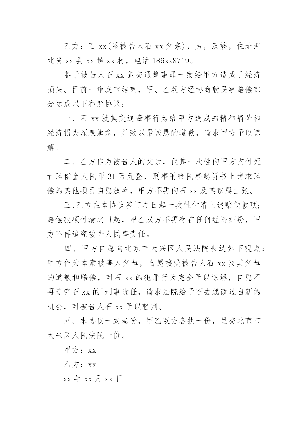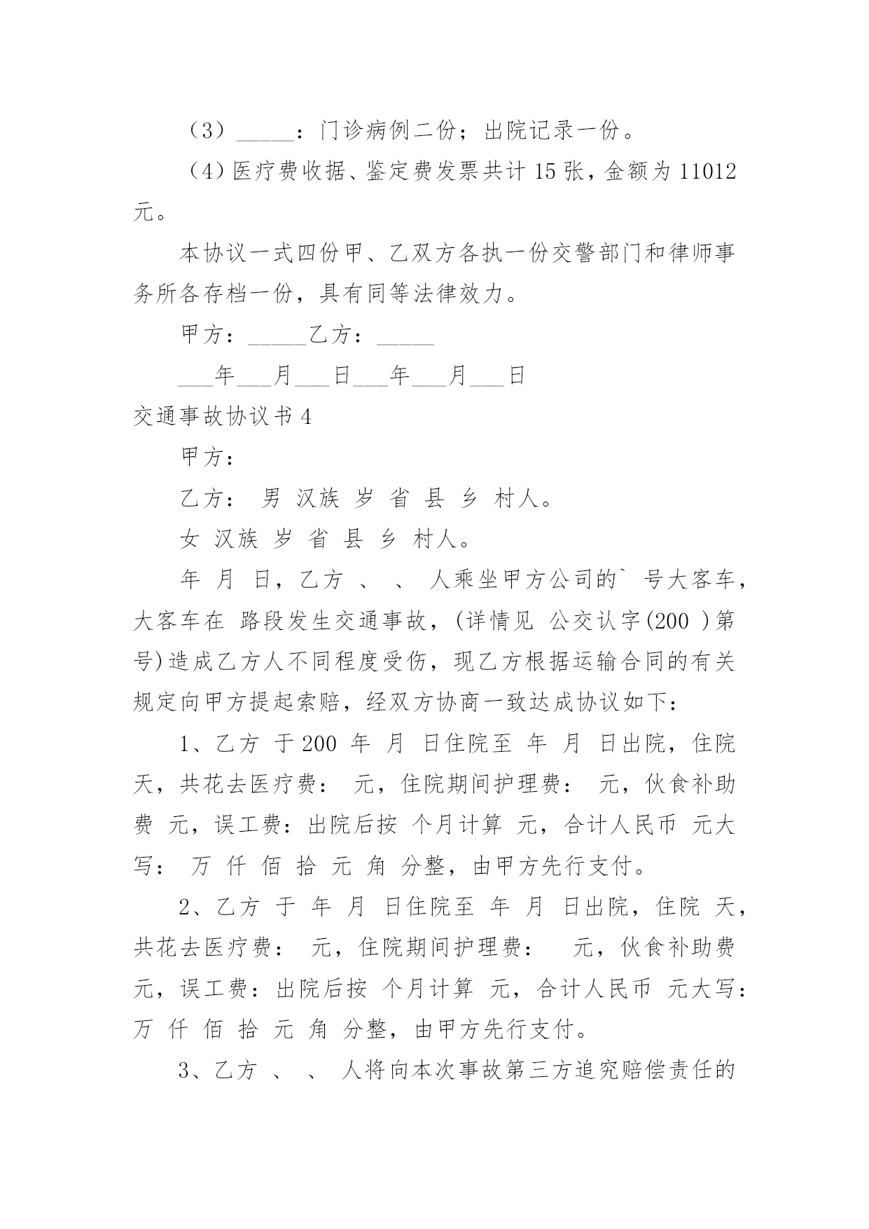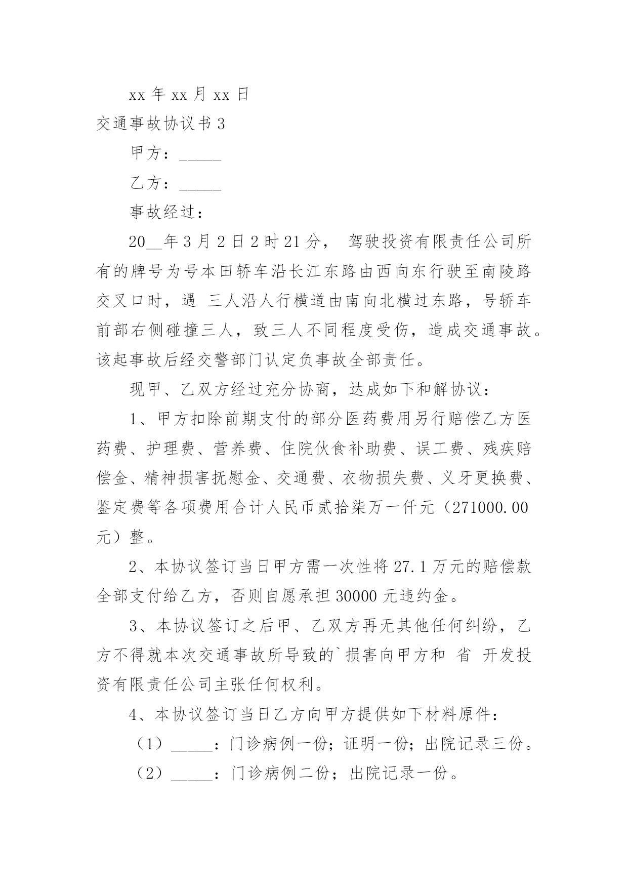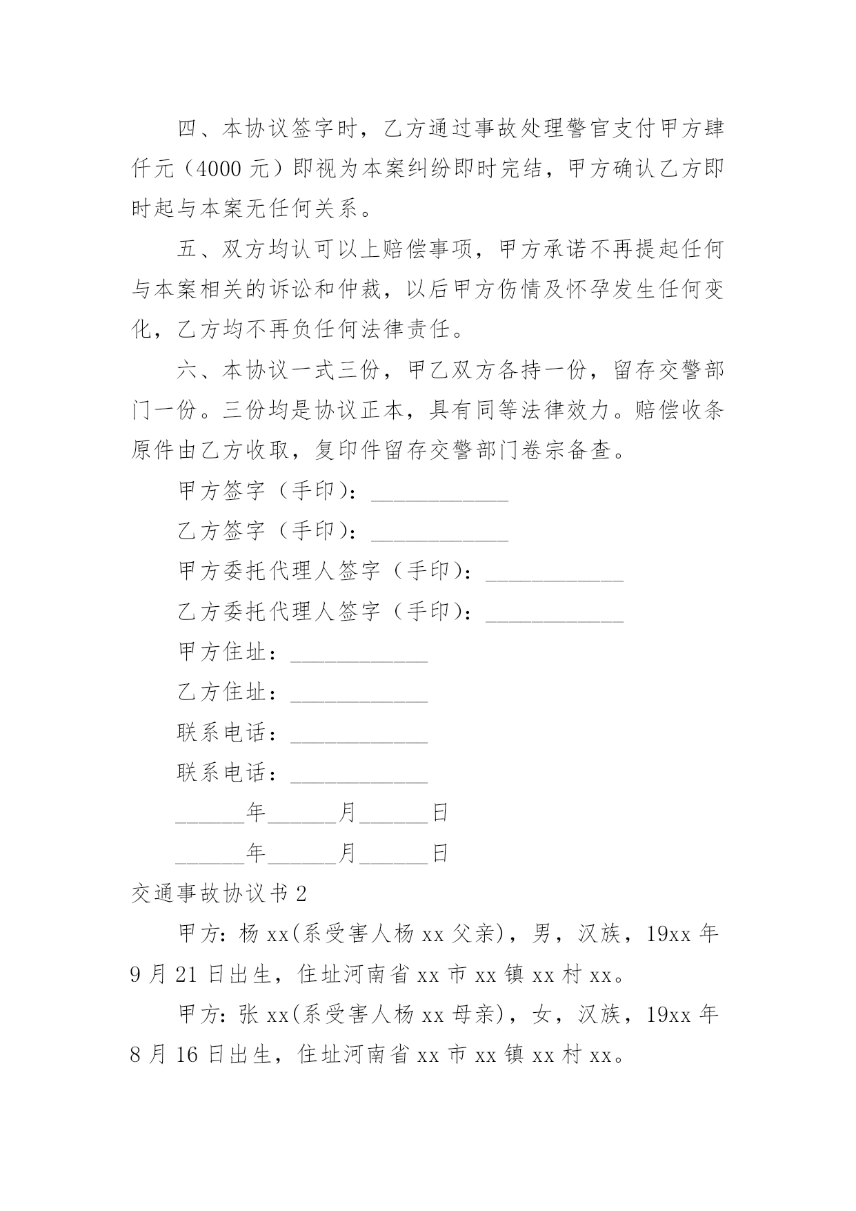 交通事故协议书交通事故协议书集合15篇在社会一步步向前发展的今天,很多地方都会使用到协议,签订协议可以保障自身的权益不被侵害。想写协议却不知道该请教谁?下面是小编为大家收集的交通事故协议书,欢迎阅读与收藏。交通事故协议书1甲方(受害人):____________身份证号:____________甲方委托代理人:____________身份证号:____________乙方(驾驶人):____________身份证号:____________乙方委托代理人:____________身份证号:___________________年_______月_______日时分,乙方驾驶号车在县街上倒车时,撞伤行人。事故发生后,乙方将甲方送往医院就诊治疗。根据国家民事赔偿有关法律规定,甲乙双方自愿达成以下赔偿协议:一、乙方承担甲方住院期间的全部就诊和治疗费用。二、乙方赔偿甲方后续治疗、劳务和精神损失费肆仟元(4000元)。三、甲方自行承担月日下午出院后身体及胎儿异常责任。四、本协议签字时,乙方通过事故处理警官支付甲方肆仟元(4000元)即视为本案纠纷即时完结,甲方确认乙方即时起与本案无任何关系。五、双方均认可以上赔偿事项,甲方承诺不再提起任何与本案相关的诉讼和仲裁,以后甲方伤情及怀孕发生任何变化,乙方均不再负任何法律责任。六、本协议一式三份,甲乙双方各持一份,留存交警部门一份。三份均是协议正本,具有同等法律效力。赔偿收条原件由乙方收取,复印件留存交警部门卷宗备查。甲方签字(手印):____________乙方签字(手印):____________甲方委托代理人签字(手印):____________乙方委托代理人签字(手印):____________甲方住址:____________乙方住址:____________联系电话:____________联系电话:__________________年______月______日______年______月______日交通事故协议书2甲方:杨xx(系受害人杨xx父亲),男,汉族,19xx年9月21日出生,住址河南省xx市xx镇xx村xx。甲方:张xx(系受害人杨xx母亲),女,汉族,19xx年8月16日出生,住址河南省xx市xx镇xx村xx。乙方:石xx(系被告人石xx父亲),男,汉族,住址河北省xx县xx镇xx村,电话186xx8719。鉴于被告人石xx犯交通肇事罪一案给甲方造成了经济损失。目前一审庭审结束,甲、乙双方经协商就民事赔偿部分达成以下和解协议:一、石xx就其交通肇事行为给甲方造成的精神痛苦和经济损失深表歉意,并致以最诚恳的道歉,请求甲方予以谅解。二、乙方作为被告人的父亲,代其一次性向甲方支付死亡赔偿金人民币31万元整,刑事附带民事起诉书上请求赔偿的其他项目自愿放弃,甲方不再向石xx及其家属主张。三、乙方在本协议签订之日起一次性付清上述赔偿款项;赔偿款项付清之日起,甲乙双方不再存在任何经济纠纷,甲方不再追究被告人民事责任。四、甲方自愿向北京市大兴区人民法院表达如下观点:甲方作为本案被害人父母,自愿接受被告人石xx及其父母的道歉和赔偿,对石xx的犯罪行为完全予以谅解,自愿不再追究石xx的`刑事责任,请求法院给予石去鹏改过自新的机会,对被告人石xx予以轻判。五、本协议一式叁份,甲乙双方各执一份,呈交北京市大兴区人民法院一份。甲方:xx乙方:xxxx年xx月xx日xx年xx月xx日交通事故协议书3甲方:_____乙方:_____事故经过:20__年3月2日2时21分,驾驶投资有限责任公司所有的牌号为号本田轿车沿长江东路由西向东行驶至南陵路交叉口时,遇三人沿人行横道由南向北横过东路,号轿车前部右侧碰撞三人,致三人不同程度受伤,造成交通事故。该起事故后经交警部门认定负事故全部责任。现甲、乙双方经过充分协商,达成如下和解协议:1、甲方扣除前期支付的部分医药费用另行赔偿乙方医药费、护理费、营养费、住院伙食补助费、误工费、残疾赔偿金、精神损害抚慰金、交通费、衣物损失费、义牙更换费、鉴定费等各项费用合计人民币贰拾柒万一仟元(271000.00元)整。2、本协议签订当日甲方需一次性将27.1万元的赔偿款全部支付给乙方,否则自愿承担30000元违约金。3、本协议签订之后甲、乙双方再无其他任何纠纷,乙方不得就本次交通事故所导致的`损害向甲方和省开发投资有限责任公司主张任何权利。4、本协议签订当日乙方向甲方提供如下材料原件:(1)_____:门诊病例一份;证明一份;出院记录三份。(2)_____:门诊病例二份;出院记录一份。(3)_____:门诊病例二份;出院记录一份。(4)医疗费收据、鉴定费发票共计15张,金额为11012元。本协议一式四份甲、乙双方各执一份交警部门和律师事务所各存档一份,具有同等法律效
