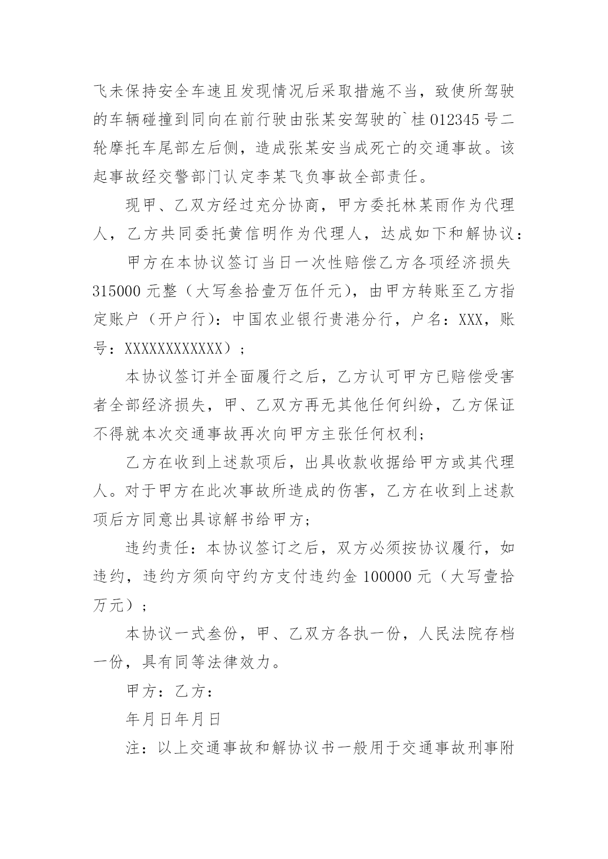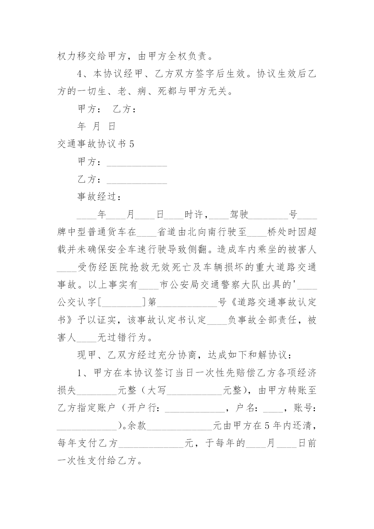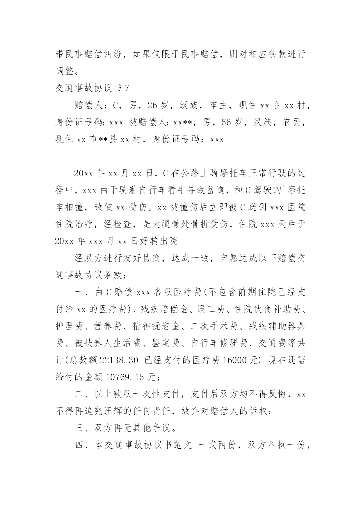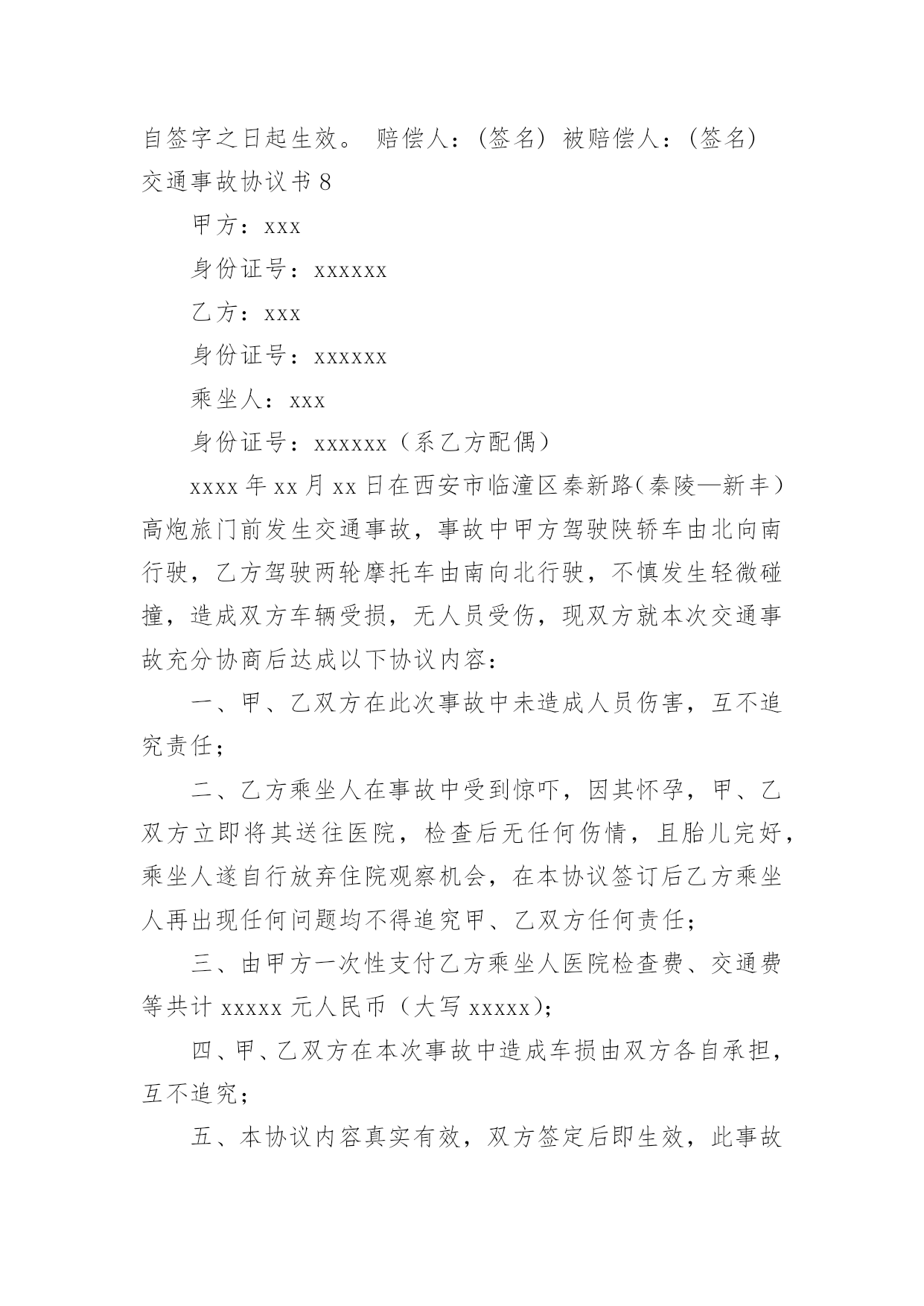 交通事故协议书交通事故协议书集合15篇在社会一步步向前发展的今天,很多地方都会使用到协议,签订协议可以保障自身的权益不被侵害。想写协议却不知道该请教谁?下面是小编为大家收集的交通事故协议书,欢迎阅读与收藏。交通事故协议书1甲方(受害人):____________身份证号:____________甲方委托代理人:____________身份证号:____________乙方(驾驶人):____________身份证号:____________乙方委托代理人:____________身份证号:___________________年_______月_______日时分,乙方驾驶号车在县街上倒车时,撞伤行人。事故发生后,乙方将甲方送往医院就诊治疗。根据国家民事赔偿有关法律规定,甲乙双方自愿达成以下赔偿协议:一、乙方承担甲方住院期间的全部就诊和治疗费用。二、乙方赔偿甲方后续治疗、劳务和精神损失费肆仟元(4000元)。三、甲方自行承担月日下午出院后身体及胎儿异常责任。四、本协议签字时,乙方通过事故处理警官支付甲方肆仟元(4000元)即视为本案纠纷即时完结,甲方确认乙方即时起与本案无任何关系。五、双方均认可以上赔偿事项,甲方承诺不再提起任何与本案相关的诉讼和仲裁,以后甲方伤情及怀孕发生任何变化,乙方均不再负任何法律责任。六、本协议一式三份,甲乙双方各持一份,留存交警部门一份。三份均是协议正本,具有同等法律效力。赔偿收条原件由乙方收取,复印件留存交警部门卷宗备查。甲方签字(手印):____________乙方签字(手印):____________甲方委托代理人签字(手印):____________乙方委托代理人签字(手印):____________甲方住址:____________乙方住址:____________联系电话:____________联系电话:__________________年______月______日______年______月______日交通事故协议书2甲方:杨xx(系受害人杨xx父亲),男,汉族,19xx年9月21日出生,住址河南省xx市xx镇xx村xx。甲方:张xx(系受害人杨xx母亲),女,汉族,19xx年8月16日出生,住址河南省xx市xx镇xx村xx。乙方:石xx(系被告人石xx父亲),男,汉族,住址河北省xx县xx镇xx村,电话186xx8719。鉴于被告人石xx犯交通肇事罪一案给甲方造成了经济损失。目前一审庭审结束,甲、乙双方经协商就民事赔偿部分达成以下和解协议:一、石xx就其交通肇事行为给甲方造成的精神痛苦和经济损失深表歉意,并致以最诚恳的道歉,请求甲方予以谅解。二、乙方作为被告人的父亲,代其一次性向甲方支付死亡赔偿金人民币31万元整,刑事附带民事起诉书上请求赔偿的其他项目自愿放弃,甲方不再向石xx及其家属主张。三、乙方在本协议签订之日起一次性付清上述赔偿款项;赔偿款项付清之日起,甲乙双方不再存在任何经济纠纷,甲方不再追究被告人民事责任。四、甲方自愿向北京市大兴区人民法院表达如下观点:甲方作为本案被害人父母,自愿接受被告人石xx及其父母的道歉和赔偿,对石xx的犯罪行为完全予以谅解,自愿不再追究石xx的`刑事责任,请求法院给予石去鹏改过自新的机会,对被告人石xx予以轻判。五、本协议一式叁份,甲乙双方各执一份,呈交北京市大兴区人民法院一份。甲方:xx乙方:xxxx年xx月xx日xx年xx月xx日交通事故协议书3甲方:_____乙方:_____事故经过:20__年3月2日2时21分,驾驶投资有限责任公司所有的牌号为号本田轿车沿长江东路由西向东行驶至南陵路交叉口时,遇三人沿人行横道由南向北横过东路,号轿车前部右侧碰撞三人,致三人不同程度受伤,造成交通事故。该起事故后经交警部门认定负事故全部责任。现甲、乙双方经过充分协商,达成如下和解协议:1、甲方扣除前期支付的部分医药费用另行赔偿乙方医药费、护理费、营养费、住院伙食补助费、误工费、残疾赔偿金、精神损害抚慰金、交通费、衣物损失费、义牙更换费、鉴定费等各项费用合计人民币贰拾柒万一仟元(271000.00元)整。2、本协议签订当日甲方需一次性将27.1万元的赔偿款全部支付给乙方,否则自愿承担30000元违约金。3、本协议签订之后甲、乙双方再无其他任何纠纷,乙方不得就本次交通事故所导致的`损害向甲方和省开发投资有限责任公司主张任何权利。4、本协议签订当日乙方向甲方提供如下材料原件:(1)_____:门诊病例一份;证明一份;出院记录三份。(2)_____:门诊病例二份;出院记录一份。(3)_____:门诊病例二份;出院记录一份。(4)医疗费收据、鉴定费发票共计15张,金额为11012元。本协议一式四份甲、乙双方各执一份交警部门和律师事务所各存档一份,具有同等法律效