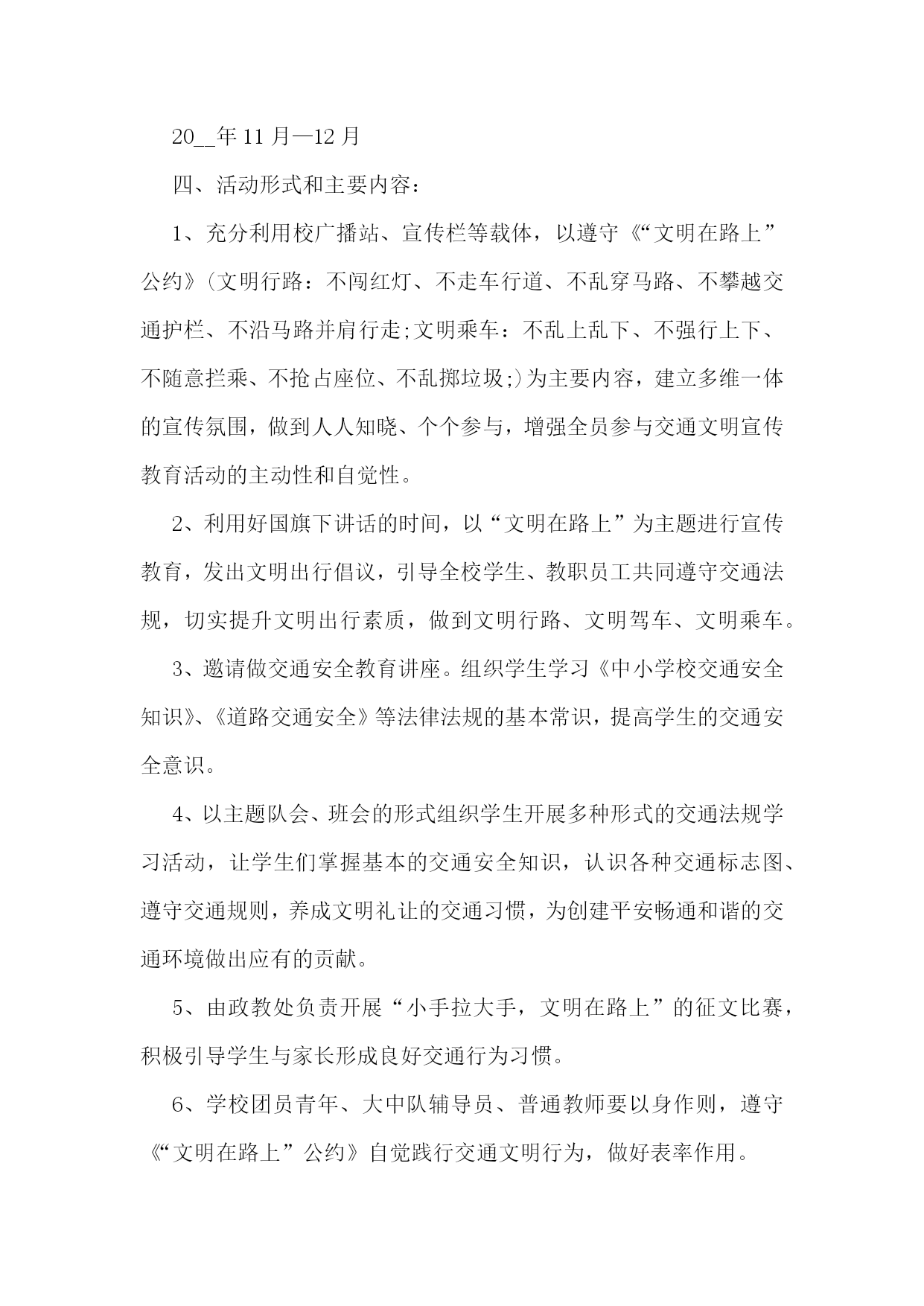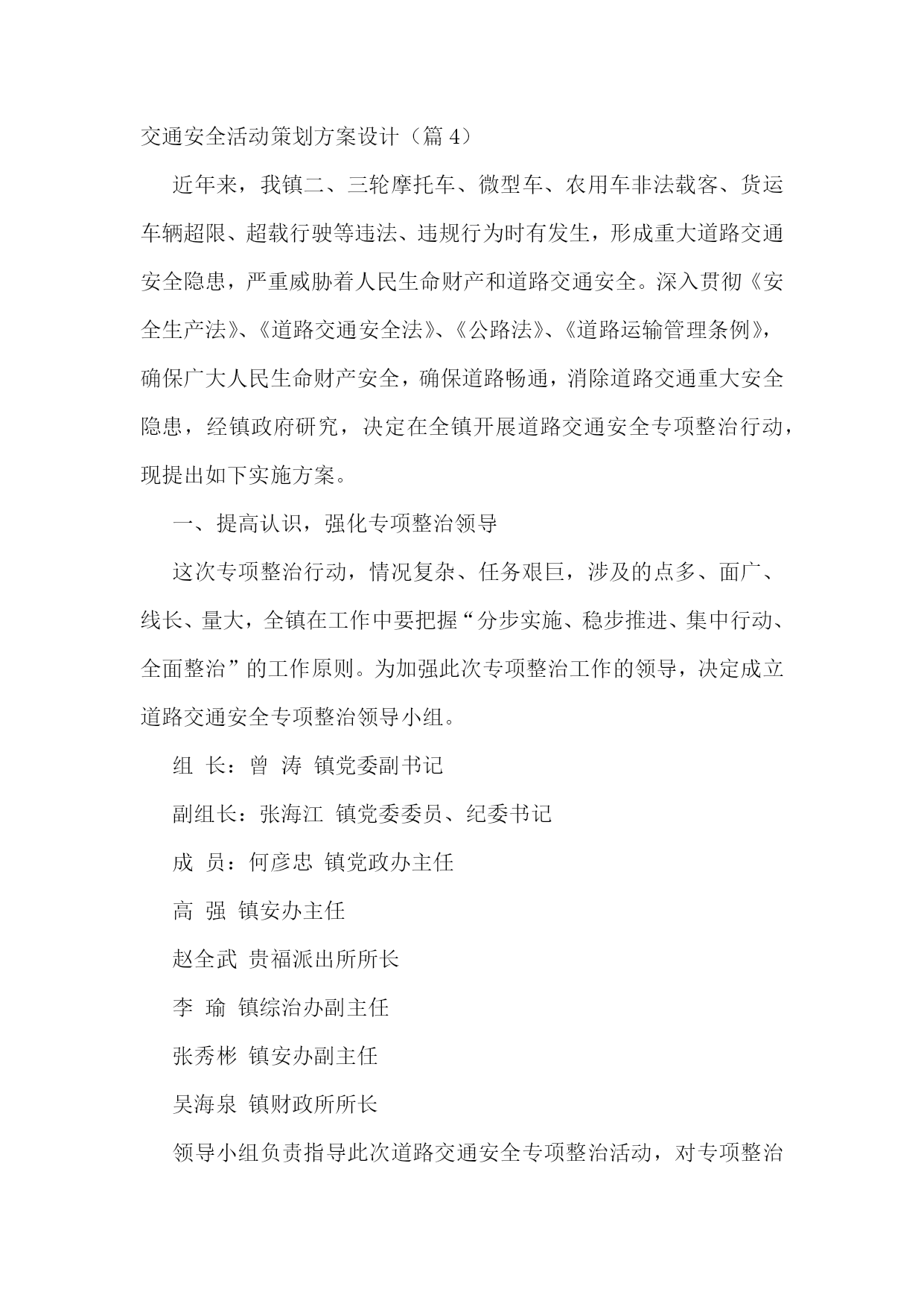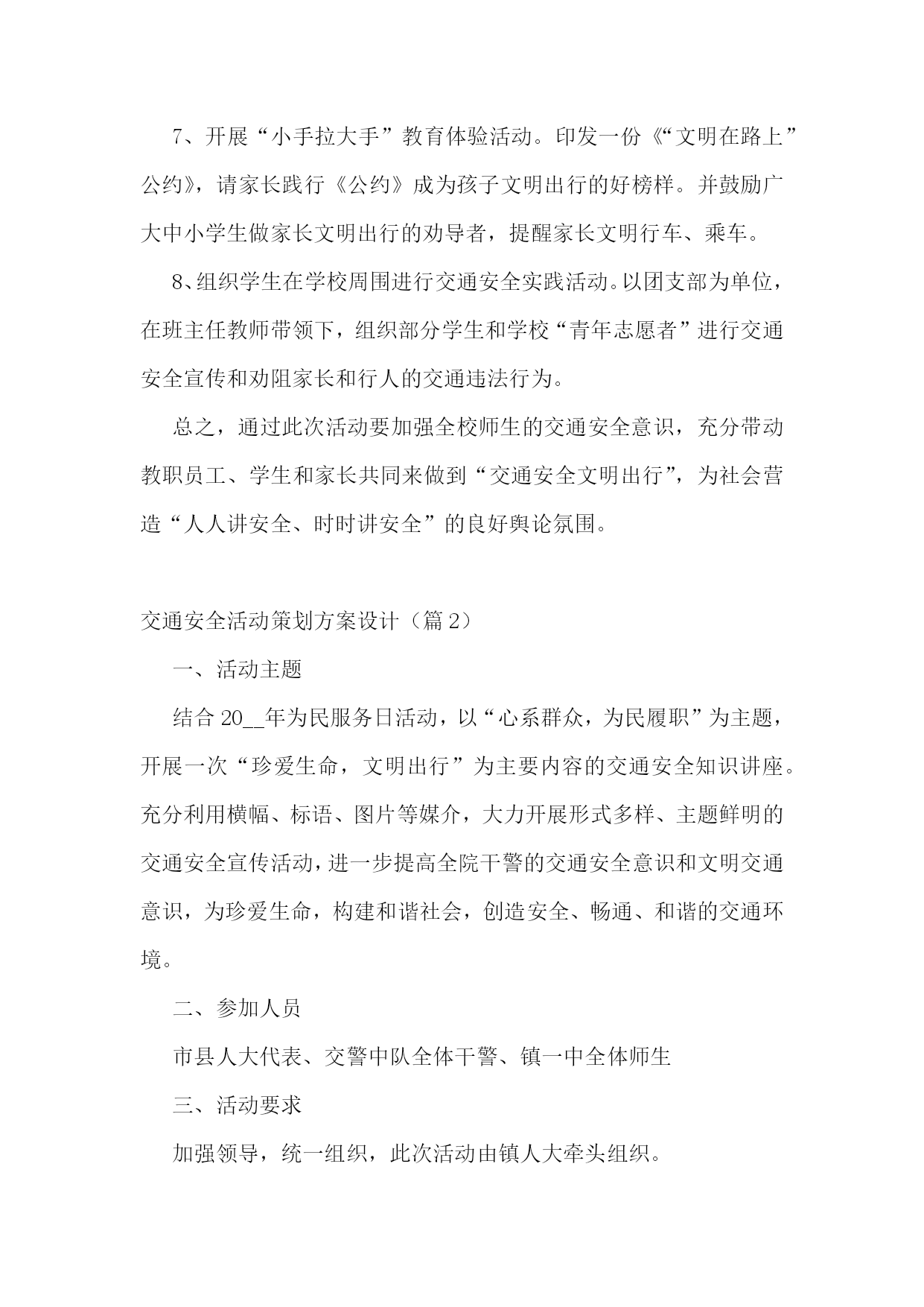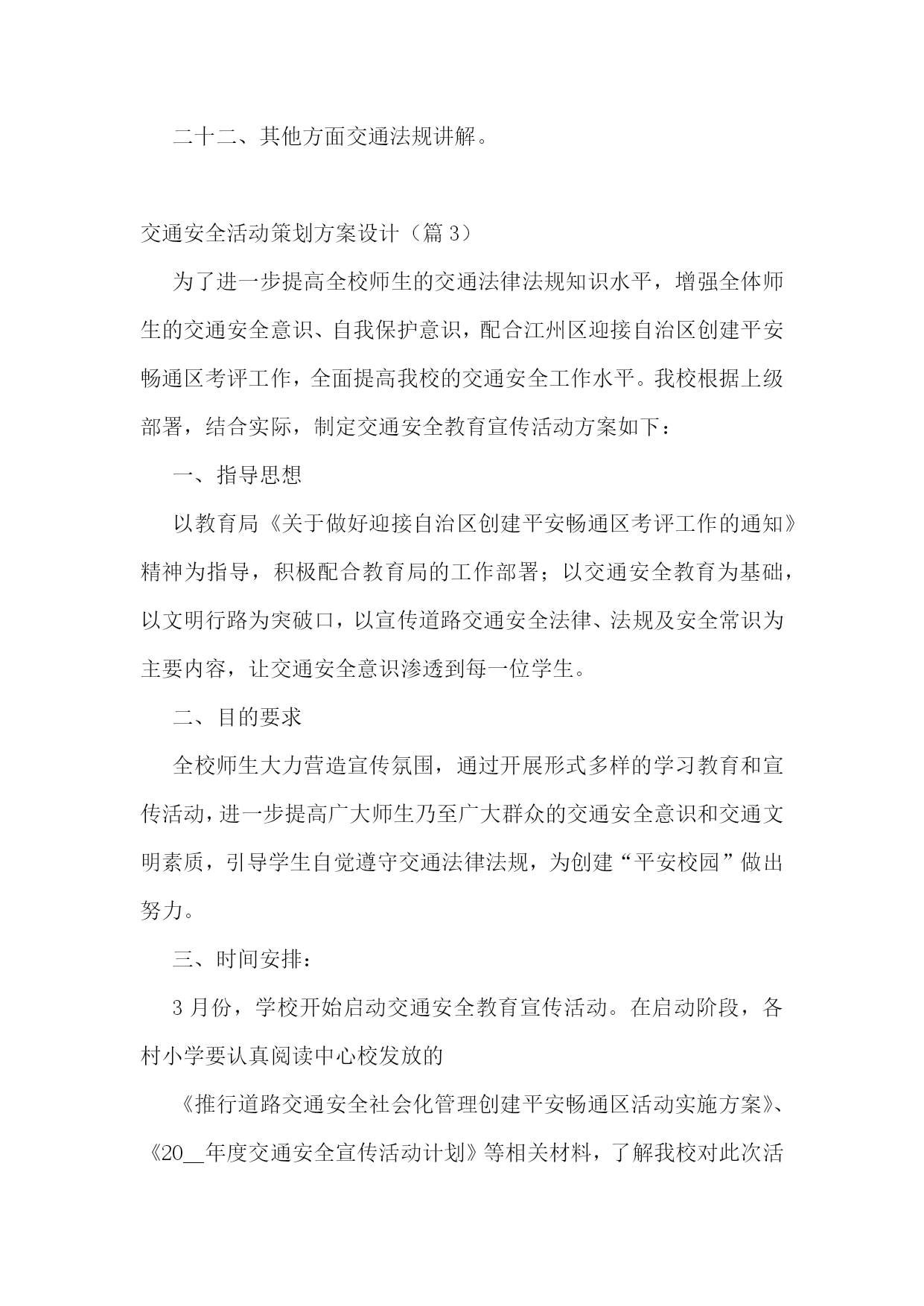 交通安全活动策划方案设计交通安全活动策划方案设计(篇1)为进一步增强全校师生和家长的交通安全法治意识和文明交通意识,规范交通安全行为,提高交通安全自我防护能力,预防和减少交通事故。根据市教育局宁教基[20__]119号文件精神的安排,根据我校实际情况,制定科学合理的实施计划,积极采取有效措施,开展“小手拉大手,文明在路上”交通安全主题宣传教育活动,确保学生交通安全宣传教育工作取得实效。一、成立活动领导小组:组长:__主任:__组员:__二、指导思想:倡导文明交通行为,是改善城市交通秩序,缓解交通拥堵、预防和减少道路交通事故、形成良好文明交通风尚的重要举措,是弘扬社会主义荣辱观、构建社会主义和谐社会的实际行动,也是推进社会主义精神文明建设、提升市民文明交通素质和城市文明形象的有效载体。通过组织开展交通文明宣传实践活动,提升全校师生的交通文明意识,引导全校师生积极倡导和自觉践行文明行路、文明驾车、文明乘车行为;并通过“小手拉大手”等形式,影响家长乃至全社会进一步强化交通文明意识,共同营造文明礼让、和谐顺畅的交通环境。三、活动时间:20__年11月—12月四、活动形式和主要内容:1、充分利用校广播站、宣传栏等载体,以遵守《“文明在路上”公约》(文明行路:不闯红灯、不走车行道、不乱穿马路、不攀越交通护栏、不沿马路并肩行走;文明乘车:不乱上乱下、不强行上下、不随意拦乘、不抢占座位、不乱掷垃圾;)为主要内容,建立多维一体的宣传氛围,做到人人知晓、个个参与,增强全员参与交通文明宣传教育活动的主动性和自觉性。2、利用好国旗下讲话的时间,以“文明在路上”为主题进行宣传教育,发出文明出行倡议,引导全校学生、教职员工共同遵守交通法规,切实提升文明出行素质,做到文明行路、文明驾车、文明乘车。3、邀请做交通安全教育讲座。组织学生学习《中小学校交通安全知识》、《道路交通安全》等法律法规的基本常识,提高学生的交通安全意识。4、以主题队会、班会的形式组织学生开展多种形式的交通法规学习活动,让学生们掌握基本的交通安全知识,认识各种交通标志图、遵守交通规则,养成文明礼让的交通习惯,为创建平安畅通和谐的交通环境做出应有的贡献。5、由政教处负责开展“小手拉大手,文明在路上”的征文比赛,积极引导学生与家长形成良好交通行为习惯。6、学校团员青年、大中队辅导员、普通教师要以身作则,遵守《“文明在路上”公约》自觉践行交通文明行为,做好表率作用。7、开展“小手拉大手”教育体验活动。印发一份《“文明在路上”公约》,请家长践行《公约》成为孩子文明出行的好榜样。并鼓励广大中小学生做家长文明出行的劝导者,提醒家长文明行车、乘车。8、组织学生在学校周围进行交通安全实践活动。以团支部为单位,在班主任教师带领下,组织部分学生和学校“青年志愿者”进行交通安全宣传和劝阻家长和行人的交通违法行为。总之,通过此次活动要加强全校师生的交通安全意识,充分带动教职员工、学生和家长共同来做到“交通安全文明出行”,为社会营造“人人讲安全、时时讲安全”的良好舆论氛围。交通安全活动策划方案设计(篇2)一、活动主题结合20__年为民服务日活动,以“心系群众,为民履职”为主题,开展一次“珍爱生命,文明出行”为主要内容的交通安全知识讲座。充分利用横幅、标语、图片等媒介,大力开展形式多样、主题鲜明的交通安全宣传活动,进一步提高全院干警的交通安全意识和文明交通意识,为珍爱生命,构建和谐社会,创造安全、畅通、和谐的交通环境。二、参加人员市县人大代表、交警中队全体干警、镇一中全体师生三、活动要求加强领导,统一组织,此次活动由镇人大牵头组织。四、活动形式采取大会形式,集中讲解交通安全法律法规,特别是与中小学生有切身联系的交通法规五、活动内容一、自觉遵守交通法律法规,主动维护交通秩序,服从公安机关的管理。二、不驾乘无牌、无证摩托车,驾驶摩托车不超员、超载。三、骑电瓶车、自行车、三轮车等非机动车应靠边行驶,不得突然猛拐、相互追逐。自行车、三轮车不得加装动力装置四、不在道路上强行拦车、扒车、追车和抛物击车,不携带易燃、易爆等危险物品乘坐公共汽车、出租车和长途客车。五、不驾驶报废车、拼装车上路行驶。不无证驾驶机动车,不使用拖拉机、农用三轮车、老年车载人营运。六、行人通过路口或者横过道路,应当走人横道或者过街设施。不翻越公路护栏、交通隔离墩、隔离栏,七、行人通过有交通信号灯的人行横道,应当按照交通信号灯指示通行。八、行人通过没有交通信号灯、人行横道的路口,或者在没有过街设施的路段横过道路,确认安全后直行通过,不得在车辆临近时突然加速横穿或者中途倒退、折返。九、在机动车道上不得从机动车左侧上下车,开关车门不得妨碍其他车辆和行人十、学前班儿童在道路上行走须有家长或教师带领,未满12岁的学生不得在道路骑自行车、三轮车和推、拉人力车。不得在公