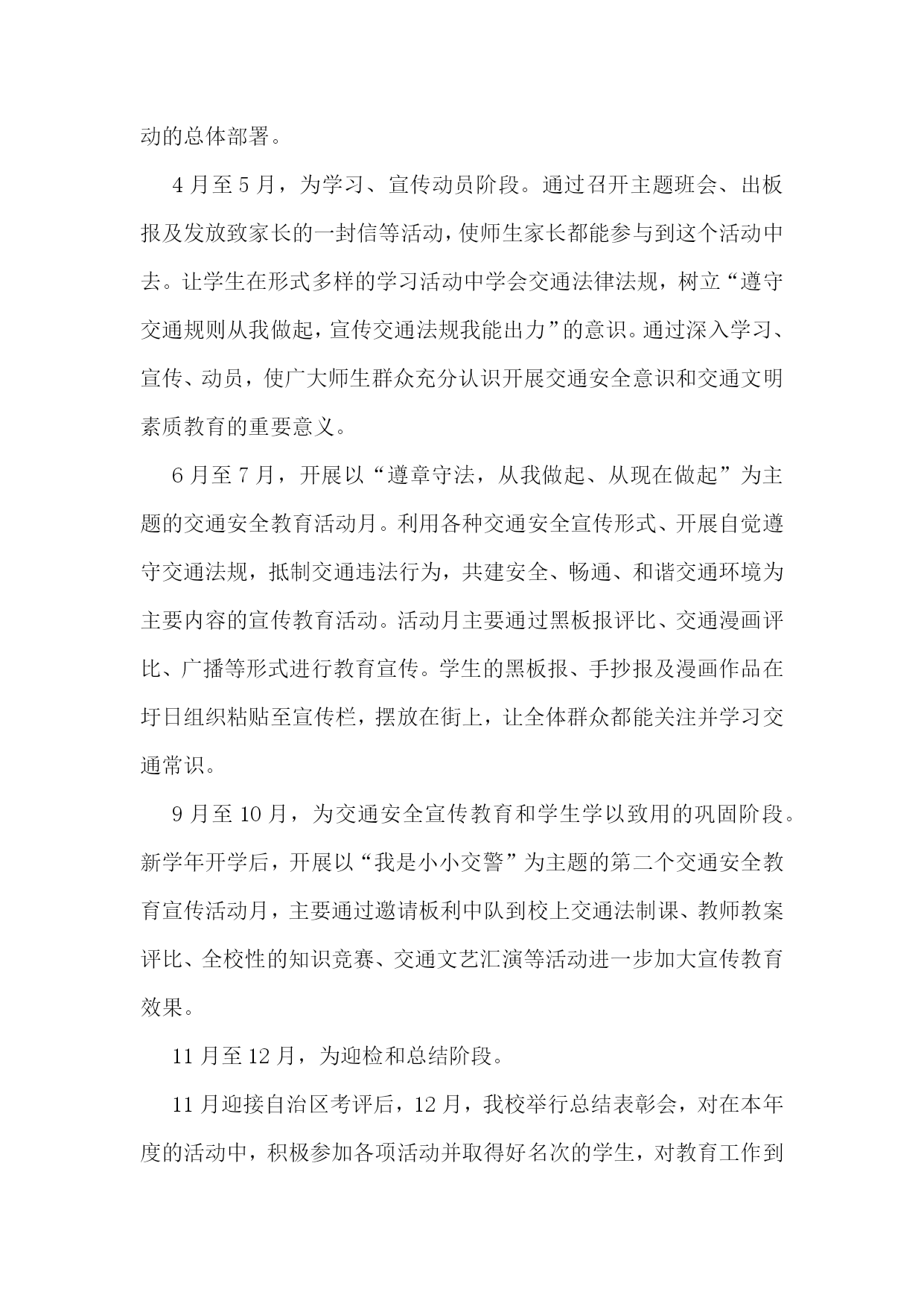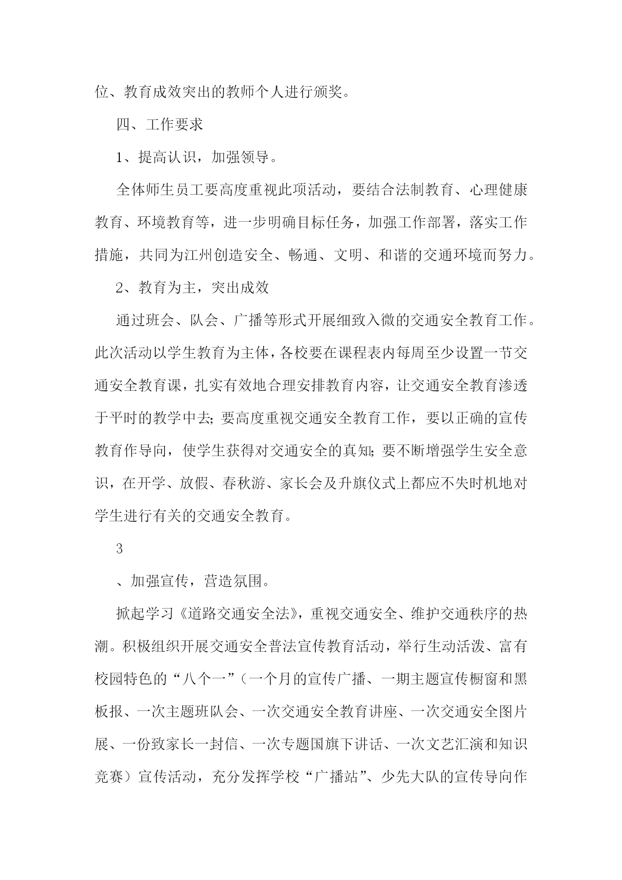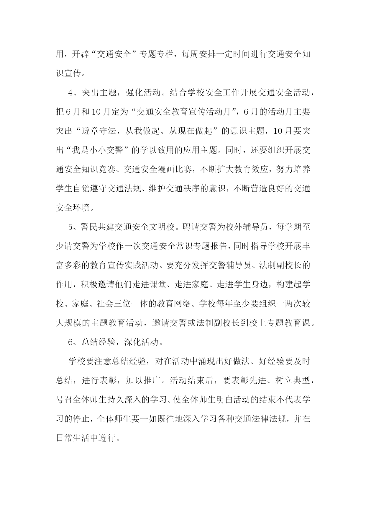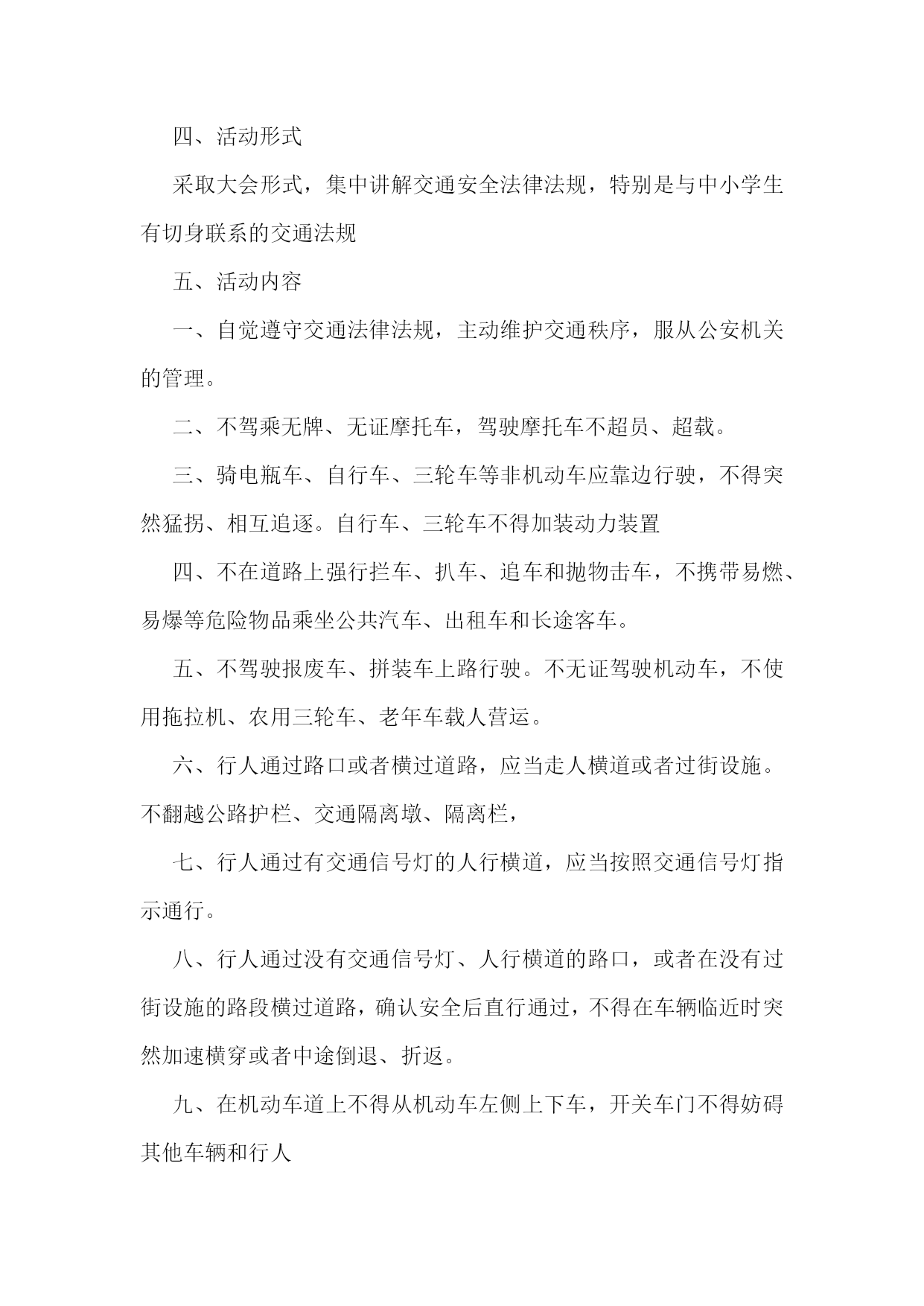 交通安全活动策划方案设计交通安全活动策划方案设计(篇1)为进一步增强全校师生和家长的交通安全法治意识和文明交通意识,规范交通安全行为,提高交通安全自我防护能力,预防和减少交通事故。根据市教育局宁教基[20__]119号文件精神的安排,根据我校实际情况,制定科学合理的实施计划,积极采取有效措施,开展“小手拉大手,文明在路上”交通安全主题宣传教育活动,确保学生交通安全宣传教育工作取得实效。一、成立活动领导小组:组长:__主任:__组员:__二、指导思想:倡导文明交通行为,是改善城市交通秩序,缓解交通拥堵、预防和减少道路交通事故、形成良好文明交通风尚的重要举措,是弘扬社会主义荣辱观、构建社会主义和谐社会的实际行动,也是推进社会主义精神文明建设、提升市民文明交通素质和城市文明形象的有效载体。通过组织开展交通文明宣传实践活动,提升全校师生的交通文明意识,引导全校师生积极倡导和自觉践行文明行路、文明驾车、文明乘车行为;并通过“小手拉大手”等形式,影响家长乃至全社会进一步强化交通文明意识,共同营造文明礼让、和谐顺畅的交通环境。三、活动时间:20__年11月—12月四、活动形式和主要内容:1、充分利用校广播站、宣传栏等载体,以遵守《“文明在路上”公约》(文明行路:不闯红灯、不走车行道、不乱穿马路、不攀越交通护栏、不沿马路并肩行走;文明乘车:不乱上乱下、不强行上下、不随意拦乘、不抢占座位、不乱掷垃圾;)为主要内容,建立多维一体的宣传氛围,做到人人知晓、个个参与,增强全员参与交通文明宣传教育活动的主动性和自觉性。2、利用好国旗下讲话的时间,以“文明在路上”为主题进行宣传教育,发出文明出行倡议,引导全校学生、教职员工共同遵守交通法规,切实提升文明出行素质,做到文明行路、文明驾车、文明乘车。3、邀请做交通安全教育讲座。组织学生学习《中小学校交通安全知识》、《道路交通安全》等法律法规的基本常识,提高学生的交通安全意识。4、以主题队会、班会的形式组织学生开展多种形式的交通法规学习活动,让学生们掌握基本的交通安全知识,认识各种交通标志图、遵守交通规则,养成文明礼让的交通习惯,为创建平安畅通和谐的交通环境做出应有的贡献。5、由政教处负责开展“小手拉大手,文明在路上”的征文比赛,积极引导学生与家长形成良好交通行为习惯。6、学校团员青年、大中队辅导员、普通教师要以身作则,遵守《“文明在路上”公约》自觉践行交通文明行为,做好表率作用。7、开展“小手拉大手”教育体验活动。印发一份《“文明在路上”公约》,请家长践行《公约》成为孩子文明出行的好榜样。并鼓励广大中小学生做家长文明出行的劝导者,提醒家长文明行车、乘车。8、组织学生在学校周围进行交通安全实践活动。以团支部为单位,在班主任教师带领下,组织部分学生和学校“青年志愿者”进行交通安全宣传和劝阻家长和行人的交通违法行为。总之,通过此次活动要加强全校师生的交通安全意识,充分带动教职员工、学生和家长共同来做到“交通安全文明出行”,为社会营造“人人讲安全、时时讲安全”的良好舆论氛围。交通安全活动策划方案设计(篇2)一、活动主题结合20__年为民服务日活动,以“心系群众,为民履职”为主题,开展一次“珍爱生命,文明出行”为主要内容的交通安全知识讲座。充分利用横幅、标语、图片等媒介,大力开展形式多样、主题鲜明的交通安全宣传活动,进一步提高全院干警的交通安全意识和文明交通意识,为珍爱生命,构建和谐社会,创造安全、畅通、和谐的交通环境。二、参加人员市县人大代表、交警中队全体干警、镇一中全体师生三、活动要求加强领导,统一组织,此次活动由镇人大牵头组织。四、活动形式采取大会形式,集中讲解交通安全法律法规,特别是与中小学生有切身联系的交通法规五、活动内容一、自觉遵守交通法律法规,主动维护交通秩序,服从公安机关的管理。二、不驾乘无牌、无证摩托车,驾驶摩托车不超员、超载。三、骑电瓶车、自行车、三轮车等非机动车应靠边行驶,不得突然猛拐、相互追逐。自行车、三轮车不得加装动力装置四、不在道路上强行拦车、扒车、追车和抛物击车,不携带易燃、易爆等危险物品乘坐公共汽车、出租车和长途客车。五、不驾驶报废车、拼装车上路行驶。不无证驾驶机动车,不使用拖拉机、农用三轮车、老年车载人营运。六、行人通过路口或者横过道路,应当走人横道或者过街设施。不翻越公路护栏、交通隔离墩、隔离栏,七、行人通过有交通信号灯的人行横道,应当按照交通信号灯指示通行。八、行人通过没有交通信号灯、人行横道的路口,或者在没有过街设施的路段横过道路,确认安全后直行通过,不得在车辆临近时突然加速横穿或者中途倒退、折返。九、在机动车道上不得从机动车左侧上下车,开关车门不得妨碍其他车辆和行人十、学前班儿童在道路上行走须有家长或教师带领,未满12岁的学生不得在道路骑自行车、三轮车和推、拉人力车。不得在公