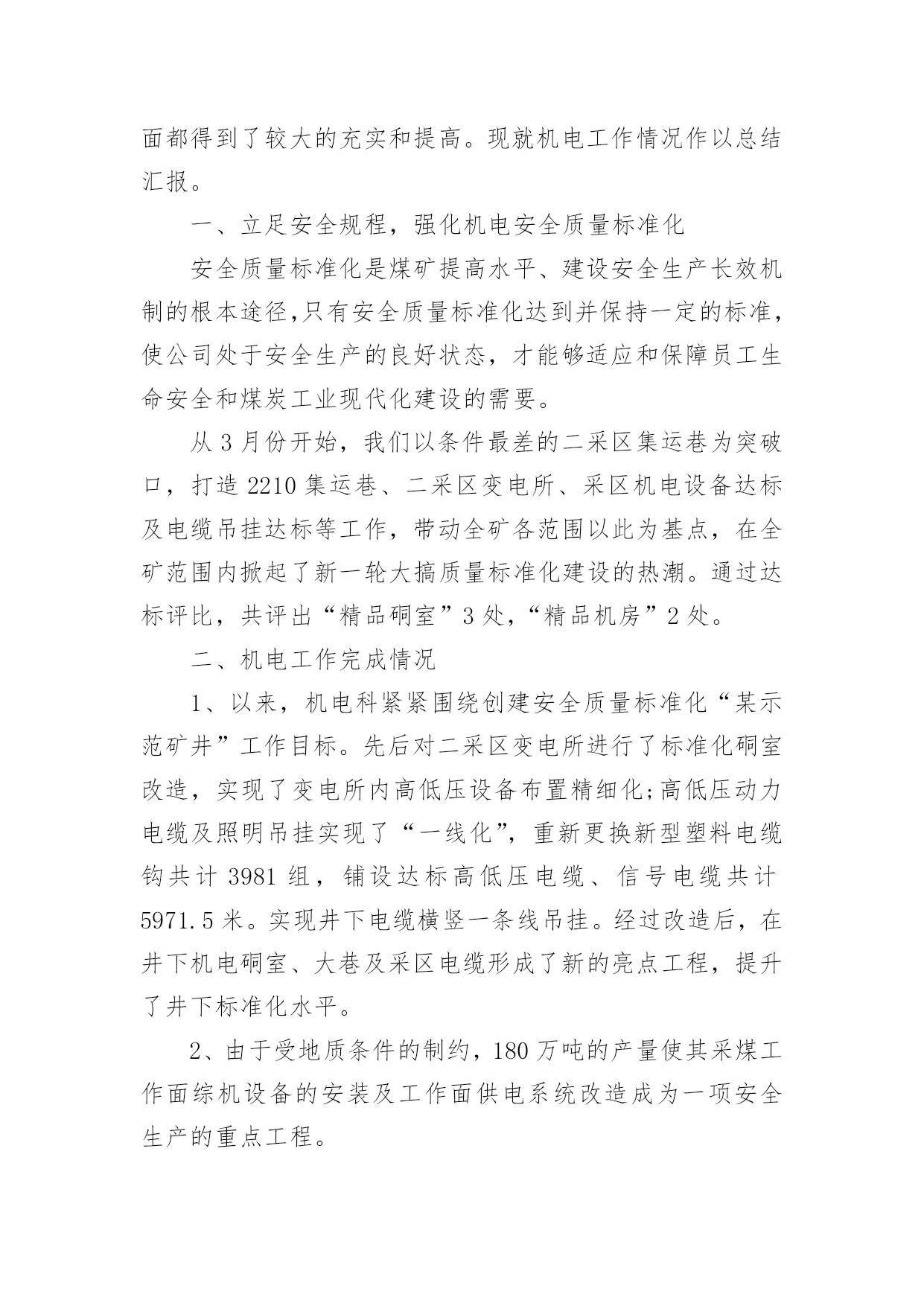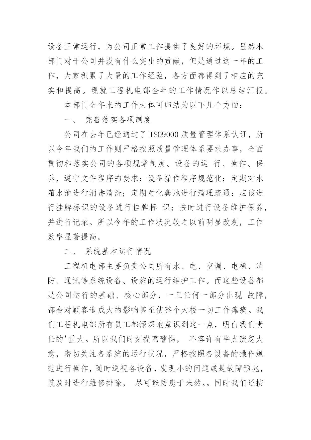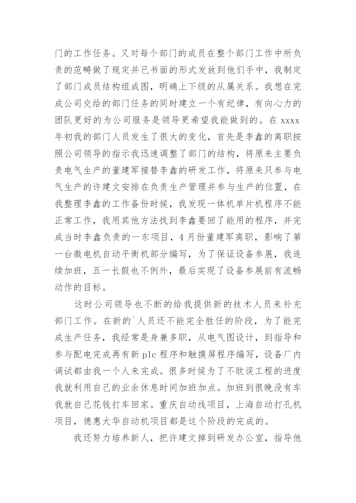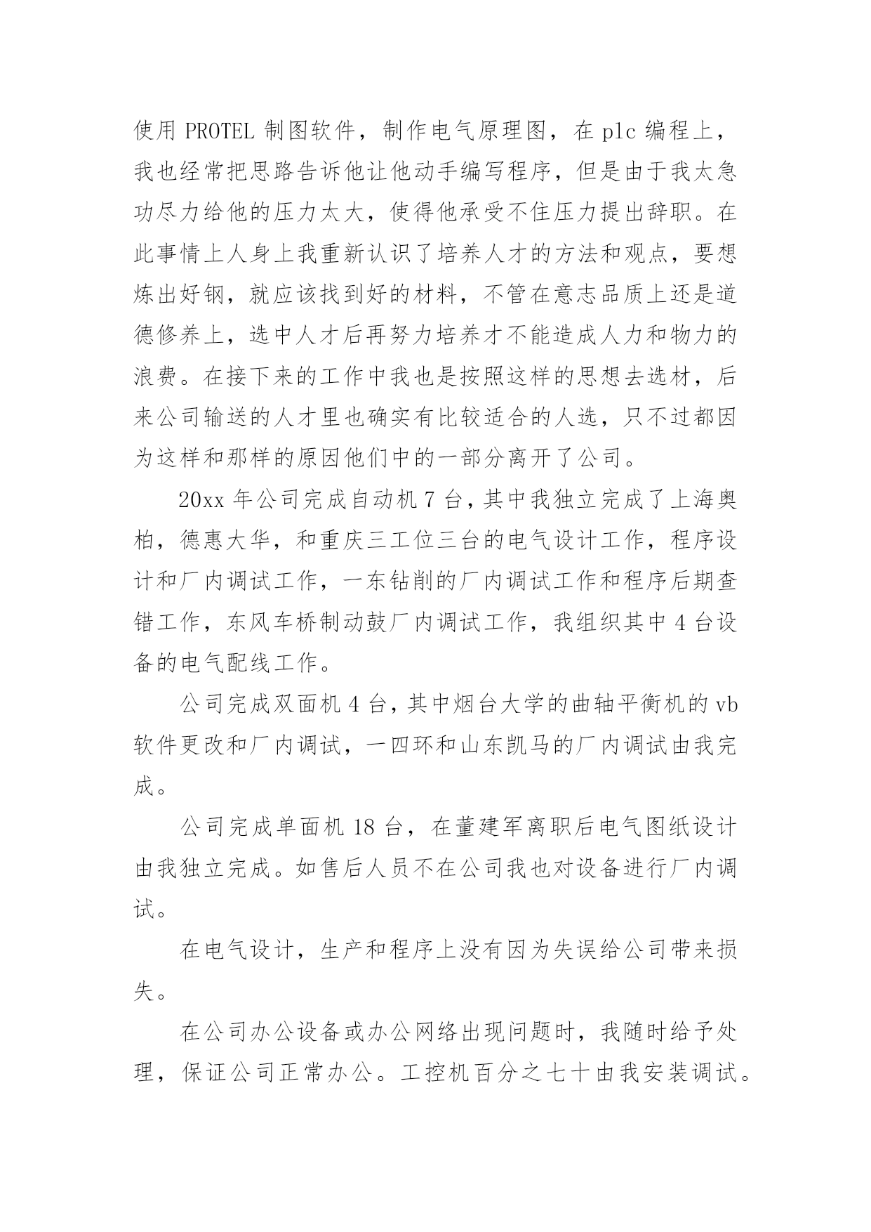 机电工程年终工作总结总结是把一定阶段内的有关情况分析研究,做出有指导性结论的书面材料,它能够使头脑更加清醒,目标更加明确,因此我们需要回头归纳,写一份总结了。总结你想好怎么写了吗?以下是小编收集整理的机电工程年终工作总结,仅供参考,希望能够帮助到大家。机电工程年终工作总结1xxxx年是我在公司工作的第一年,在这一年里随着公司在不断的发展和壮大我个人也从一个不知所谓的棱头青逐渐的变的成熟,从一个对平衡机毫无了解的门外汉变成一个熟悉平衡机原理熟悉公司各种产品的专业技术人员,而且在对部门的管理和与人沟通方面我也有了更深层次的认识,我深知我取得的这些进步和公司领导的培养是分不开的。没有他们不厌其烦的教导和一次次的给予机会我不会取得今天的进步,20xx年,将会是机遇和挑战并存的一年,我将团结在公司领导核心周围,努力工作,艰苦奋斗,为公司向更高层次发展做出自己的贡献。回首15年初,虽然在15年公司取得了可喜的成果,但是公司领导并没有沾沾自喜,反而为xxxx年制定了更高的目标。我也在经过短暂的调整之后马上进入自己的角色,当时按照领导的指示,我负责研发部管理和电气车间生产管理的工作。、我首先指定的部门工作范畴细则,明确了整个部门的工作任务。又对每个部门的成员在整个部门工作中所负责的范畴做了规定并已书面的形式发放到他们手中,我制定了部门成员结构组成图,明确上下级的从属关系。我想在完成公司交给的部门任务的同时建立一个有纪律,有向心力的团队更好的为公司服务是领导更希望我能做到的。在xxxx年初我的部门人员发生了很大的变化,首先是李鑫的离职按照公司领导的指示我迅速调整了部门的结构,将原来主要负责电气生产的董建军接替李鑫的研发工作,将原来只参与电气生产的许建文安排在负责生产管理并参与生产的位置,在我整理李鑫的工作备份时候,我发现一体机单片机程序不能正常工作,我用其他方法找到李鑫要回了能用的程序,并完成当时李鑫负责的一东项目,4月份董建军离职,影响了第一台微电机自动平衡机部分编写,为了保证设备参展,我连续加班,五一长假也不例外,最后实现了设备参展前有流畅动作的目标。这时公司领导也不断的给我提供新的技术人员来补充部门工作。在新的`人员还不能完全胜任的阶段,为了能完成生产任务,我经常是身兼多职,从电气图设计,到指导和参与配电完成再有新plc程序和触摸屏程序编写,设备厂内调试都由我一个人来完成。很多时候为了不耽误工程的进度我就利用自己的业余休息时间加班加点。加班到很晚没有车我就自己花钱打车回家。重庆自动线项目,上海自动打孔机项目,德惠大华自动机项目都是这个阶段的完成的。我还努力培养新人,把许建文掉到研发办公室,指导他使用PROTEL制图软件,制作电气原理图,在plc编程上,我也经常把思路告诉他让他动手编写程序,但是由于我太急功尽力给他的压力太大,使得他承受不住压力提出辞职。在此事情上人身上我重新认识了培养人才的方法和观点,要想炼出好钢,就应该找到好的材料,不管在意志品质上还是道德修养上,选中人才后再努力培养才不能造成人力和物力的浪费。在接下来的工作中我也是按照这样的思想去选材,后来公司输送的人才里也确实有比较适合的人选,只不过都因为这样和那样的原因他们中的一部分离开了公司。20xx年公司完成自动机7台,其中我独立完成了上海奥柏,德惠大华,和重庆三工位三台的电气设计工作,程序设计和厂内调试工作,一东钻削的厂内调试工作和程序后期查错工作,东风车桥制动鼓厂内调试工作,我组织其中4台设备的电气配线工作。公司完成双面机4台,其中烟台大学的曲轴平衡机的vb软件更改和厂内调试,一四环和山东凯马的厂内调试由我完成。公司完成单面机18台,在董建军离职后电气图纸设计由我独立完成。如售后人员不在公司我也对设备进行厂内调试。在电气设计,生产和程序上没有因为失误给公司带来损失。在公司办公设备或办公网络出现问题时,我随时给予处理,保证公司正常办公。工控机百分之七十由我安装调试。在客服人员不在的时候,我能够协助客服部解答客户疑问和市内客户的维修。其中天合富奥维修维护数十次。20xx年是艰苦的一年,因世界经济大环境的影响,公司的业绩没有达到理想状态,但是我不会被这些客观条件吓倒,我坚信在公司领导的带领下,我们一定能顺利度过难关,20xx年我的工作主要安排在电气生产这方面,我准备制定更多的电气生产流程,让每一项工作都有统一的标准。目标实现每台设备厂内电气配线失误率为少于一次。建立一套合理的电气生产人员奖惩制度和记效考核制度,让工作人员都能有更好的积极性。每周组织电气生产车间业务能力培训,实现每个人员都能独立调试单面和双面设备,都能独立查线。在人才培养方面我会尽最大努力帮助新人,为公司输送电气方面的人才。我对于自己的要求是更严格遵守公司规章制度。努力提高自己的管理才能,我为自己立下目标,20