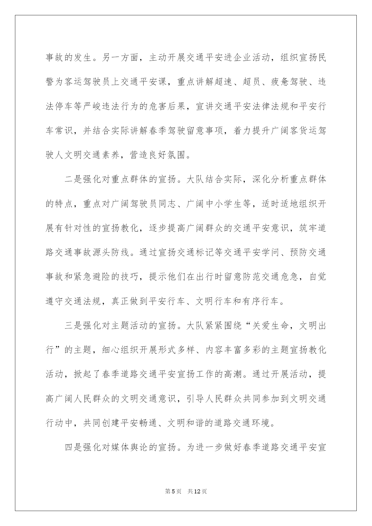 第PAGE\*Arabic\*MERGEFORMAT12页共NUMPAGES\*Arabic\*MERGEFORMAT12页第PAGE\*MERGEFORMAT12页共NUMPAGES\*MERGEFORMAT12页第PAGE\*MERGEFORMAT12页共NUMPAGES\*MERGEFORMAT12页第PAGE\*MERGEFORMAT12页共NUMPAGES\*MERGEFORMAT12页第PAGE\*MERGEFORMAT12页共NUMPAGES\*MERGEFORMAT12页第PAGE\*MERGEFORMAT12页共NUMPAGES\*MERGEFORMAT12页第PAGE\*MERGEFORMAT12页共NUMPAGES\*MERGEFORMAT12页第PAGE\*MERGEFORMAT12页共NUMPAGES\*MERGEFORMAT12页第PAGE\*MERGEFORMAT12页共NUMPAGES\*MERGEFORMAT12页第PAGE\*MERGEFORMAT12页共NUMPAGES\*MERGEFORMAT12页第PAGE\*MERGEFORMAT12页共NUMPAGES\*MERGEFORMAT12页2022交通工作计划交通工作安排合集五篇日子在弹指一挥间就毫无声息的消逝,我们的工作又进入新的阶段,为了在工作中有更好的成长,写一份安排,为接下来的学习做打算吧!信任大家又在为写安排犯愁了吧?下面是我为大家收集的交通工作安排5篇,供大家参考借鉴,希望可以帮助到有须要的挚友。交通工作安排篇1依据中心文明办、公安部及教化局的精神和要求,结合我校实际状况,现将活动开展状况总结如下:一、提高相识,健全制度,加大交通平安工作力度我校始终把学校交通平安工作放在首位,思想上高度重视,行动上防范未然,做到时时到处把交通平安记在脑中,挂在嘴上,抓在手中,努力形成“交通平安工作责任重于泰山”的共识。学校成立了以领导组组长:XX副组长:XX组员:XX成员的交通平安领导小组,完善了学校交通平安工作领导责任制和事故责任追究制,进一步明确了“谁主管、谁负责”的平安管理原则,落实各部门平安工作职责,形成了一级抓一级,一级对一级负责的工作格局。二、突出重点,强化措施,推动学校交通平安工作1、以“平安学校、和谐校内”创建活动为契机,推动学校交通平安工作。以创建“平安学校”为契机,着力加大“平安校内”创建力度,各有关职能部门,各班级,齐抓共管,形成合力,对学校周边平安隐患进行了排查与汇总,使校内交通平安隐患得到刚好解除,学校交通平安保障体系得以初步建立,学生成长的环境得到了进一步净化2、强化道路交通平安教化。抓好《公共平安教化纲要》的实行,将其纳入教学内容,每月开设1节道路交通平安教化课,以《中华人民共和国道路交通平安法》、《中华人民共和国道路交通平安法实施条例》、《河北省道路交通平安条例》为主要内容,全面增加中小学生的道路交通法律意识、平安意识和文明意识,进一步提高学生的自我防护实力。3、广阔教职员工要以身作则,提倡"六大文明交通行为"。即大力提倡机动车礼让斑马线、机动车按序排队通行、机动车有序停放、文明运用车灯、行人/非机动车各行其道、行人/非机动车过街遵守信号等文明交通行为。摒弃"六大交通陋俗"。即自觉告辞机动车随意变更车道、占用应急车道、开车打手机、不系平安带、驾乘摩托车不戴头盔、行人过街跨越隔离设施等交通陋俗。抵制"六大危急驾驶行为"。即坚决抵制酒后驾驶、超速行驶、疲惫驾驶、闯红灯、强行超车、超员/超载等危急驾驶行为。4、全面推行学生交通平安联系卡制度,开展多种形式的主题实践活动,推广开展"排队日"、"让座日"活动的做法和阅历,引导广阔师生从规范自身交通行为做起,自觉遵章守纪,文明礼让。5、开展形式多样的宣扬教化活动。以创建平安校内、确保师生平安为宗旨,充分利用校内广播、宣扬橱窗、校报、黑板报等宣扬媒介,开展交通平安学问常常性宣扬教化,教化学生不乘坐三轮车、农用车和存在平安隐患的车辆,不闯红灯,走斑马线,自觉遵守和维护交通法规。开展"小手拉大手"活动,让学生的正确行为影响和带动父母,主动营造文明出行的良好氛围。在三月二十九日当天召开主题班会!悬挂交通平安横幅,张贴宣扬画,发放宣扬资料,进一步营造交通平安良好环境。5、加在资金投入,确保文明交通平安教化有序进行。文明交通行动要常抓不懈,以后会接着努力完善交通平安这方面的薄弱环节,以保证学生交通平安。xx中学20xx、3、5交通工作安排篇2为切实增加交通参加人的交通平安意识和自我防护实力,坚决遏止重特大道路交通事故的发生,中旗大