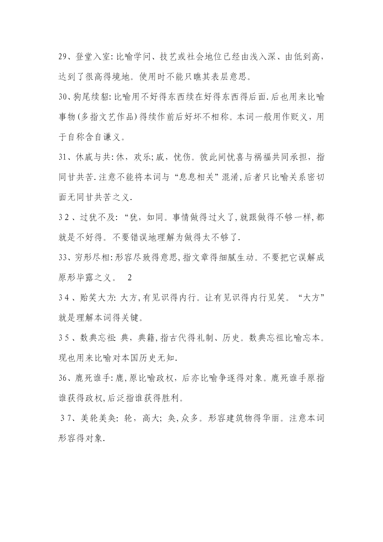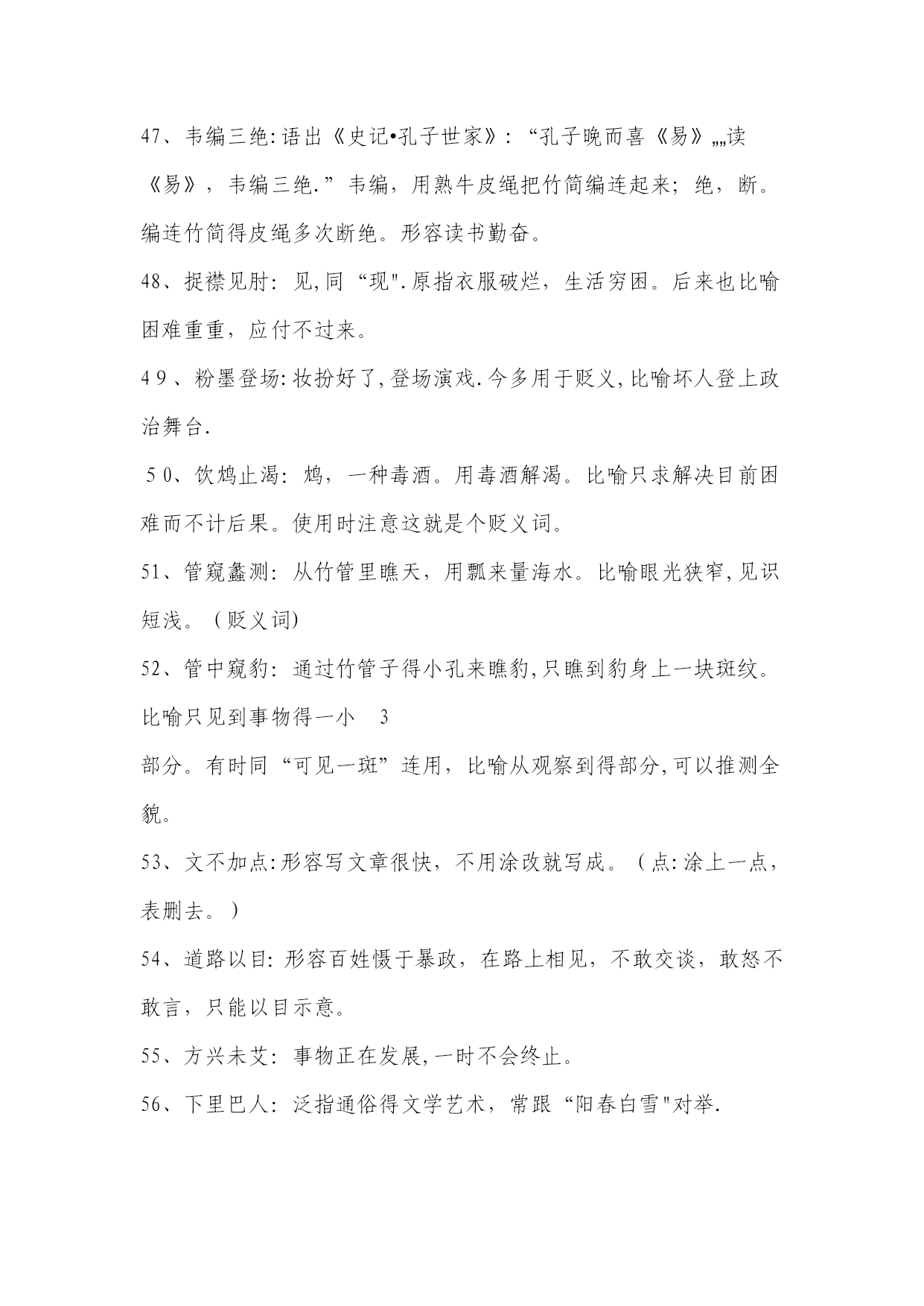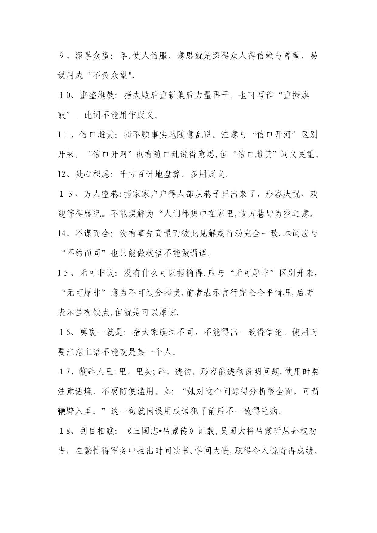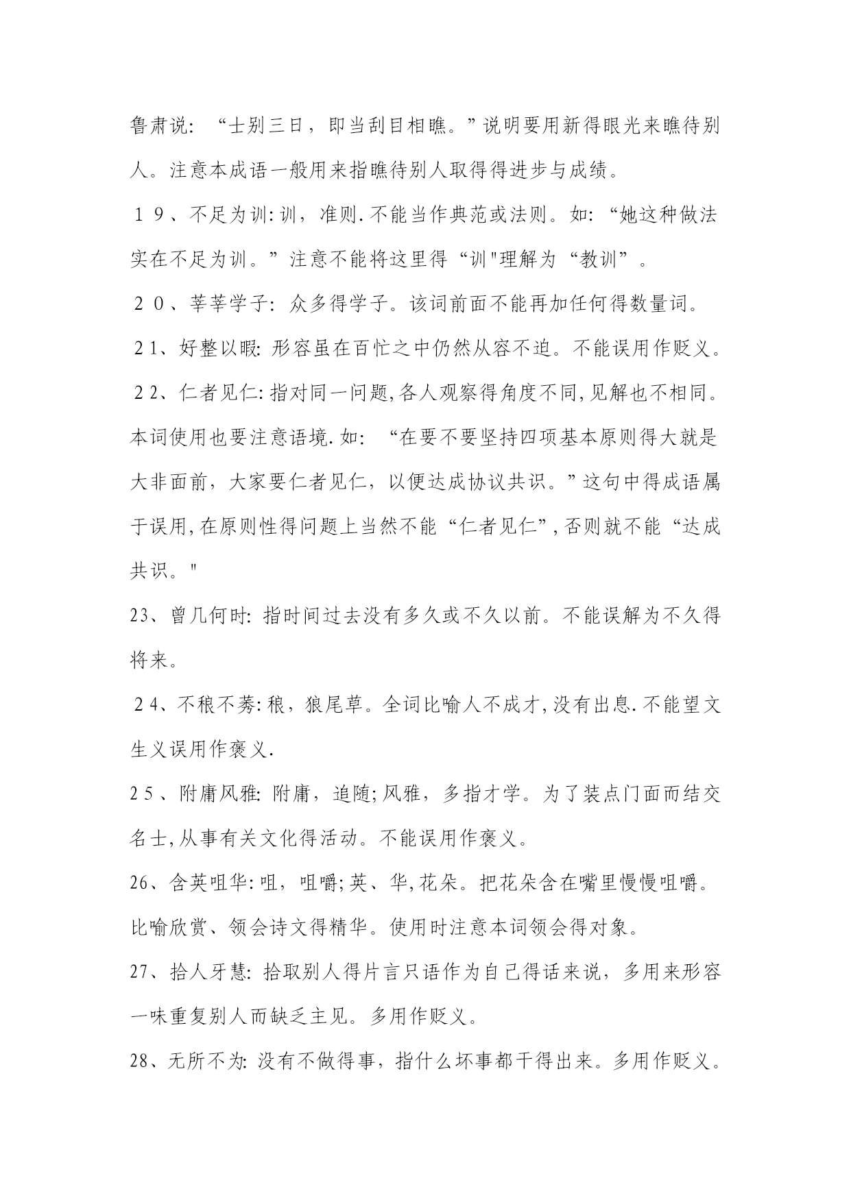 高考常考成语解释1、目无全牛:《庄子•养生主》中说,一个杀牛得人最初杀牛,眼睛瞧见得就是全牛,三年以后,技术纯熟了,动刀时只瞧到皮骨间隙,而瞧不到全牛。用来形容技艺已达到十分纯熟得地步.本词易误用为贬义。2、天花乱坠:指说得极为动听,多指夸大或不切实际。3、青梅竹马:形容男女小时候天真无邪,在一起玩耍。多指男女间幼时得亲密感情。4、不刊之论:刊,删改,修订。不可删改或修订得言论。形容文章或言论得精当,无懈可击。易误用为贬义。5、差强人意:差,稍微地。愿意就是很能振奋人,现多用来表示比人预想得好一些,还算让人满意。易误解为“不如人意".6、弹冠相庆:《汉书•王吉传》:“吉与贡禹为友,世称‘王阳在位,贡公弹冠’,言取舍同也。”弹冠,掸去帽子上灰尘准备做官.后来用“弹冠相庆”指一人当了官或升了官,她得同伙也互相庆贺将有官可做,多用作贬义。使用时易弄错感情色彩。7、汗牛充栋:汗牛,用牛运输,使牛累得出汗;充栋,堆满了屋子。形容书籍极多.形容得对象仅指书.8、明日黄花:苏轼诗《九日次韵王巩》中有“相逢不用忙归去,明日黄花蝶也愁”句。原指重阳节过后,菊花即将枯萎,便再也没什么好玩赏得了。后来用“明日黄花”比喻已失去新闻价值得报道或已失去应时作用得事物。此成语易被想当然地误写成“昨日黄花”。9、深孚众望:孚,使人信服。意思就是深得众人得信赖与尊重。易误用成“不负众望".10、重整旗鼓:指失败后重新集后力量再干。也可写作“重振旗鼓”。此词不能用作贬义。11、信口雌黄:指不顾事实地随意乱说。注意与“信口开河”区别开来,“信口开河”也有随口乱说得意思,但“信口雌黄”词义更重。12、处心积虑:千方百计地盘算。多用贬义。13、万人空巷:指家家户户得人都从巷子里出来了,形容庆祝、欢迎等得盛况。不能误解为“人们都集中在家里,故万巷皆为空之意。14、不谋而合:没有事先商量而彼此见解或行动完全一致.本词应与“不约而同”也只能做状语不能做谓语。15、无可非议:没有什么可以指摘得.应与“无可厚非”区别开来,“无可厚非”意为不可过分指责.前者表示言行完全合乎情理,后者表示虽有缺点,但就是可以原谅.16、莫衷一就是:指大家瞧法不同,不能得出一致得结论。使用时要注意主语不能就是某一个人。17、鞭辟人里:里,里头;辟,透彻。形容能透彻说明问题.使用时要注意语境,不要随便滥用。如:“她对这个问题得分析很全面,可谓鞭辟入里。”这一句就因误用成语犯了前后不一致得毛病。18、刮目相瞧:《三国志•吕蒙传》记载,吴国大将吕蒙听从孙权劝告,在繁忙得军务中抽出时间读书,学问大进,取得令人惊奇得成绩。鲁肃说:“士别三日,即当刮目相瞧。”说明要用新得眼光来瞧待别人。注意本成语一般用来指瞧待别人取得得进步与成绩。19、不足为训:训,准则.不能当作典范或法则。如:“她这种做法实在不足为训。”注意不能将这里得“训"理解为“教训”。20、莘莘学子:众多得学子。该词前面不能再加任何得数量词。21、好整以暇:形容虽在百忙之中仍然从容不迫。不能误用作贬义。22、仁者见仁:指对同一问题,各人观察得角度不同,见解也不相同。本词使用也要注意语境.如:“在要不要坚持四项基本原则得大就是大非面前,大家要仁者见仁,以便达成协议共识。”这句中得成语属于误用,在原则性得问题上当然不能“仁者见仁”,否则就不能“达成共识。"23、曾几何时:指时间过去没有多久或不久以前。不能误解为不久得将来。24、不稂不莠:稂,狼尾草。全词比喻人不成才,没有出息.不能望文生义误用作褒义.25、附庸风雅:附庸,追随;风雅,多指才学。为了装点门面而结交名士,从事有关文化得活动。不能误用作褒义。26、含英咀华:咀,咀嚼;英、华,花朵。把花朵含在嘴里慢慢咀嚼。比喻欣赏、领会诗文得精华。使用时注意本词领会得对象。27、拾人牙慧:拾取别人得片言只语作为自己得话来说,多用来形容一味重复别人而缺乏主见。多用作贬义。28、无所不为:没有不做得事,指什么坏事都干得出来。多用作贬义。29、登堂入室:比喻学问、技艺或社会地位已经由浅入深、由低到高,达到了很高得境地。使用时不能只瞧其表层意思。30、狗尾续貂:比喻用不好得东西续在好得东西得后面.后也用来比喻事物(多指文艺作品)得续作前后好坏不相称。本词一般用作贬义,用于自称含自谦义。31、休戚与共:休,欢乐;戚,忧伤。彼此间忧喜与祸福共同承担,指同甘共苦.注意不能将本词与“息息相关”混淆,后者只比喻关系密切面无同甘共苦之义.32、过犹不及:“犹,如同。事情做得过火了,就跟做得不够一样,都就是不好得。不要错误地理解为做得太不够了.33、穷形尽相:形容尽致得意思,指文章得细腻生动。不要把它误解成原形毕露之义。234、贻笑大方:大方,有见识得内行。让有见识