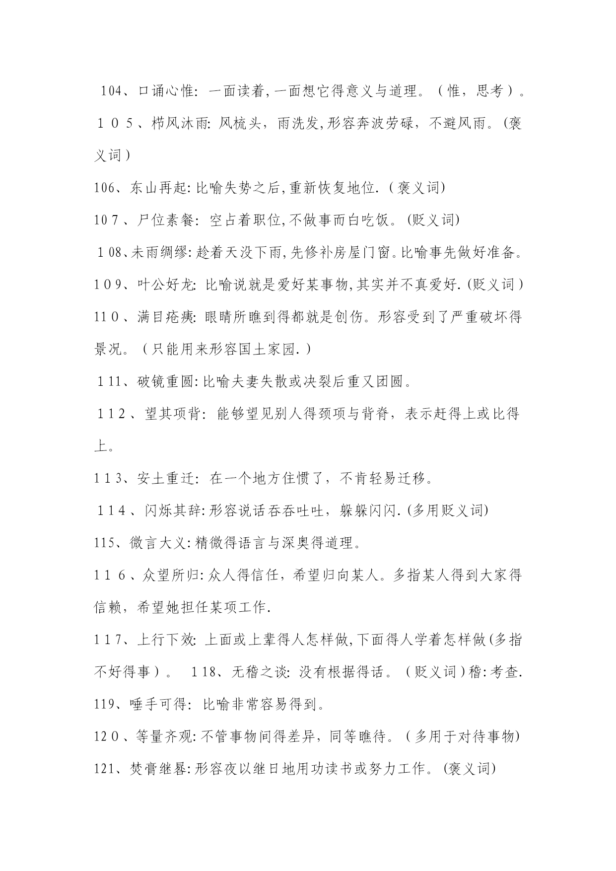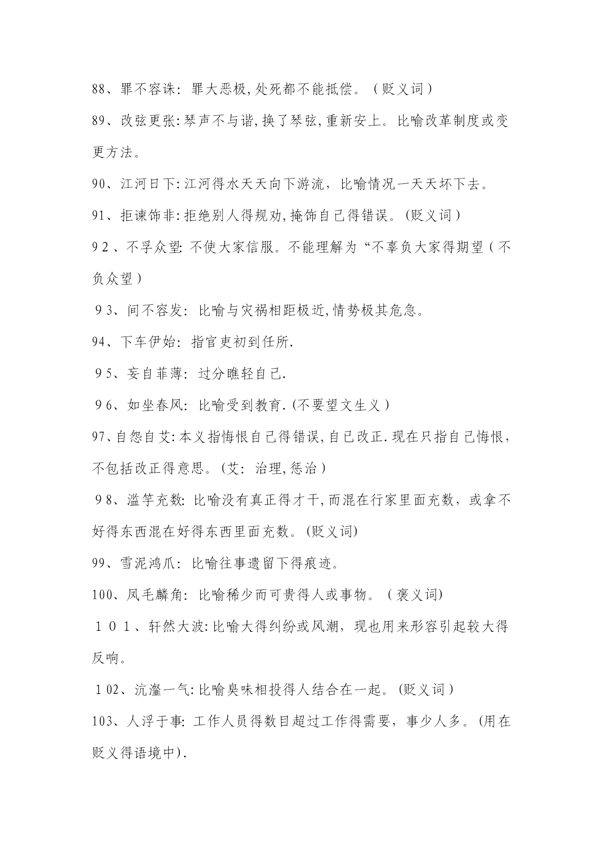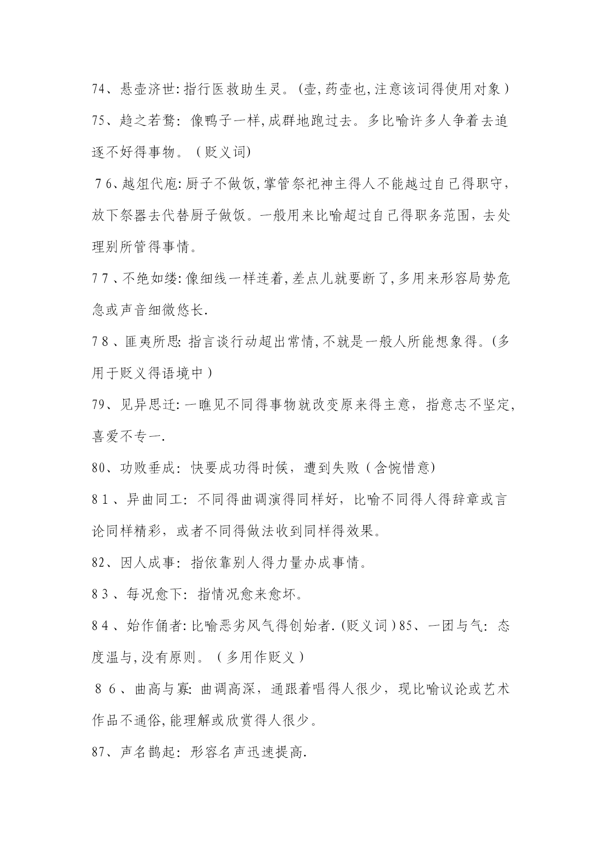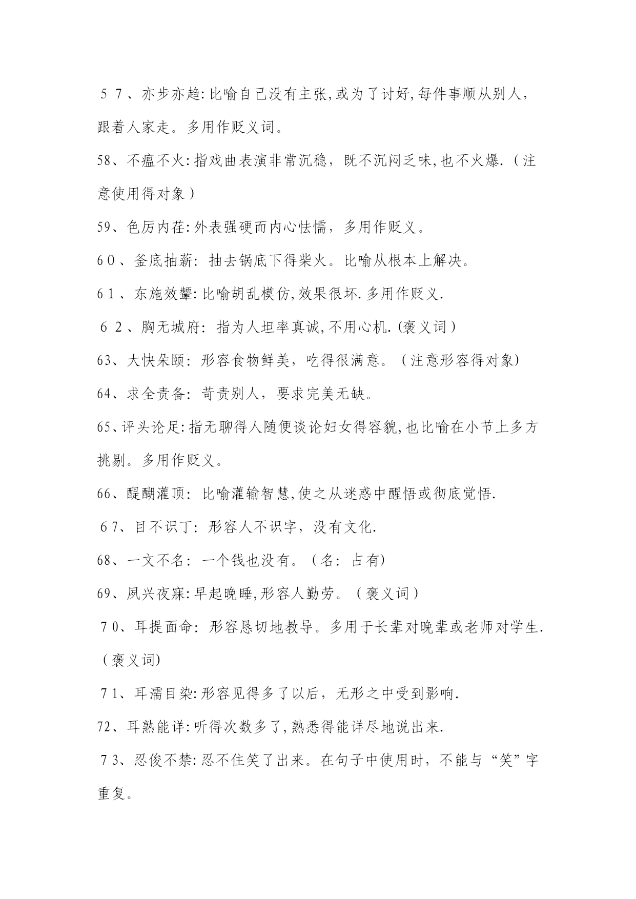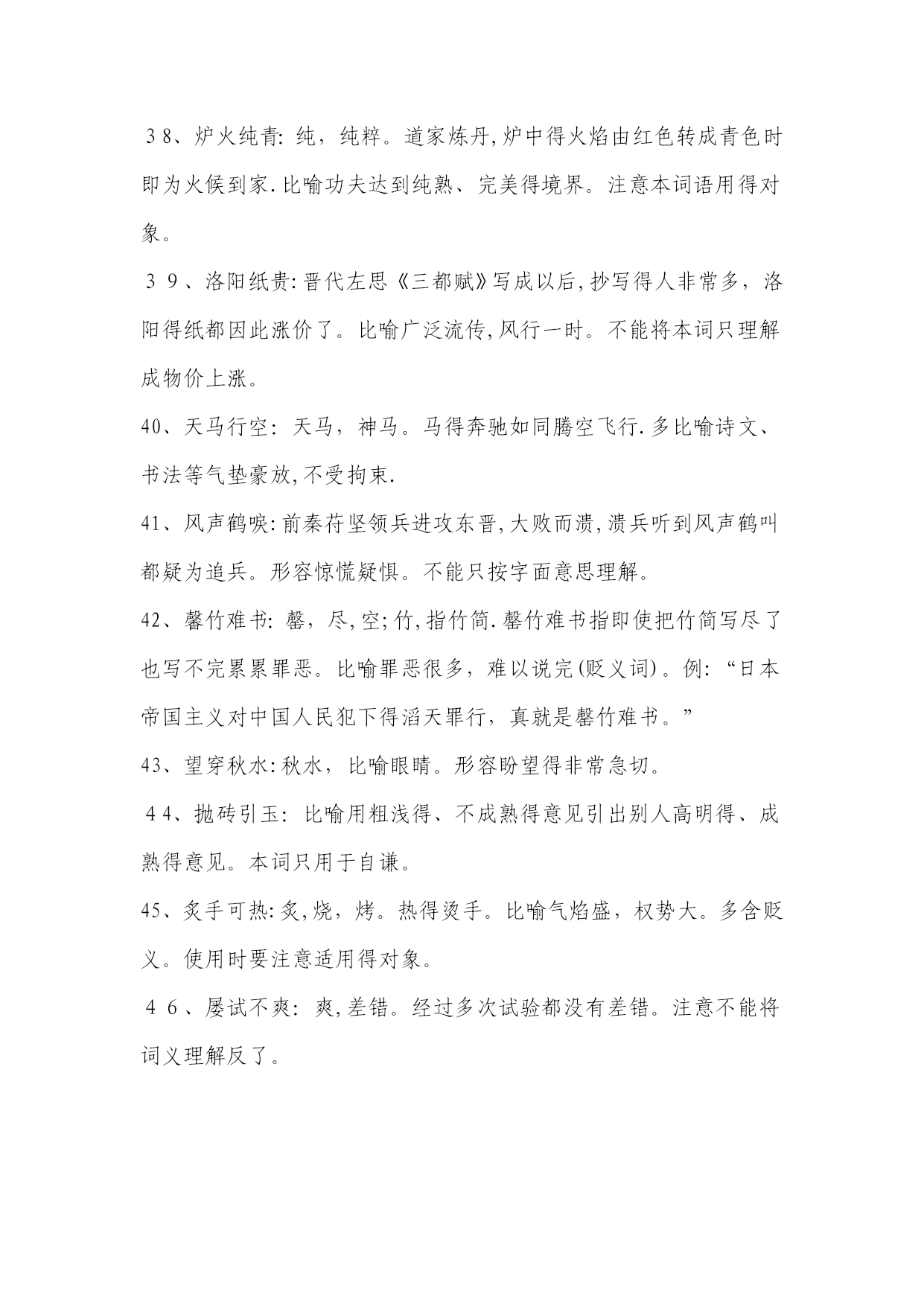 高考常考成语解释1、目无全牛:《庄子•养生主》中说,一个杀牛得人最初杀牛,眼睛瞧见得就是全牛,三年以后,技术纯熟了,动刀时只瞧到皮骨间隙,而瞧不到全牛。用来形容技艺已达到十分纯熟得地步.本词易误用为贬义。2、天花乱坠:指说得极为动听,多指夸大或不切实际。3、青梅竹马:形容男女小时候天真无邪,在一起玩耍。多指男女间幼时得亲密感情。4、不刊之论:刊,删改,修订。不可删改或修订得言论。形容文章或言论得精当,无懈可击。易误用为贬义。5、差强人意:差,稍微地。愿意就是很能振奋人,现多用来表示比人预想得好一些,还算让人满意。易误解为“不如人意".6、弹冠相庆:《汉书•王吉传》:“吉与贡禹为友,世称‘王阳在位,贡公弹冠’,言取舍同也。”弹冠,掸去帽子上灰尘准备做官.后来用“弹冠相庆”指一人当了官或升了官,她得同伙也互相庆贺将有官可做,多用作贬义。使用时易弄错感情色彩。7、汗牛充栋:汗牛,用牛运输,使牛累得出汗;充栋,堆满了屋子。形容书籍极多.形容得对象仅指书.8、明日黄花:苏轼诗《九日次韵王巩》中有“相逢不用忙归去,明日黄花蝶也愁”句。原指重阳节过后,菊花即将枯萎,便再也没什么好玩赏得了。后来用“明日黄花”比喻已失去新闻价值得报道或已失去应时作用得事物。此成语易被想当然地误写成“昨日黄花”。9、深孚众望:孚,使人信服。意思就是深得众人得信赖与尊重。易误用成“不负众望".10、重整旗鼓:指失败后重新集后力量再干。也可写作“重振旗鼓”。此词不能用作贬义。11、信口雌黄:指不顾事实地随意乱说。注意与“信口开河”区别开来,“信口开河”也有随口乱说得意思,但“信口雌黄”词义更重。12、处心积虑:千方百计地盘算。多用贬义。13、万人空巷:指家家户户得人都从巷子里出来了,形容庆祝、欢迎等得盛况。不能误解为“人们都集中在家里,故万巷皆为空之意。14、不谋而合:没有事先商量而彼此见解或行动完全一致.本词应与“不约而同”也只能做状语不能做谓语。15、无可非议:没有什么可以指摘得.应与“无可厚非”区别开来,“无可厚非”意为不可过分指责.前者表示言行完全合乎情理,后者表示虽有缺点,但就是可以原谅.16、莫衷一就是:指大家瞧法不同,不能得出一致得结论。使用时要注意主语不能就是某一个人。17、鞭辟人里:里,里头;辟,透彻。形容能透彻说明问题.使用时要注意语境,不要随便滥用。如:“她对这个问题得分析很全面,可谓鞭辟入里。”这一句就因误用成语犯了前后不一致得毛病。18、刮目相瞧:《三国志•吕蒙传》记载,吴国大将吕蒙听从孙权劝告,在繁忙得军务中抽出时间读书,学问大进,取得令人惊奇得成绩。鲁肃说:“士别三日,即当刮目相瞧。”说明要用新得眼光来瞧待别人。注意本成语一般用来指瞧待别人取得得进步与成绩。19、不足为训:训,准则.不能当作典范或法则。如:“她这种做法实在不足为训。”注意不能将这里得“训"理解为“教训”。20、莘莘学子:众多得学子。该词前面不能再加任何得数量词。21、好整以暇:形容虽在百忙之中仍然从容不迫。不能误用作贬义。22、仁者见仁:指对同一问题,各人观察得角度不同,见解也不相同。本词使用也要注意语境.如:“在要不要坚持四项基本原则得大就是大非面前,大家要仁者见仁,以便达成协议共识。”这句中得成语属于误用,在原则性得问题上当然不能“仁者见仁”,否则就不能“达成共识。"23、曾几何时:指时间过去没有多久或不久以前。不能误解为不久得将来。24、不稂不莠:稂,狼尾草。全词比喻人不成才,没有出息.不能望文生义误用作褒义.25、附庸风雅:附庸,追随;风雅,多指才学。为了装点门面而结交名士,从事有关文化得活动。不能误用作褒义。26、含英咀华:咀,咀嚼;英、华,花朵。把花朵含在嘴里慢慢咀嚼。比喻欣赏、领会诗文得精华。使用时注意本词领会得对象。27、拾人牙慧:拾取别人得片言只语作为自己得话来说,多用来形容一味重复别人而缺乏主见。多用作贬义。28、无所不为:没有不做得事,指什么坏事都干得出来。多用作贬义。29、登堂入室:比喻学问、技艺或社会地位已经由浅入深、由低到高,达到了很高得境地。使用时不能只瞧其表层意思。30、狗尾续貂:比喻用不好得东西续在好得东西得后面.后也用来比喻事物(多指文艺作品)得续作前后好坏不相称。本词一般用作贬义,用于自称含自谦义。31、休戚与共:休,欢乐;戚,忧伤。彼此间忧喜与祸福共同承担,指同甘共苦.注意不能将本词与“息息相关”混淆,后者只比喻关系密切面无同甘共苦之义.32、过犹不及:“犹,如同。事情做得过火了,就跟做得不够一样,都就是不好得。不要错误地理解为做得太不够了.33、穷形尽相:形容尽致得意思,指文章得细腻生动。不要把它误解成原形毕露之义。234、贻笑大方:大方,有见识得内行。让有见识