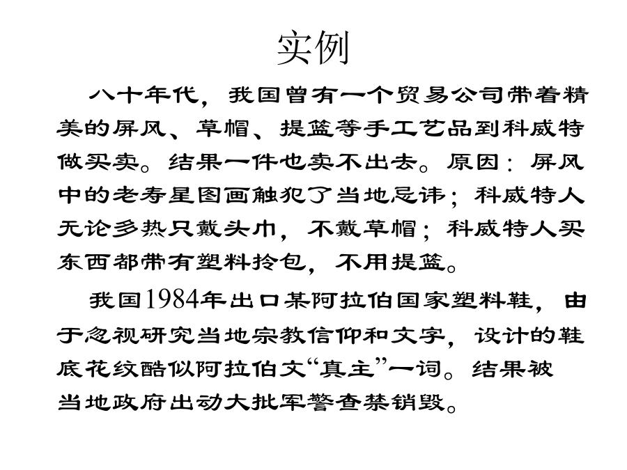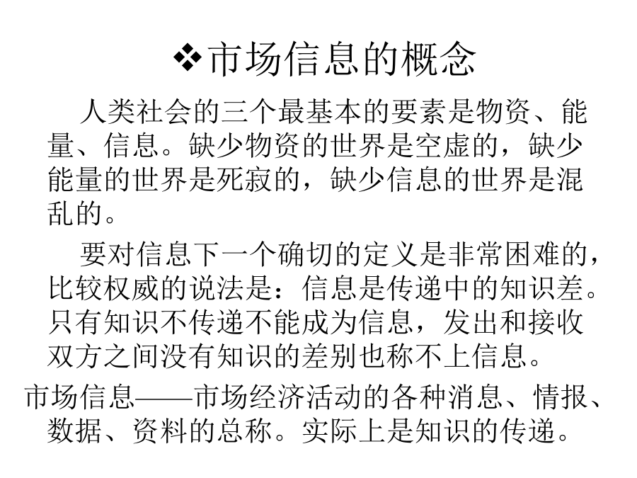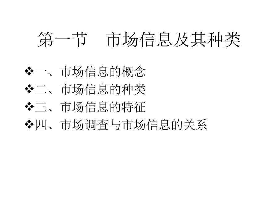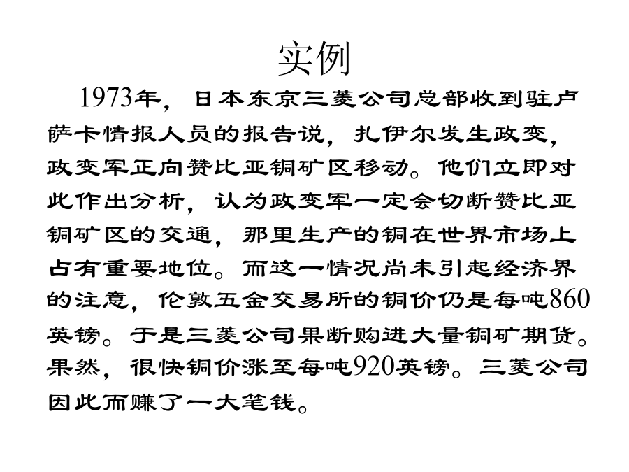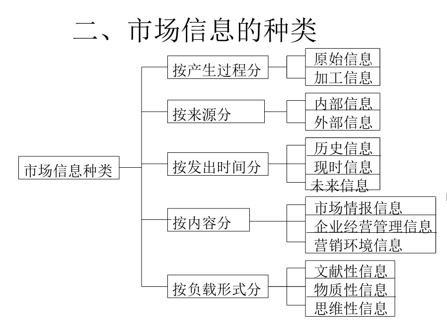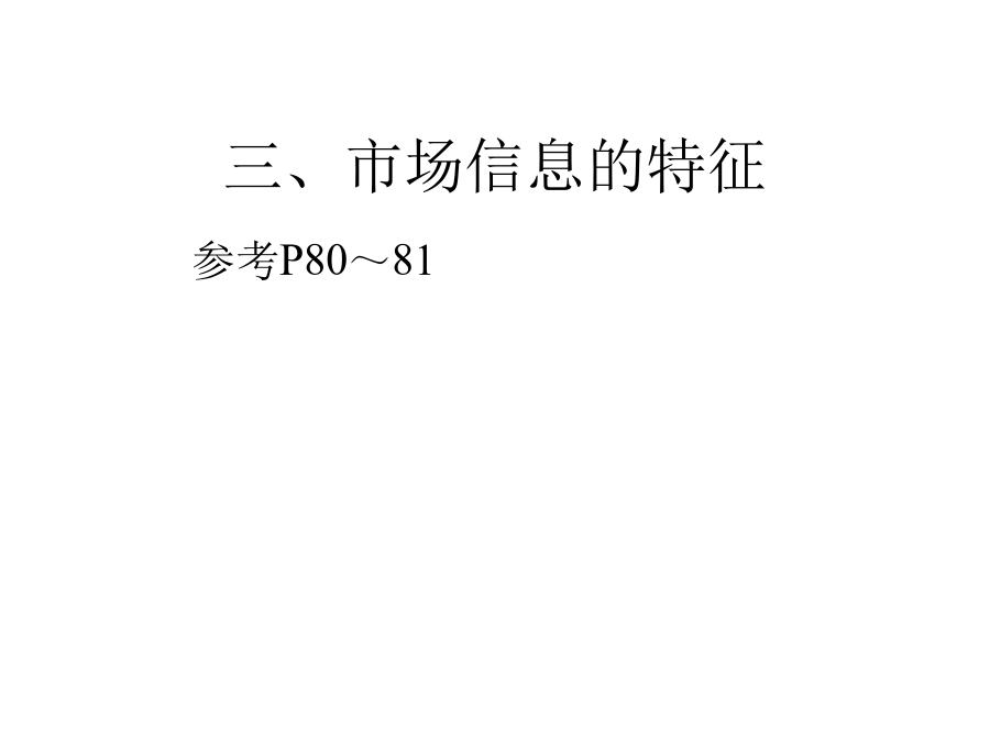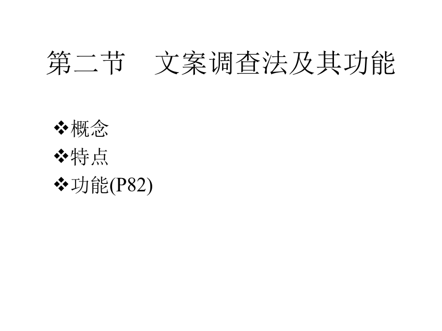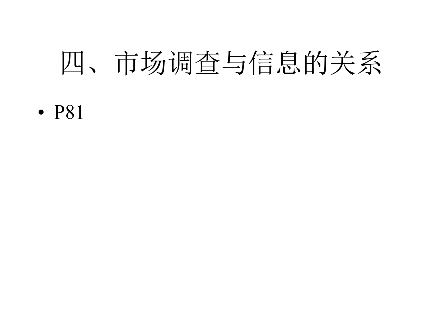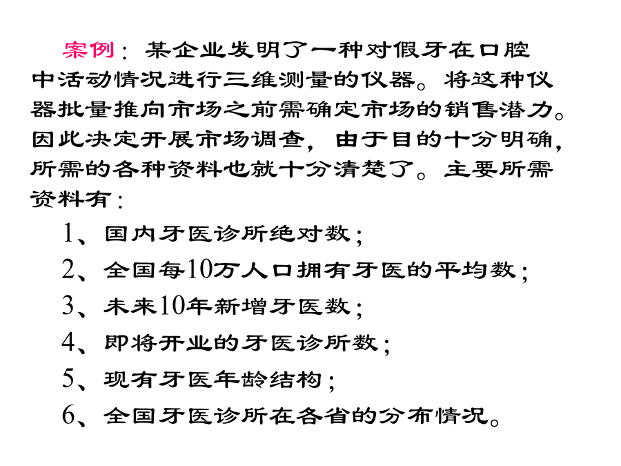 第四章文案调查第一节市场信息及其种类市场信息的概念二、市场信息的种类三、市场信息的特征实例四、市场调查与信息的关系实例第二节文案调查法及其功能案例:某企业发明了一种对假牙在口腔中活动情况进行三维测量的仪器。将这种仪器批量推向市场之前需确定市场的销售潜力。因此决定开展市场调查,由于目的十分明确,所需的各种资料也就十分清楚了。主要所需资料有:1、国内牙医诊所绝对数;2、全国每10万人口拥有牙医的平均数;3、未来10年新增牙医数;4、即将开业的牙医诊所数;5、现有牙医年龄结构;6、全国牙医诊所在各省的分布情况。上例(续)又例第三节文案调查的渠道和方法一、文案调查的原则二、文案调查的渠道(一)内部资料的来源(二)企业外部资料(三)文案调查的方式、方法三、互联网、在线数据库第四节文案调查体系的建立和管理企业信息战实例(续)(续)(续)(续)