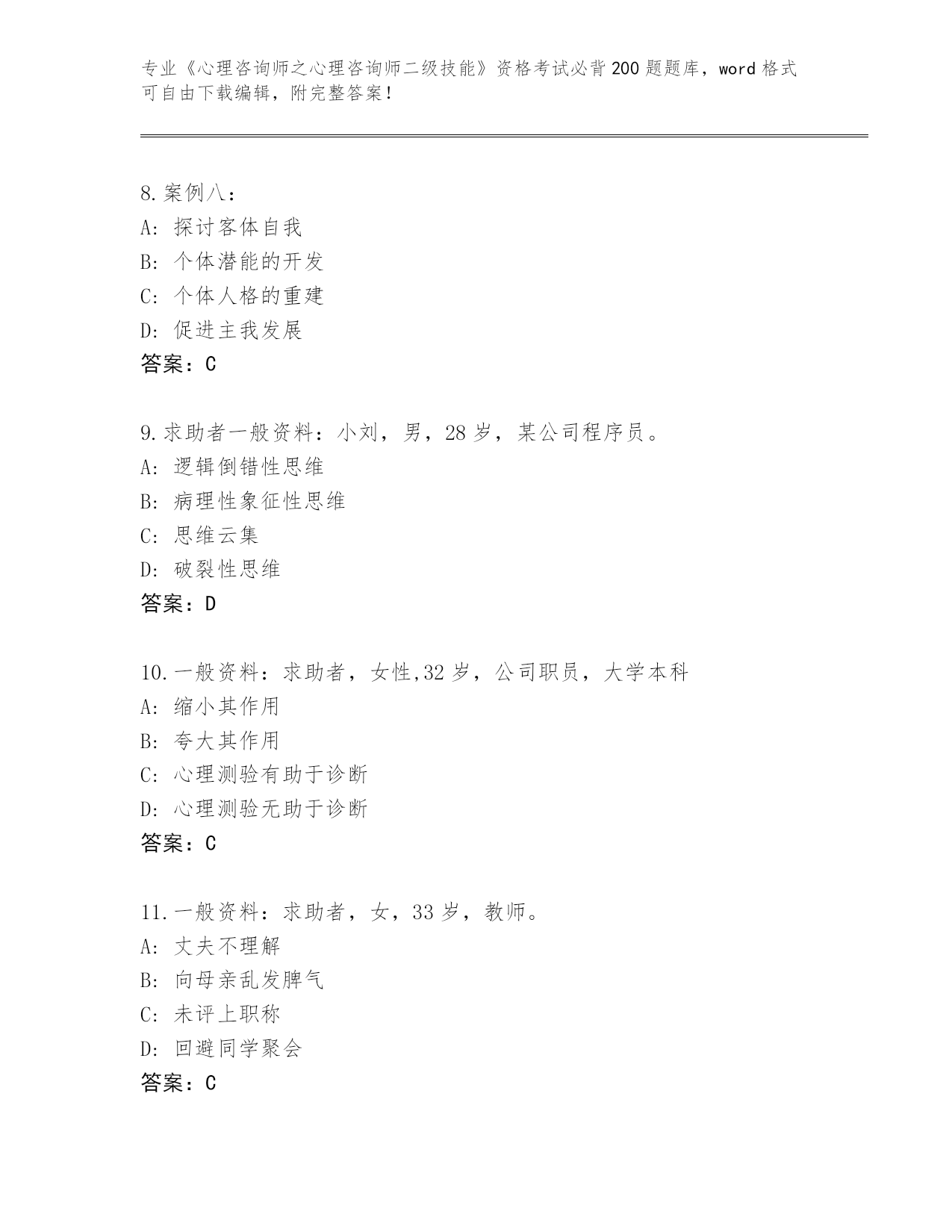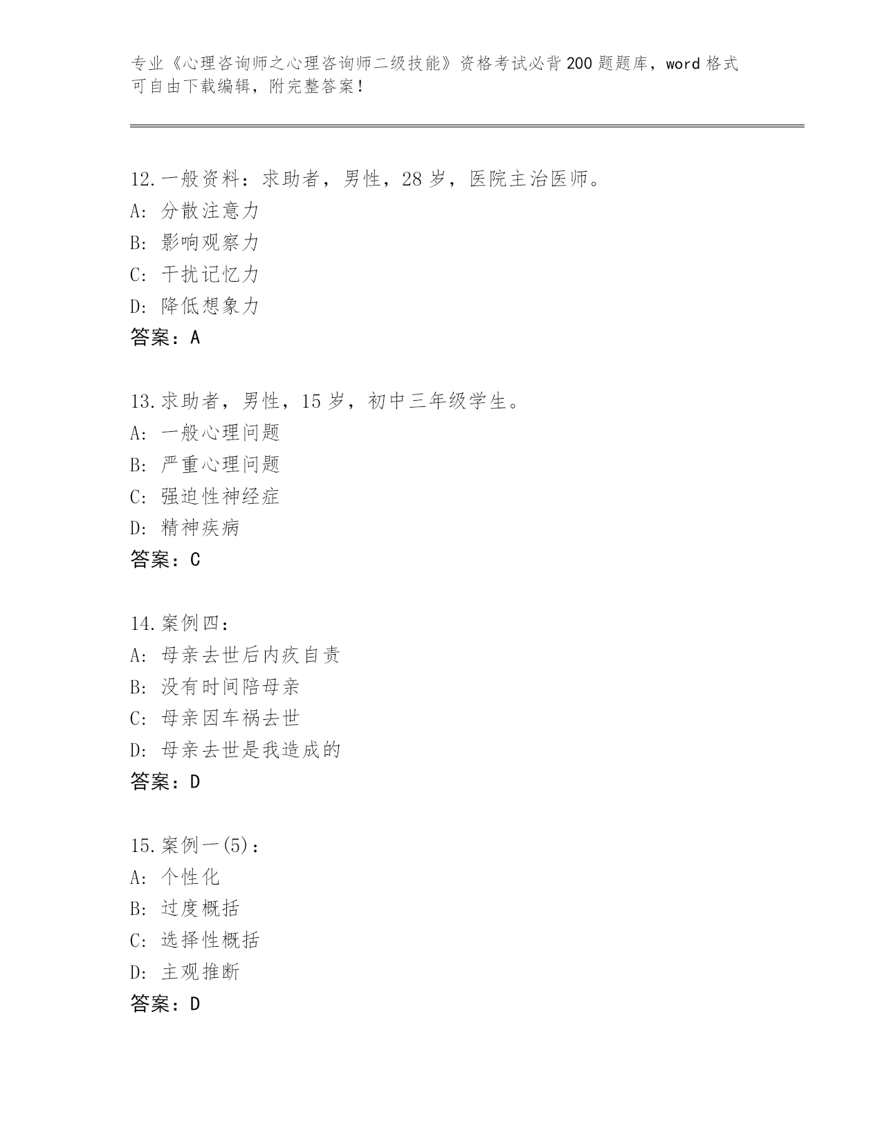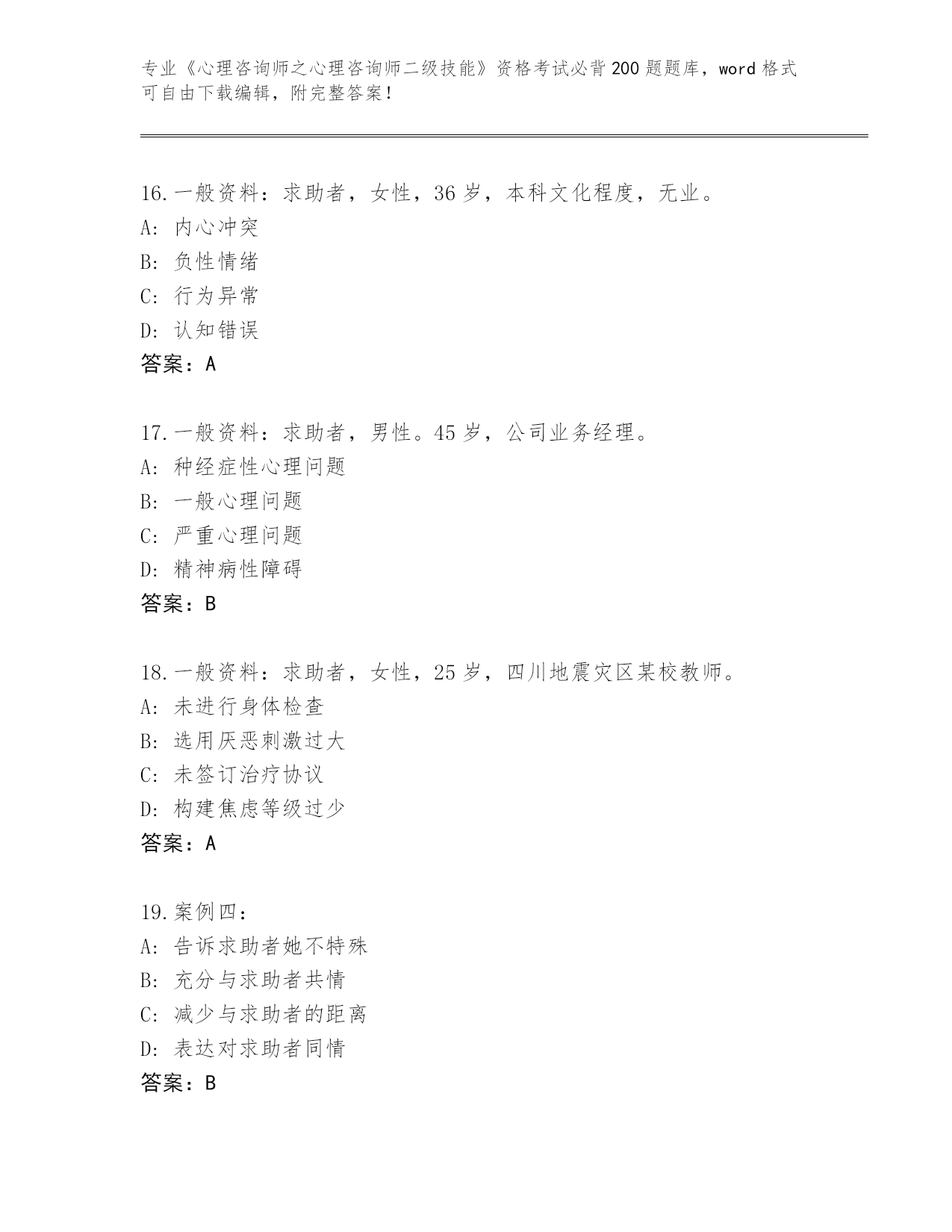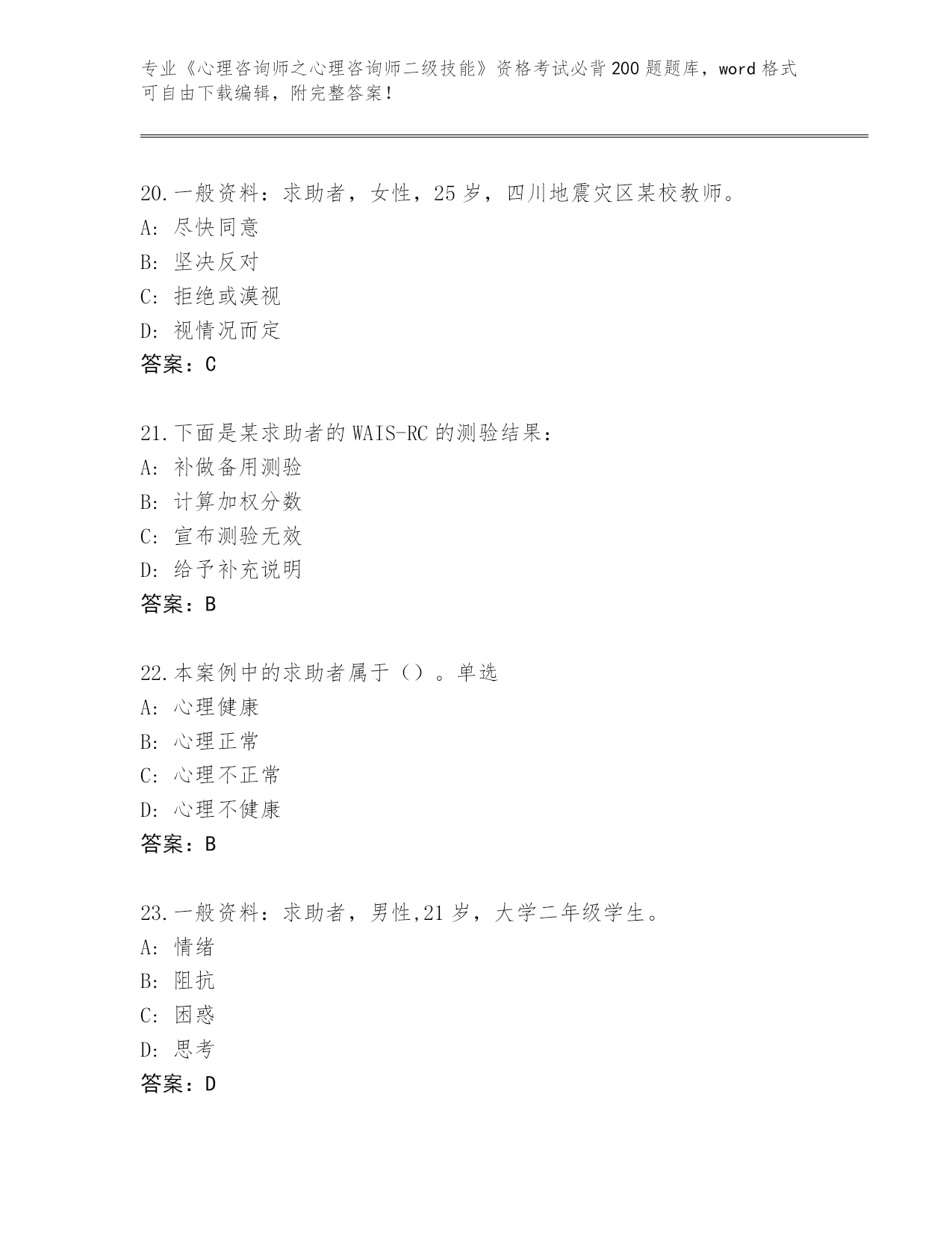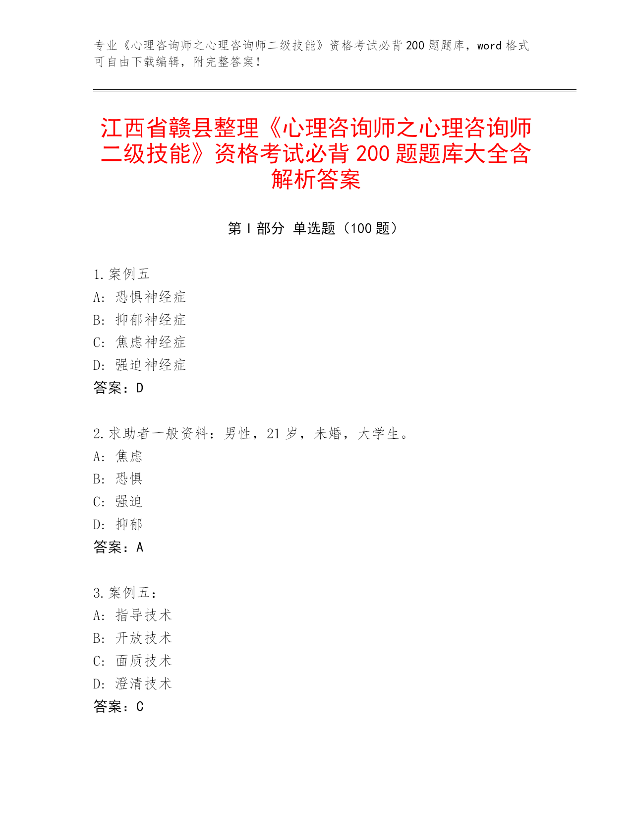 江西省赣县整理《心理咨询师之心理咨询师二级技能》资格考试必背200题题库大全含解析答案