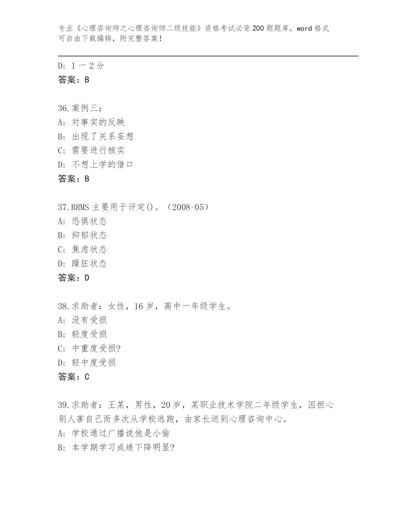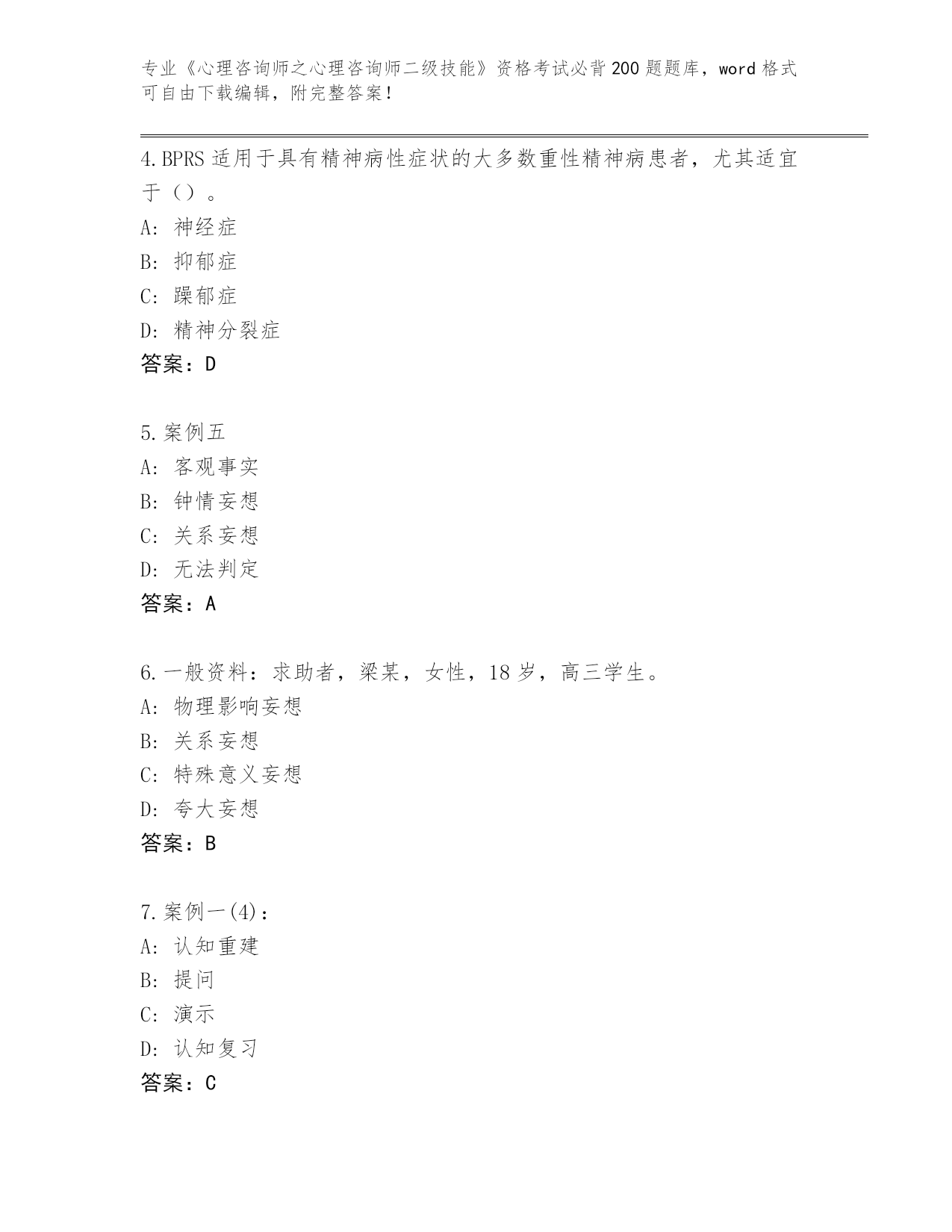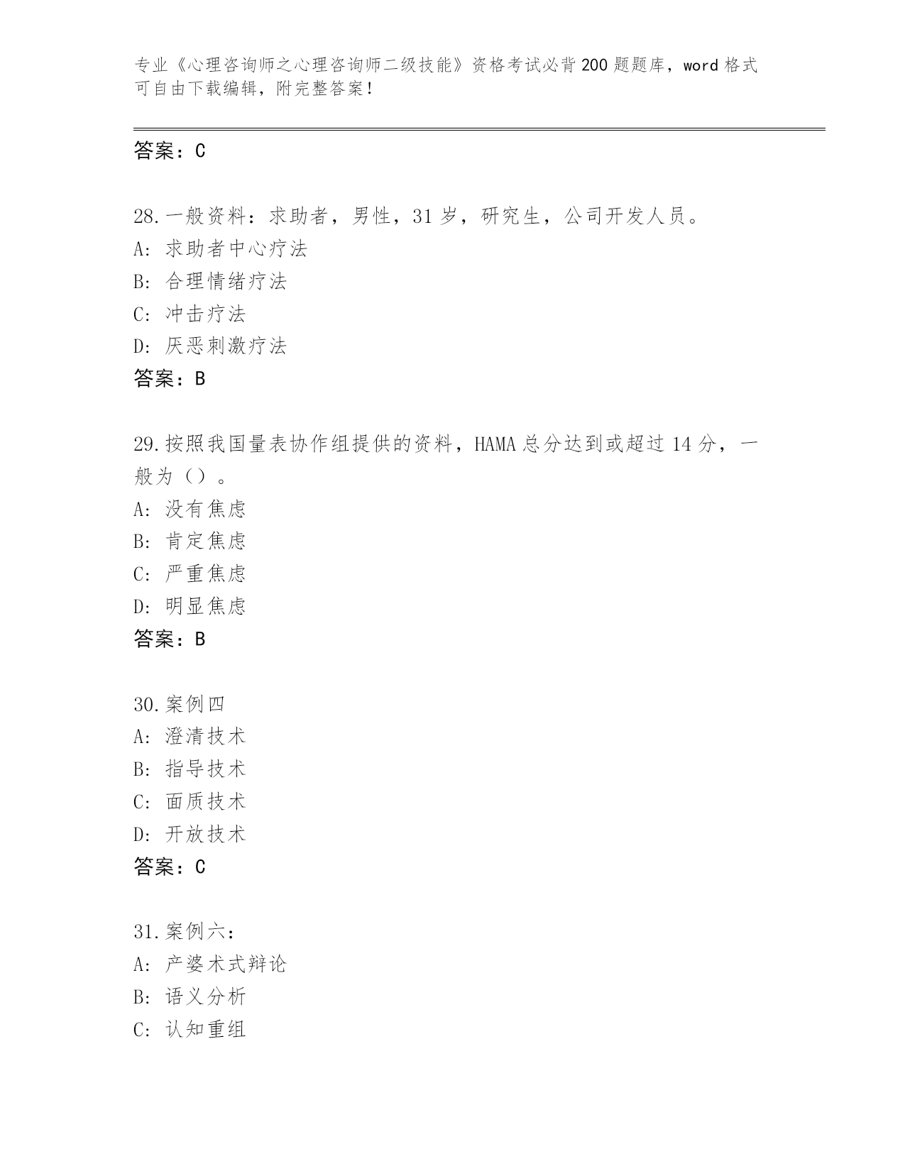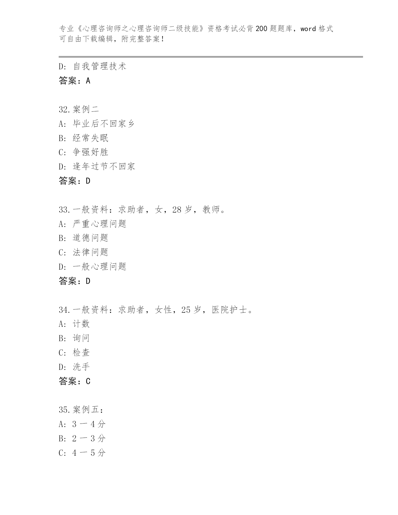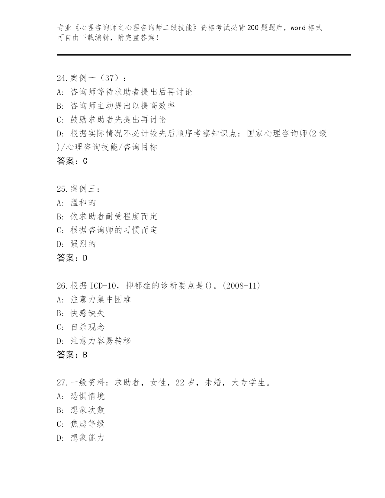 江西省芦溪县整理《心理咨询师之心理咨询师二级技能》资格考试必背200题大全及答案【全优】