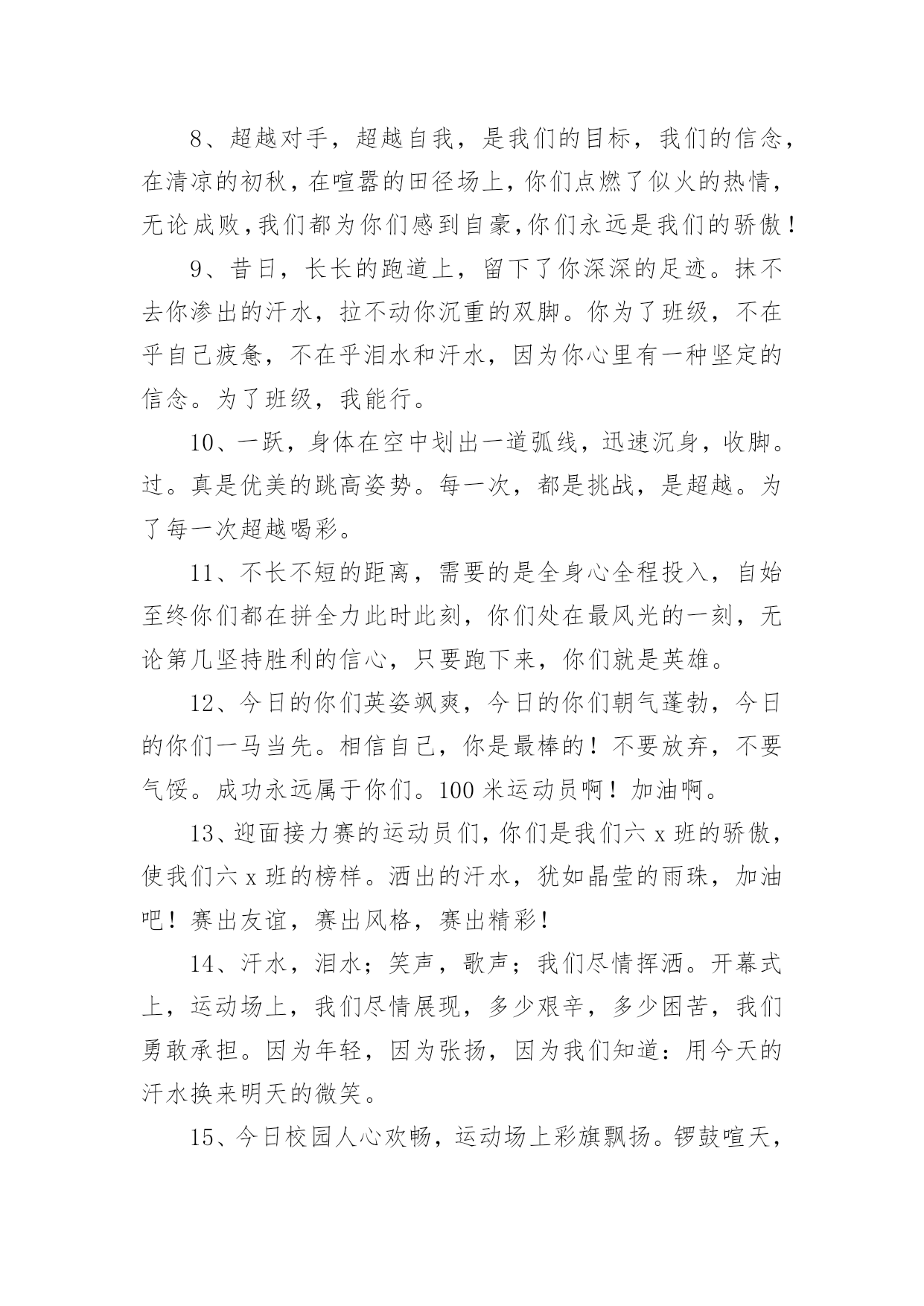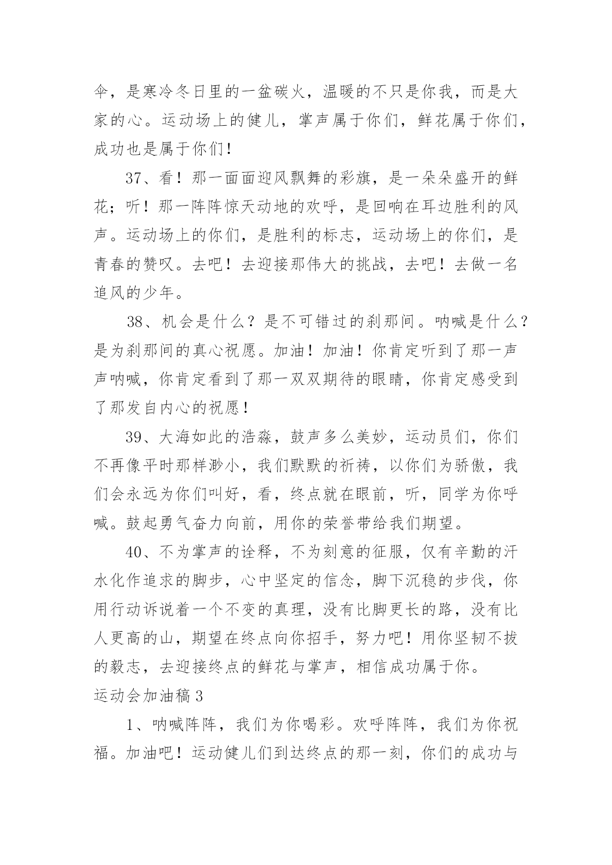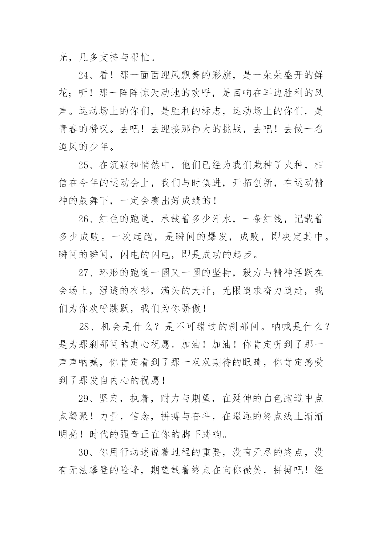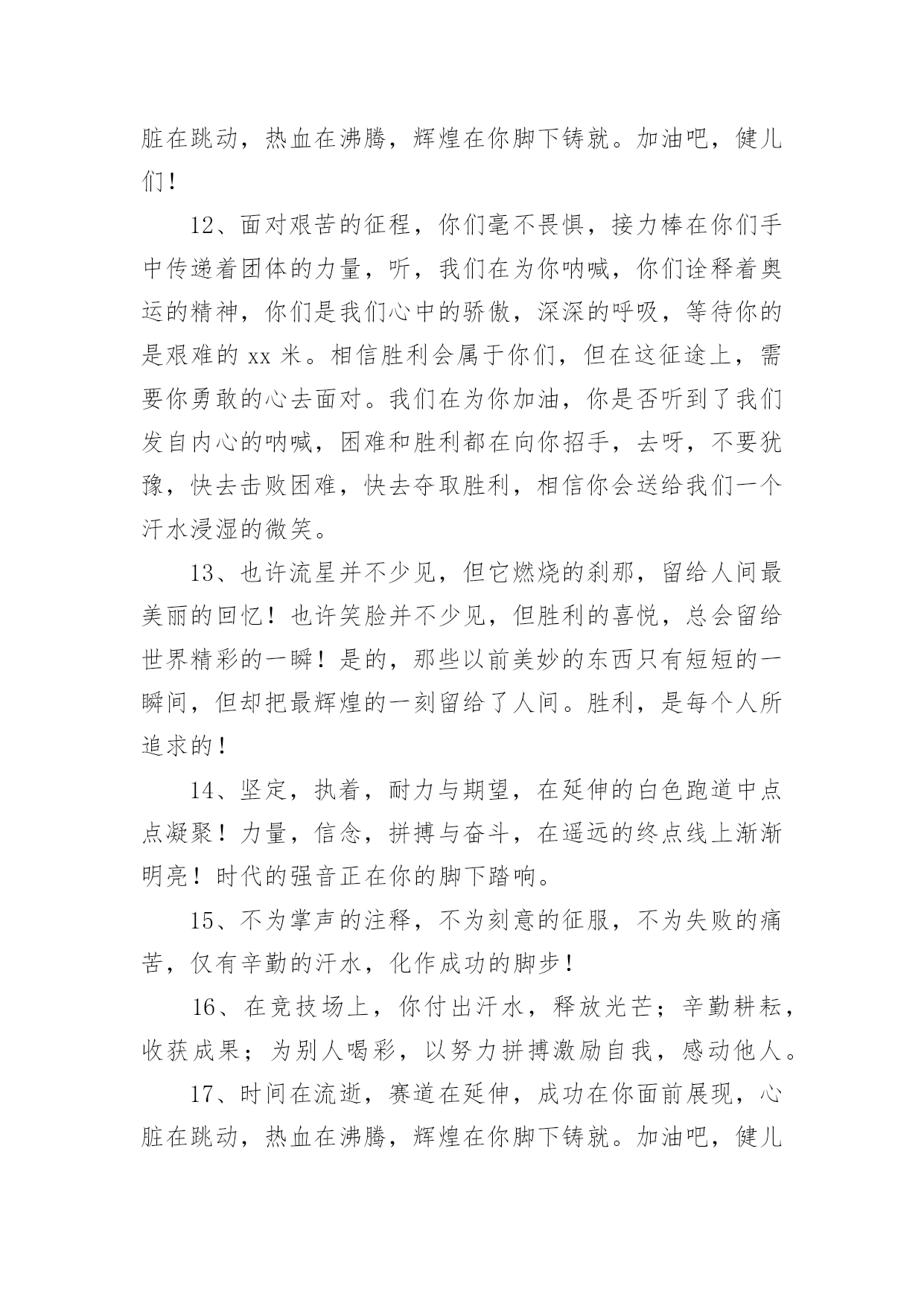 运动会加油稿运动会加油稿在当今社会生活中,我们越来越需要加油稿,加油稿是一种对他人有正向激励作用的文稿。如何写一份恰当的加油稿呢?以下是小编整理的运动会加油稿,仅供参考,大家一起来看看吧。运动会加油稿1奔跑,追逐,在这片广阔的土地上,你离玄就像一匹马和一支箭。快跑,追,你比老虎和豹子都强。刹那永恒一片片红色,一点点绿色世界因为你而更加美丽风在轻轻地歌唱成功,自由我陪你一起追求额上的.寒珠折射的不仅是阳光还有一种希望它,来自播种你看看台上一双双注视着你的眼睛运动会加油稿21、你们挥舞着充满力量的双臂,看着实心球化成美丽的弧线,我着实在心里佩服你们,你们抛出了自己的水平。2、你是运动场的心脏,跳动梦想;你是漫长路的精神,激励辉煌;你们是将上下求索的人!风为你加油,云为你助兴,坚定,执着,耐力与期望,在延伸的白色跑道中点点凝聚!力量,信念,拼搏与奋斗,在遥远的终点线上渐渐明亮!时代的强音正在你的脚下踏响。3、看!那一面面迎风飘舞的彩旗,是一朵朵盛开的鲜花;听!那一阵阵惊天动地的欢呼,是回响在耳边胜利的风声。运动场上的你们,是胜利的标志,运动场上的你们,是青春的赞叹。去吧!去迎接那伟大的挑战,去吧!去做一名追风的少年。4、秋风羽,天气淡淡的转凉。然而这秋在今日更加迷人,不是因为它的秋高气爽,也不是因为它的明媚阳光,是因为今日的人儿倍加精神气爽。看!运动场上那一幕幕,无论是哭是笑,是喜是悲,其中都融入了他们的汗水辛劳。他们是真正的矫健者,是运动场上的骄儿,更是我们心中的英雄。加油吧!英雄们!5、也许流星并不少见,但它燃烧的刹那,留给人间最美丽的回忆!也许笑脸并不少见,但胜利的喜悦,总会留给世界精彩的一瞬!是的,那些以往美妙的东西仅有短短的一瞬间,但那却把最辉煌的一刻留给人间。胜利,是每个人所追求的,胜利的喜悦,是胜利与重新开始的转折,胜利是新的开始!6、你的汗水洒在跑道,浇灌着成功的花朵开放。你的欢笑飞扬在赛场,为班争光数你最棒。跑吧,追吧,在这广阔的赛场上,你似骏马似离弦的箭。跑吧,追吧,你比虎猛,比豹强。7、环形的跑道一圈又一圈的坚持,毅力与精神活跃在会场上,湿透的衣衫,满头的大汗,无限追求奋力追赶,我们为你欢呼跳跃,我们为你骄傲。8、青春是诗,青春是歌,青春是朝气蓬勃。看,踏着青春的旋律走来的是xx班的健儿们,他们热情,他们激扬,他们勇敢,他们顽强。9、泰戈尔在诗中说,天空没有翅膀的影子,但我已飞过;艾青对朋友说,也许有人到达不了彼岸,但我们共同拥有大海。也许你们没有显赫的成绩,但运动场上留下了你们的足迹。也许你们没有奖品,但我们心中留下了你们拼搏的身影。所有的努力都是为了迎接这一刹那,所有的拼搏都是为了这一声令下。10、漫漫长路,你愿一人独撑,忍受着孤独与寂寞,承受着体力与精神的压迫,只任汗水溶于泪水,可脚步却从不停歇。好样的,纵然得不了桂冠,可坚持的你,定会赢得最终的掌声。11、时间在流逝,赛道在延伸,成功在你面前展现。心脏在跳动,热血在沸腾,辉煌在你脚下铸就。加油吧,健儿们!12、面对艰苦的征程,你们毫不畏惧,接力棒在你们手中传递着团体的力量,听,我们在为你呐喊,你们诠释着奥运的精神,你们是我们心中的骄傲,深深的呼吸,等待你的是艰难的xx米。相信胜利会属于你们,但在这征途上,需要你勇敢的心去面对。我们在为你加油,你是否听到了我们发自内心的呐喊,困难和胜利都在向你招手,去呀,不要犹豫,快去击败困难,快去夺取胜利,相信你会送给我们一个汗水浸湿的微笑。13、也许流星并不少见,但它燃烧的刹那,留给人间最美丽的回忆!也许笑脸并不少见,但胜利的喜悦,总会留给世界精彩的一瞬!是的,那些以前美妙的东西只有短短的一瞬间,但却把最辉煌的一刻留给了人间。胜利,是每个人所追求的!14、坚定,执着,耐力与期望,在延伸的白色跑道中点点凝聚!力量,信念,拼搏与奋斗,在遥远的终点线上渐渐明亮!时代的强音正在你的脚下踏响。15、不为掌声的注释,不为刻意的征服,不为失败的痛苦,仅有辛勤的汗水,化作成功的脚步!16、在竞技场上,你付出汗水,释放光芒;辛勤耕耘,收获成果;为别人喝彩,以努力拼搏激励自我,感动他人。17、时间在流逝,赛道在延伸,成功在你面前展现,心脏在跳动,热血在沸腾,辉煌在你脚下铸就。加油吧,健儿们!18、看!那一面面迎风飘舞的彩旗,是一朵朵盛开的鲜花;听!那一阵阵惊天动地的欢呼,是回响在耳边胜利的风声。运动场上的你们,是胜利的标志,运动场上的你们,是青春的赞叹。去吧!去迎接那伟大的挑战,去吧!去做一名追风的少年。19、汗水,泪水,笑声,歌声,我们尽情挥洒。开幕式上,运动场上,我们尽情展现,多少艰辛,多少困苦,我们勇敢承担。因为年轻,因为张扬,因为我们知道:用今日的汗水换来明天的微笑。20、短暂的一瞬间,显示出你惊人的速度,铿锵有力的一声吼叫,