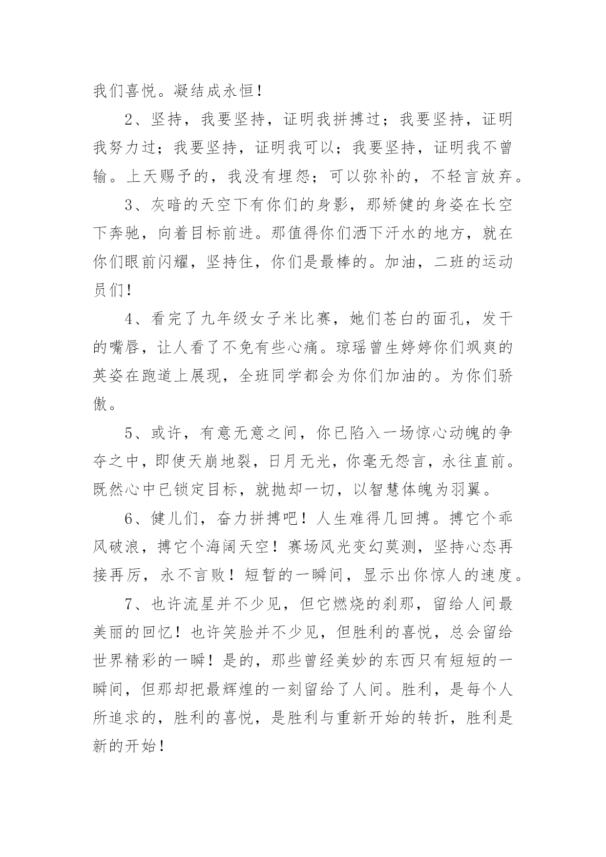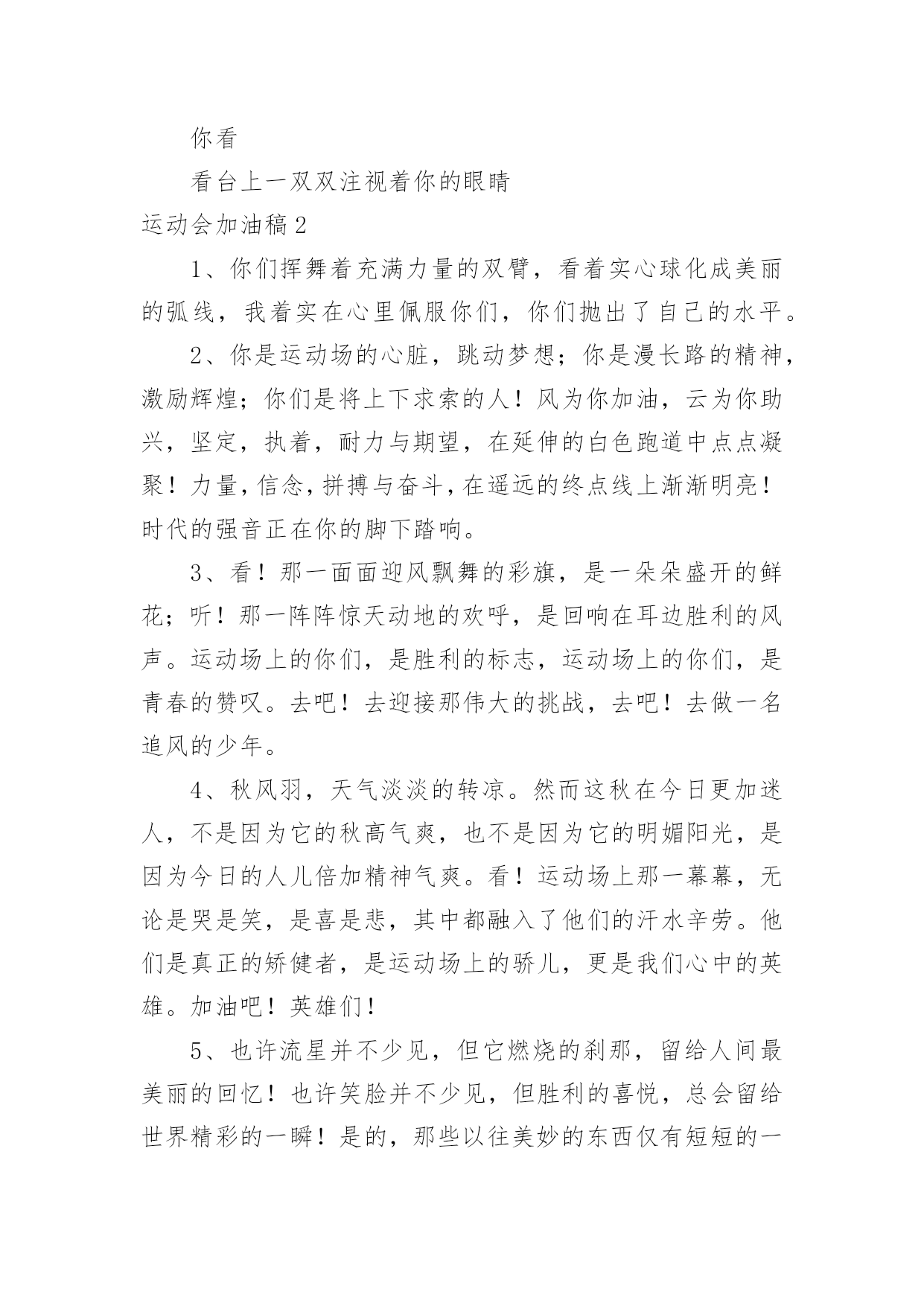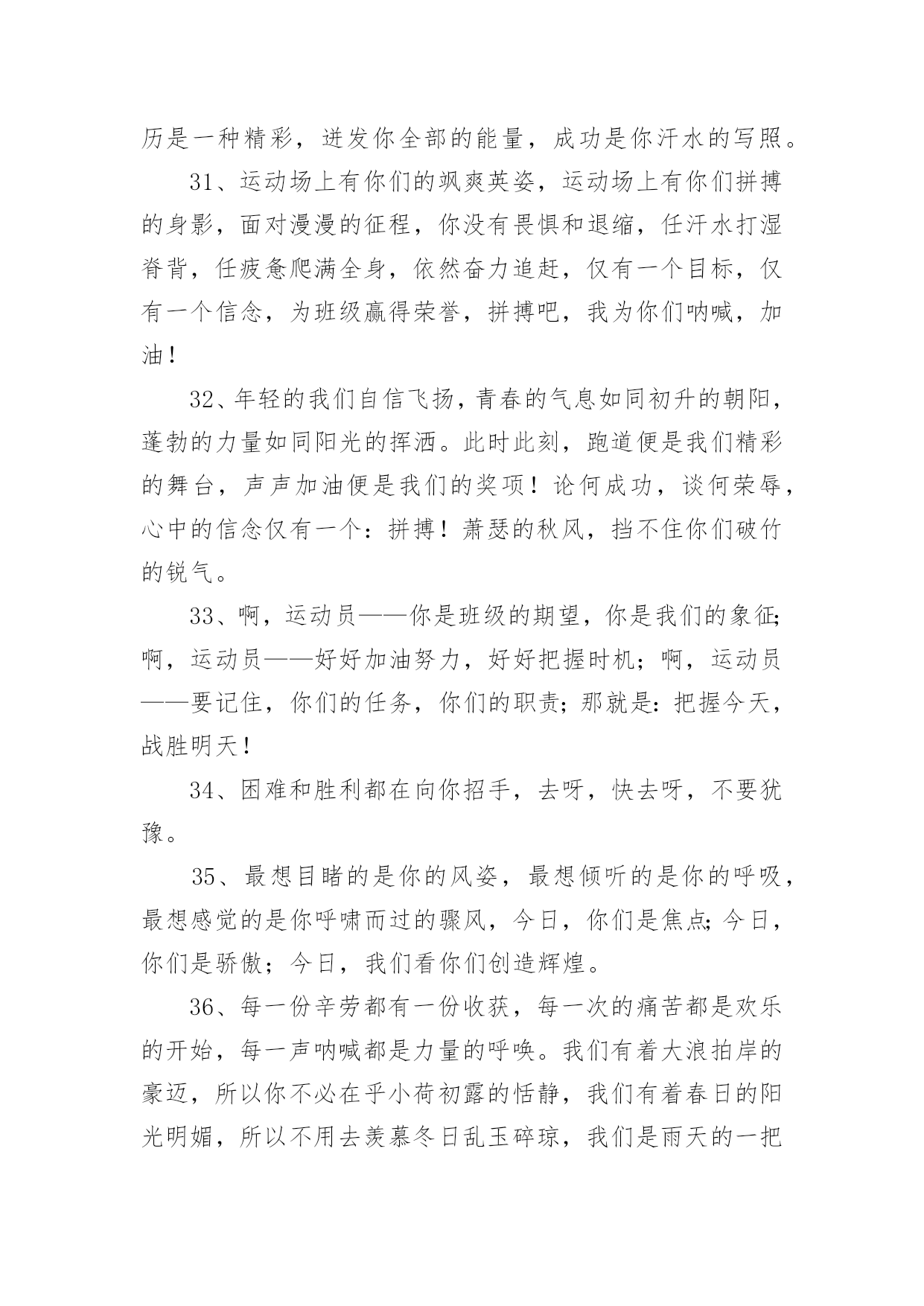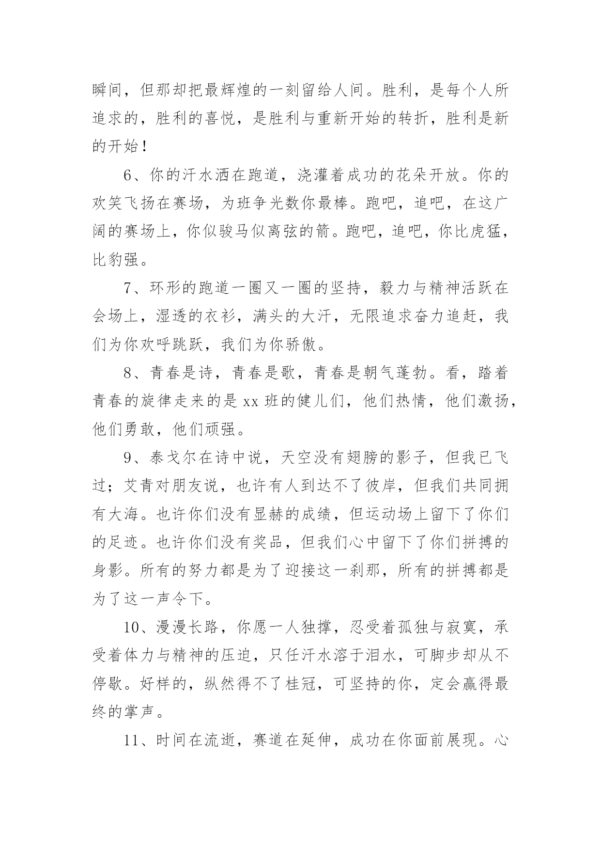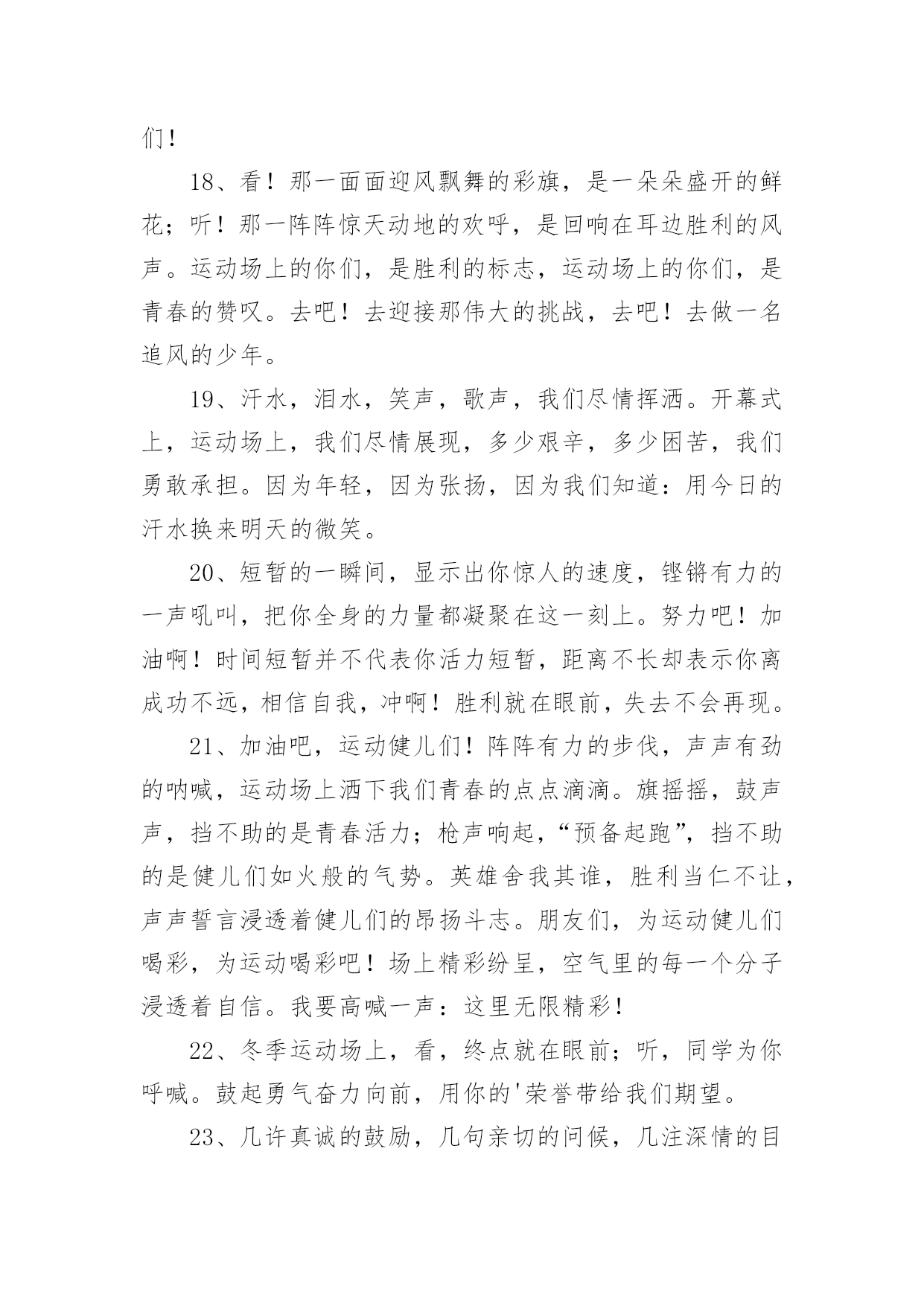 运动会加油稿运动会加油稿在当今社会生活中,我们越来越需要加油稿,加油稿是一种对他人有正向激励作用的文稿。如何写一份恰当的加油稿呢?以下是小编整理的运动会加油稿,仅供参考,大家一起来看看吧。运动会加油稿1奔跑,追逐,在这片广阔的土地上,你离玄就像一匹马和一支箭。快跑,追,你比老虎和豹子都强。刹那永恒一片片红色,一点点绿色世界因为你而更加美丽风在轻轻地歌唱成功,自由我陪你一起追求额上的.寒珠折射的不仅是阳光还有一种希望它,来自播种你看看台上一双双注视着你的眼睛运动会加油稿21、你们挥舞着充满力量的双臂,看着实心球化成美丽的弧线,我着实在心里佩服你们,你们抛出了自己的水平。2、你是运动场的心脏,跳动梦想;你是漫长路的精神,激励辉煌;你们是将上下求索的人!风为你加油,云为你助兴,坚定,执着,耐力与期望,在延伸的白色跑道中点点凝聚!力量,信念,拼搏与奋斗,在遥远的终点线上渐渐明亮!时代的强音正在你的脚下踏响。3、看!那一面面迎风飘舞的彩旗,是一朵朵盛开的鲜花;听!那一阵阵惊天动地的欢呼,是回响在耳边胜利的风声。运动场上的你们,是胜利的标志,运动场上的你们,是青春的赞叹。去吧!去迎接那伟大的挑战,去吧!去做一名追风的少年。4、秋风羽,天气淡淡的转凉。然而这秋在今日更加迷人,不是因为它的秋高气爽,也不是因为它的明媚阳光,是因为今日的人儿倍加精神气爽。看!运动场上那一幕幕,无论是哭是笑,是喜是悲,其中都融入了他们的汗水辛劳。他们是真正的矫健者,是运动场上的骄儿,更是我们心中的英雄。加油吧!英雄们!5、也许流星并不少见,但它燃烧的刹那,留给人间最美丽的回忆!也许笑脸并不少见,但胜利的喜悦,总会留给世界精彩的一瞬!是的,那些以往美妙的东西仅有短短的一瞬间,但那却把最辉煌的一刻留给人间。胜利,是每个人所追求的,胜利的喜悦,是胜利与重新开始的转折,胜利是新的开始!6、你的汗水洒在跑道,浇灌着成功的花朵开放。你的欢笑飞扬在赛场,为班争光数你最棒。跑吧,追吧,在这广阔的赛场上,你似骏马似离弦的箭。跑吧,追吧,你比虎猛,比豹强。7、环形的跑道一圈又一圈的坚持,毅力与精神活跃在会场上,湿透的衣衫,满头的大汗,无限追求奋力追赶,我们为你欢呼跳跃,我们为你骄傲。8、青春是诗,青春是歌,青春是朝气蓬勃。看,踏着青春的旋律走来的是xx班的健儿们,他们热情,他们激扬,他们勇敢,他们顽强。9、泰戈尔在诗中说,天空没有翅膀的影子,但我已飞过;艾青对朋友说,也许有人到达不了彼岸,但我们共同拥有大海。也许你们没有显赫的成绩,但运动场上留下了你们的足迹。也许你们没有奖品,但我们心中留下了你们拼搏的身影。所有的努力都是为了迎接这一刹那,所有的拼搏都是为了这一声令下。10、漫漫长路,你愿一人独撑,忍受着孤独与寂寞,承受着体力与精神的压迫,只任汗水溶于泪水,可脚步却从不停歇。好样的,纵然得不了桂冠,可坚持的你,定会赢得最终的掌声。11、时间在流逝,赛道在延伸,成功在你面前展现。心脏在跳动,热血在沸腾,辉煌在你脚下铸就。加油吧,健儿们!12、面对艰苦的征程,你们毫不畏惧,接力棒在你们手中传递着团体的力量,听,我们在为你呐喊,你们诠释着奥运的精神,你们是我们心中的骄傲,深深的呼吸,等待你的是艰难的xx米。相信胜利会属于你们,但在这征途上,需要你勇敢的心去面对。我们在为你加油,你是否听到了我们发自内心的呐喊,困难和胜利都在向你招手,去呀,不要犹豫,快去击败困难,快去夺取胜利,相信你会送给我们一个汗水浸湿的微笑。13、也许流星并不少见,但它燃烧的刹那,留给人间最美丽的回忆!也许笑脸并不少见,但胜利的喜悦,总会留给世界精彩的一瞬!是的,那些以前美妙的东西只有短短的一瞬间,但却把最辉煌的一刻留给了人间。胜利,是每个人所追求的!14、坚定,执着,耐力与期望,在延伸的白色跑道中点点凝聚!力量,信念,拼搏与奋斗,在遥远的终点线上渐渐明亮!时代的强音正在你的脚下踏响。15、不为掌声的注释,不为刻意的征服,不为失败的痛苦,仅有辛勤的汗水,化作成功的脚步!16、在竞技场上,你付出汗水,释放光芒;辛勤耕耘,收获成果;为别人喝彩,以努力拼搏激励自我,感动他人。17、时间在流逝,赛道在延伸,成功在你面前展现,心脏在跳动,热血在沸腾,辉煌在你脚下铸就。加油吧,健儿们!18、看!那一面面迎风飘舞的彩旗,是一朵朵盛开的鲜花;听!那一阵阵惊天动地的欢呼,是回响在耳边胜利的风声。运动场上的你们,是胜利的标志,运动场上的你们,是青春的赞叹。去吧!去迎接那伟大的挑战,去吧!去做一名追风的少年。19、汗水,泪水,笑声,歌声,我们尽情挥洒。开幕式上,运动场上,我们尽情展现,多少艰辛,多少困苦,我们勇敢承担。因为年轻,因为张扬,因为我们知道:用今日的汗水换来明天的微笑。20、短暂的一瞬间,显示出你惊人的速度,铿锵有力的一声吼叫,