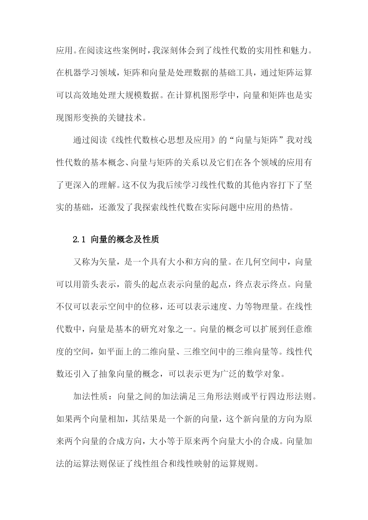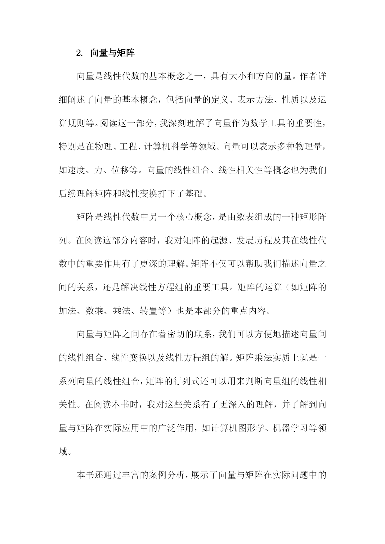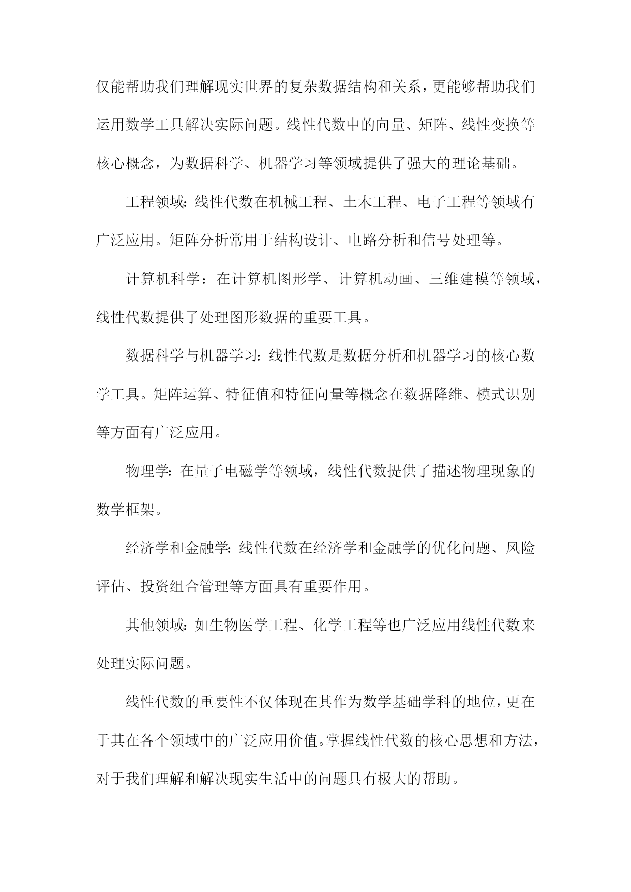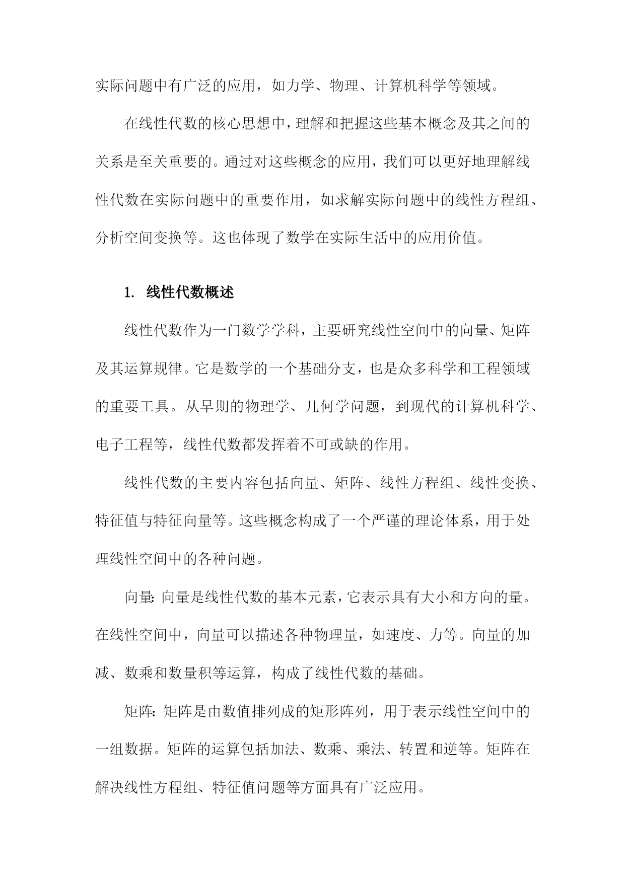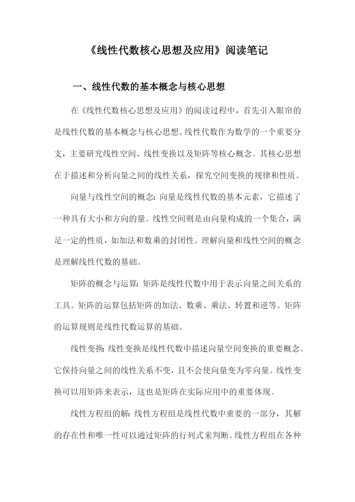 《线性代数核心思想及应用》阅读笔记一、线性代数的基本概念与核心思想在《线性代数核心思想及应用》的阅读过程中,首先引入眼帘的是线性代数的基本概念与核心思想。线性代数作为数学的一个重要分支,主要研究线性空间、线性变换以及矩阵等核心概念。其核心思想在于描述和分析向量之间的线性关系,探究空间变换的规律和性质。向量与线性空间的概念:向量是线性代数的基本元素,它描述了一种具有大小和方向的量。线性空间则是由向量构成的一个集合,满足一定的性质,如加法和数乘的封闭性。理解向量和线性空间的概念是理解线性代数的基础。矩阵的概念与运算:矩阵是线性代数中用于表示向量之间关系的工具。矩阵的运算包括矩阵的加法、数乘、乘法、转置和逆等。矩阵的运算规则是线性代数运算的基础。线性变换:线性变换是线性代数中描述向量空间变换的重要概念。它保持向量之间的线性关系不变,且不会使向量变为零向量。线性变换可以用矩阵来表示,这也是矩阵在实际应用中的重要体现。线性方程组的解:线性方程组是线性代数中重要的一部分,其解的存在性和唯一性可以通过矩阵的行列式来判断。线性方程组在各种实际问题中有广泛的应用,如力学、物理、计算机科学等领域。在线性代数的核心思想中,理解和把握这些基本概念及其之间的关系是至关重要的。通过对这些概念的应用,我们可以更好地理解线性代数在实际问题中的重要作用,如求解实际问题中的线性方程组、分析空间变换等。这也体现了数学在实际生活中的应用价值。1.线性代数概述线性代数作为一门数学学科,主要研究线性空间中的向量、矩阵及其运算规律。它是数学的一个基础分支,也是众多科学和工程领域的重要工具。从早期的物理学、几何学问题,到现代的计算机科学、电子工程等,线性代数都发挥着不可或缺的作用。线性代数的主要内容包括向量、矩阵、线性方程组、线性变换、特征值与特征向量等。这些概念构成了一个严谨的理论体系,用于处理线性空间中的各种问题。向量:向量是线性代数的基本元素,它表示具有大小和方向的量。在线性空间中,向量可以描述各种物理量,如速度、力等。向量的加减、数乘和数量积等运算,构成了线性代数的基础。矩阵:矩阵是由数值排列成的矩形阵列,用于表示线性空间中的一组数据。矩阵的运算包括加法、数乘、乘法、转置和逆等。矩阵在解决线性方程组、特征值问题等方面具有广泛应用。线性代数在现代科学和工程领域有着广泛的应用,计算机科学中的图像处理、机器学习等;物理学中的力学、电磁学等;工程领域的控制系统、电路分析等,都离不开线性代数的支持。掌握线性代数的思想和方法,对于解决实际问题具有重要意义。本章对线性代数的基本概念进行了介绍,包括其定义、背景、基本构成以及应用领域等。通过本章的学习,我们对线性代数有了初步的了解,为后续深入学习打下了基础。在接下来的章节中,我们将详细介绍向量、矩阵等核心概念及其运算规律,以及它们在各个领域的应用。1.1定义与发展历程线性代数是一门研究线性空间、线性变换及其性质的基础学科。其主要内容包括矩阵理论、向量空间、线性变换、特征值与特征向量等核心概念。线性代数的主要研究对象是向量和矩阵,以及它们之间的运算和变换。线性代数的基本思想是通过线性组合和线性变换,研究向量和矩阵的性质及其在各种领域的应用。线性代数的起源可以追溯到早期的数学研究中,其发展历程大致可以分为以下几个阶段:初创阶段:早期的线性代数研究主要关注解线性方程组的问题。这一时期的研究为线性代数的发展奠定了基础。矩阵理论的建立:随着数学的发展,矩阵理论逐渐建立起来。矩阵作为一种重要的数学工具,为线性代数的进一步发展提供了基础。向量空间与线性变换的研究:向量空间和线性变换的引入,使得线性代数的理论体系更加完善。这一时期的研究为线性代数的应用提供了广阔的空间。抽象化与现代发展:随着数学研究的深入,线性代数的抽象化程度越来越高。现代线性代数的研究已经涉及到各种领域,如量子力学、计算机科学等。在线性代数的发展过程中,许多数学家做出了重要贡献。高斯消元法、矩阵理论、行列式理论等都是线性代数的重要组成部分,这些理论的创立者包括高斯、凯莱、克莱布什等著名数学家。他们的研究成果为线性代数的发展奠定了坚实的基础,随着计算机科学的飞速发展,线性代数在计算科学中的应用也越来越广泛,成为计算机科学的重要基础之一。1.2线性代数的重要性及应用领域线性代数是数学的一门基础学科,也是许多高级数学课程和科学研究的核心组成部分。在现代社会,特别是在高科技、信息科技等不断蓬勃发展的今天,线性代数的重要性和应用价值愈发凸显。它不仅是一种基础工具,更是一种解决问题的思维方式。线性代数的学习不仅能帮助我们理解现实世界的复杂数据结构和关系,更能够帮助我们运用数学工具解决实际问题。线性代数中的向量、矩阵、线性变换等核心概念,为数据科