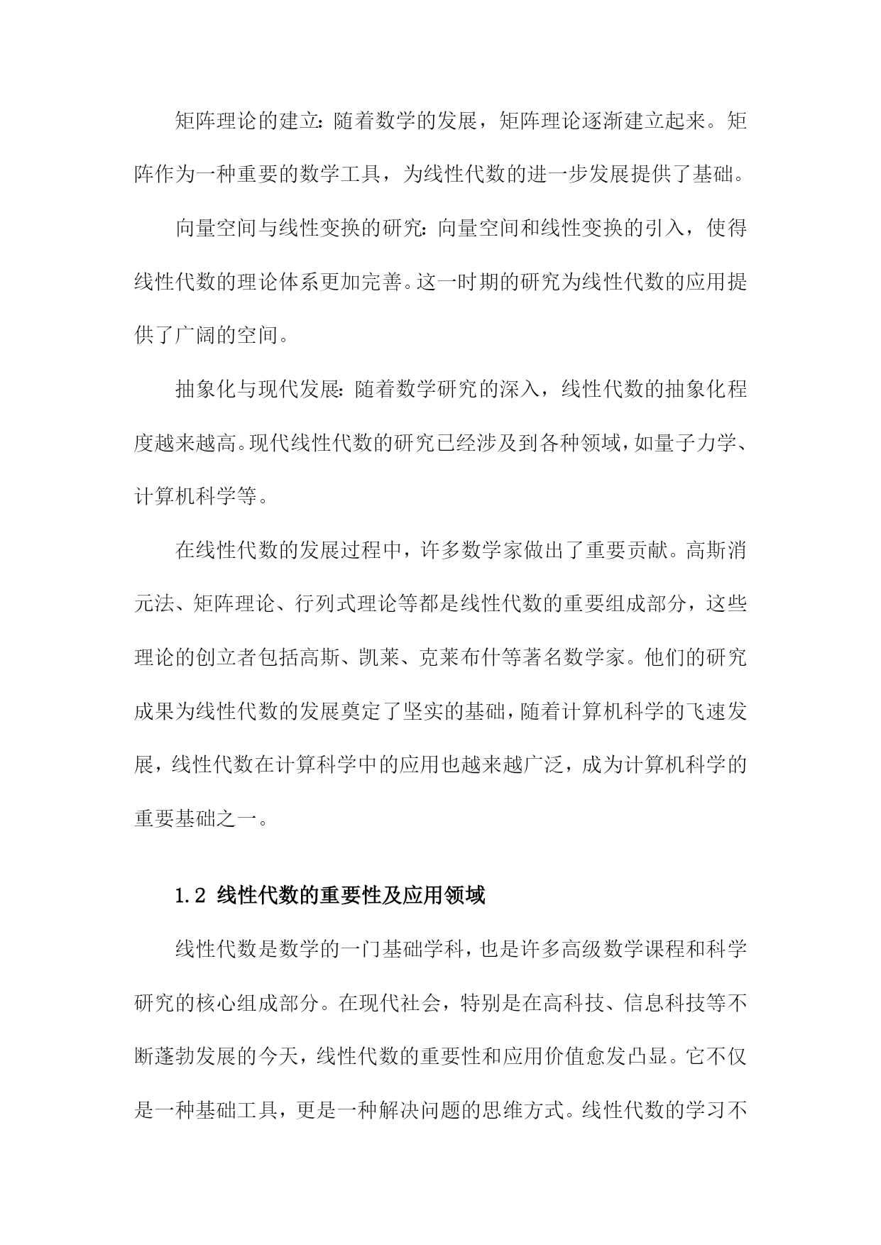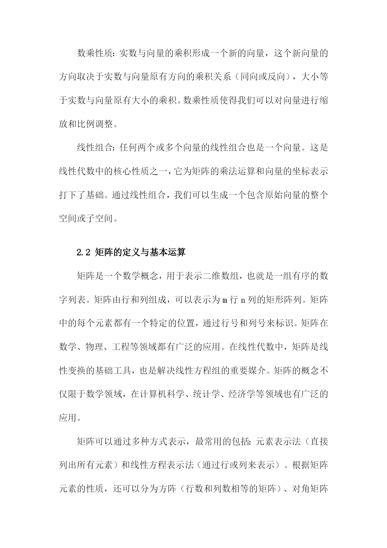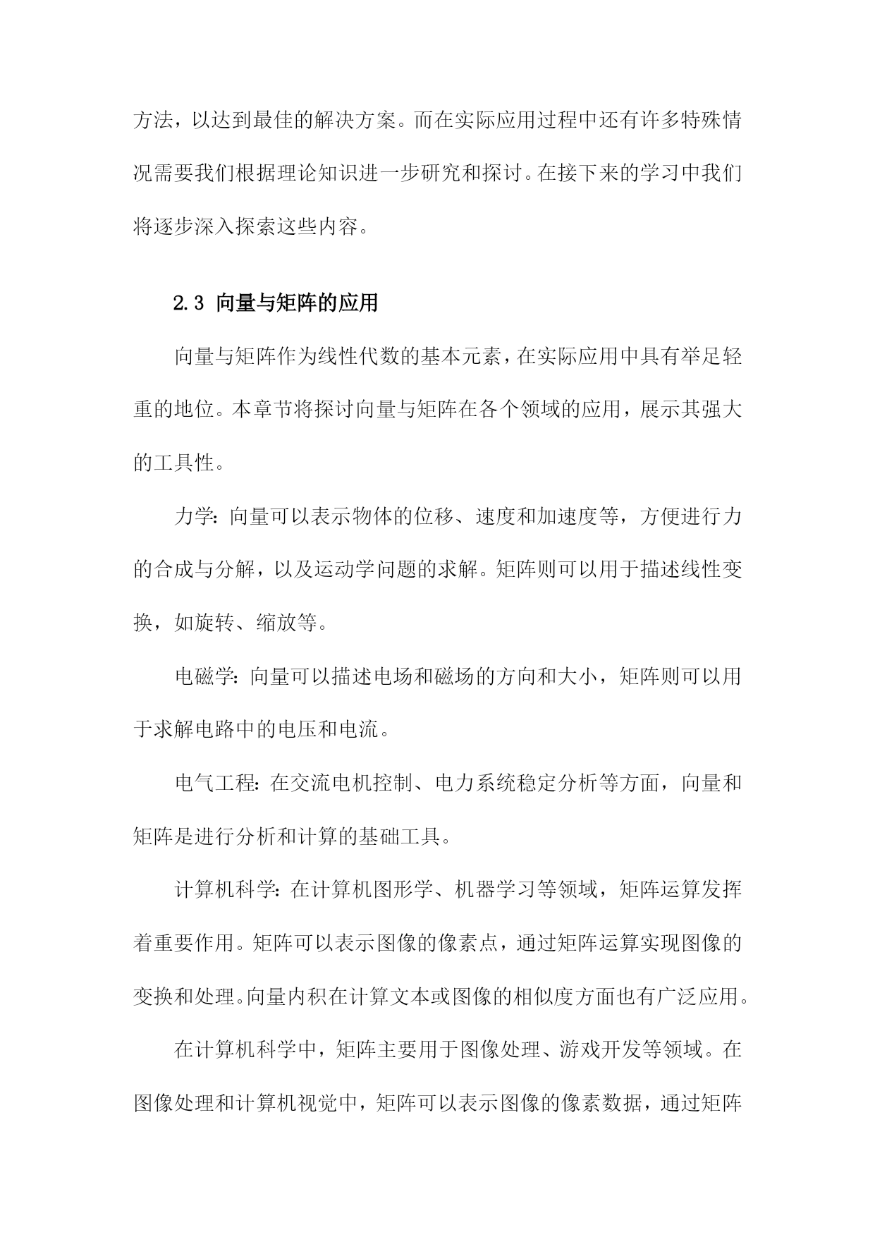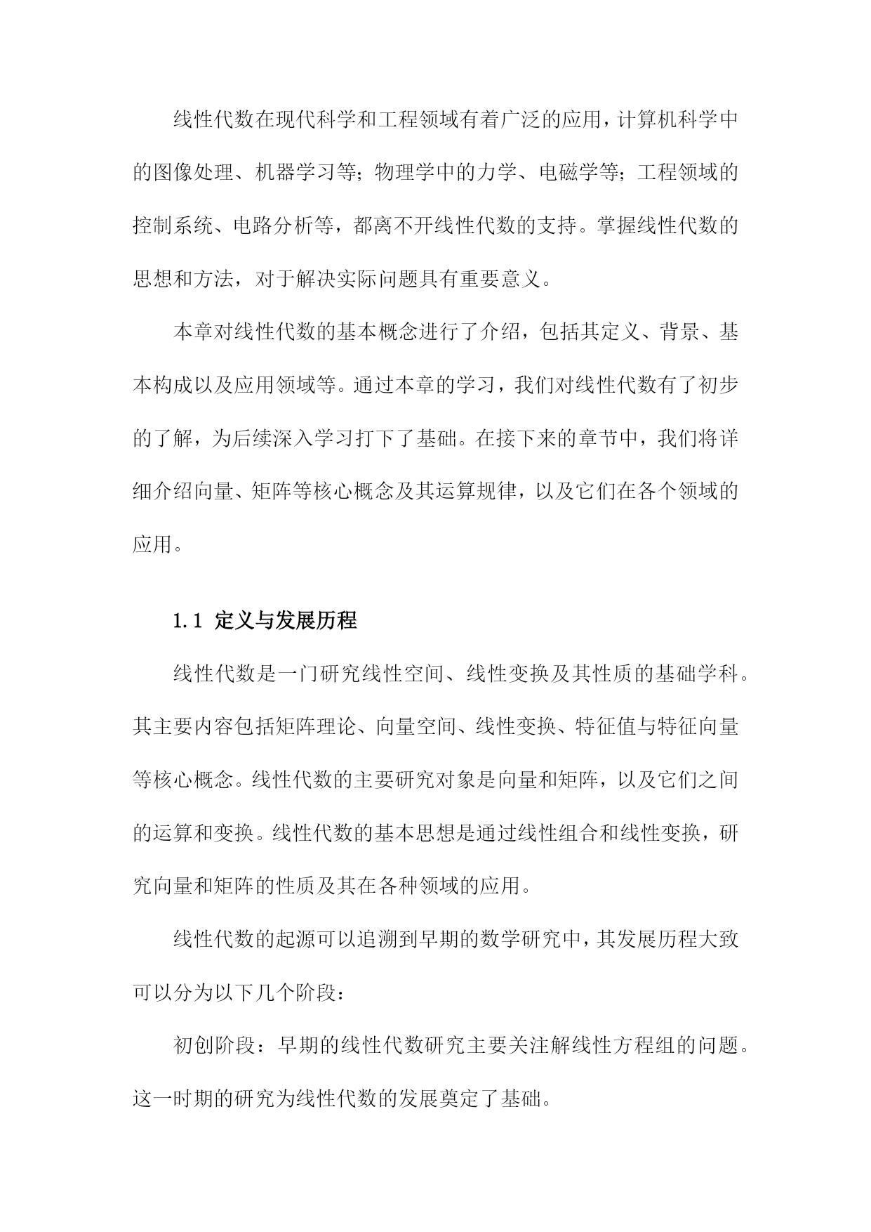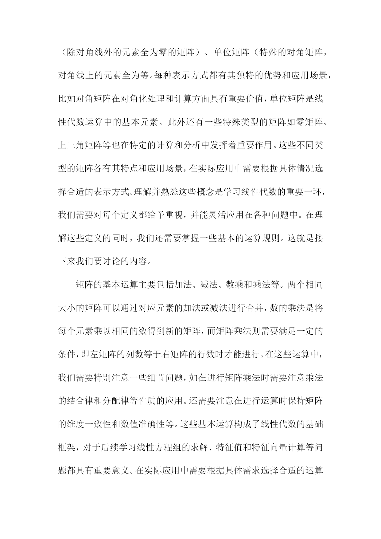 《线性代数核心思想及应用》阅读笔记一、线性代数的基本概念与核心思想在《线性代数核心思想及应用》的阅读过程中,首先引入眼帘的是线性代数的基本概念与核心思想。线性代数作为数学的一个重要分支,主要研究线性空间、线性变换以及矩阵等核心概念。其核心思想在于描述和分析向量之间的线性关系,探究空间变换的规律和性质。向量与线性空间的概念:向量是线性代数的基本元素,它描述了一种具有大小和方向的量。线性空间则是由向量构成的一个集合,满足一定的性质,如加法和数乘的封闭性。理解向量和线性空间的概念是理解线性代数的基础。矩阵的概念与运算:矩阵是线性代数中用于表示向量之间关系的工具。矩阵的运算包括矩阵的加法、数乘、乘法、转置和逆等。矩阵的运算规则是线性代数运算的基础。线性变换:线性变换是线性代数中描述向量空间变换的重要概念。它保持向量之间的线性关系不变,且不会使向量变为零向量。线性变换可以用矩阵来表示,这也是矩阵在实际应用中的重要体现。线性方程组的解:线性方程组是线性代数中重要的一部分,其解的存在性和唯一性可以通过矩阵的行列式来判断。线性方程组在各种实际问题中有广泛的应用,如力学、物理、计算机科学等领域。在线性代数的核心思想中,理解和把握这些基本概念及其之间的关系是至关重要的。通过对这些概念的应用,我们可以更好地理解线性代数在实际问题中的重要作用,如求解实际问题中的线性方程组、分析空间变换等。这也体现了数学在实际生活中的应用价值。1.线性代数概述线性代数作为一门数学学科,主要研究线性空间中的向量、矩阵及其运算规律。它是数学的一个基础分支,也是众多科学和工程领域的重要工具。从早期的物理学、几何学问题,到现代的计算机科学、电子工程等,线性代数都发挥着不可或缺的作用。线性代数的主要内容包括向量、矩阵、线性方程组、线性变换、特征值与特征向量等。这些概念构成了一个严谨的理论体系,用于处理线性空间中的各种问题。向量:向量是线性代数的基本元素,它表示具有大小和方向的量。在线性空间中,向量可以描述各种物理量,如速度、力等。向量的加减、数乘和数量积等运算,构成了线性代数的基础。矩阵:矩阵是由数值排列成的矩形阵列,用于表示线性空间中的一组数据。矩阵的运算包括加法、数乘、乘法、转置和逆等。矩阵在解决线性方程组、特征值问题等方面具有广泛应用。线性代数在现代科学和工程领域有着广泛的应用,计算机科学中的图像处理、机器学习等;物理学中的力学、电磁学等;工程领域的控制系统、电路分析等,都离不开线性代数的支持。掌握线性代数的思想和方法,对于解决实际问题具有重要意义。本章对线性代数的基本概念进行了介绍,包括其定义、背景、基本构成以及应用领域等。通过本章的学习,我们对线性代数有了初步的了解,为后续深入学习打下了基础。在接下来的章节中,我们将详细介绍向量、矩阵等核心概念及其运算规律,以及它们在各个领域的应用。1.1定义与发展历程线性代数是一门研究线性空间、线性变换及其性质的基础学科。其主要内容包括矩阵理论、向量空间、线性变换、特征值与特征向量等核心概念。线性代数的主要研究对象是向量和矩阵,以及它们之间的运算和变换。线性代数的基本思想是通过线性组合和线性变换,研究向量和矩阵的性质及其在各种领域的应用。线性代数的起源可以追溯到早期的数学研究中,其发展历程大致可以分为以下几个阶段:初创阶段:早期的线性代数研究主要关注解线性方程组的问题。这一时期的研究为线性代数的发展奠定了基础。矩阵理论的建立:随着数学的发展,矩阵理论逐渐建立起来。矩阵作为一种重要的数学工具,为线性代数的进一步发展提供了基础。向量空间与线性变换的研究:向量空间和线性变换的引入,使得线性代数的理论体系更加完善。这一时期的研究为线性代数的应用提供了广阔的空间。抽象化与现代发展:随着数学研究的深入,线性代数的抽象化程度越来越高。现代线性代数的研究已经涉及到各种领域,如量子力学、计算机科学等。在线性代数的发展过程中,许多数学家做出了重要贡献。高斯消元法、矩阵理论、行列式理论等都是线性代数的重要组成部分,这些理论的创立者包括高斯、凯莱、克莱布什等著名数学家。他们的研究成果为线性代数的发展奠定了坚实的基础,随着计算机科学的飞速发展,线性代数在计算科学中的应用也越来越广泛,成为计算机科学的重要基础之一。1.2线性代数的重要性及应用领域线性代数是数学的一门基础学科,也是许多高级数学课程和科学研究的核心组成部分。在现代社会,特别是在高科技、信息科技等不断蓬勃发展的今天,线性代数的重要性和应用价值愈发凸显。它不仅是一种基础工具,更是一种解决问题的思维方式。线性代数的学习不仅能帮助我们理解现实世界的复杂数据结构和关系,更能够帮助我们运用数学工具解决实际问题。线性代数中的向量、矩阵、线性变换等核心概念,为数据科