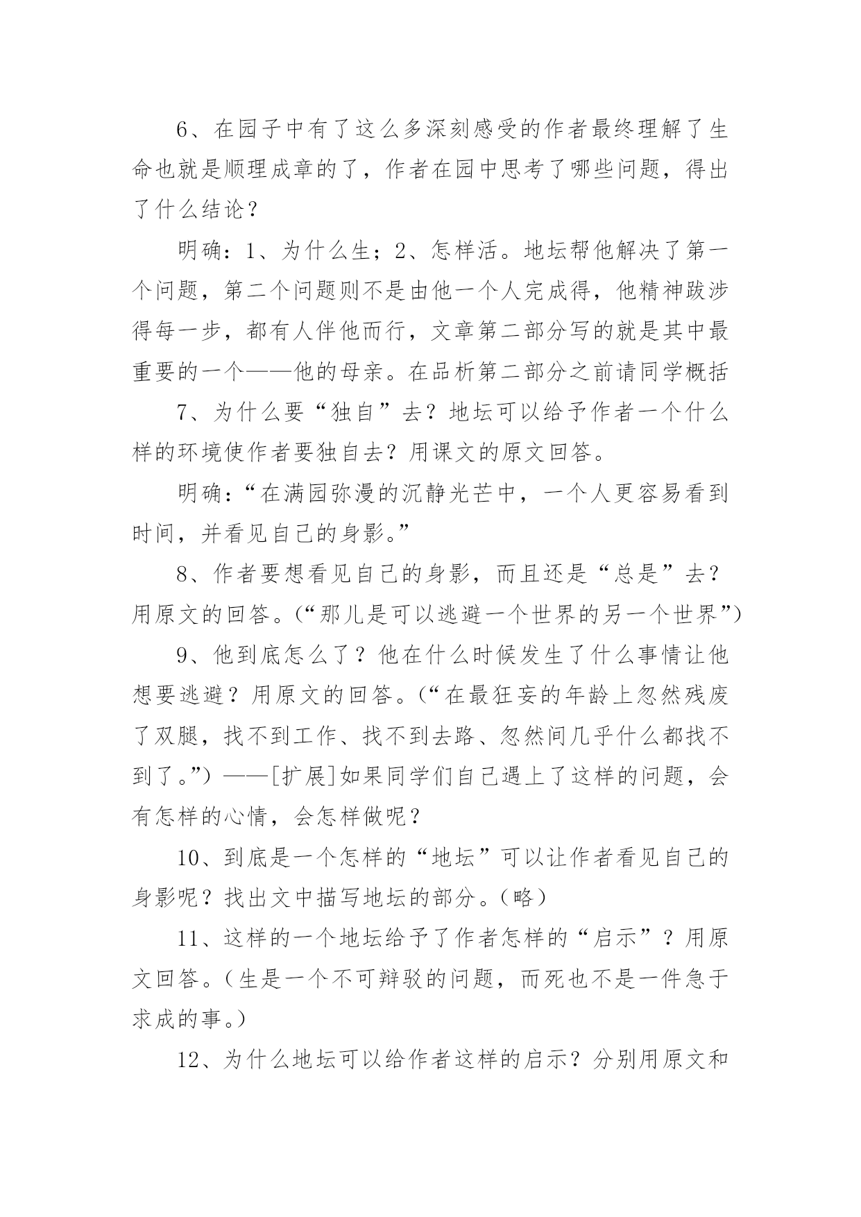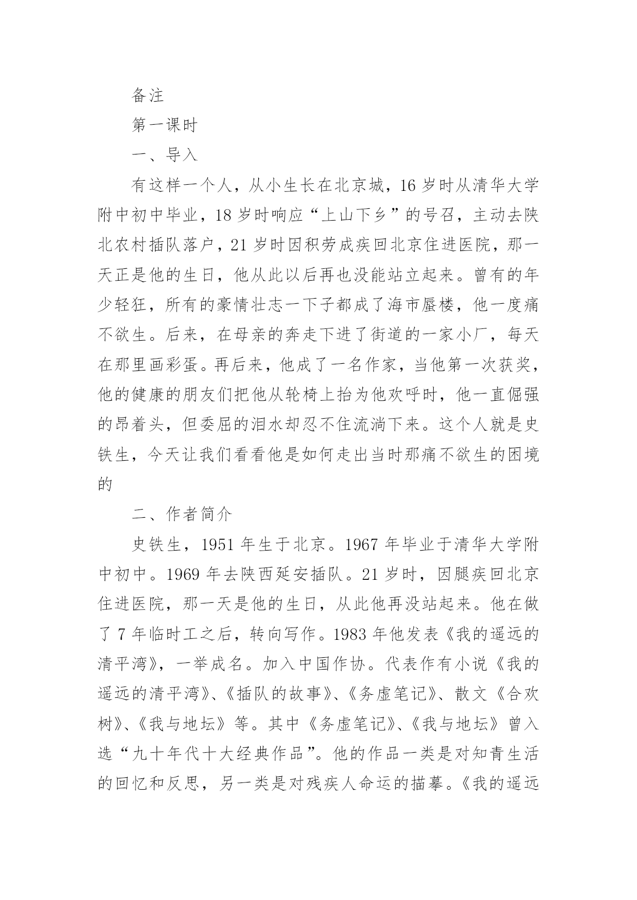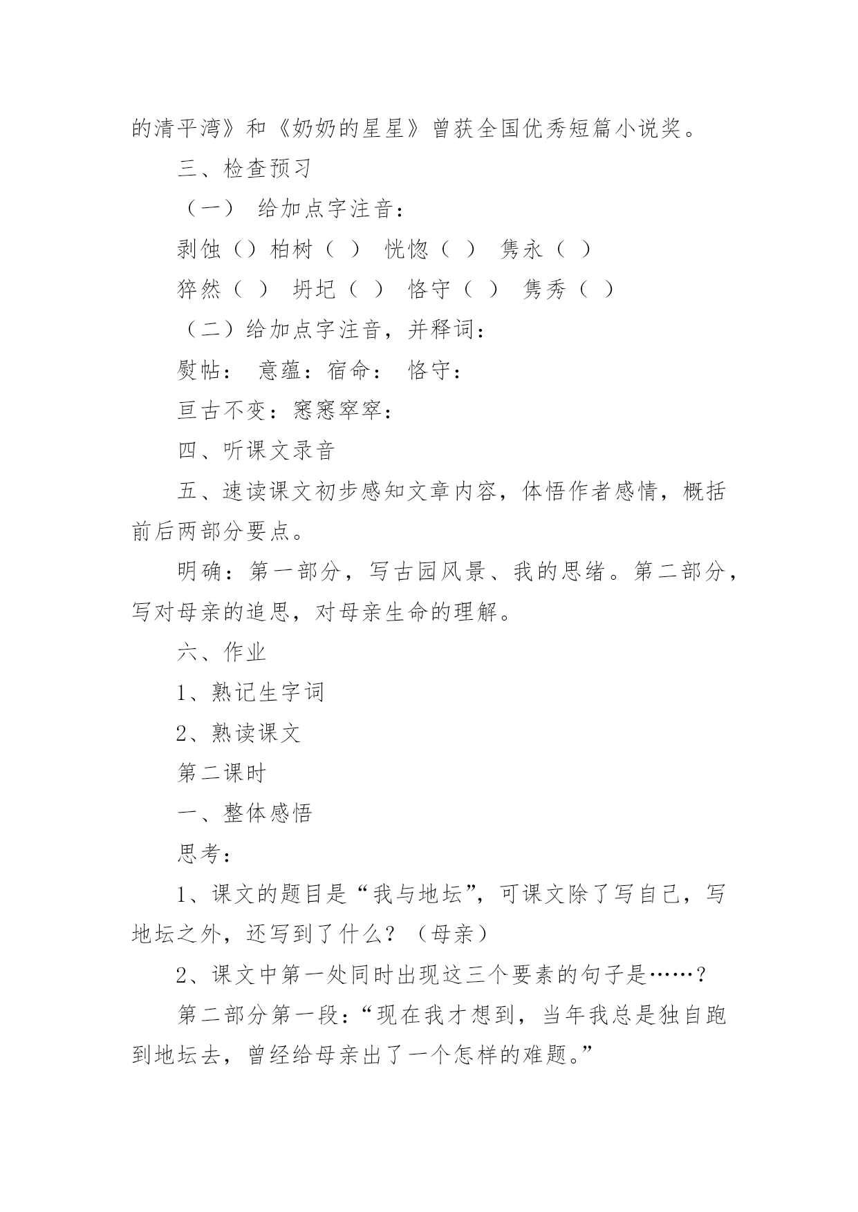 我与地坛教学设计苏教版我与地坛教学设计苏教版我与地坛教学设计教学重点1.品味文章深沉绵密的语言特色。2.领会作家对“生命”的感悟教学难点1.理解、体味史铁生对“生命”的感悟2.体悟作者对母亲深挚的感情并感受到伟大而深切的母爱教学目标知识和能力1.欣赏作者笔下地坛宁静肃穆、生机盎然的美,体味史铁生对“生命”的感悟。2.体味母爱的深沉伟大,理解命运的造就也就决定了角色的分配和承担的方式。过程和方法1.理清文章思路和结构。2.反复诵读文章、讨论与指导相结合情感态度和价值观1.理解、体味史铁生对生命以及其苦难的感悟。2、学会感受母爱、理解母爱教学过程备注第一课时一、导入有这样一个人,从小生长在北京城,16岁时从清华大学附中初中毕业,18岁时响应“上山下乡”的号召,主动去陕北农村插队落户,21岁时因积劳成疾回北京住进医院,那一天正是他的生日,他从此以后再也没能站立起来。曾有的年少轻狂,所有的豪情壮志一下子都成了海市蜃楼,他一度痛不欲生。后来,在母亲的奔走下进了街道的一家小厂,每天在那里画彩蛋。再后来,他成了一名作家,当他第一次获奖,他的健康的朋友们把他从轮椅上抬为他欢呼时,他一直倔强的昂着头,但委屈的泪水却忍不住流淌下来。这个人就是史铁生,今天让我们看看他是如何走出当时那痛不欲生的困境的二、作者简介史铁生,1951年生于北京。1967年毕业于清华大学附中初中。1969年去陕西延安插队。21岁时,因腿疾回北京住进医院,那一天是他的生日,从此他再没站起来。他在做了7年临时工之后,转向写作。1983年他发表《我的遥远的清平湾》,一举成名。加入中国作协。代表作有小说《我的遥远的清平湾》、《插队的故事》、《务虚笔记》、散文《合欢树》、《我与地坛》等。其中《务虚笔记》、《我与地坛》曾入选“九十年代十大经典作品”。他的作品一类是对知青生活的回忆和反思,另一类是对残疾人命运的描摹。《我的遥远的清平湾》和《奶奶的星星》曾获全国优秀短篇小说奖。三、检查预习(一)给加点字注音:剥蚀()柏树()恍惚()隽永()猝然()坍圮()恪守()隽秀()(二)给加点字注音,并释词:熨帖:意蕴:宿命:恪守:亘古不变:窸窸窣窣:四、听课文录音五、速读课文初步感知文章内容,体悟作者感情,概括前后两部分要点。明确:第一部分,写古园风景、我的思绪。第二部分,写对母亲的追思,对母亲生命的理解。六、作业1、熟记生字词2、熟读课文第二课时一、整体感悟思考:1、课文的题目是“我与地坛”,可课文除了写自己,写地坛之外,还写到了什么?(母亲)2、课文中第一处同时出现这三个要素的句子是……?第二部分第一段:“现在我才想到,当年我总是独自跑到地坛去,曾经给母亲出了一个怎样的难题。”3、抽象概括贯穿全文的思路是什么?明确:全文的总体思路是:追寻,解答。前半部分是追寻,后半部分是解答。二、学习课文第一部分(一)阅读第一部分回答1、作者来到古园,说:这古园仿佛就是为了等我,而历尽沧桑在那儿等待了四百多年。为什么这么说?(我对古园的深情,古园对我的意义)2、“这时候想必我是该来了”――“这时候”指什么时候?为什么此时才是我该来的时候?(地坛褪去昔日的荣耀,尽显沧桑时,一下子失魂落魄的我来了,与它相怜相惜)3、“我一下子理解了它的意图”,这“意图”指什么?明确:生命的暗示4、“理解了地坛的意图”的作者眼中的地坛有什么样的特点?明确:荒芜并不衰败。“蜂儿、蝉蜕、蚂蚁、瓢虫、露水”全都是弱小的意象,课都在按照自己的方式和自然的法则生存着,这显然也给了作者以启示,为了逃避来到这园子的作者是真真实实感受到了生命的涌动的。5、课文中象这样蕴涵着对生命理解的景物描写还有什么地方?如何理解?明确:六个譬如。肆意雕琢不能改变身体残疾精神不变6、在园子中有了这么多深刻感受的作者最终理解了生命也就是顺理成章的了,作者在园中思考了哪些问题,得出了什么结论?明确:1、为什么生;2、怎样活。地坛帮他解决了第一个问题,第二个问题则不是由他一个人完成得,他精神跋涉得每一步,都有人伴他而行,文章第二部分写的就是其中最重要的一个——他的母亲。在品析第二部分之前请同学概括7、为什么要“独自”去?地坛可以给予作者一个什么样的环境使作者要独自去?用课文的原文回答。明确:“在满园弥漫的沉静光芒中,一个人更容易看到时间,并看见自己的身影。”8、作者要想看见自己的身影,而且还是“总是”去?用原文的回答。(“那儿是可以逃避一个世界的另一个世界”)9、他到底怎么了?他在什么时候发生了什么事情让他想要逃避?用原文的回答。(“在最狂妄的年龄上忽然残废了双腿,找不到工作、找不到去路、忽然间几乎什么都找不到了。”)——[扩展]如果同学们自己遇上了这样的问题,会有怎样的心情,会怎样做呢?10、到底是一个怎样的“地坛”可以让作者看见自己的身影呢?找出文中描写地坛的