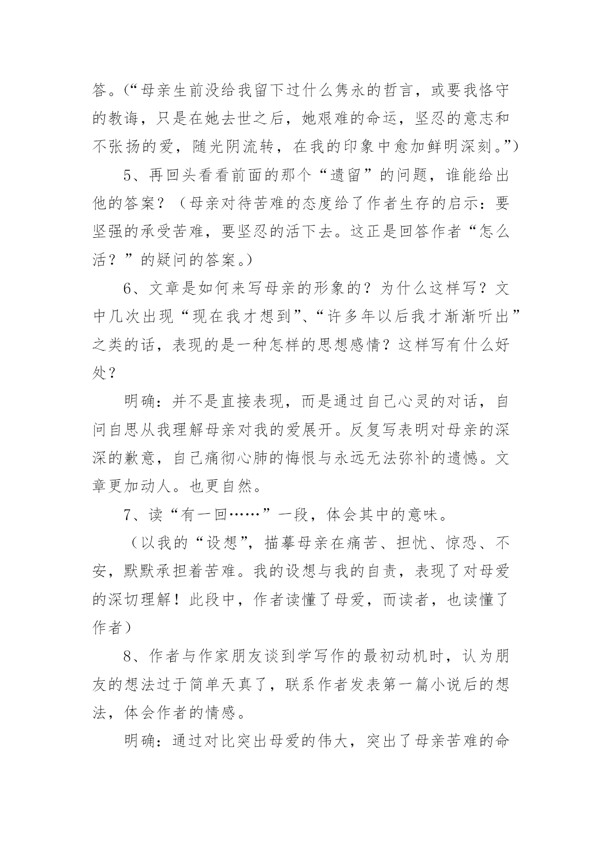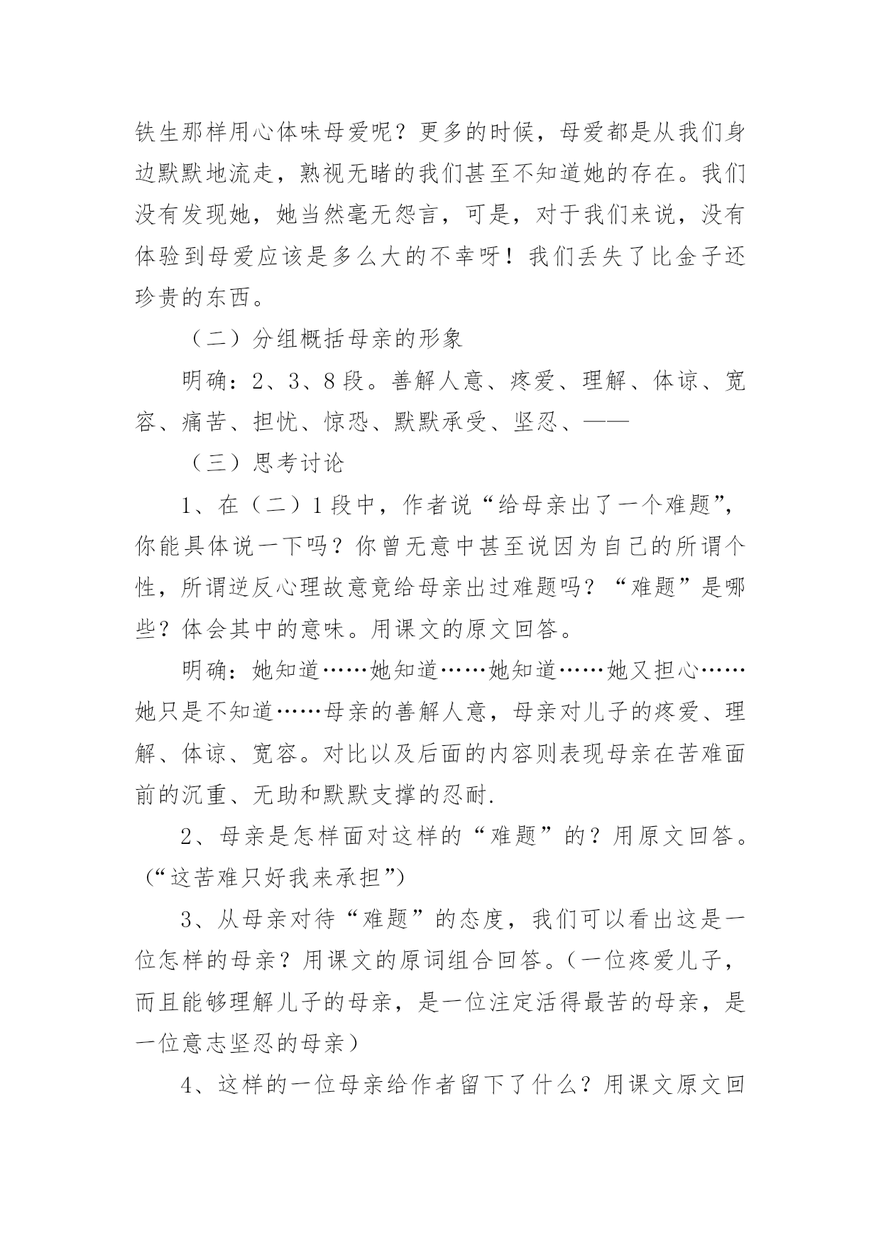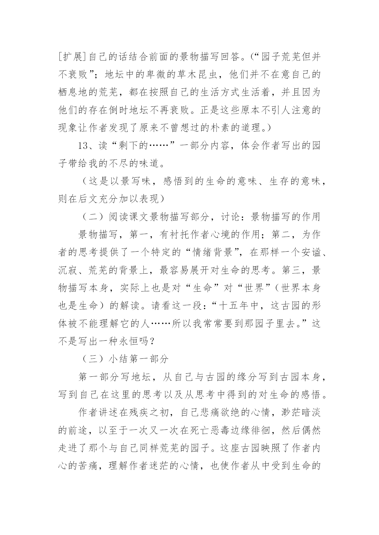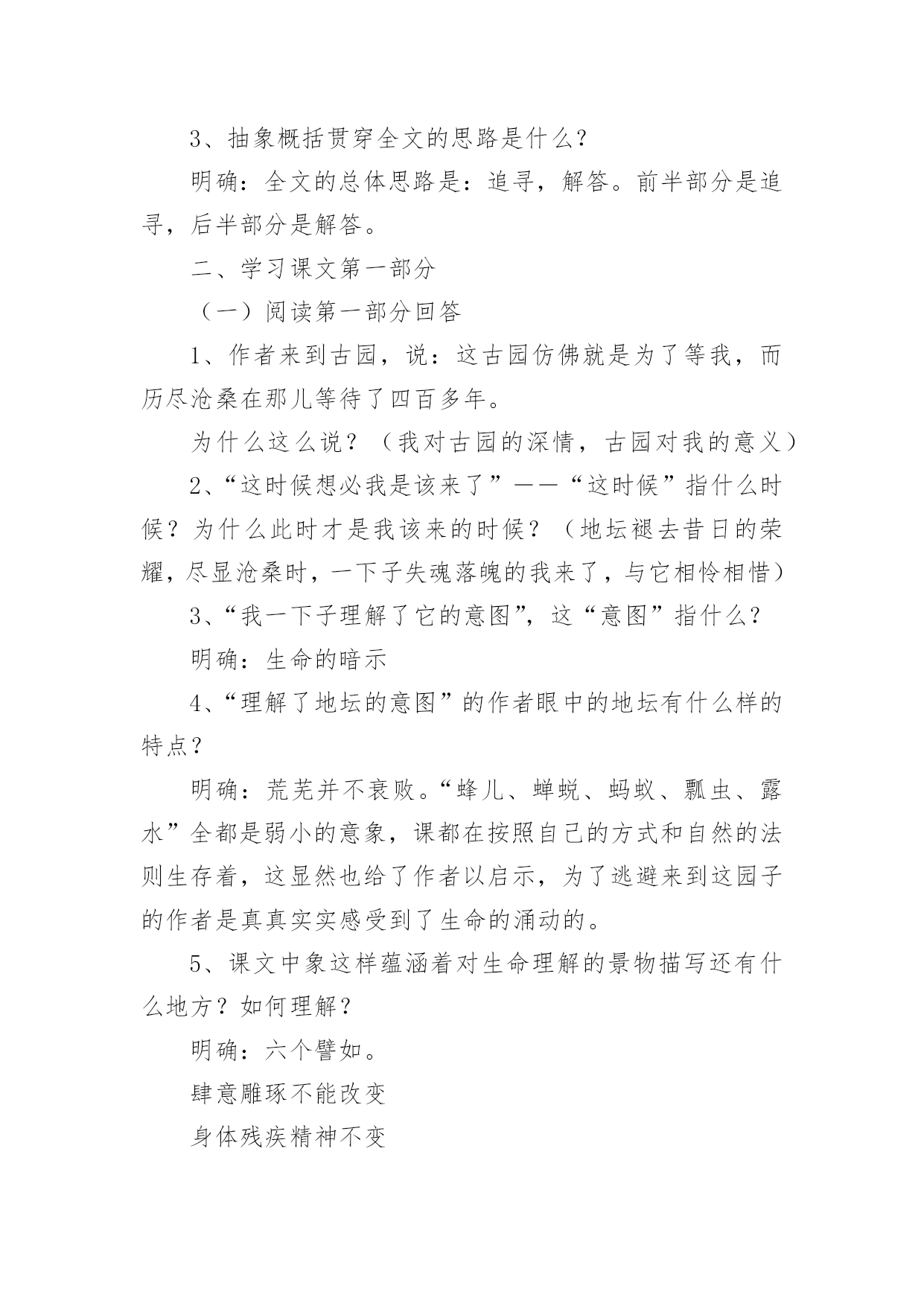 我与地坛教学设计苏教版我与地坛教学设计苏教版我与地坛教学设计教学重点1.品味文章深沉绵密的语言特色。2.领会作家对“生命”的感悟教学难点1.理解、体味史铁生对“生命”的感悟2.体悟作者对母亲深挚的感情并感受到伟大而深切的母爱教学目标知识和能力1.欣赏作者笔下地坛宁静肃穆、生机盎然的美,体味史铁生对“生命”的感悟。2.体味母爱的深沉伟大,理解命运的造就也就决定了角色的分配和承担的方式。过程和方法1.理清文章思路和结构。2.反复诵读文章、讨论与指导相结合情感态度和价值观1.理解、体味史铁生对生命以及其苦难的感悟。2、学会感受母爱、理解母爱教学过程备注第一课时一、导入有这样一个人,从小生长在北京城,16岁时从清华大学附中初中毕业,18岁时响应“上山下乡”的号召,主动去陕北农村插队落户,21岁时因积劳成疾回北京住进医院,那一天正是他的生日,他从此以后再也没能站立起来。曾有的年少轻狂,所有的豪情壮志一下子都成了海市蜃楼,他一度痛不欲生。后来,在母亲的奔走下进了街道的一家小厂,每天在那里画彩蛋。再后来,他成了一名作家,当他第一次获奖,他的健康的朋友们把他从轮椅上抬为他欢呼时,他一直倔强的昂着头,但委屈的泪水却忍不住流淌下来。这个人就是史铁生,今天让我们看看他是如何走出当时那痛不欲生的困境的二、作者简介史铁生,1951年生于北京。1967年毕业于清华大学附中初中。1969年去陕西延安插队。21岁时,因腿疾回北京住进医院,那一天是他的生日,从此他再没站起来。他在做了7年临时工之后,转向写作。1983年他发表《我的遥远的清平湾》,一举成名。加入中国作协。代表作有小说《我的遥远的清平湾》、《插队的故事》、《务虚笔记》、散文《合欢树》、《我与地坛》等。其中《务虚笔记》、《我与地坛》曾入选“九十年代十大经典作品”。他的作品一类是对知青生活的回忆和反思,另一类是对残疾人命运的描摹。《我的遥远的清平湾》和《奶奶的星星》曾获全国优秀短篇小说奖。三、检查预习(一)给加点字注音:剥蚀()柏树()恍惚()隽永()猝然()坍圮()恪守()隽秀()(二)给加点字注音,并释词:熨帖:意蕴:宿命:恪守:亘古不变:窸窸窣窣:四、听课文录音五、速读课文初步感知文章内容,体悟作者感情,概括前后两部分要点。明确:第一部分,写古园风景、我的思绪。第二部分,写对母亲的追思,对母亲生命的理解。六、作业1、熟记生字词2、熟读课文第二课时一、整体感悟思考:1、课文的题目是“我与地坛”,可课文除了写自己,写地坛之外,还写到了什么?(母亲)2、课文中第一处同时出现这三个要素的句子是……?第二部分第一段:“现在我才想到,当年我总是独自跑到地坛去,曾经给母亲出了一个怎样的难题。”3、抽象概括贯穿全文的思路是什么?明确:全文的总体思路是:追寻,解答。前半部分是追寻,后半部分是解答。二、学习课文第一部分(一)阅读第一部分回答1、作者来到古园,说:这古园仿佛就是为了等我,而历尽沧桑在那儿等待了四百多年。为什么这么说?(我对古园的深情,古园对我的意义)2、“这时候想必我是该来了”――“这时候”指什么时候?为什么此时才是我该来的时候?(地坛褪去昔日的荣耀,尽显沧桑时,一下子失魂落魄的我来了,与它相怜相惜)3、“我一下子理解了它的意图”,这“意图”指什么?明确:生命的暗示4、“理解了地坛的意图”的作者眼中的地坛有什么样的特点?明确:荒芜并不衰败。“蜂儿、蝉蜕、蚂蚁、瓢虫、露水”全都是弱小的意象,课都在按照自己的方式和自然的法则生存着,这显然也给了作者以启示,为了逃避来到这园子的作者是真真实实感受到了生命的涌动的。5、课文中象这样蕴涵着对生命理解的景物描写还有什么地方?如何理解?明确:六个譬如。肆意雕琢不能改变身体残疾精神不变6、在园子中有了这么多深刻感受的作者最终理解了生命也就是顺理成章的了,作者在园中思考了哪些问题,得出了什么结论?明确:1、为什么生;2、怎样活。地坛帮他解决了第一个问题,第二个问题则不是由他一个人完成得,他精神跋涉得每一步,都有人伴他而行,文章第二部分写的就是其中最重要的一个——他的母亲。在品析第二部分之前请同学概括7、为什么要“独自”去?地坛可以给予作者一个什么样的环境使作者要独自去?用课文的原文回答。明确:“在满园弥漫的沉静光芒中,一个人更容易看到时间,并看见自己的身影。”8、作者要想看见自己的身影,而且还是“总是”去?用原文的回答。(“那儿是可以逃避一个世界的另一个世界”)9、他到底怎么了?他在什么时候发生了什么事情让他想要逃避?用原文的回答。(“在最狂妄的年龄上忽然残废了双腿,找不到工作、找不到去路、忽然间几乎什么都找不到了。”)——[扩展]如果同学们自己遇上了这样的问题,会有怎样的心情,会怎样做呢?10、到底是一个怎样的“地坛”可以让作者看见自己的身影呢?找出文中描写地坛的