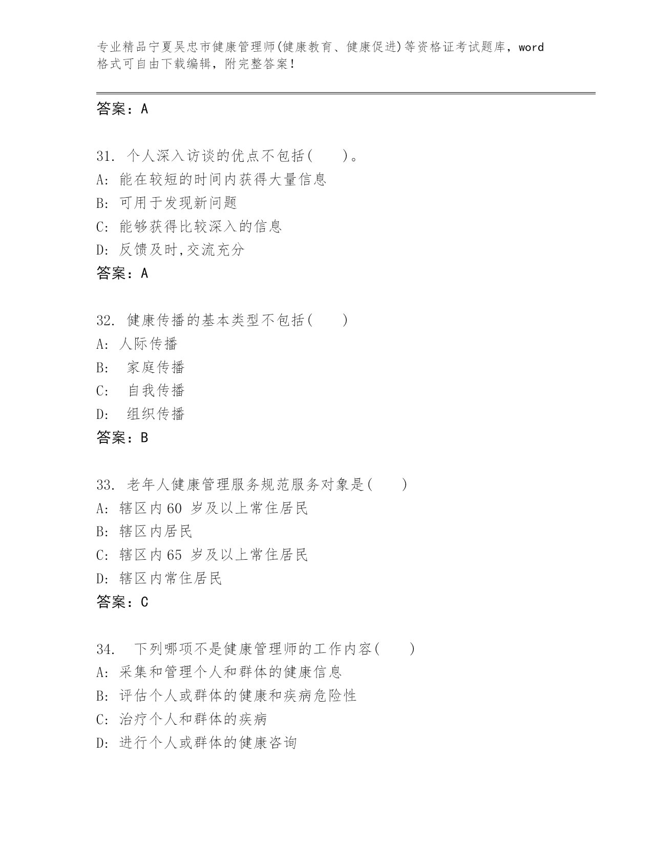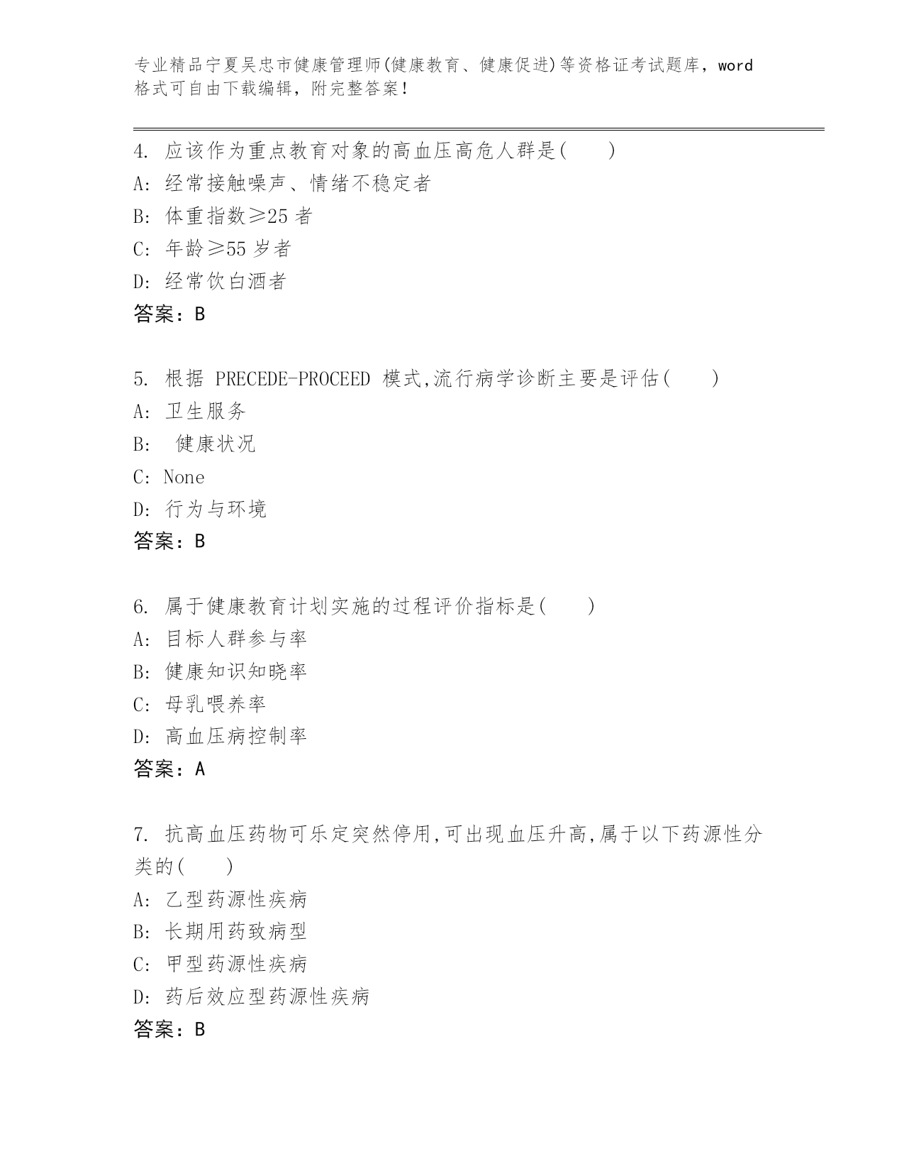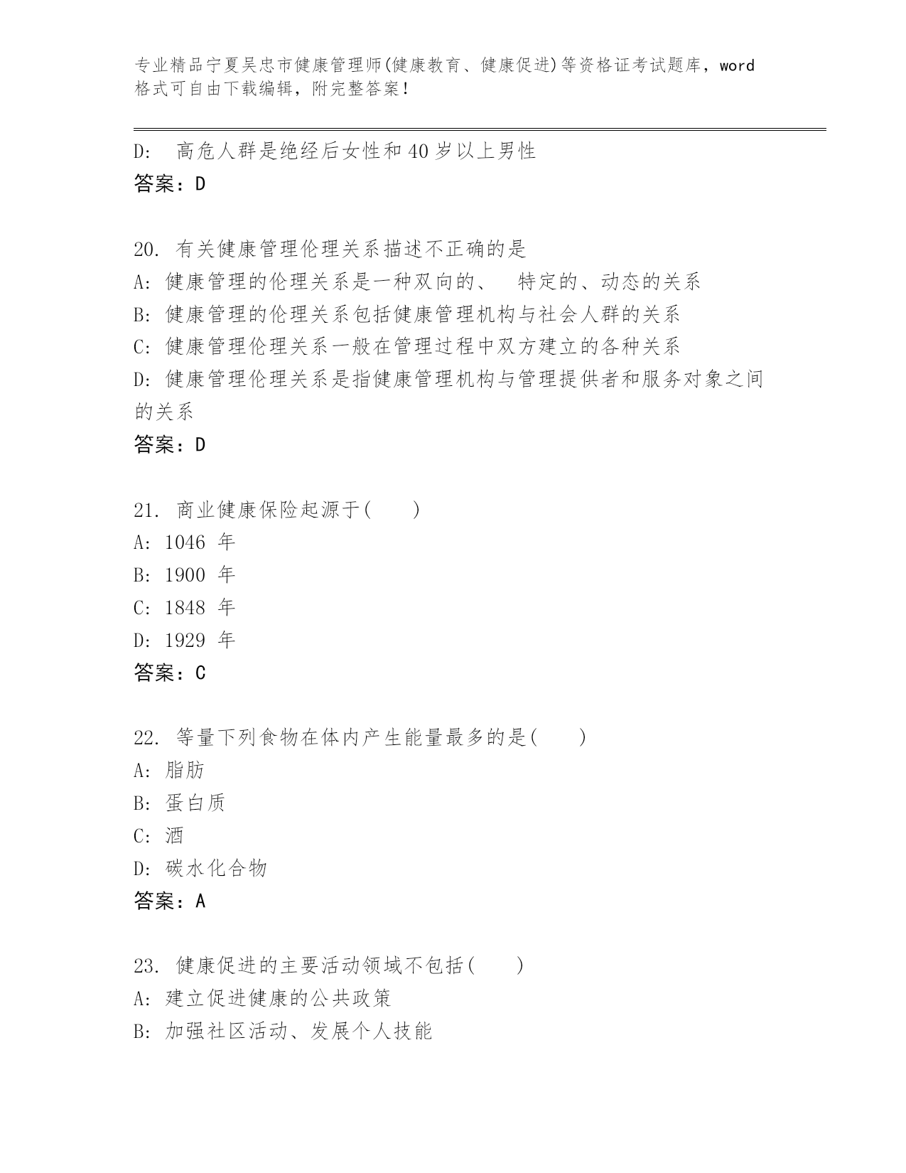 最新宁夏吴忠市健康管理师(健康教育、健康促进)等资格证考试内部题库(全优).docx