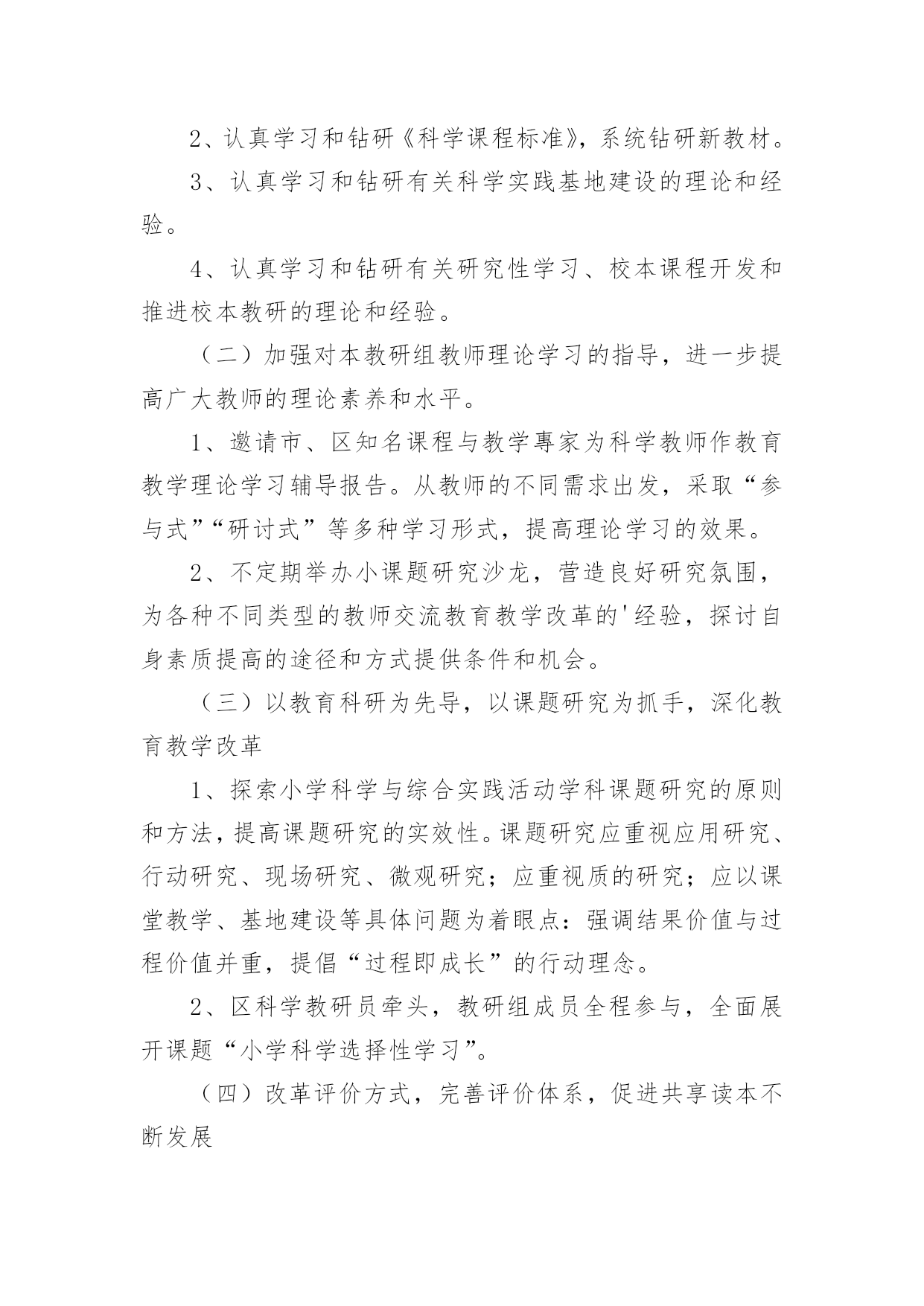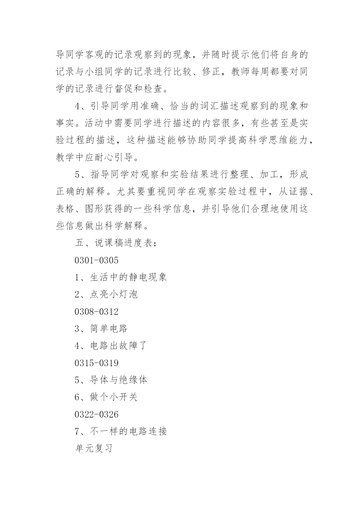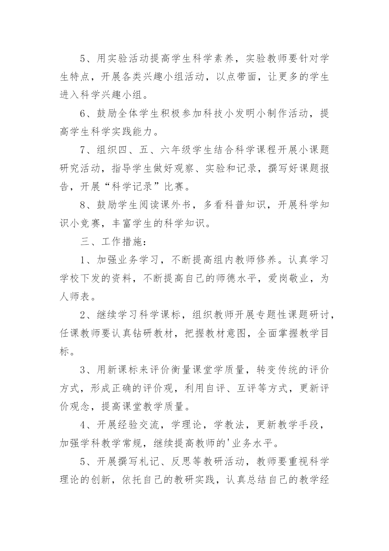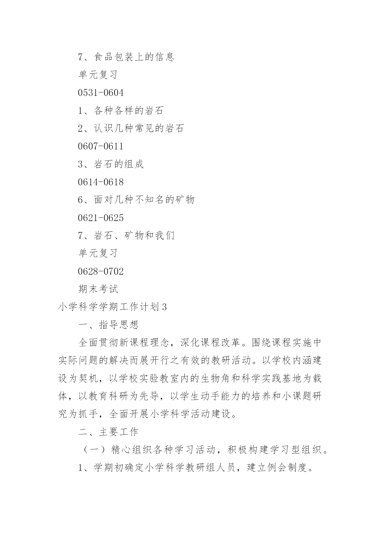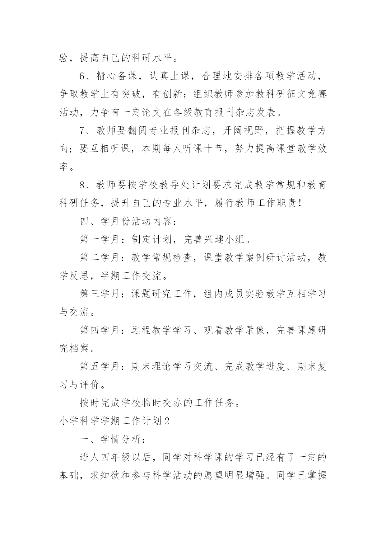 小学科学学期工作计划小学科学学期工作计划时间就如同白驹过隙般的流逝,我们的工作又将在忙碌中充实着,在喜悦中收获着,此时此刻需要制定一个详细的计划了。什么样的计划才是有效的呢?以下是小编整理的小学科学学期工作计划,希望能够帮助到大家。小学科学学期工作计划1一、指导思想:以学校工作计划为指导,全面贯彻教导处工作精神,更新教育观念,扎实做好科学实验教学工作,努力培养学科师资力量,积极开展教研活动,努力加强教学流程管理,提高课堂教学质量。以培养习惯、激发兴趣为目标,切实提高学生的科学素养,使教研活动成为提高教学质量的有效途径。二、工作目标:1、加强学习,推进课改实验成果,继续保持科学教学质量的领先地位。2、加强进修,提高教学业务水平,树优秀教师形象。3、纠正学生的偏科思想,转变只重视语、数、外观念,培养学生科学兴趣和科学素养,要学生像科学家一样重视科学学习,要学生有一定的科学创新能力。4、培养学生的创新实践能力,放手让学生自主探究、自主学习,让学生在交流中学习、在学习中积累经验。5、用实验活动提高学生科学素养,实验教师要针对学生特点,开展各类兴趣小组活动,以点带面,让更多的学生进入科学兴趣小组。6、鼓励全体学生积极参加科技小发明小制作活动,提高学生科学实践能力。7、组织四、五、六年级学生结合科学课程开展小课题研究活动,指导学生做好观察、实验和记录,撰写好课题报告,开展“科学记录”比赛。8、鼓励学生阅读课外书,多看科普知识,开展科学知识小竞赛,丰富学生的科学知识。三、工作措施:1、加强业务学习,不断提高组内教师修养。认真学习学校下发的资料,不断提高自己的师德水平,爱岗敬业,为人师表。2、继续学习科学课标,组织教师开展专题性课题研讨,任课教师要认真钻研教材,把握教材意图,全面掌握教学目标。3、用新课标来评价衡量课堂学质量,转变传统的评价方式,形成正确的评价观,利用自评、互评等方式,更新评价观念,提高课堂教学质量。4、开展经验交流,学理论,学教法,更新教学手段,加强学科教学常规,继续提高教师的'业务水平。5、开展撰写札记、反思等教研活动,教师要重视科学理论的创新,依托自己的教研实践,认真总结自己的教学经验,提高自己的科研水平。6、精心备课,认真上课,合理地安排各项教学活动,争取教学上有突破,有创新;组织教师参加教科研征文竞赛活动,力争有一定论文在各级教育报刊杂志发表。7、教师要翻阅专业报刊杂志,开阔视野,把握教学方向;要互相听课,本期每人听课十节,努力提高课堂教学效率。8、教师要按学校教导处计划要求完成教学常规和教育科研任务,提升自己的专业水平,履行教师工作职责!四、学月份活动内容:第一学月:制定计划,完善兴趣小组。第二学月:教学常规检查,课堂教学案例研讨活动,教学反思,半期工作交流。第三学月:课题研究工作,组内成员实验教学互相学习与交流。第四学月:远程教学学习、观看教学录像,完善课题研究档案。第五学月:期末理论学习交流、完成教学进度、期末复习与评价。按时完成学校临时交办的工作任务。小学科学学期工作计划2一、学情分析:进人四年级以后,同学对科学课的学习已经有了一定的基础,求知欲和参与科学活动的愿望明显增强。同学已掌握许多的科学知识和科学的方法,对科学探究活动非常喜欢,并能以自身的方式观察到许多细节的地方,兴趣浓厚,已经具备初步的探究能力,动手能力。另外,在进行着观察、提问、假说、预言、调查、解释和交流等一系列活动时,同学的合作意识和合作能力得到大大的增强。由于同学年龄的局限,观察的深度、准确度还不够,观察或描述的方法还不会实践运用。大局部同学知识面不广,勤于动脑的同学占的比例不是很大。还有的同学在活动的时候经常耗时低效,不能很好地利用珍贵的课堂时间,这现象尤为突出。因此,本学年是培养同学科学素养的至关重要的时期。教学中要因势利导,积极引导同学在学习中逐渐养成尊重客观事实、注重证据、大胆质疑的科学品质和思维方式,提高他们的生活质量和学习质量。二、教材分析:本册教科书有四个单元:“电”、“新的生命”、“食物”和“岩石和矿物”。本册教科书中的每个教学单元都有7个课题,这7个课题即是学习的内容,也反映了科学概念和过程与方法双向发展、螺旋上升的过程。一般每个教学内容为一个课时,但在具体教学中可对典型的过程和方法展开充沛探究,不以1课时为限制。第一单元“电”是从“什么是电”开始的。同学对静电有比较丰富的生活体验,让他们适当地了解一点有关电荷的知识,可以使后续课中电流、电路的学习更有基础。这一单元将通过与电相关内容的实验、交流、预测、检验、丈量和推理、解释等活动,使同学形成关于电的初步概念,同时获得一些基本实验操作技能。第二单元“新的'生命”单元是从“观察油菜花”引入的。由植物的花、果实和种子的系列观察活动,过渡到动物的卵、繁殖的观察和研究,从而使同