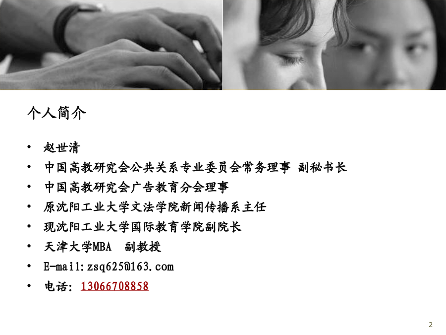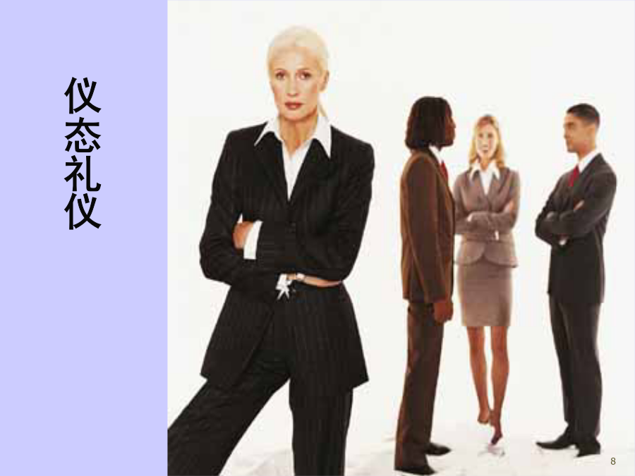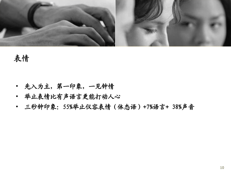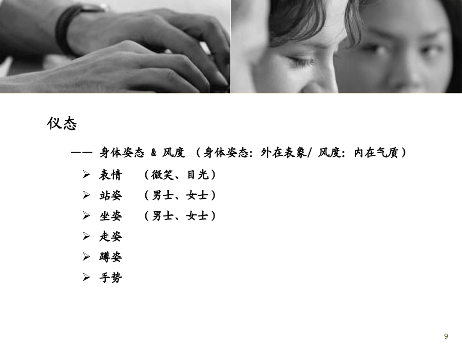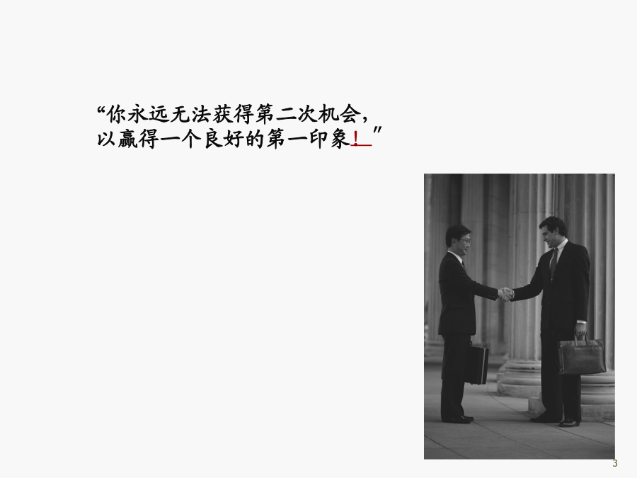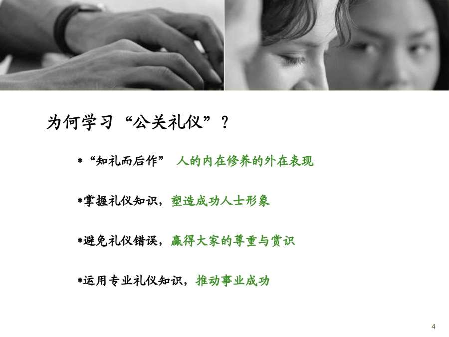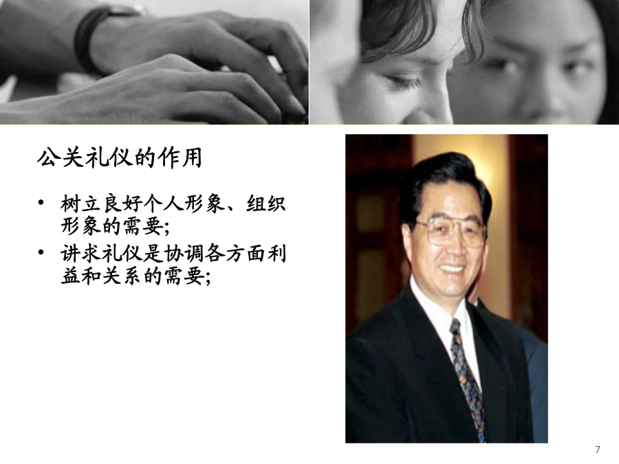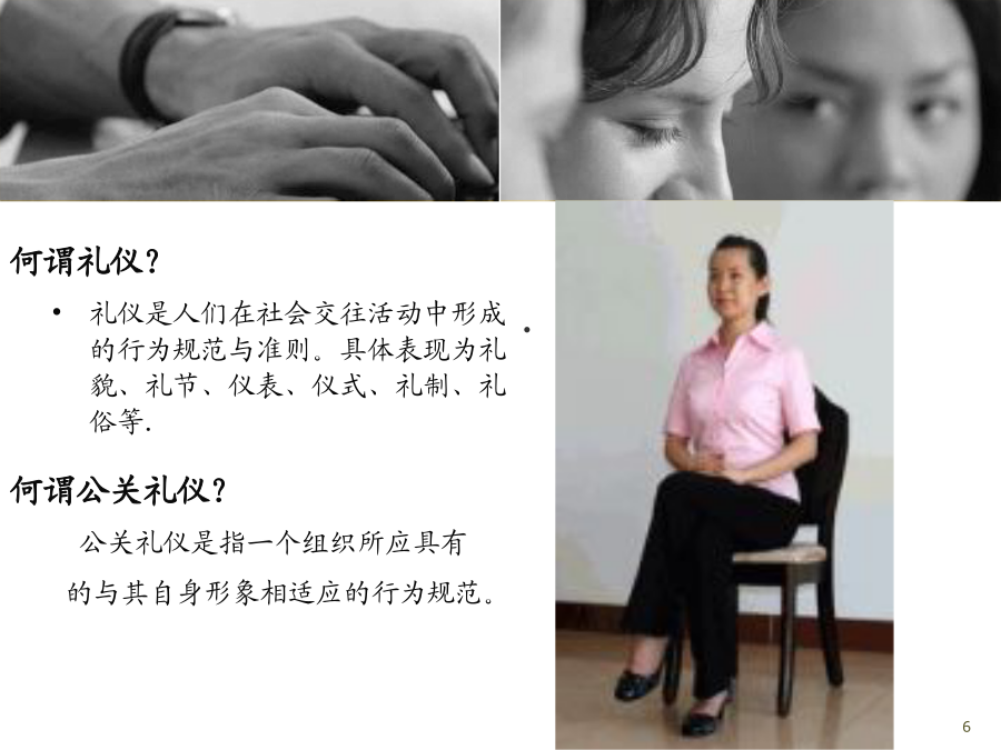个人简介“你永远无法获得第二次机会,以赢得一个良好的第一印象!”为何学习“公关礼仪”?目录何谓礼仪?公关礼仪的作用仪态礼仪仪态——身体姿态&风度(身体姿态:外在表象/风度:内在气质)先入为主,第一印象,一见钟情举止表情比有声语言更能打动人心三秒钟印象:55%举止仪容表情(体态语)+7%语言+38%声音微笑的礼仪规范12①把手举到脸前:微笑练习二表情二:目光目光的礼仪规范目光凝视区域:A、公务凝视区域:以两眼为底线、额中为顶角形成的三角区。B、社交凝视区域:以两眼为上线、唇心为下顶角所形成的倒三角区。C、亲密凝视区域:从双眼到胸部之间。目光的运用:要做到“散点柔视”,即应将目光柔和地照在别人的整个脸上,而不是聚焦于对方的眼睛。当双方沉默不语时,应将目光移开。目光运用中的忌讳:盯视、眯视。交际距离站姿站姿的基本要求是挺直、舒展,站得直,立得正,线条优美,精神焕发。头正,面部朝向正前方,双眼平视,下颌微微内收,颈部挺直。双肩放松,保持水平,腰部直立。身体的重心放在两脚之间。女性双臂自然下垂,处于身体两侧,右手搭在左手上,贴在腹部。女性两腿呈“V”字形立正时,双膝与双脚的跟部靠紧,两脚尖之间相距一个拳头的宽度。两腿呈“T”字形立正时,右脚后跟靠在左足弓处。男性双手相握,可叠放于腹前,或者相握于身后。双脚叉开,与肩平行。站姿站姿站姿的训练加强站姿训练,可以进一步提高站姿的规范化水平,形成良好的站立姿势。一是训练站立时身体重心的位置或重心的调整,使身体正立于中心平衡,并能自然改变立的姿势;二是训练挺胸、收腹、立腰、提臀。身体重心上升;身体挺拔向上;三是训练脚位与两脚间的距离,并与手的位置和谐一致,使整个身体谐调、自然;四是训练站立时面部表情,面带微笑,精神饱满;五是训练站立的持久性。①背靠背训练。两人一组,背靠背站立,两人的脚跟、小腿、臀部、双肩、后脑勺都紧,并在两人的肩部、小腿部各放一张小卡片,不能让其滑动或掉下。②贴墙训练。贴墙站立,、脚跟、小腿、肩部、双肩、后脑勺都要紧贴墙面,让身体上下处于同一平面上,并在肩部、小腿部各放一张卡片,不能让其滑动式掉下。③顶书训练。把书本放在头顶,为使书不掉下来,头、躯干自然会保持平稳。这种方法以纠正低头、仰脸、头歪、头晃及左顾右盼的毛病。④对镜训练。面对镜站好。检查自己的站姿及整体形象,看是否歪头、斜眉、含胸、弯腿等。发现问题及时调整。坐姿[动作要领]在他人之后从座位左侧走近座椅,背对其站立,右腿后退一点,以小腿确认一下座椅,然后随势坐下。入座时要轻,一般要坐椅子的2/3,双膝自然并拢(男性可略分)。身体稍向前倾,则表示尊重和谦虚。女性若着裙装,应用手将裙子稍向前拢一下,不宜将裙子下摆东撩西扇,也不许当人整理服饰。[男性]可将双腿分开略向前伸,如长时间端坐,可双腿交叉重叠,但要注意将上面的腿向回收,脚尖向下。[女性]入座前应先将裙角向前收拢,两腿并拢,双脚同时向左或向右放,两手叠放于左右腿上。如长时间端坐可将两腿交叉重叠,但要注意上面的腿向回收,脚尖向下。不美的坐姿先有表示:离开座位时,身旁如有人在座,须以语言或动作向其示意,方可站起。注意先后:地位低于对方时,应稍后离开,双方身份相似时,才可同时起身离座。起身缓慢:起身离座时,右脚向前或后移半步,最好动作轻缓,无声无息。站好再走:离开座椅时,先要采用“基本的站姿”,站定后,方可离开。从左离开:从坐椅左侧离开。走姿走姿基本要求不正确的走姿公务步行礼仪公务步行注意事项:在走廊引路时应走在客人左前方的2、3步处。引路人走在走廊的左侧,让客人走在路中央。与客人步伐保持一致,偶尔后望,确认客人跟上。引路时要注意客人,适当地做些介绍。在楼梯间引路时上时客先,下时客后,保证安全让客人走在正方向(右侧),引路人走在左侧。途中注意引导提醒拐弯或有楼梯台阶的地方应使用手势,并提醒客人“这边请”或“注意楼梯”、“有台阶,请走好”等。蹲姿蹲姿手势手势——桌上身体靠近桌子,尽量挺直上身,将双手放在桌子上时,可以分开、叠放或相握;但不要将胳膊支起来,或是将一只手放在桌子上,一只手放在桌子下。手势——递物动作要领双手为宜,不方便双手并用时,也要采用右手,以左手通常视为无礼;将有文字的物品递交他人时,须使之正面面对对方;将带尖、带刃或其它易于伤人的物品递于他人时,切勿以尖、刃直指对方。乘车礼仪出租车的座位次序私家车时的座位次序乘坐轿车乘车礼仪:特别提醒:⑴上车姿势Ⅰ开门后手自然下垂,可半蹲捋裙摆顺势坐下。⑴上车姿势Ⅱ依靠手臂做支点,腿脚并拢提高。⑴上车姿势Ⅲ继续保持腿与膝盖的并拢姿势,脚平移至车内。⑴上车姿势Ⅳ略调整身体位置,坐端正后,关上