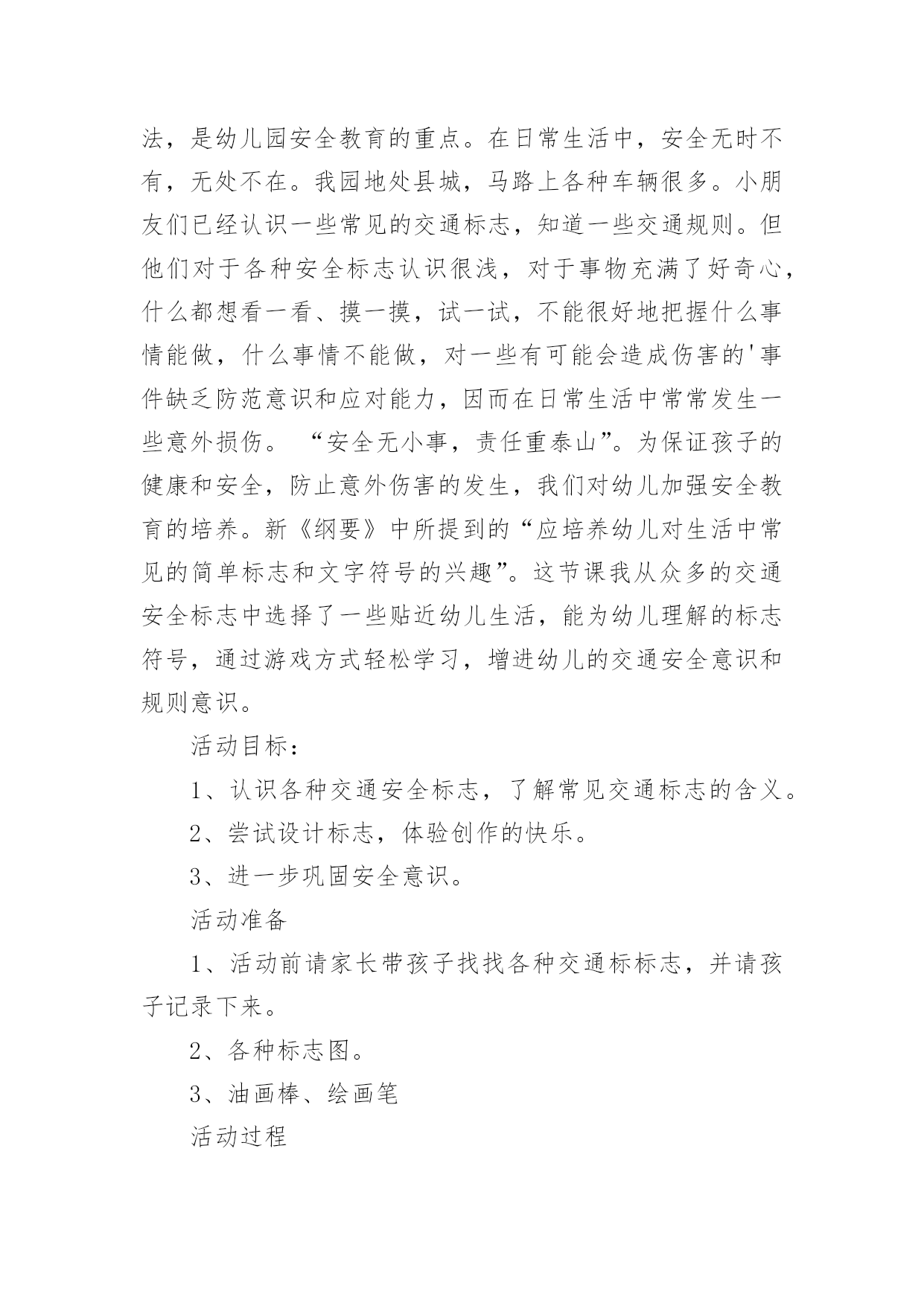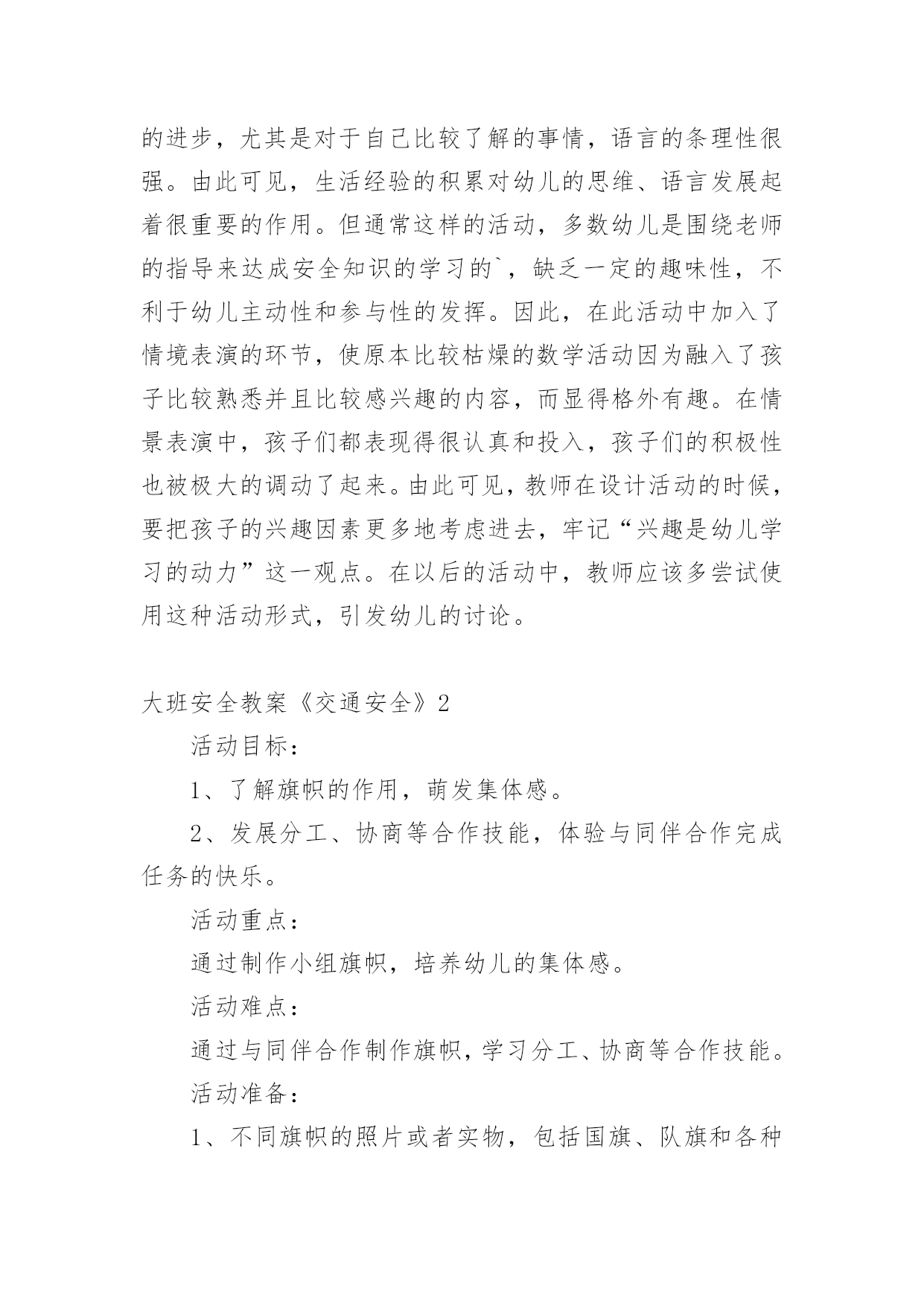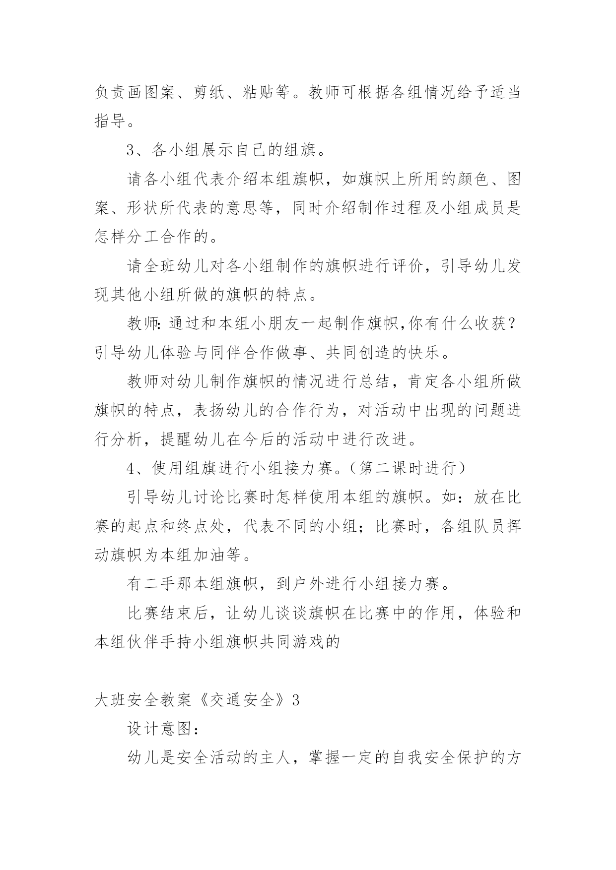 大班安全教案《交通安全》在教学工作者实际的教学活动中,通常会被要求编写教案,教案是实施教学的主要依据,有着至关重要的作用。教案应该怎么写才好呢?下面是小编为大家收集的大班安全教案《交通安全》,欢迎阅读,希望大家能够喜欢。大班安全教案《交通安全》1活动目标:1、让幼儿在交流活动中认识一些常见的交通标志。2、让幼儿在游戏活动中体验交通规则的重要性,从而自觉地遵守交通规则。3、让幼儿在合作学习中学得一些基本的学习方法。4、增强安全意识,克制自己的好奇心,不去危险的地方玩耍。5、知道哪些地方存在危险,不能去玩耍。活动准备:1、精心布置活动场景。2、收集各种交通标志(照片或图片)。3、字卡:交通安全、红灯停,绿灯行、人行道、非机动车道、汽车道。活动过程:(一)展开联想,揭示活动主题1、出示交通事故图片,请幼儿仔细观察。提问:孩子们,刚才你们看到了什么?想到了什么?2、多么可怕的车祸,为了不让这样的事情再发生,我们一定要注意交通安全。(出示字卡“交通安全”)(二)在活动中体会交通规则的重要性1、孩子们,看看我们坐的队形像什么?十字路口的学问可多了,现在我们就在十字路口做个游戏。老师请出三个司机,三个骑车的以及五个行人。参加游戏活动的孩子听到老师说完“开始”之后,立即向自己的对面出发。其他孩子仔细观察,看看会发生什么事情?(1)孩子们,刚才你们看到了什么?你们想说什么?(2)如果生活中也是这样可不行啊!为什么会发生这种情况呢?(3)(教师拿出信号灯标志)这是什么?谁能编句儿歌来说说信号灯的作用。(将标志贴在黑板上)幼儿回答后出示字卡“红灯停,绿灯行”。2、认识了红绿灯,我们还要知道自己应该走哪条路,这就要知道每条路的名称。孩子们,看看这个十字路口,你认识这些道路吗?(人行道、非机动车道、汽车道)(三)初步了解常见交通标志的作用(出示交通标志)在车辆穿梭的马路上,除了信号灯这个交通标志外,还有很多交通标志,这些交通标志都有什么用呢?(四)现场指挥1、刚才我们认识的交通标志对维护交通安全起着重要的作用。车辆的顺畅,人们的生命安全,更离不开交通警察。老师向交警叔叔学了一些指挥交通的本领,请小朋友仔细看,猜一猜是什么意思。2、老师来当交通警察,请小朋友站在这个十字路口,听警察叔叔的指挥,一起动一动吧!(五)评价幼儿游戏情况,结束。儿童安全小知识:1.增强红绿灯意识.红绿灯是设在街道路口的交通信号装置.`红灯停,绿灯行'按信号灯的指示通行,起步时向左右两边看是否有来车,然后从人行横道横过马路.自觉地接受交通信号的指挥.2.学龄前儿童过马路要让大人牵引.不要让儿童单独上街.他们如在街道或公路上行走,必须有成年人带领.3.不要在车辆临近时突然横过马路.人的大脑从接受外界信号到是否决定停步到最后停下来有一个过程.汽车也是这样,当紧急制动时也有一个过程;再加上行驶的汽车有惯性,不能一刹即停.最安全之策,只能是:不要在汽车临近时突然横穿马路.4.不要扒车.一些小孩出于好奇,常常利用车辆起步、上坡、减速时扒车,或作游戏或以扒车代步.这样很容易跌倒或摔伤.甚至造成生命危险.活动反思:孩子们对交通安全有一定的认知,能较客观的认定其他人行为的对与错。在活动中,幼儿的语言表达能力有了很大的进步,尤其是对于自己比较了解的事情,语言的条理性很强。由此可见,生活经验的积累对幼儿的思维、语言发展起着很重要的作用。但通常这样的活动,多数幼儿是围绕老师的指导来达成安全知识的学习的`,缺乏一定的趣味性,不利于幼儿主动性和参与性的发挥。因此,在此活动中加入了情境表演的环节,使原本比较枯燥的数学活动因为融入了孩子比较熟悉并且比较感兴趣的内容,而显得格外有趣。在情景表演中,孩子们都表现得很认真和投入,孩子们的积极性也被极大的调动了起来。由此可见,教师在设计活动的时候,要把孩子的兴趣因素更多地考虑进去,牢记“兴趣是幼儿学习的动力”这一观点。在以后的活动中,教师应该多尝试使用这种活动形式,引发幼儿的讨论。大班安全教案《交通安全》2活动目标:1、了解旗帜的作用,萌发集体感。2、发展分工、协商等合作技能,体验与同伴合作完成任务的快乐。活动重点:通过制作小组旗帜,培养幼儿的集体感。活动难点:通过与同伴合作制作旗帜,学习分工、协商等合作技能。活动准备:1、不同旗帜的照片或者实物,包括国旗、队旗和各种彩旗。2、活动前已带幼儿参观过挂在广场、机关等处的旗帜。3、以小组为单位进行比赛的场地及比赛项目。4、废旧纸板、白纸、彩笔、剪刀、胶水等工具和材料。活动过程:1、出示各种气质的实物或照片,引发幼儿的兴趣。教师出示国旗、少先队队旗以及收集到的其他国家的国旗、运动会的彩旗等实物或照片,请幼儿欣赏。教师:你知道这是什么旗吗?你在什么地方见过它?教师:小朋友还看见过什么样的旗帜?是在什么地方见到的?让幼儿结合生