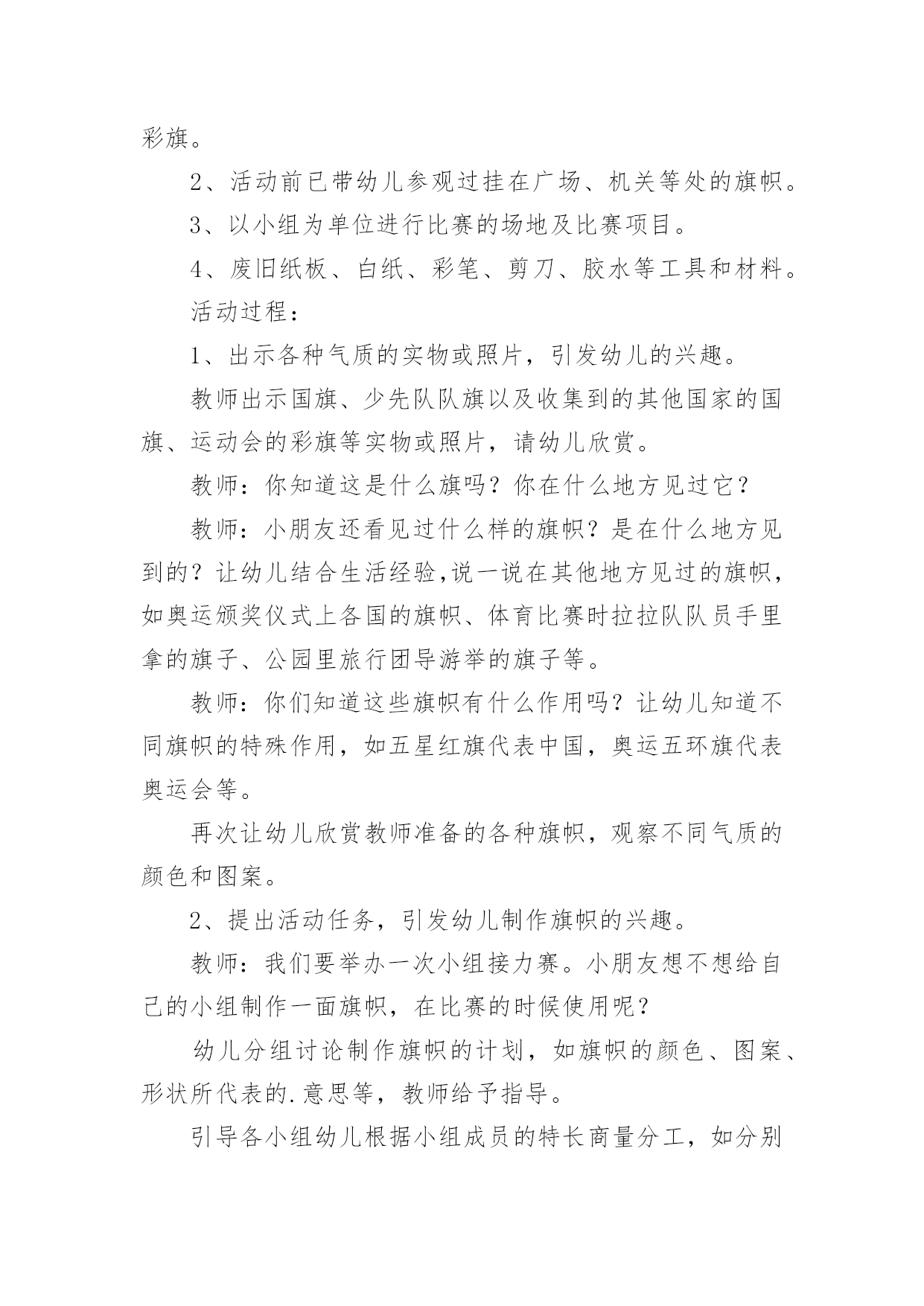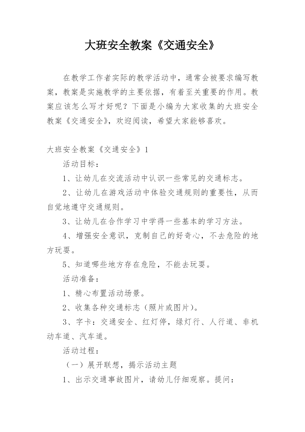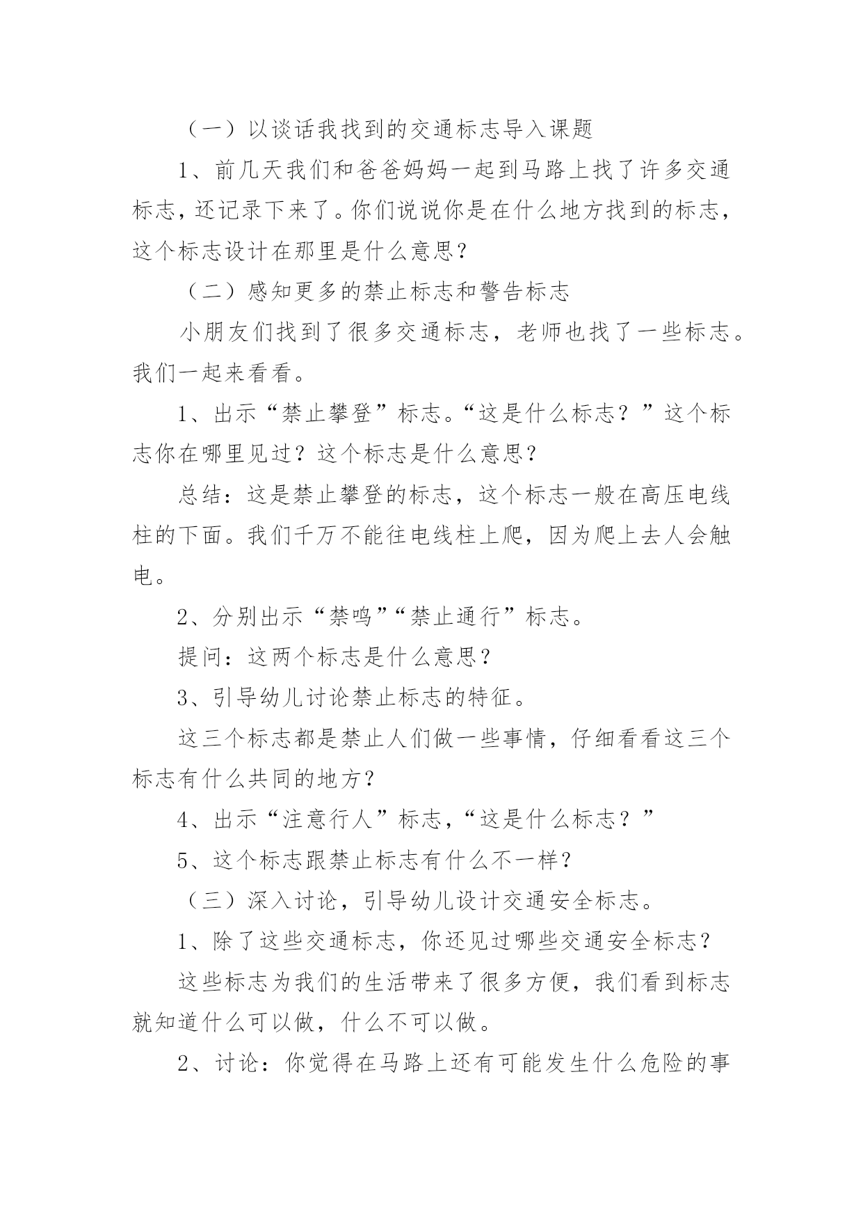 大班安全教案《交通安全》在教学工作者实际的教学活动中,通常会被要求编写教案,教案是实施教学的主要依据,有着至关重要的作用。教案应该怎么写才好呢?下面是小编为大家收集的大班安全教案《交通安全》,欢迎阅读,希望大家能够喜欢。大班安全教案《交通安全》1活动目标:1、让幼儿在交流活动中认识一些常见的交通标志。2、让幼儿在游戏活动中体验交通规则的重要性,从而自觉地遵守交通规则。3、让幼儿在合作学习中学得一些基本的学习方法。4、增强安全意识,克制自己的好奇心,不去危险的地方玩耍。5、知道哪些地方存在危险,不能去玩耍。活动准备:1、精心布置活动场景。2、收集各种交通标志(照片或图片)。3、字卡:交通安全、红灯停,绿灯行、人行道、非机动车道、汽车道。活动过程:(一)展开联想,揭示活动主题1、出示交通事故图片,请幼儿仔细观察。提问:孩子们,刚才你们看到了什么?想到了什么?2、多么可怕的车祸,为了不让这样的事情再发生,我们一定要注意交通安全。(出示字卡“交通安全”)(二)在活动中体会交通规则的重要性1、孩子们,看看我们坐的队形像什么?十字路口的学问可多了,现在我们就在十字路口做个游戏。老师请出三个司机,三个骑车的以及五个行人。参加游戏活动的孩子听到老师说完“开始”之后,立即向自己的对面出发。其他孩子仔细观察,看看会发生什么事情?(1)孩子们,刚才你们看到了什么?你们想说什么?(2)如果生活中也是这样可不行啊!为什么会发生这种情况呢?(3)(教师拿出信号灯标志)这是什么?谁能编句儿歌来说说信号灯的作用。(将标志贴在黑板上)幼儿回答后出示字卡“红灯停,绿灯行”。2、认识了红绿灯,我们还要知道自己应该走哪条路,这就要知道每条路的名称。孩子们,看看这个十字路口,你认识这些道路吗?(人行道、非机动车道、汽车道)(三)初步了解常见交通标志的作用(出示交通标志)在车辆穿梭的马路上,除了信号灯这个交通标志外,还有很多交通标志,这些交通标志都有什么用呢?(四)现场指挥1、刚才我们认识的交通标志对维护交通安全起着重要的作用。车辆的顺畅,人们的生命安全,更离不开交通警察。老师向交警叔叔学了一些指挥交通的本领,请小朋友仔细看,猜一猜是什么意思。2、老师来当交通警察,请小朋友站在这个十字路口,听警察叔叔的指挥,一起动一动吧!(五)评价幼儿游戏情况,结束。儿童安全小知识:1.增强红绿灯意识.红绿灯是设在街道路口的交通信号装置.`红灯停,绿灯行'按信号灯的指示通行,起步时向左右两边看是否有来车,然后从人行横道横过马路.自觉地接受交通信号的指挥.2.学龄前儿童过马路要让大人牵引.不要让儿童单独上街.他们如在街道或公路上行走,必须有成年人带领.3.不要在车辆临近时突然横过马路.人的大脑从接受外界信号到是否决定停步到最后停下来有一个过程.汽车也是这样,当紧急制动时也有一个过程;再加上行驶的汽车有惯性,不能一刹即停.最安全之策,只能是:不要在汽车临近时突然横穿马路.4.不要扒车.一些小孩出于好奇,常常利用车辆起步、上坡、减速时扒车,或作游戏或以扒车代步.这样很容易跌倒或摔伤.甚至造成生命危险.活动反思:孩子们对交通安全有一定的认知,能较客观的认定其他人行为的对与错。在活动中,幼儿的语言表达能力有了很大的进步,尤其是对于自己比较了解的事情,语言的条理性很强。由此可见,生活经验的积累对幼儿的思维、语言发展起着很重要的作用。但通常这样的活动,多数幼儿是围绕老师的指导来达成安全知识的学习的`,缺乏一定的趣味性,不利于幼儿主动性和参与性的发挥。因此,在此活动中加入了情境表演的环节,使原本比较枯燥的数学活动因为融入了孩子比较熟悉并且比较感兴趣的内容,而显得格外有趣。在情景表演中,孩子们都表现得很认真和投入,孩子们的积极性也被极大的调动了起来。由此可见,教师在设计活动的时候,要把孩子的兴趣因素更多地考虑进去,牢记“兴趣是幼儿学习的动力”这一观点。在以后的活动中,教师应该多尝试使用这种活动形式,引发幼儿的讨论。大班安全教案《交通安全》2活动目标:1、了解旗帜的作用,萌发集体感。2、发展分工、协商等合作技能,体验与同伴合作完成任务的快乐。活动重点:通过制作小组旗帜,培养幼儿的集体感。活动难点:通过与同伴合作制作旗帜,学习分工、协商等合作技能。活动准备:1、不同旗帜的照片或者实物,包括国旗、队旗和各种彩旗。2、活动前已带幼儿参观过挂在广场、机关等处的旗帜。3、以小组为单位进行比赛的场地及比赛项目。4、废旧纸板、白纸、彩笔、剪刀、胶水等工具和材料。活动过程:1、出示各种气质的实物或照片,引发幼儿的兴趣。教师出示国旗、少先队队旗以及收集到的其他国家的国旗、运动会的彩旗等实物或照片,请幼儿欣赏。教师:你知道这是什么旗吗?你在什么地方见过它?教师:小朋友还看见过什么样的旗帜?是在什么地方见到的?让幼儿结合生