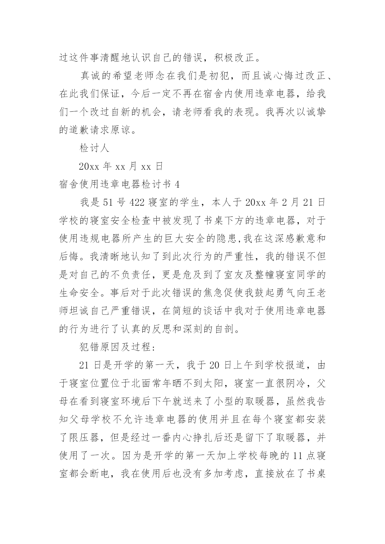 宿舍使用违章电器检讨书宿舍使用违章电器检讨书在学习、工作或生活中出现了问题或过错后,我们常常被要求写检讨书,以对出现的问题和过错进行检讨,在写检讨书时犯错的原因要描述清楚。你所见过的检讨书是什么样的呢?以下是小编收集整理的宿舍使用违章电器检讨书,希望对大家有所帮助。宿舍使用违章电器检讨书1由此,我仔细深入的思考了存放违章电器的严重性。管院北楼宿舍是由以前的家属楼改造而成,该楼年代久远,安全防护设施比较落后,由于刚刚改造完成,各种安全设备还不齐全,电路也不安全,一旦使用大功率用电器很容易引发火灾。该楼每单元只有一条窄小的楼道和楼梯,发生火灾后人员很难撤离。如果住在低层使用大功率用电器而引发火灾的话,楼上的人会相当危险。想到此点,我不由地除了一身冷汗。万幸的是,学校宿管人员很敬业,认真检查了我们的宿舍,把这种危险扼杀在了萌芽阶段,正是他们的工作到位,保证了大家的安全,在此,我对自己的行为感到后悔和羞愧,并对学校深表谢意。其次,我的行为不符合一个研究生的要求。作为当代的大学生,尤其是研究生,应该识大体、顾大局。不应该为了自己的粗心大意违反校纪校规。我的行为还在宿舍间造成了极坏的影响。同学之间应该互相学习、互相促进,而我的表现给同学们带了一个坏头,不利于校风的建设。作为一名住宿者,我没有做好自己的本职,给学校和宿管人员的工作带来了很大的麻烦。对此,我深表歉意。因此,我决定做出如下个人整改措施:一,按照要求上交检讨书一份,对自己思想和行为上的错误根源深入地梳理,并认清可能造成的严重后果。二,用心克服生活上粗心大意的缺点。三,和同学、宿管人员加强沟通,保证今后不会再出现违反校纪校规的情况。我非常感谢学校老师和宿管人员对我所犯错误的及时指正,我保证今后不会再有类似行为发生在我的身上,并决心为我校的安全工作做出自己。宿舍使用违章电器检讨书2老师们同学们:大家好!我们对自己违反学校规定在寝室内使用违章电器的行为向您表示歉意和强烈的自责。我们犯了使用大功率电器的错误,多亏老师及时发现,阿姨及时制止,才避免了更大的错误的发生。如果那天没有被发现,我们一定会犯错误,等到真的出了事情,后悔也没用了。针对所犯的错误我们寝室决定执行以下整改措施:(1)立即召开寝室会议,就违章用电的事件相关人做出深刻地检讨,给寝室带来的不好影响要负起责任,并立下保证。(2)重新阅读相关规则,保证日后绝对不做与规则相违背的事情。(3)检查自己的用电用品中是否还存在着违章电器,一旦发现立即处理,决不再用。这次的事件我真的感到抱歉,希望老师可以原谅我,认可我认错的态度。我真的已经深刻的反省到我的错误了,希望老师再给我知错就改的机会。也希望同学们引以为戒,不要犯和我一样愚蠢的错误了。勿以恶小而为之,如今我已经认识到了自己的错误,今后一定会严格要求自己遵守学校的规章制度。对于我们所犯的错误,我们已经深刻检讨反省,请老师给我们一个改过自新的机会。我们xxx寝室向您作出深刻的检讨。早晨起床,六位同学在宿舍匆匆收拾出门上自习,一同学说教室冷,拿出了从家里带的热水袋,准备烧好了带到教室,临走时要迟到了着急忘了拔电源。阿姨查寝时发现了这件事情,对其进行了通报批评并要求写检讨书进行检讨。——XXX寝室宿舍使用违章电器检讨书3尊敬的王老师:您好!我是男生宿舍楼22号甲E区107寝室的xxx,为违反学校规定,擅自使用大功率违章电器——热得快,向老师作深刻检讨。20xx年xx月xx日上午,当楼长老师走进我们寝室时,发现我正在使用学校明令禁止的违章电器——热得快,烧水。老师发现之后,立即予以没收,并通知老师您前来处理。到老师没收热得快后,我一开始并不认为这是一件多么严重的事情,认为只要没出什么事情发生就应该不算大事。但当老师您对我进行批评教育时,我才清晰地认知到此次行为的严重性和自己自私无知。我的错误不但是对自己的不负责任,更是危及到了室友及整幢寝室同学的生命安全。在老师对我们简短而深刻的谈话后,我对于使用违章电器的行为进行了认真的反思和深刻的自剖。下面是我们宿舍买和使用热得快的大概经过和一些主观原因的详述。这只热得快大约是在去年冬天,临近期末的时候我们去超市买的。当时花了十七元,专门买了这只据他们讲是最好的热得快,我们当时看了看功率有1000瓦,感觉并不是很大,所以就带回了宿舍。在买这只热得快之前,知道学校不让用,我们也是内心争斗了好久,一开始也并不想买。但是在临近期末时,宿舍几个人的宿舍水卡相继用完了。然而,冬天我们对热水的需求有格外大,例如:洗头、烫脚、洗衣服、还有喝水。一开始大家都是用水卡接宿舍的热水,洗头,洗脚,洗衣服,但很快发现,卡里的钱用得特别的快,用完之后,大家感觉快放假了,再花钱办一张水卡有点不值得。其实更重要的原因是大家之间的一点小私心。我们宿舍一直都是水卡公用,就是谁买了水卡后