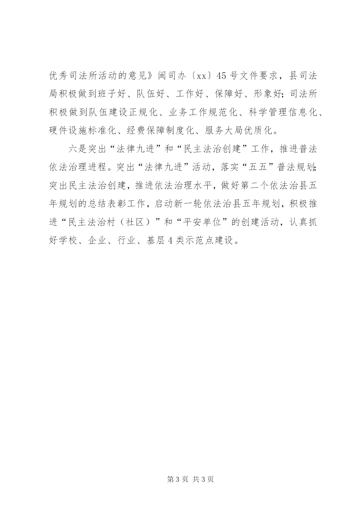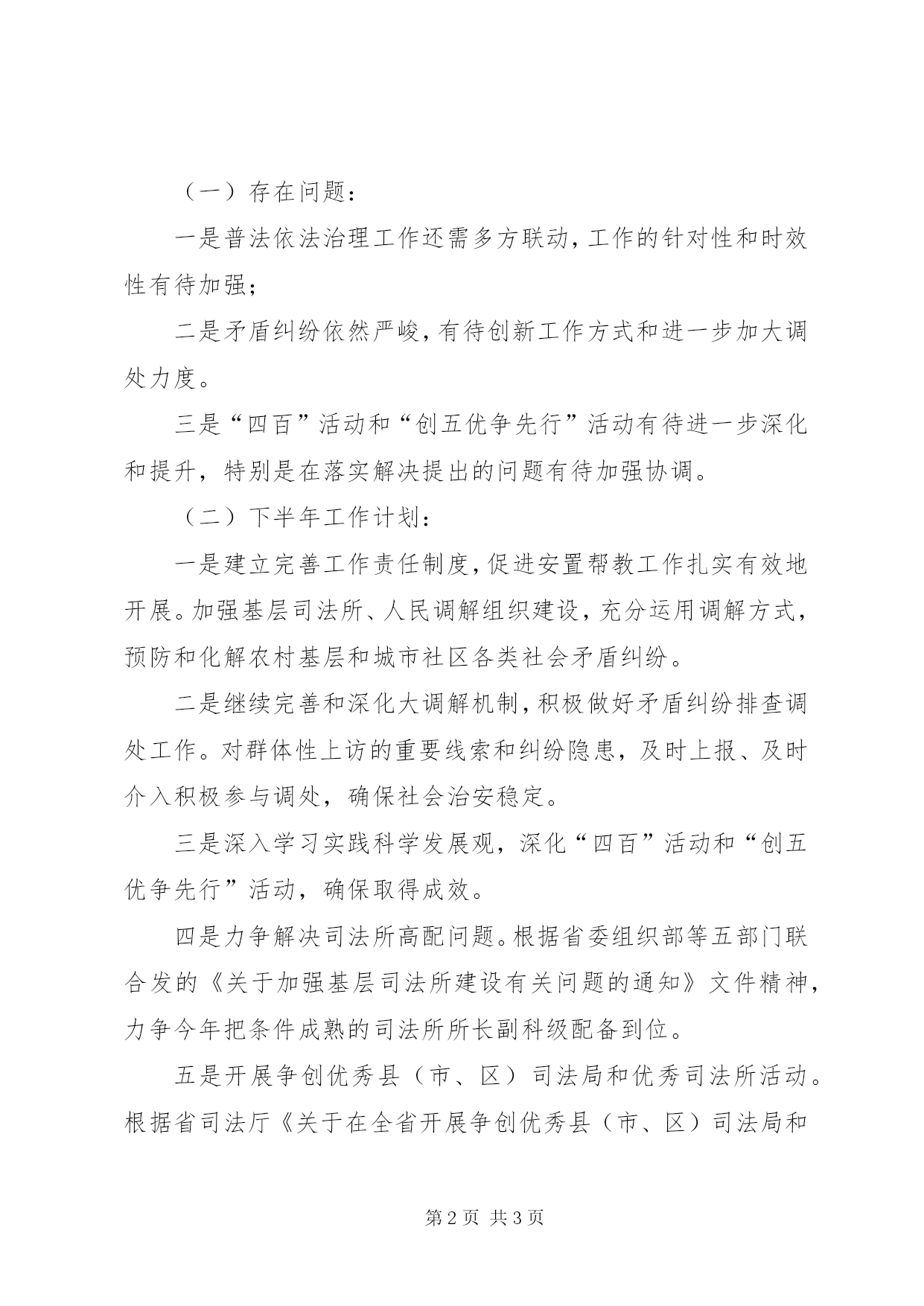 第PAGE\*Arabic\*MERGEFORMAT3页共NUMPAGES\*MERGEFORMAT3页县司法行政工作总结(一)进村(社区)入户,扎实开展“四百”活动。重点开展白莲村和百花社区部分街道的“四百”活动。成立“四百”活动挂村工作队和挂社区工作队,制作便民服务联系卡1860张,做好民情日记,组队下乡、进村、入社区接访人民群众,了解民情,排查矛盾纠纷,尤其是排查存在涉法涉诉纠纷隐患。如局领导定期带队到所挂白莲村和社区走访服务群众,收集到各种矛盾纠纷和意见建议共16条,向农户发放“四百活动”宣传提纲620份,并为家庭困难户送出慰问金600元。对力所能及的问题及时解决,对本部门无法解决的及时反馈给相关部门加以解决。同时各司法所也积极融入到各乡镇“四百”活动中,认真了解民情民意,做好工作日志,力所能及地解决相关问题。(二)结合实际,着力开展“创五优争先行”活动。按照“创五优争先行”活动要求及考评细则,结合本局股室职能,确定公证、基层法律服务、法律援助等窗口股室为重点“创五优争先行”活动单位,在完善全局各项制度的基础上,窗口单位再根据自己的本职职责,结合五优要求进一步加强管理,提高窗口服务质量、服务水平。力求做到不发生一起投诉,不办一件错案(证),不怠慢一位当事人,不发生当事人找不到人的现象,确保树好窗口形象,高效运转,优质服务,业绩提升。六、存在问题及下一步工作计划(一)存在问题:一是普法依法治理工作还需多方联动,工作的针对性和时效性有待加强;二是矛盾纠纷依然严峻,有待创新工作方式和进一步加大调处力度。三是“四百”活动和“创五优争先行”活动有待进一步深化和提升,特别是在落实解决提出的问题有待加强协调。(二)下半年工作计划:一是建立完善工作责任制度,促进安置帮教工作扎实有效地开展。加强基层司法所、人民调解组织建设,充分运用调解方式,预防和化解农村基层和城市社区各类社会矛盾纠纷。二是继续完善和深化大调解机制,积极做好矛盾纠纷排查调处工作。对群体性上访的重要线索和纠纷隐患,及时上报、及时介入积极参与调处,确保社会治安稳定。三是深入学习实践科学发展观,深化“四百”活动和“创五优争先行”活动,确保取得成效。四是力争解决司法所高配问题。根据省委组织部等五部门联合发的《关于加强基层司法所建设有关问题的通知》文件精神,力争今年把条件成熟的司法所所长副科级配备到位。五是开展争创优秀县(市、区)司法局和优秀司法所活动。根据省司法厅《关于在全省开展争创优秀县(市、区)司法局和优秀司法所活动的意见》闽司办〔xx〕45号文件要求,县司法局积极做到班子好、队伍好、工作好、保障好、形象好;司法所积极做到队伍建设正规化、业务工作规范化、科学管理信息化、硬件设施标准化、经费保障制度化、服务大局优质化。六是突出“法律九进”和“民主法治创建”工作,推进普法依法治理进程。突出“法律九进”活动,落实“五五”普法规划;突出民主法治创建,推进依法治理水平,做好第二个依法治县五年规划的总结表彰工作,启动新一轮依法治县五年规划,积极推进“民主法治村(社区)”和“平安单位”的创建活动,认真抓好学校、企业、行业、基层4类示范点建设。