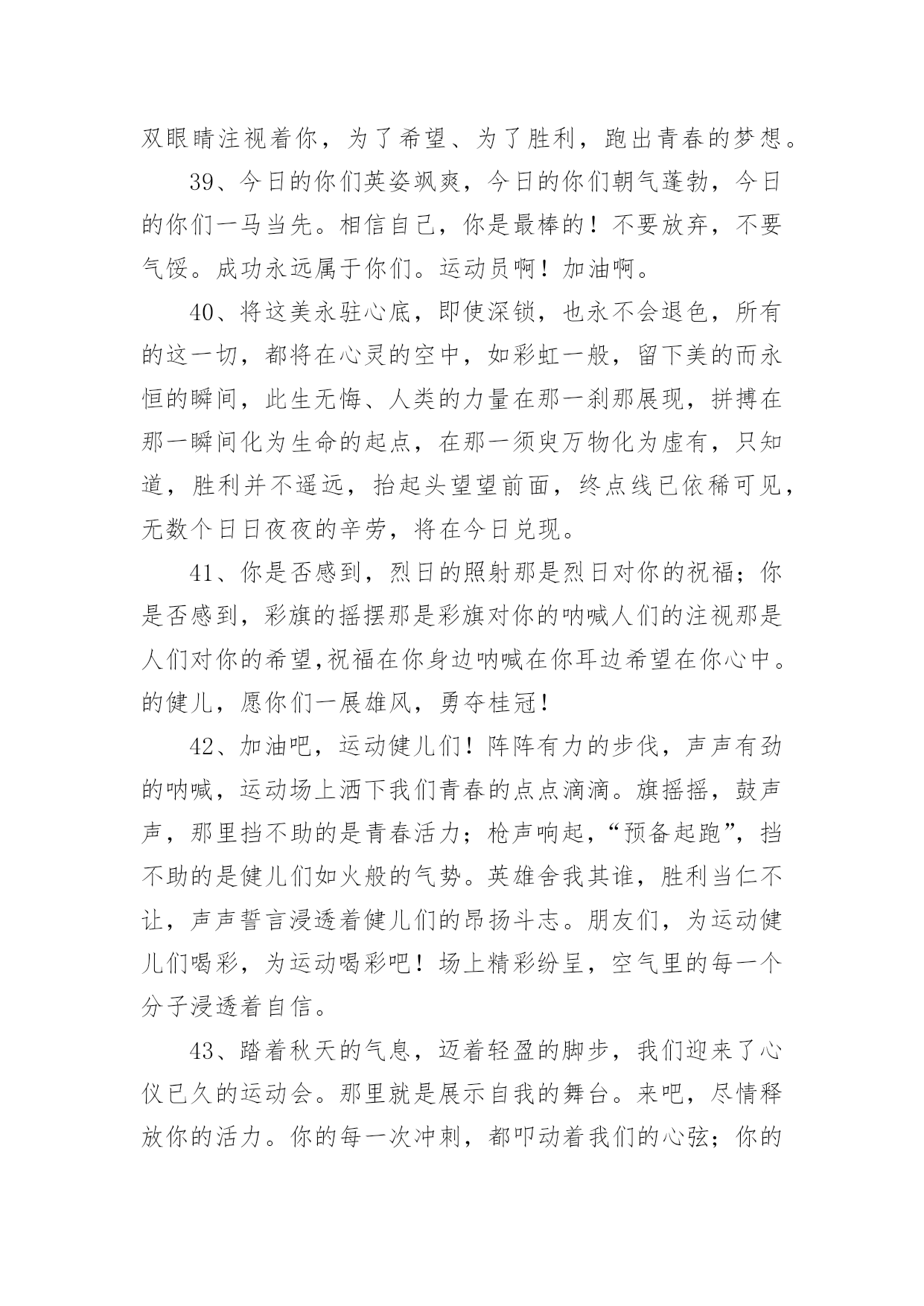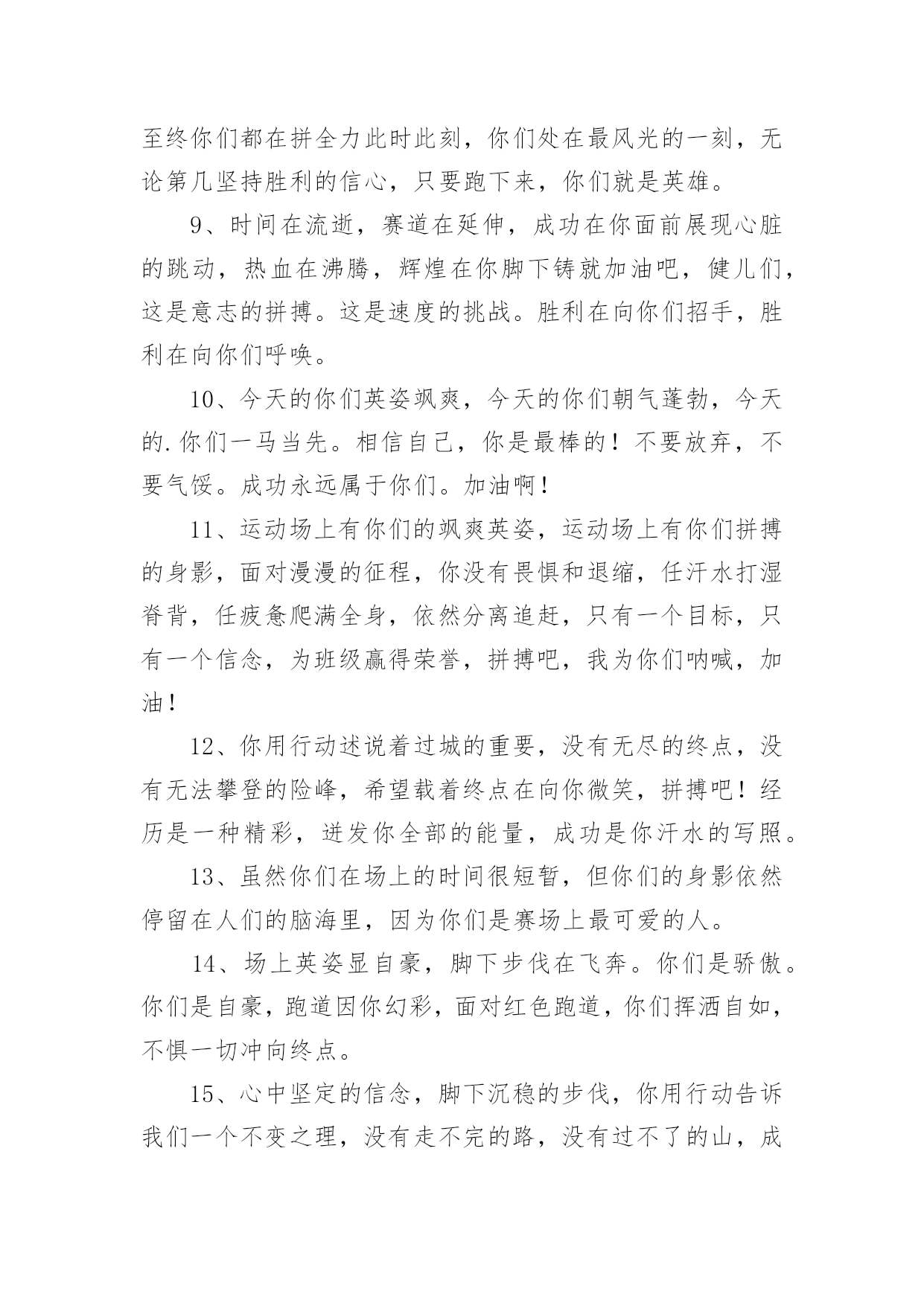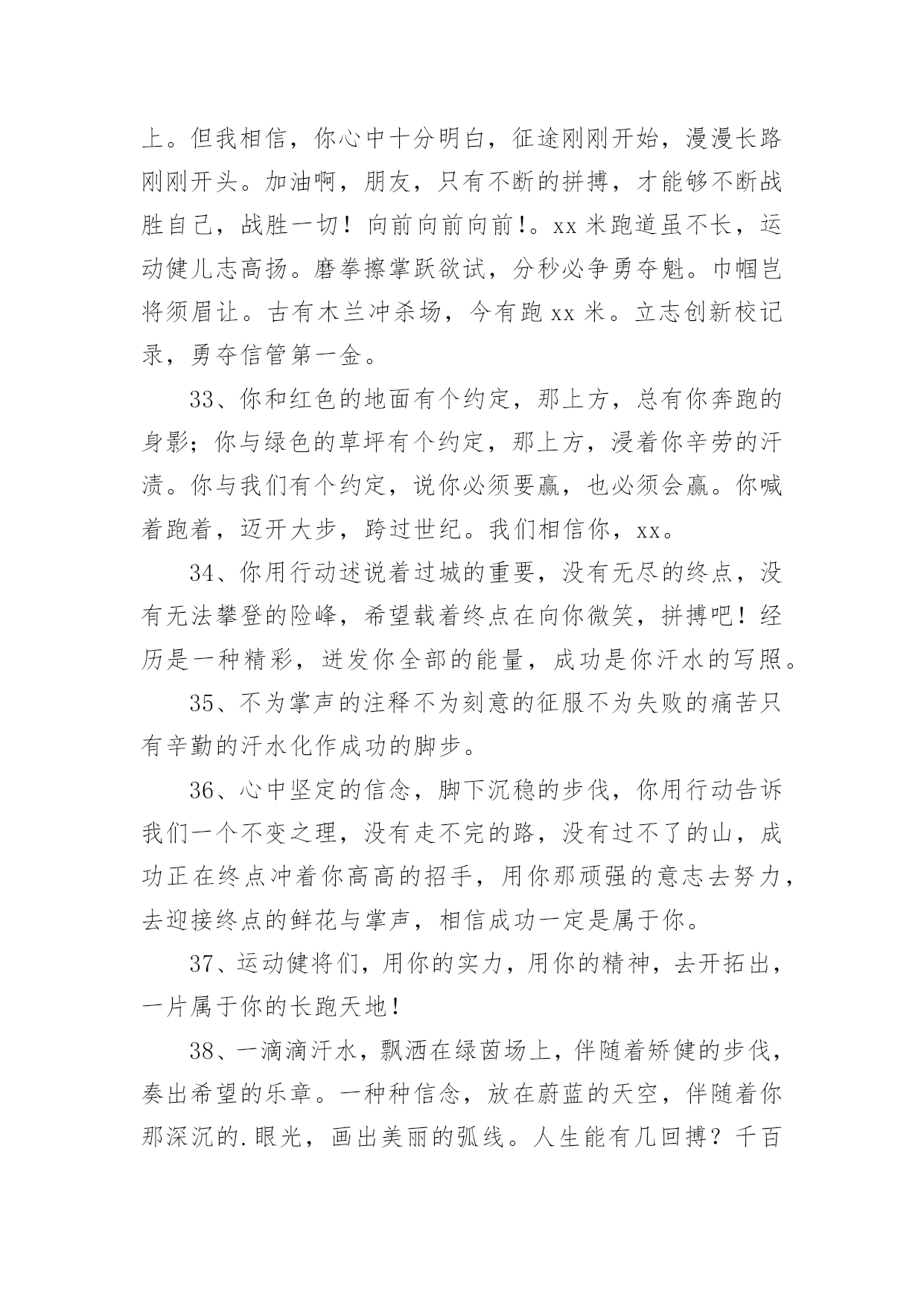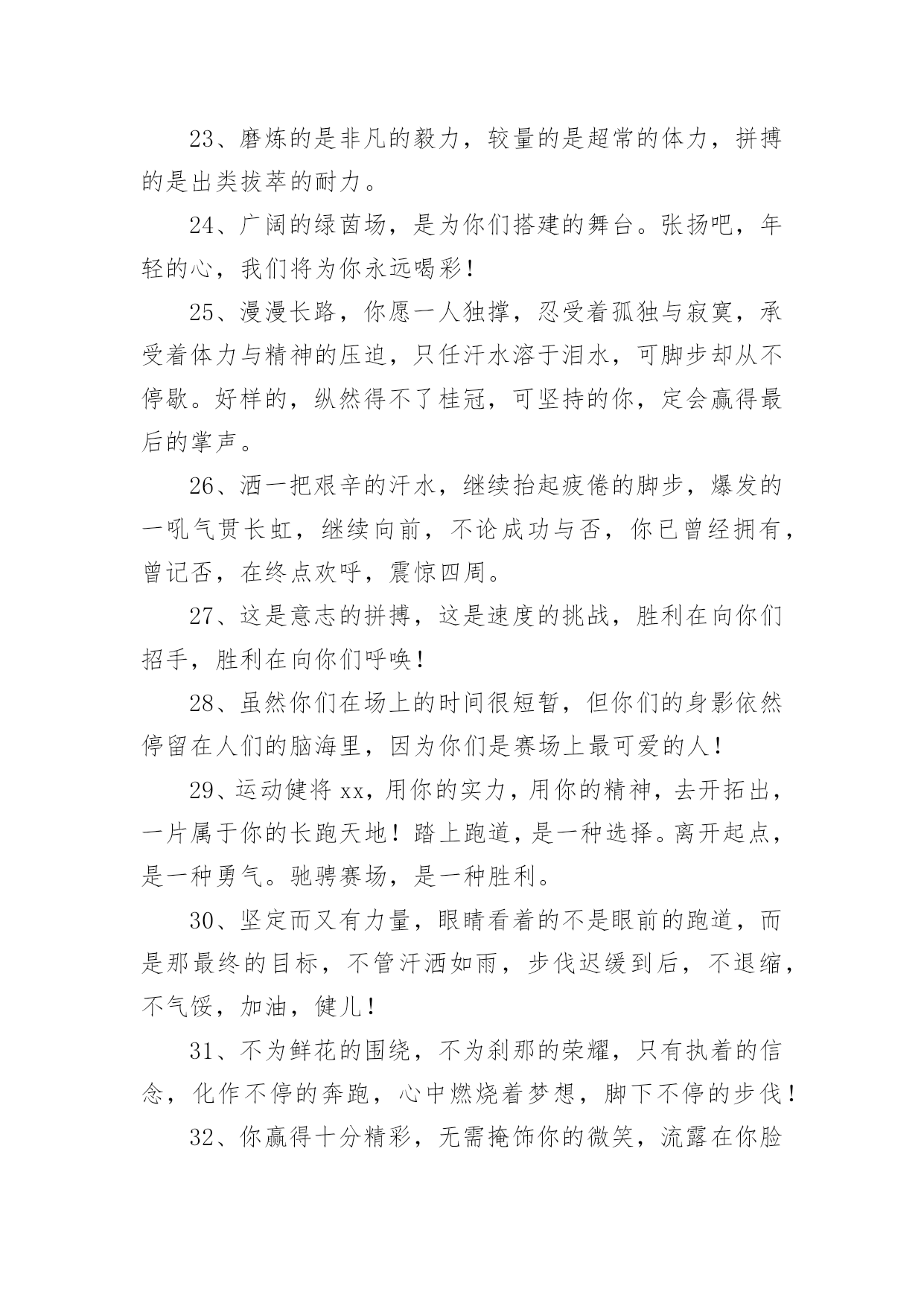 运动会加油稿运动会加油稿(精选)在充满活力,日益开放的今天,我们需要用到加油稿的情形越来越多,借助加油稿往往可以提升对方的气势。相信写加油稿是一个让许多人都头痛的问题,以下是小编帮大家整理的运动会加油稿,欢迎大家借鉴与参考,希望对大家有所帮助。运动会加油稿11、温暖的阳光洒在赛场上,男子乙组标枪的比赛即将开始。赛场上,一道道优美的弧线将轻盈地划过天空。健儿们用手中的标枪向距离的权限发起一轮又一轮的挑战。标枪在空中轻盈的姿态,是健儿们强健的力量和熟练的技巧的结合。谁能在这场激烈的竞争中获胜?让我们拭目以待,让我们为他们呐喊、助威吧!只有将力量与技巧合二为一的人,才能获得胜利的桂冠!2、有多少次挥汗如雨,伤痛曾添满记忆,只因为始终相信,去拼搏才能胜利。总在鼓舞自己,要成功就得努力。热血在赛场沸腾,巨人在赛场升起。相信自己,你将赢得胜利,创造奇迹;相信自己,梦想在你手中,这是你的天地。当一切过去,你们将是第一。相信自己,你们将超越极限,超越自己!相信自己,加油吧,健儿们,相信你自己。3、年轻的我们自信飞扬,青春的气息如同出生的朝阳,蓬勃的力量如同阳光的挥洒。此时此刻,跑道便是我们精彩的舞台,声声加油便是我们最高的奖项!论何成功,谈何荣辱,心中的信念只有一个:拼搏!4、广阔的绿茵场,是为你们搭建的舞台。张扬吧,年轻的心,我们将为你永远喝彩!5、泰戈尔在诗中说,天空没有翅膀的影子,但我已飞过;艾青对朋友说,也许有人到达不了彼岸,但我们共同拥有大海。也许你们没有显赫的成绩,但运动场上留下了你们的足迹。也许你们没有奖品,但我们心中留下了你们拼搏的身影。所有的努力都是为了迎接这一刹那,所有的拼搏都是为了这一声令下。6、就像花儿准备了春、秋、冬,就是为了红透整个盛夏。就像雪花经历了春、夏、秋就是为了洁白整个严冬。蹲下,昂首,出发;轻轻的一抬脚,便牵动了全场的目光潇洒的迫挥挥手,便满足了那一份无言的等待。迎着朝阳,你们踏歌而去,背着希望,我们等待你们的归来。7、也许流星并不少见,但它燃烧的刹那,留给人间最美丽的回忆!也许笑脸并不少见,但胜利的喜悦,总会留给世界精彩的一瞬!是的,那些曾经美妙的东西只有短短的一瞬间,但那却把最辉煌的一刻留给了人间。胜利,是每个人所追求的,胜利的喜悦,是胜利与重新开始的转折,胜利是新的开始!8、不长不短的距离,需要的是全身心全程投入,自始至终你们都在拼全力此时此刻,你们处在最风光的一刻,无论第几坚持胜利的信心,只要跑下来,你们就是英雄。9、时间在流逝,赛道在延伸,成功在你面前展现心脏的跳动,热血在沸腾,辉煌在你脚下铸就加油吧,健儿们,这是意志的拼搏。这是速度的挑战。胜利在向你们招手,胜利在向你们呼唤。10、今天的你们英姿飒爽,今天的你们朝气蓬勃,今天的.你们一马当先。相信自己,你是最棒的!不要放弃,不要气馁。成功永远属于你们。加油啊!11、运动场上有你们的飒爽英姿,运动场上有你们拼搏的身影,面对漫漫的征程,你没有畏惧和退缩,任汗水打湿脊背,任疲惫爬满全身,依然分离追赶,只有一个目标,只有一个信念,为班级赢得荣誉,拼搏吧,我为你们呐喊,加油!12、你用行动述说着过城的重要,没有无尽的终点,没有无法攀登的险峰,希望载着终点在向你微笑,拼搏吧!经历是一种精彩,迸发你全部的能量,成功是你汗水的写照。13、虽然你们在场上的时间很短暂,但你们的身影依然停留在人们的脑海里,因为你们是赛场上最可爱的人。14、场上英姿显自豪,脚下步伐在飞奔。你们是骄傲。你们是自豪,跑道因你幻彩,面对红色跑道,你们挥洒自如,不惧一切冲向终点。15、心中坚定的信念,脚下沉稳的步伐,你用行动告诉我们一个不变之理,没有走不完的路,没有过不了的山,成功正在终点冲着你高高的招手,用你那顽强的意志去努力,去迎接终点的鲜花与掌声,相信成功一定是属于你。16、汗水,泪水;笑声,歌声;我们尽情挥洒。开幕式上,运动场上,我们尽情展现,多少艰辛,多少困苦,我们勇敢承担。因为年轻,因为张扬,因为我们知道:用今天的汗水换来明天的微笑。17、坚定,执着,耐力与希望,在延伸的白色跑道中点点凝聚!力量,信念,拼搏与奋斗,在遥远的终点线上渐渐明亮!时代的强音正在你的脚下踏响。18、踏上跑道,是一种选择。离开起点,是一种勇气。驰骋赛场,是一种胜利。19、运动健将们,用你的实力,用你的精神,去开拓出,一片属于你的长跑天地!运动会加油稿21、看!那一面面迎风飘舞的彩旗,是一朵朵盛开的鲜花;听!那一阵阵惊天动地的欢呼,是回响在耳边胜利的风声。运动场上的你们,是胜利的标志,运动场上的你们,是青春的赞叹。去吧!去迎接那伟大的挑战,去吧!去做一名追风的少年。2、人生的路,有坦途,也有坎坷;做过的岁月,有欢笑,也有苦涩,泪水告诉我一个跌倒的故事,汗水使我多了一份沉重,几多成熟。3、踏上跑道,是一种选