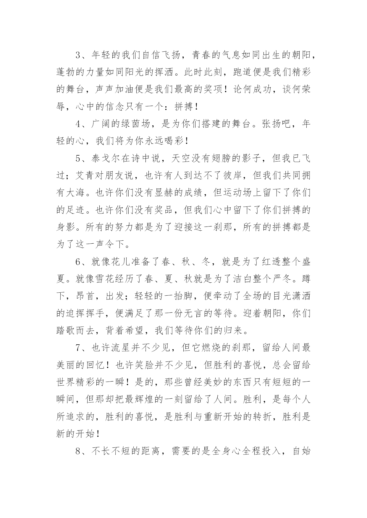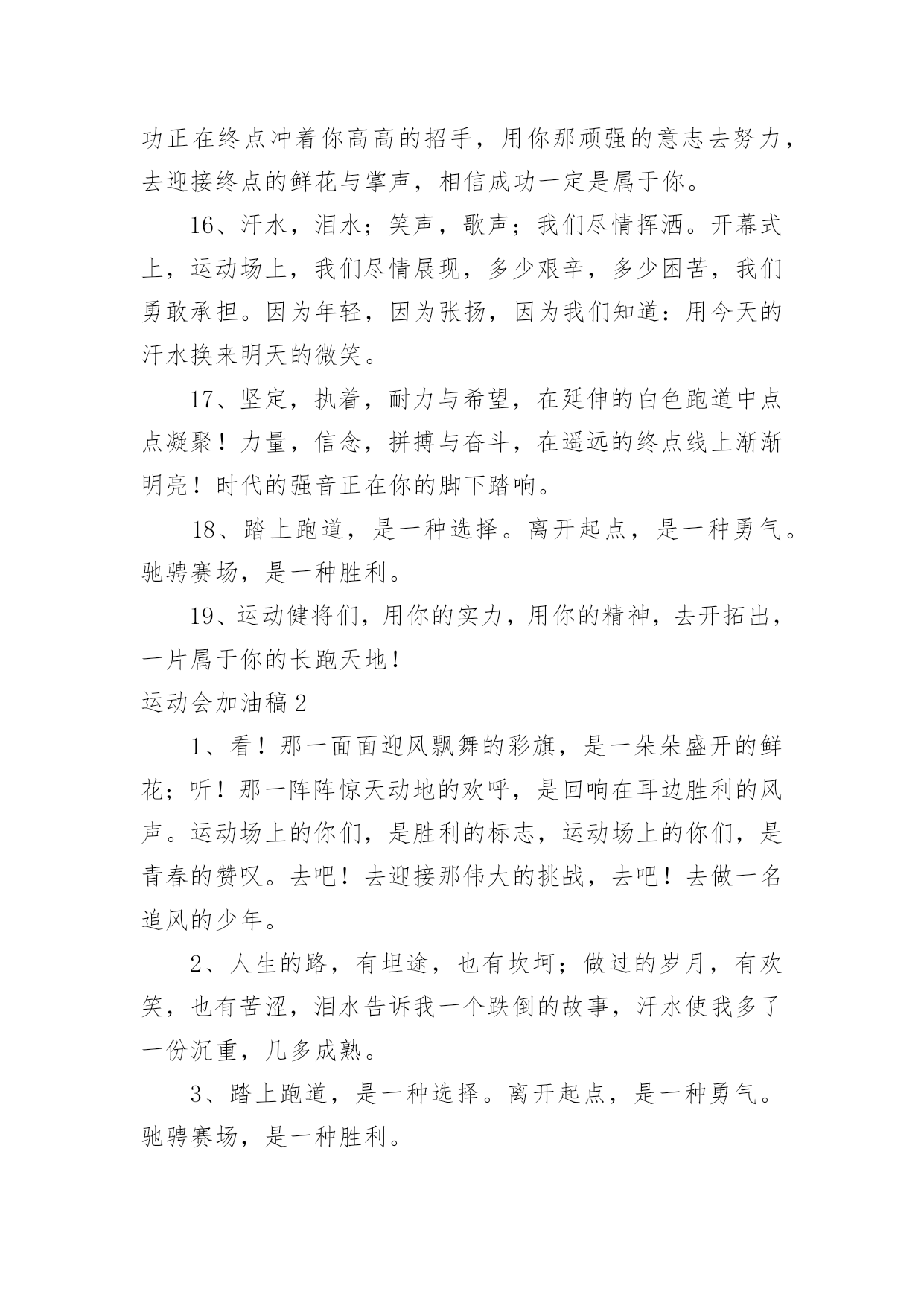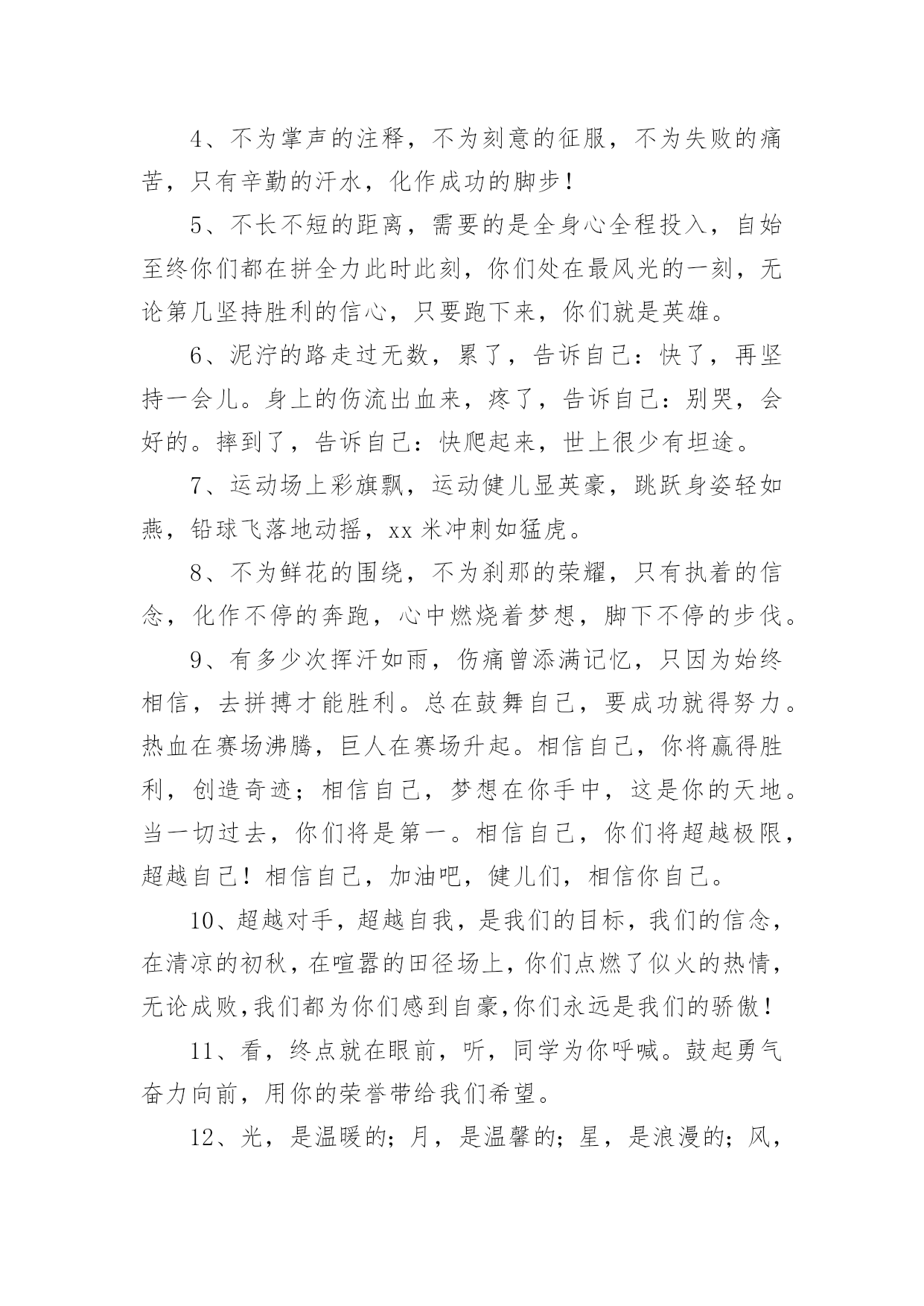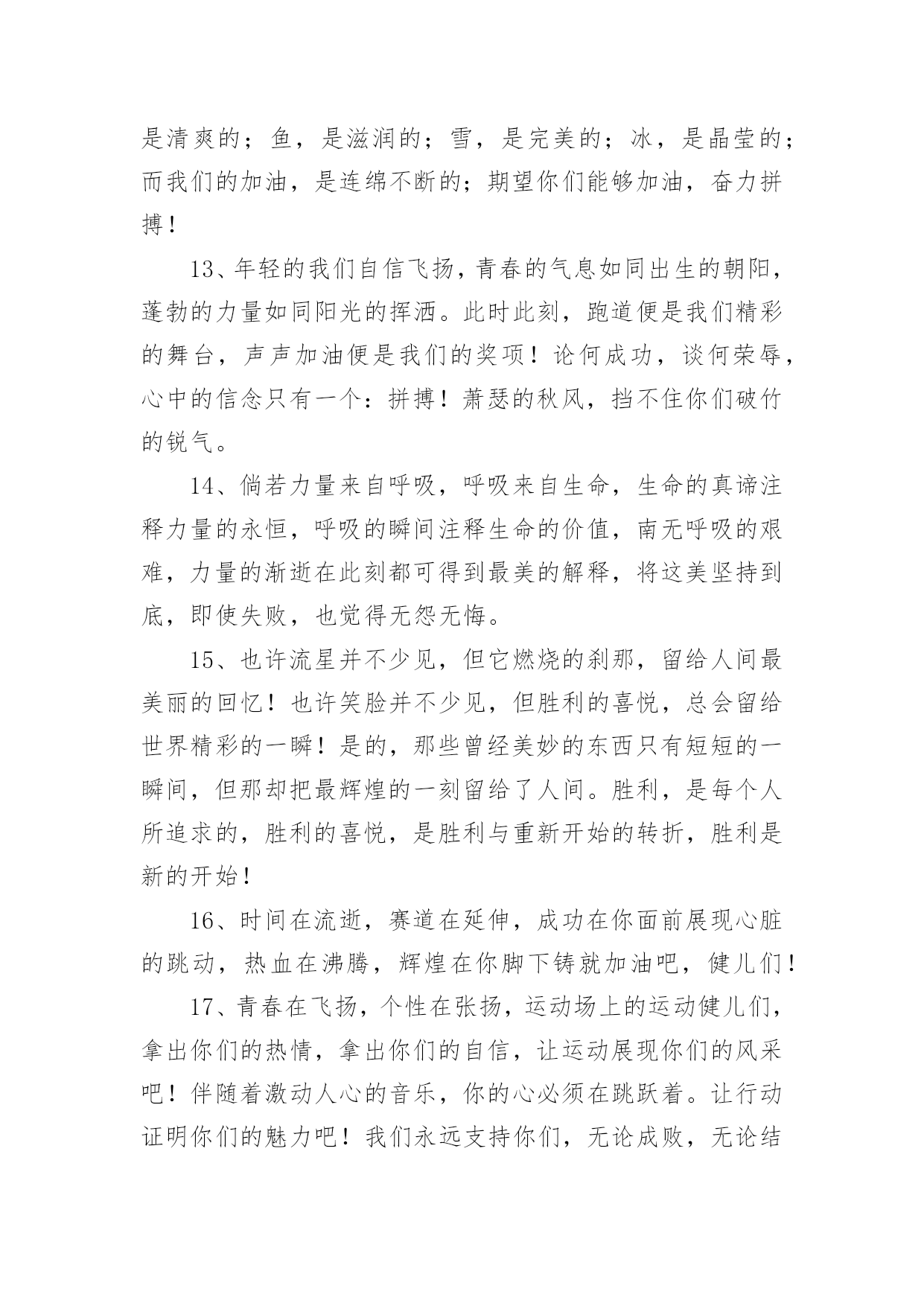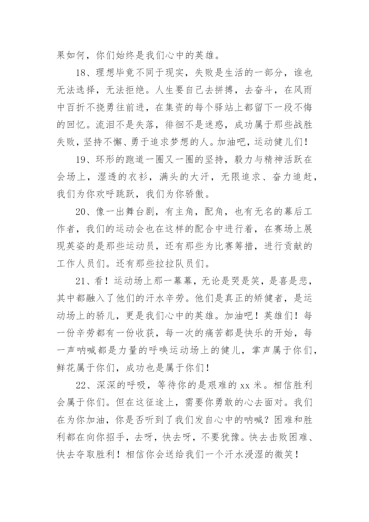 运动会加油稿运动会加油稿(精选)在充满活力,日益开放的今天,我们需要用到加油稿的情形越来越多,借助加油稿往往可以提升对方的气势。相信写加油稿是一个让许多人都头痛的问题,以下是小编帮大家整理的运动会加油稿,欢迎大家借鉴与参考,希望对大家有所帮助。运动会加油稿11、温暖的阳光洒在赛场上,男子乙组标枪的比赛即将开始。赛场上,一道道优美的弧线将轻盈地划过天空。健儿们用手中的标枪向距离的权限发起一轮又一轮的挑战。标枪在空中轻盈的姿态,是健儿们强健的力量和熟练的技巧的结合。谁能在这场激烈的竞争中获胜?让我们拭目以待,让我们为他们呐喊、助威吧!只有将力量与技巧合二为一的人,才能获得胜利的桂冠!2、有多少次挥汗如雨,伤痛曾添满记忆,只因为始终相信,去拼搏才能胜利。总在鼓舞自己,要成功就得努力。热血在赛场沸腾,巨人在赛场升起。相信自己,你将赢得胜利,创造奇迹;相信自己,梦想在你手中,这是你的天地。当一切过去,你们将是第一。相信自己,你们将超越极限,超越自己!相信自己,加油吧,健儿们,相信你自己。3、年轻的我们自信飞扬,青春的气息如同出生的朝阳,蓬勃的力量如同阳光的挥洒。此时此刻,跑道便是我们精彩的舞台,声声加油便是我们最高的奖项!论何成功,谈何荣辱,心中的信念只有一个:拼搏!4、广阔的绿茵场,是为你们搭建的舞台。张扬吧,年轻的心,我们将为你永远喝彩!5、泰戈尔在诗中说,天空没有翅膀的影子,但我已飞过;艾青对朋友说,也许有人到达不了彼岸,但我们共同拥有大海。也许你们没有显赫的成绩,但运动场上留下了你们的足迹。也许你们没有奖品,但我们心中留下了你们拼搏的身影。所有的努力都是为了迎接这一刹那,所有的拼搏都是为了这一声令下。6、就像花儿准备了春、秋、冬,就是为了红透整个盛夏。就像雪花经历了春、夏、秋就是为了洁白整个严冬。蹲下,昂首,出发;轻轻的一抬脚,便牵动了全场的目光潇洒的迫挥挥手,便满足了那一份无言的等待。迎着朝阳,你们踏歌而去,背着希望,我们等待你们的归来。7、也许流星并不少见,但它燃烧的刹那,留给人间最美丽的回忆!也许笑脸并不少见,但胜利的喜悦,总会留给世界精彩的一瞬!是的,那些曾经美妙的东西只有短短的一瞬间,但那却把最辉煌的一刻留给了人间。胜利,是每个人所追求的,胜利的喜悦,是胜利与重新开始的转折,胜利是新的开始!8、不长不短的距离,需要的是全身心全程投入,自始至终你们都在拼全力此时此刻,你们处在最风光的一刻,无论第几坚持胜利的信心,只要跑下来,你们就是英雄。9、时间在流逝,赛道在延伸,成功在你面前展现心脏的跳动,热血在沸腾,辉煌在你脚下铸就加油吧,健儿们,这是意志的拼搏。这是速度的挑战。胜利在向你们招手,胜利在向你们呼唤。10、今天的你们英姿飒爽,今天的你们朝气蓬勃,今天的.你们一马当先。相信自己,你是最棒的!不要放弃,不要气馁。成功永远属于你们。加油啊!11、运动场上有你们的飒爽英姿,运动场上有你们拼搏的身影,面对漫漫的征程,你没有畏惧和退缩,任汗水打湿脊背,任疲惫爬满全身,依然分离追赶,只有一个目标,只有一个信念,为班级赢得荣誉,拼搏吧,我为你们呐喊,加油!12、你用行动述说着过城的重要,没有无尽的终点,没有无法攀登的险峰,希望载着终点在向你微笑,拼搏吧!经历是一种精彩,迸发你全部的能量,成功是你汗水的写照。13、虽然你们在场上的时间很短暂,但你们的身影依然停留在人们的脑海里,因为你们是赛场上最可爱的人。14、场上英姿显自豪,脚下步伐在飞奔。你们是骄傲。你们是自豪,跑道因你幻彩,面对红色跑道,你们挥洒自如,不惧一切冲向终点。15、心中坚定的信念,脚下沉稳的步伐,你用行动告诉我们一个不变之理,没有走不完的路,没有过不了的山,成功正在终点冲着你高高的招手,用你那顽强的意志去努力,去迎接终点的鲜花与掌声,相信成功一定是属于你。16、汗水,泪水;笑声,歌声;我们尽情挥洒。开幕式上,运动场上,我们尽情展现,多少艰辛,多少困苦,我们勇敢承担。因为年轻,因为张扬,因为我们知道:用今天的汗水换来明天的微笑。17、坚定,执着,耐力与希望,在延伸的白色跑道中点点凝聚!力量,信念,拼搏与奋斗,在遥远的终点线上渐渐明亮!时代的强音正在你的脚下踏响。18、踏上跑道,是一种选择。离开起点,是一种勇气。驰骋赛场,是一种胜利。19、运动健将们,用你的实力,用你的精神,去开拓出,一片属于你的长跑天地!运动会加油稿21、看!那一面面迎风飘舞的彩旗,是一朵朵盛开的鲜花;听!那一阵阵惊天动地的欢呼,是回响在耳边胜利的风声。运动场上的你们,是胜利的标志,运动场上的你们,是青春的赞叹。去吧!去迎接那伟大的挑战,去吧!去做一名追风的少年。2、人生的路,有坦途,也有坎坷;做过的岁月,有欢笑,也有苦涩,泪水告诉我一个跌倒的故事,汗水使我多了一份沉重,几多成熟。3、踏上跑道,是一种选