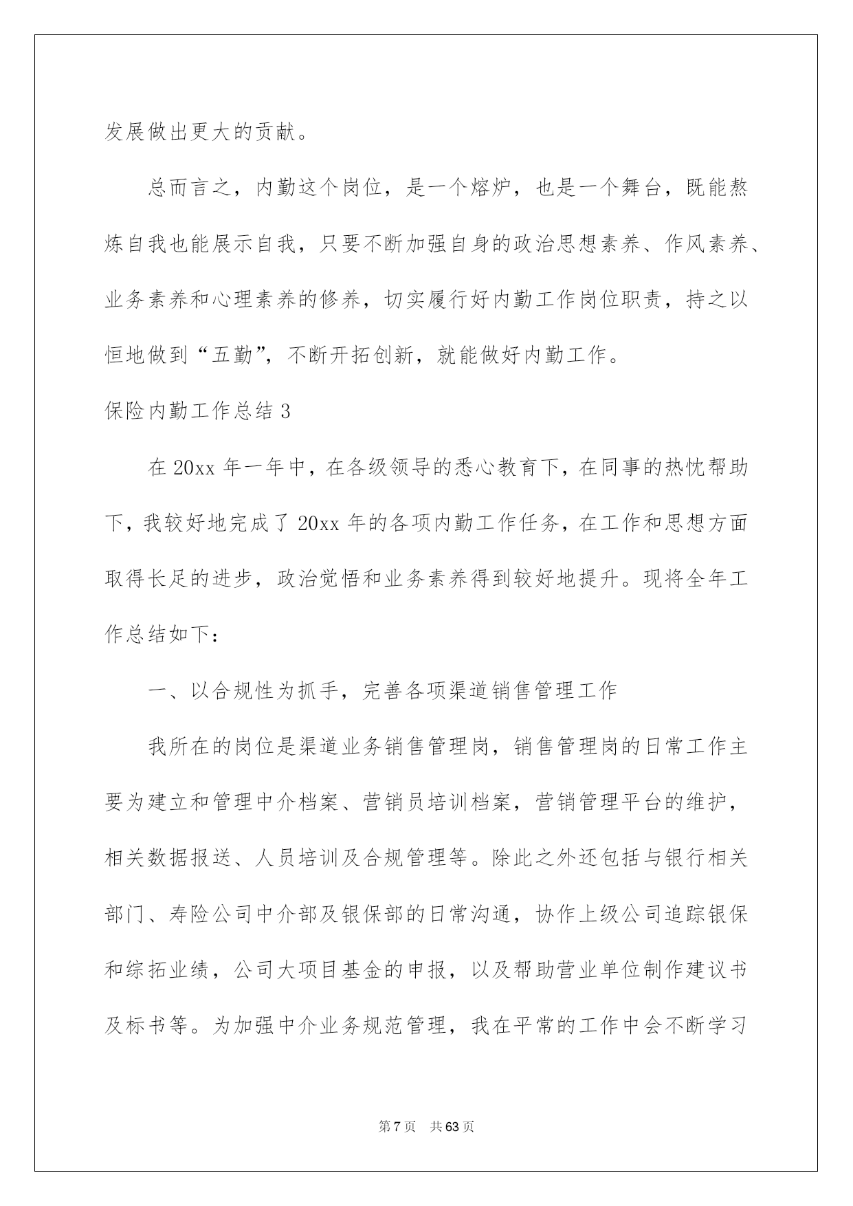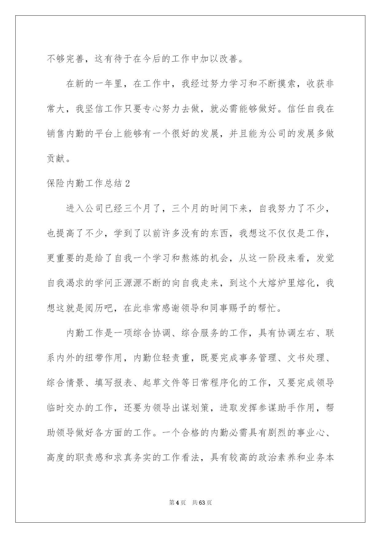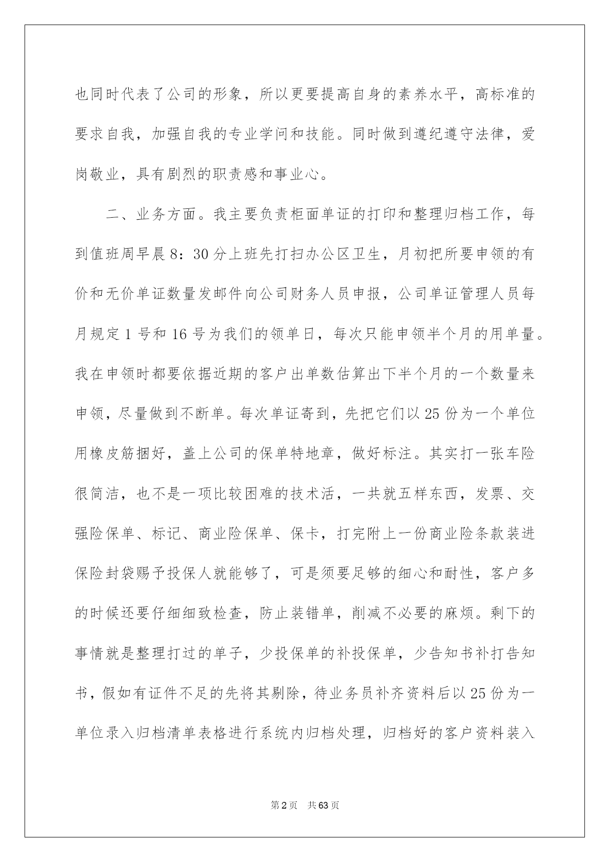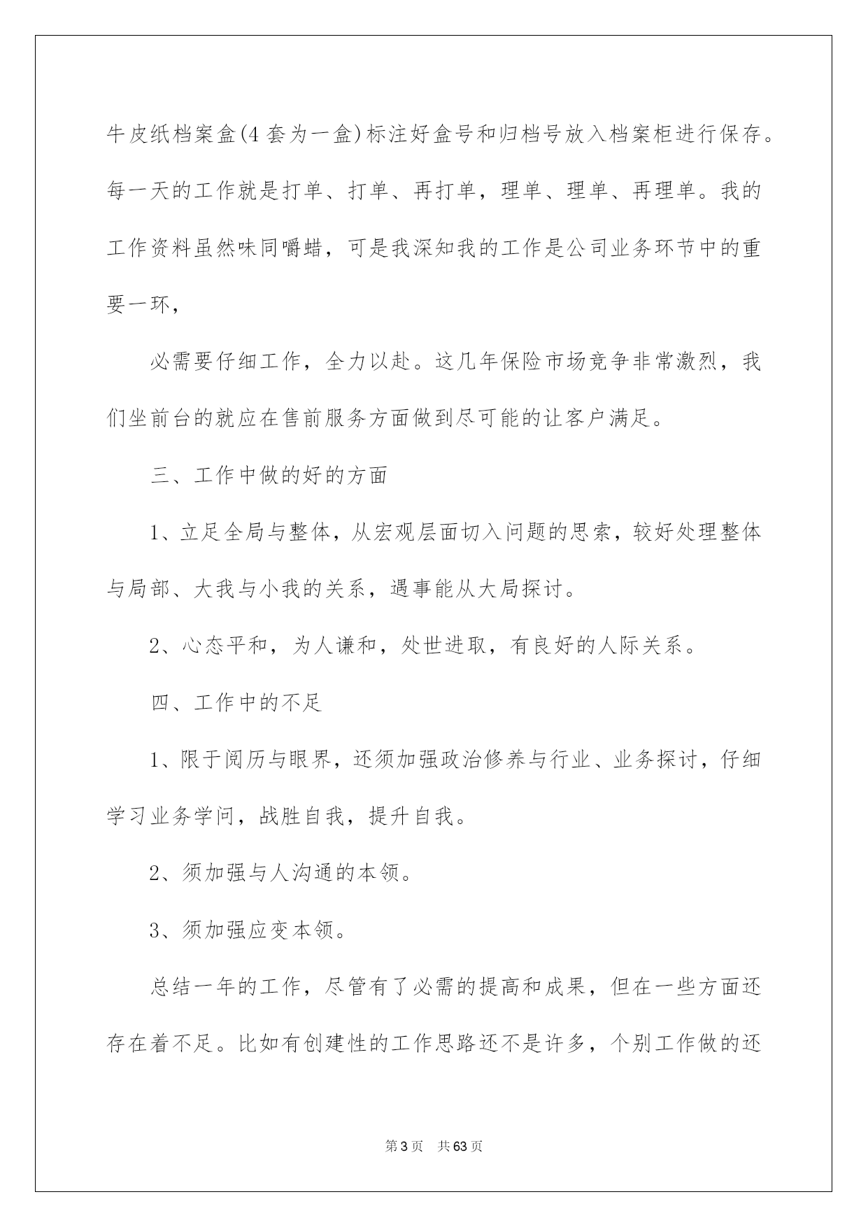 第PAGE\*Arabic\*MERGEFORMAT63页共NUMPAGES\*Arabic\*MERGEFORMAT63页第PAGE\*MERGEFORMAT63页共NUMPAGES\*MERGEFORMAT63页第PAGE\*MERGEFORMAT63页共NUMPAGES\*MERGEFORMAT63页第PAGE\*MERGEFORMAT63页共NUMPAGES\*MERGEFORMAT63页第PAGE\*MERGEFORMAT63页共NUMPAGES\*MERGEFORMAT63页第PAGE\*MERGEFORMAT63页共NUMPAGES\*MERGEFORMAT63页第PAGE\*MERGEFORMAT63页共NUMPAGES\*MERGEFORMAT63页第PAGE\*MERGEFORMAT63页共NUMPAGES\*MERGEFORMAT63页第PAGE\*MERGEFORMAT63页共NUMPAGES\*MERGEFORMAT63页第PAGE\*MERGEFORMAT63页共NUMPAGES\*MERGEFORMAT63页第PAGE\*MERGEFORMAT63页共NUMPAGES\*MERGEFORMAT63页2022保险内勤工作总结保险内勤工作总结总结是把肯定阶段内的有关状况分析探讨,做出有指导性结论的书面材料,通过它可以正确相识以往学习和工作中的优缺点,让我们一起仔细地写一份总结吧。那么总结应当包括什么内容呢?以下是我为大家整理的保险内勤工作总结,希望能够帮助到大家。保险内勤工作总结120xx年1月我加入平安,成为平安这个大家庭中的一员。在领导及各位同事的支持帮忙下,我不断加强工作本领,本着对工作精益求精的看法,仔细地完成了自我所担当的各项工作任务,工作本领都取得了相当大的提高,此刻这份工作对于我来说,能够说是得心应手,也为今后的工作和生活打下了良好的基础。下头结合我的详细情景对20xx年的工作做一下小结。一、工作思想方面。进取贯彻公司关于发展的一系列重要指示,与时俱进,勤奋工作,进取仔细参与公司组织的各项学习,并且细心领悟,转化为自我的思想武器。作为一名内勤人员,自我的一言一行也同时代表了公司的形象,所以更要提高自身的素养水平,高标准的要求自我,加强自我的专业学问和技能。同时做到遵纪遵守法律,爱岗敬业,具有剧烈的职责感和事业心。二、业务方面。我主要负责柜面单证的打印和整理归档工作,每到值班周早晨8:30分上班先打扫办公区卫生,月初把所要申领的有价和无价单证数量发邮件向公司财务人员申报,公司单证管理人员每月规定1号和16号为我们的领单日,每次只能申领半个月的用单量。我在申领时都要依据近期的客户出单数估算出下半个月的一个数量来申领,尽量做到不断单。每次单证寄到,先把它们以25份为一个单位用橡皮筋捆好,盖上公司的保单特地章,做好标注。其实打一张车险很简洁,也不是一项比较困难的技术活,一共就五样东西,发票、交强险保单、标记、商业险保单、保卡,打完附上一份商业险条款装进保险封袋赐予投保人就能够了,可是须要足够的细心和耐性,客户多的时候还要仔细细致检查,防止装错单,削减不必要的麻烦。剩下的事情就是整理打过的单子,少投保单的补投保单,少告知书补打告知书,假如有证件不足的先将其剔除,待业务员补齐资料后以25份为一单位录入归档清单表格进行系统内归档处理,归档好的客户资料装入牛皮纸档案盒(4套为一盒)标注好盒号和归档号放入档案柜进行保存。每一天的工作就是打单、打单、再打单,理单、理单、再理单。我的工作资料虽然味同嚼蜡,可是我深知我的工作是公司业务环节中的重要一环,必需要仔细工作,全力以赴。这几年保险市场竞争非常激烈,我们坐前台的就应在售前服务方面做到尽可能的让客户满足。三、工作中做的好的方面1、立足全局与整体,从宏观层面切入问题的思索,较好处理整体与局部、大我与小我的关系,遇事能从大局探讨。2、心态平和,为人谦和,处世进取,有良好的人际关系。四、工作中的不足1、限于阅历与眼界,还须加强政治修养与行业、业务探讨,仔细学习业务学问,战胜自我,提升自我。2、须加强与人沟通的本领。3、须加强应变本领。总结一年的工作,尽管有了必需的提高和成果,但在一些方面还存在着不足。比如有创建性的工作思路还不是许多,个别工作做的还不够完善,这有待于在今后的工作中加以改善。在新的一年里,在工作中,我经过努力学习和不断摸索,收获非常大,我坚信工作只要专心努力去做,就必需能够做好。信任自我在销售内勤的平台上能够有一个很好的发展,并且能为公司的发展多做贡献。保险内勤工作总结2进入公司已经三个月了,三