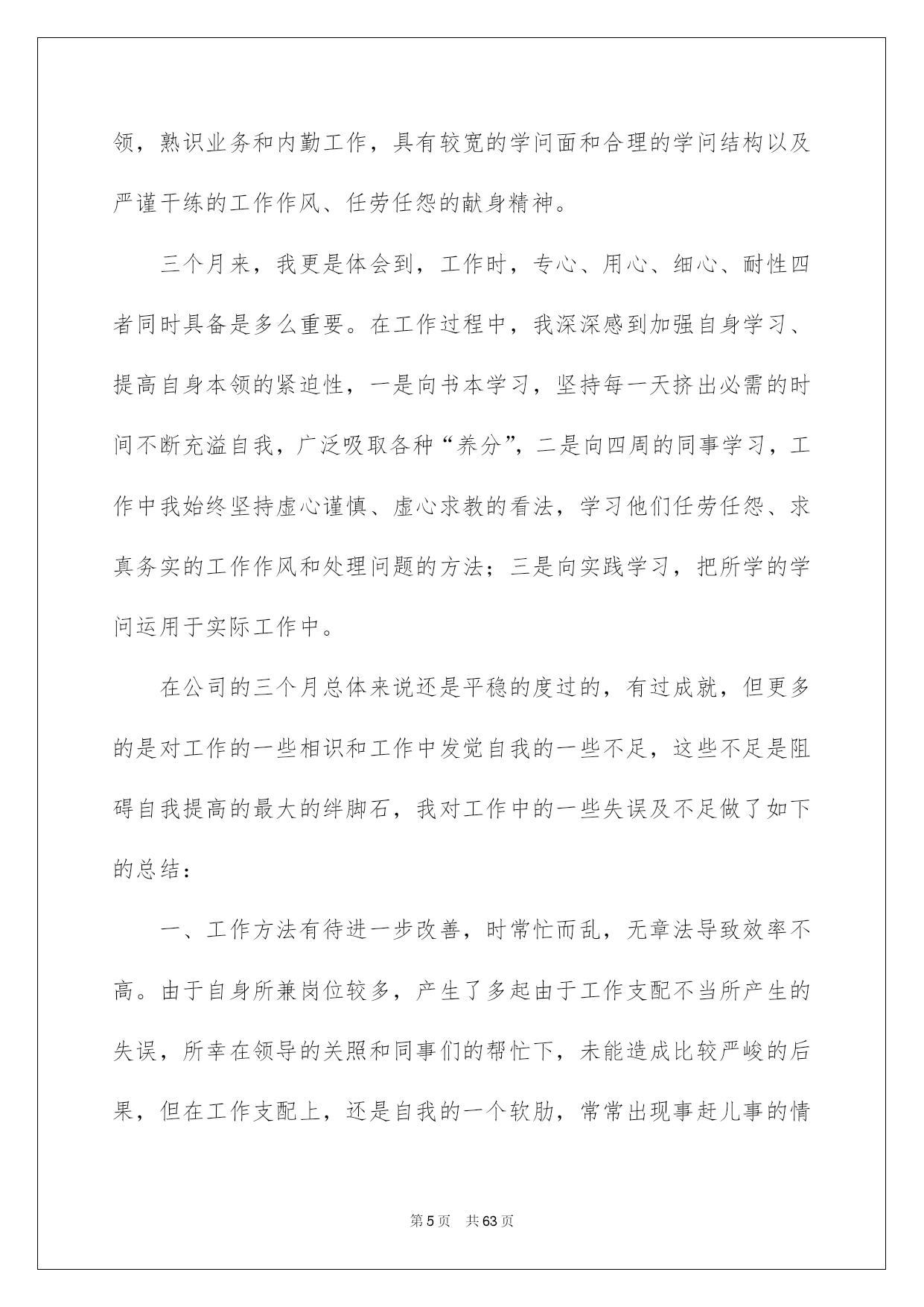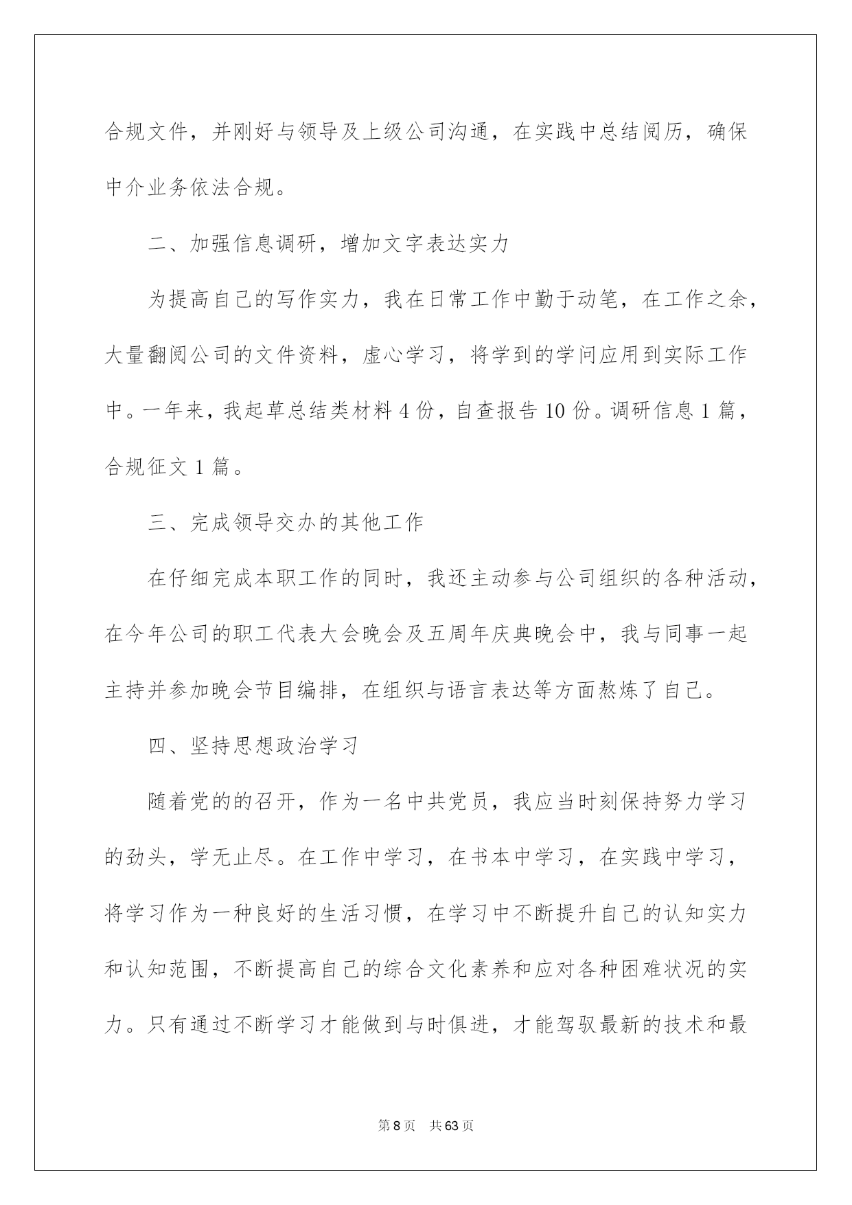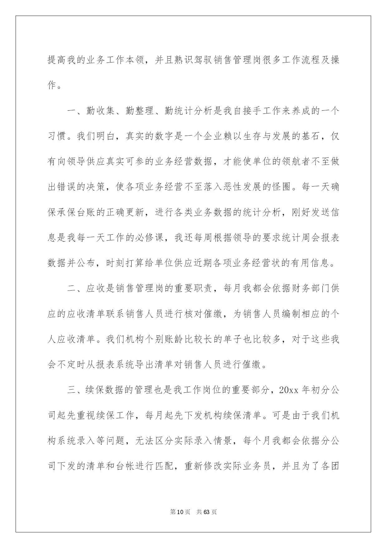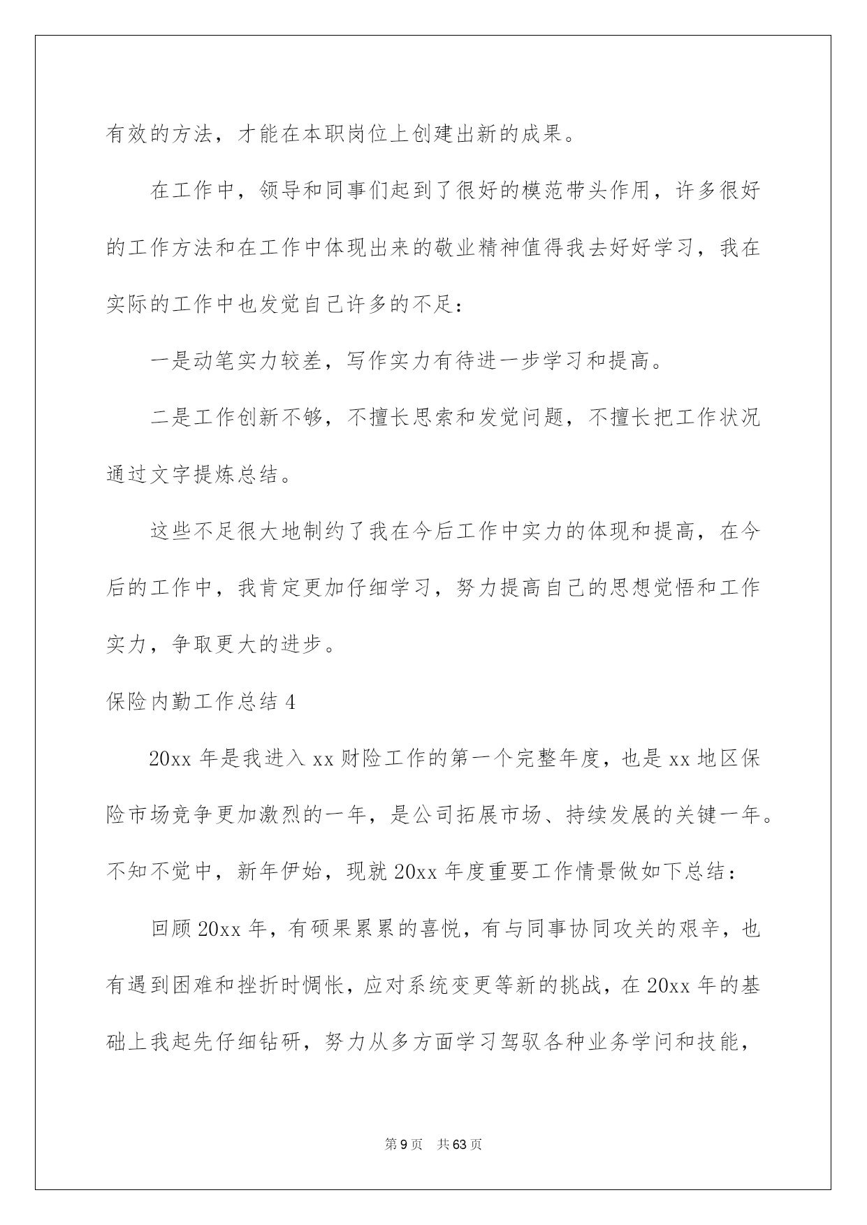 第PAGE\*Arabic\*MERGEFORMAT63页共NUMPAGES\*Arabic\*MERGEFORMAT63页第PAGE\*MERGEFORMAT63页共NUMPAGES\*MERGEFORMAT63页第PAGE\*MERGEFORMAT63页共NUMPAGES\*MERGEFORMAT63页第PAGE\*MERGEFORMAT63页共NUMPAGES\*MERGEFORMAT63页第PAGE\*MERGEFORMAT63页共NUMPAGES\*MERGEFORMAT63页第PAGE\*MERGEFORMAT63页共NUMPAGES\*MERGEFORMAT63页第PAGE\*MERGEFORMAT63页共NUMPAGES\*MERGEFORMAT63页第PAGE\*MERGEFORMAT63页共NUMPAGES\*MERGEFORMAT63页第PAGE\*MERGEFORMAT63页共NUMPAGES\*MERGEFORMAT63页第PAGE\*MERGEFORMAT63页共NUMPAGES\*MERGEFORMAT63页第PAGE\*MERGEFORMAT63页共NUMPAGES\*MERGEFORMAT63页2022保险内勤工作总结保险内勤工作总结总结是把肯定阶段内的有关状况分析探讨,做出有指导性结论的书面材料,通过它可以正确相识以往学习和工作中的优缺点,让我们一起仔细地写一份总结吧。那么总结应当包括什么内容呢?以下是我为大家整理的保险内勤工作总结,希望能够帮助到大家。保险内勤工作总结120xx年1月我加入平安,成为平安这个大家庭中的一员。在领导及各位同事的支持帮忙下,我不断加强工作本领,本着对工作精益求精的看法,仔细地完成了自我所担当的各项工作任务,工作本领都取得了相当大的提高,此刻这份工作对于我来说,能够说是得心应手,也为今后的工作和生活打下了良好的基础。下头结合我的详细情景对20xx年的工作做一下小结。一、工作思想方面。进取贯彻公司关于发展的一系列重要指示,与时俱进,勤奋工作,进取仔细参与公司组织的各项学习,并且细心领悟,转化为自我的思想武器。作为一名内勤人员,自我的一言一行也同时代表了公司的形象,所以更要提高自身的素养水平,高标准的要求自我,加强自我的专业学问和技能。同时做到遵纪遵守法律,爱岗敬业,具有剧烈的职责感和事业心。二、业务方面。我主要负责柜面单证的打印和整理归档工作,每到值班周早晨8:30分上班先打扫办公区卫生,月初把所要申领的有价和无价单证数量发邮件向公司财务人员申报,公司单证管理人员每月规定1号和16号为我们的领单日,每次只能申领半个月的用单量。我在申领时都要依据近期的客户出单数估算出下半个月的一个数量来申领,尽量做到不断单。每次单证寄到,先把它们以25份为一个单位用橡皮筋捆好,盖上公司的保单特地章,做好标注。其实打一张车险很简洁,也不是一项比较困难的技术活,一共就五样东西,发票、交强险保单、标记、商业险保单、保卡,打完附上一份商业险条款装进保险封袋赐予投保人就能够了,可是须要足够的细心和耐性,客户多的时候还要仔细细致检查,防止装错单,削减不必要的麻烦。剩下的事情就是整理打过的单子,少投保单的补投保单,少告知书补打告知书,假如有证件不足的先将其剔除,待业务员补齐资料后以25份为一单位录入归档清单表格进行系统内归档处理,归档好的客户资料装入牛皮纸档案盒(4套为一盒)标注好盒号和归档号放入档案柜进行保存。每一天的工作就是打单、打单、再打单,理单、理单、再理单。我的工作资料虽然味同嚼蜡,可是我深知我的工作是公司业务环节中的重要一环,必需要仔细工作,全力以赴。这几年保险市场竞争非常激烈,我们坐前台的就应在售前服务方面做到尽可能的让客户满足。三、工作中做的好的方面1、立足全局与整体,从宏观层面切入问题的思索,较好处理整体与局部、大我与小我的关系,遇事能从大局探讨。2、心态平和,为人谦和,处世进取,有良好的人际关系。四、工作中的不足1、限于阅历与眼界,还须加强政治修养与行业、业务探讨,仔细学习业务学问,战胜自我,提升自我。2、须加强与人沟通的本领。3、须加强应变本领。总结一年的工作,尽管有了必需的提高和成果,但在一些方面还存在着不足。比如有创建性的工作思路还不是许多,个别工作做的还不够完善,这有待于在今后的工作中加以改善。在新的一年里,在工作中,我经过努力学习和不断摸索,收获非常大,我坚信工作只要专心努力去做,就必需能够做好。信任自我在销售内勤的平台上能够有一个很好的发展,并且能为公司的发展多做贡献。保险内勤工作总结2进入公司已经三个月了,三