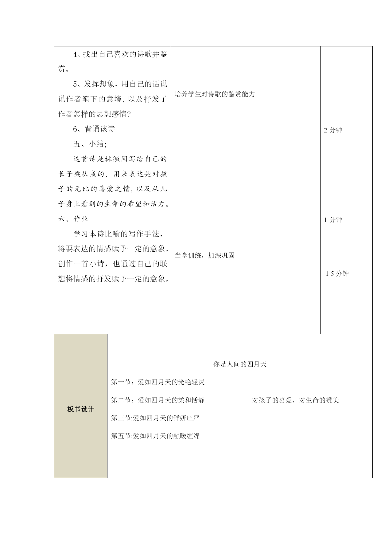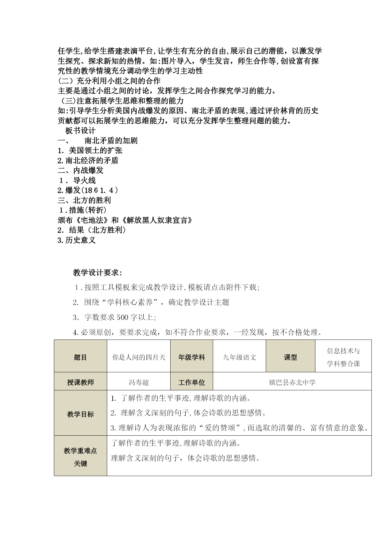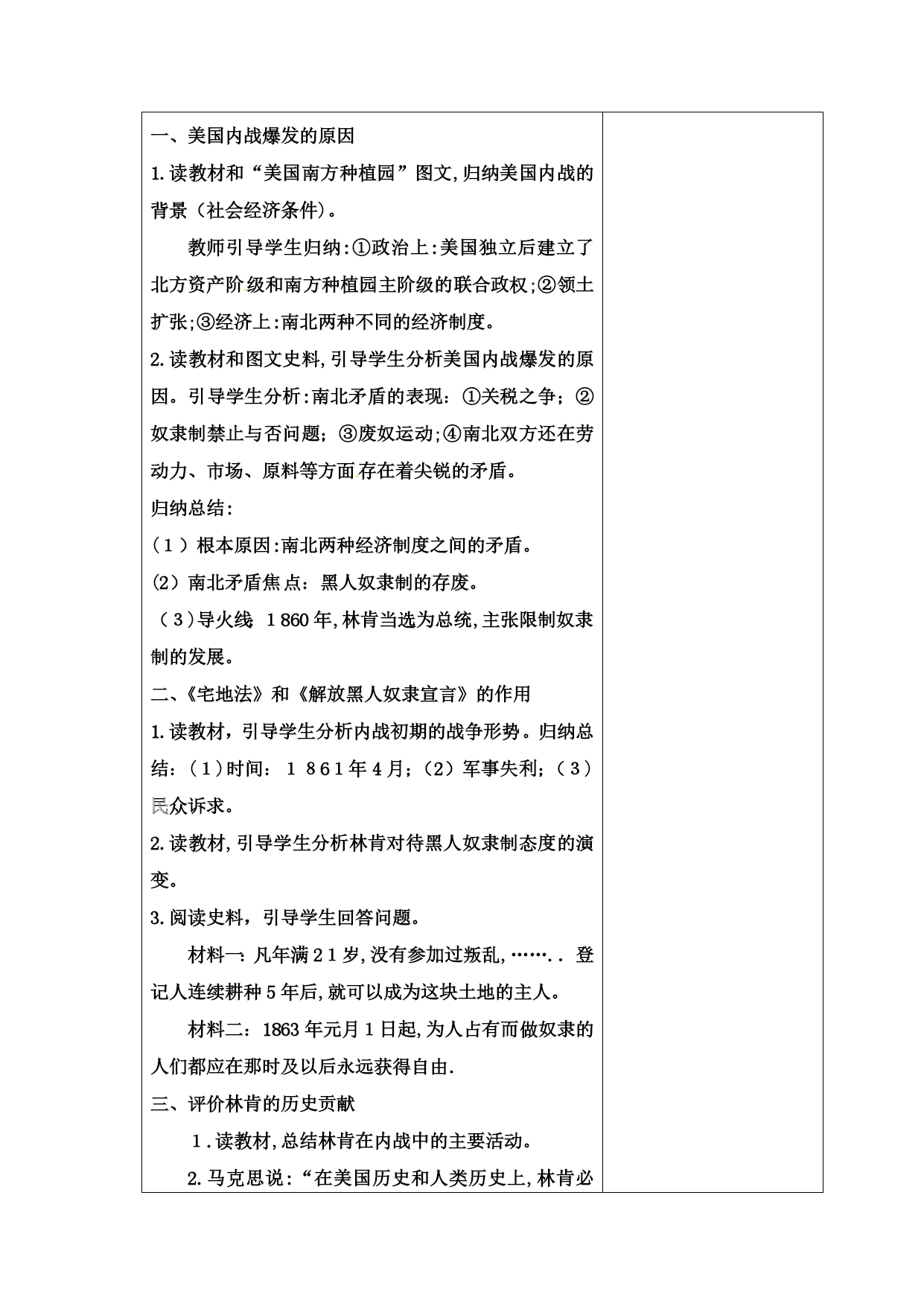 课题第3课美国内战一、课前系统(一)教材分析本课时教学以初中《世界历史》教学大纲、课程标准以及本课的教学内容为依据。通过美国内战相关知识点的分析,以点带面,概述了美国内战的原因经过和历史意义。通过小组讨论,认识这两部法律在内战中的作用;结合林肯的历史活动,学会评价历史人物的方法,使学生认识到人心向背是战争胜利与否的关键,同时个人作用也是不可忽视。本部分为三大板块,第一部分是南北矛盾的加剧;第二部分的内容是内战爆发;第三部分的内容是北方的胜利。本单元的内容在世界历史是资本主义制度的加强,美国维护了国家统一,废除了奴隶制,清除了资本主义发展的最大障碍,为以后经济的迅速发展创造了条件。(二)学生分析我校是乡镇中学,学生大部分来自农村,因而对知识掌握的全面性以及对问题分析的透彻性可能比不上来自城市的学生,但这里的学生很用功,课余时间都能根据教师的要求,搜集有关的课外知识,以配合教师上好课,达到更好的教学效果。在教与学的过程中,对于要发挥自己见解,以及要讲解有关的课外知识的时候,部分学生不够大胆回答问题,需要教师的鼓励。学生们求知欲都很强,很想了解世界各地的历史。(三)教学目标:1.知道内战爆发的原因、过程、意义以及林肯在美国历史上的地位等基本史实;了解《宅地法》《解放黑人奴隶宣言》等重要文件。2.通过小组讨论,认识这两部法律在内战中的作用;结合林肯的历史活动,学会评价历史人物的方法3.使学生认识到人心向背是战争胜利与否的关键,同时个人作用也是不可忽视。(四)教学重点和难点:重点:美国内战爆发的原因、历史意义;林肯为维护国家统一所作出的历史贡献。难点:美国内战前南北两种经济方式的矛盾。二、教学过程教学过程集体备课个性备课第课时导入新课美国有线电视C-SPAN分别于2000年、2009年和2017年对一个由美国历史学家组成的研究小组进行三次问卷调查。结果显示林肯在最伟大的美国总统中排名第一位。二、教学过程一、美国内战爆发的原因1.读教材和“美国南方种植园”图文,归纳美国内战的背景(社会经济条件)。[来源:学|科|网]教师引导学生归纳:①政治上:美国独立后建立了北方资产阶级和南方种植园主阶级的联合政权;②领土扩张;③经济上:南北两种不同的经济制度。2.读教材和图文史料,引导学生分析美国内战爆发的原因。引导学生分析:南北矛盾的表现:①关税之争;②奴隶制禁止与否问题;③废奴运动;④南北双方还在劳动力、市场、原料等方面存在着尖锐的矛盾。归纳总结:(1)根本原因:南北两种经济制度之间的矛盾。(2)南北矛盾焦点:黑人奴隶制的存废。(3)导火线:1860年,林肯当选为总统,主张限制奴隶制的发展。二、《宅地法》和《解放黑人奴隶宣言》的作用1.读教材,引导学生分析内战初期的战争形势。归纳总结:(1)时间:1861年4月;(2)军事失利;(3)民众诉求。[来源:学&科&网]2.读教材,引导学生分析林肯对待黑人奴隶制态度的演变。3.阅读史料,引导学生回答问题。材料一:凡年满21岁,没有参加过叛乱,……..登记人连续耕种5年后,就可以成为这块土地的主人。材料二:1863年元月1日起,为人占有而做奴隶的人们都应在那时及以后永远获得自由.三、评价林肯的历史贡献1.读教材,总结林肯在内战中的主要活动。2.马克思说:“在美国历史和人类历史上,林肯必将与华盛顿齐名。”设问:华盛顿的主要功绩是什么?林肯在美国历史上有何贡献?林肯为维护国家统一和解放黑人奴隶作出了杰出贡献,成为美国历史上的著名总统。四:美国内战的意义美国内战实际上是美国历史上第二次资产阶级革命。2.读教材,帮助学生认识美国内战的历史意义。提示:经过这场战争,美国维护了国家统一,废除了奴隶制,清除了资本主义发展的最大障碍,为以后经济的迅速发展创造了条件。三、课堂总结通过今天的学习我们知道了任何一种社会制度的形成和巩固都不是一件易事,就算是资本主义经济十分发达的美国,如果没有150多年前的那场南北战争,如果北方没有取得胜利,那么它的历史将改写,资本主义经济史或许也将改写。四、课堂检测巩固新知教学反思通过这节课的学习,我们了解,经过这场战争,美国维护了国家统一,废除了奴隶制,清除了资本主义发展的最大障碍,为以后经济的迅速发展创造了条件。三、课后系统课后自评:通过本节课学习,营造了一个和谐、融洽的课堂气氛,充分发挥了学生的主体地位,让课堂成为学生表演的舞台,学生能各抒己见,发表自己的见解。四、教学设计说明本节课主要让学生了解美国内战爆发的原因、过程、意义以及林肯在美国历史上的地位等基本史实;了解《宅地法》《解放黑人奴隶宣言》等重要文件。通过小组讨论,认识这两部法律在内战中的作用;结合林肯的历史活动,学会评价历史人物的方法,