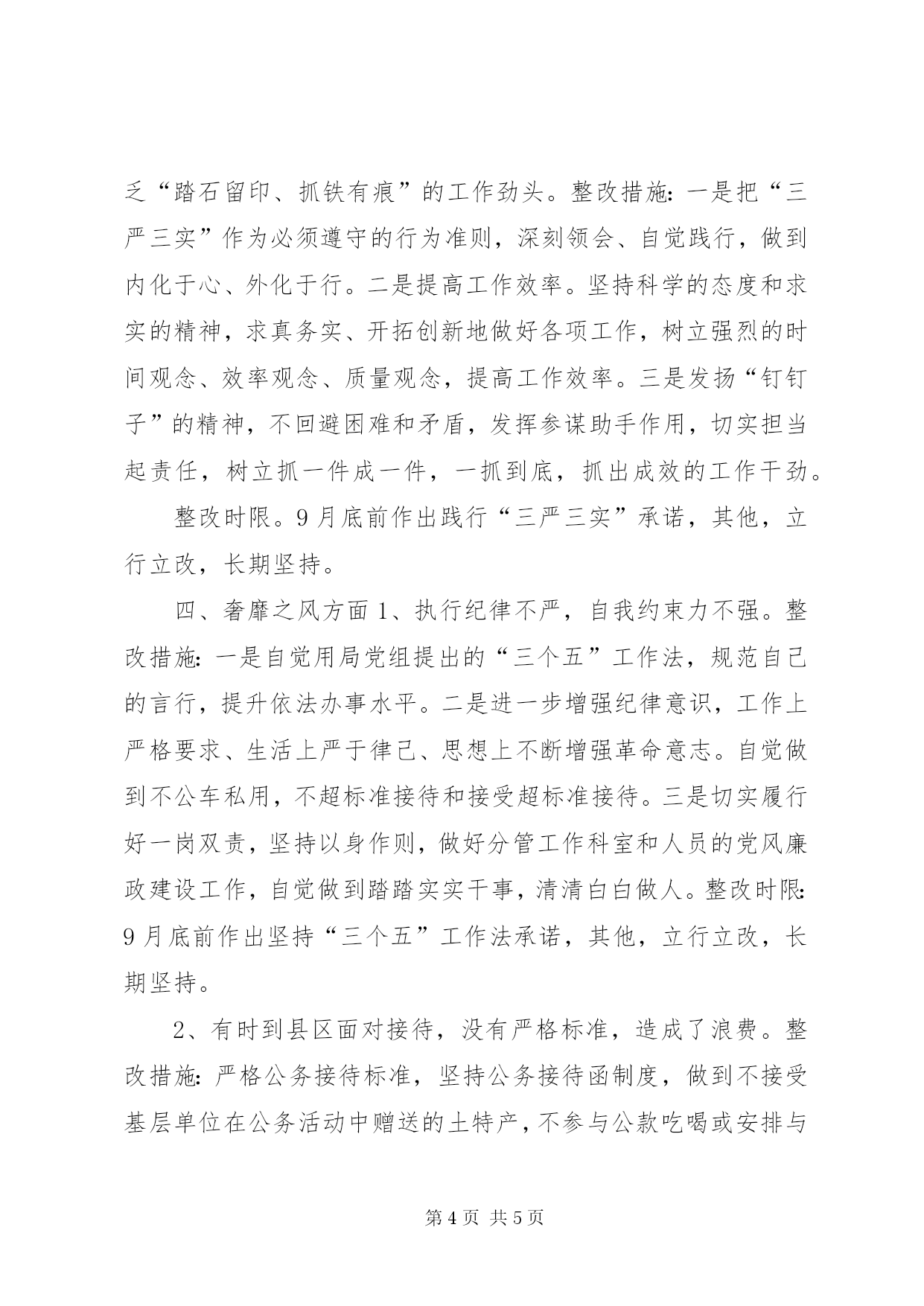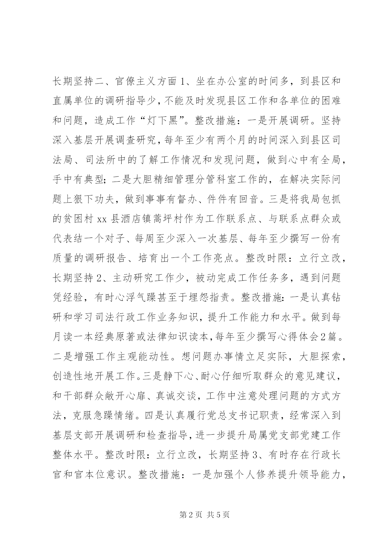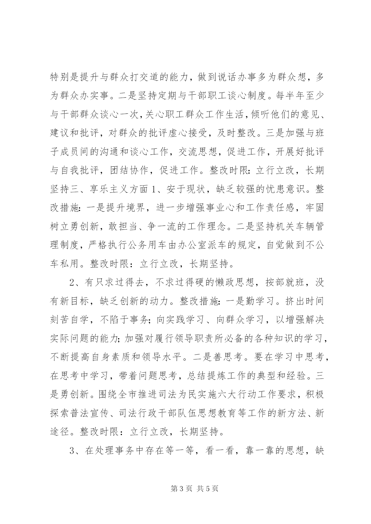 第PAGE\*Arabic\*MERGEFORMAT5页共NUMPAGES\*MERGEFORMAT5页司法局长群众路线个人整改措施通过自已找、群众提、上级点、互相帮,多方征求意见,深入谈心交流,经过认真梳理,自己在“四风”方面存在的问题有11条,其中:形式主义方面2条,官僚主义方面3条,享乐主义方面3条,奢靡之风方面3条。按照市委和局党组教育实践活动的要求,现提出以下整改措施。一、形式主义方面1、工作安排的多,督促检查少,抓落实的力度不足。整改措施:一是一分部署九分落实,对安排部署的工作及时跟踪督办检查,做到对每一项工作都有安排、有检查,确保各项工作落到实处。二是进一步健全完善全市司法行政系统执法警车管理使用有关规定,坚决查处警车违规使用行为。发现警车违规使用问题,坚决严肃查处。整改时限:10月前开展警车违规使用专项整治,其他,立行立改,长期坚持。2、法制宣传教育重形式,针对性不强,效果不佳。整改措施:一是围绕领导干部、公职人员、青少年、农民、企业经营人员等重点普法对象扎实开展“法律六进“活动;二是广泛开展”双百“活动,在全市积极开展百场法制文艺演出和百场法制电影活动,为广大群众提供丰富的法制文化大餐。三是在重要节点,利用手机短信、微博、微信等新兴媒体手段加强对农民工、流动人口的法制宣传教育,满足他们对法律知识的需求。整改时限:9月在中心XX县区开展法制电影进社区活动,其他,立行立改,长期坚持二、官僚主义方面1、坐在办公室的时间多,到县区和直属单位的调研指导少,不能及时发现县区工作和各单位的困难和问题,造成工作“灯下黑”。整改措施:一是开展调研。坚持深入基层开展调查研究,每年至少有两个月的时间深入到县区司法局、司法所中的了解工作情况和发现问题,做到心中有全局,手中有典型;二是大胆精细管理分管科室工作的,在解决实际问题上狠下功夫,做到事事有督办、件件有回音。三是将我局包抓的贫困村xx县酒店镇蒿坪村作为工作联系点、与联系点群众或代表结一个对子、每周至少深入一次基层、每年至少撰写一份有质量的调研报告、培育出一个工作亮点。整改时限:立行立改,长期坚持2、主动研究工作少,被动完成工作任务多,遇到问题凭经验,有时心浮气躁甚至于埋怨指责。整改措施:一是认真钻研和学习司法行政工作业务知识,提升工作能力和水平。做到每月读一本经典原著或法律知识读本,每年至少撰写心得体会2篇。二是增强工作主观能动性。想问题办事情立足实际,大胆探索,创造性地开展工作。三是静下心、耐心仔细听取群众的意见建议,和干部群众敞开心扉、真诚交谈,工作中注意处理问题的方式方法,克服急躁情绪。四是认真履行党总支书记职责,经常深入到基层支部开展调研和检查指导,进一步提升局属党支部党建工作整体水平。整改时限:立行立改,长期坚持3、有时存在行政长官和官本位意识。整改措施:一是加强个人修养提升领导能力,特别是提升与群众打交道的能力,做到说话办事多为群众想,多为群众办实事。二是坚持定期与干部职工谈心制度。每半年至少与干部群众谈心一次,关心职工群众工作生活,倾听他们的意见、建议和批评,对群众的批评虚心接受,及时整改。三是加强与班子成员间的沟通和谈心工作,交流思想,促进工作,开展好批评与自我批评,团结协作,促进工作。整改时限:立行立改,长期坚持三、享乐主义方面1、安于现状,缺乏较强的忧患意识。整改措施:一是提升境界,进一步增强事业心和工作责任感,牢固树立勇创新,敢担当、争一流的工作理念。二是坚持机关车辆管理制度,严格执行公务用车由办公室派车的规定,自觉做到不公车私用。整改时限:立行立改,长期坚持。2、有只求过得去,不求过得硬的懒政思想,按部就班,没有新目标,缺乏创新的动力。整改措施:一是勤学习。挤出时间刻苦自学,不陷于事务;向实践学习、向群众学习,以增强解决实际问题的能力;加强对履行领导职责所必备的各种知识的学习,不断提高自身素质和领导水平。二是善思考。要在学习中思考,在思考中学习,带着问题思考,总结提炼工作的典型和经验。三是勇创新。围绕全市推进司法为民实施六大行动工作要求,积极探索普法宣传、司法行政干部队伍思想教育等工作的新方法、新途径。整改时限:立行立改,长期坚持。3、在处理事务中存在等一等,看一看,靠一靠的思想,缺乏“踏石留印、抓铁有痕”的工作劲头。整改措施:一是把“三严三实”作为必须遵守的行为准则,深刻领会、自觉践行,做到内化于心、外化于行。二是提高工作效率。坚持科学的态度和求实的精神,求真务实、开拓创新地做好各项工作,树立强烈的时间观念、效率观念、质量观念,提高工作效率。三是发扬“钉钉子”的精神,不回避困难和矛盾,发挥参谋助手作用,切实担当起责任,树立抓一件成一件,一抓到底,抓出成效的工作干劲。整改时限。9月底前作出践行“三严三实”承诺,其他,立行立改,长