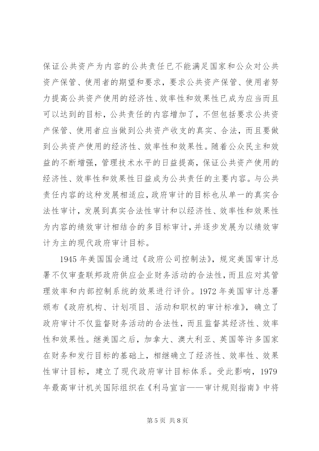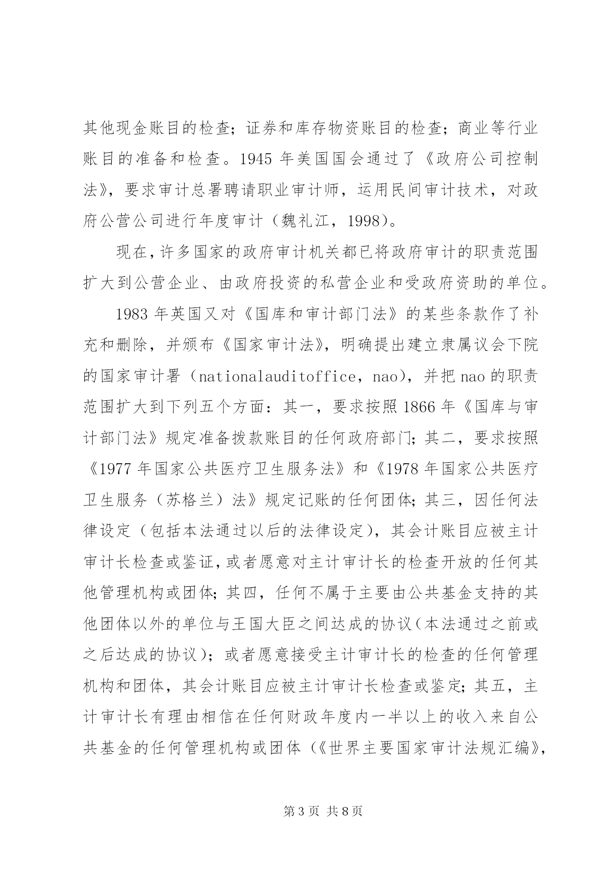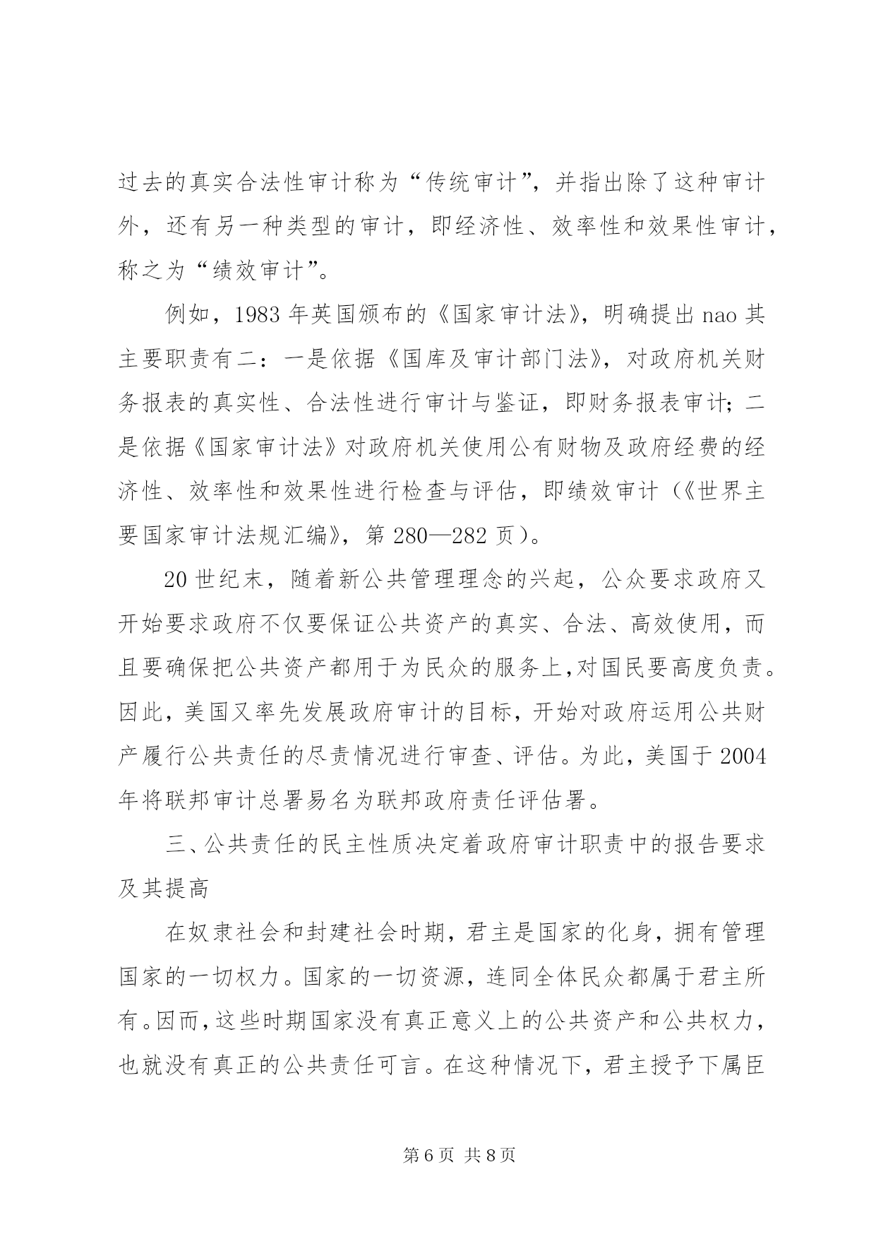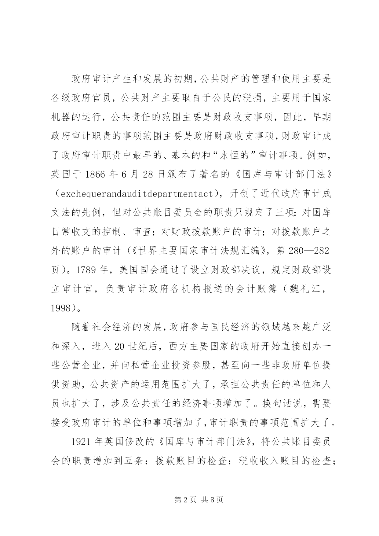 第PAGE\*Arabic\*MERGEFORMAT8页共NUMPAGES\*MERGEFORMAT8页公共责任与审计职责的确立探索【摘要】公共责任的范围及其扩展决定着政府审计职责中的事项范围及其调整,公共责任的要求及其发展决定着政府审计职责中的目标层次及提高,公共责任的民主性质决定着政府审计职责中的报告要求及提高。【关键词】公共责任;政府审计;职责公共责任(publicaccountability),也称公共经济责任、公共受托经济责任、公共会计责任,是指政府及其各部门对公共资产的管理和使用责任。政府审计职责是得到法律确认的审计机关承担的任务和责任,也可以理解为得到法律确认的审计机关所拥有的事权。它包括审计事项范围、审计目标层次和审计报告要求三个方面的内容。现代政府审计是适应监督公共责任的需要而产生的,公共责任关系是现代政府审计存在的客观基础,因此,它对政府审计的影响就是全面的,当然它也深刻地影响着政府审计职责的确定。公共责任决定了政府审计的基本职责就是对公共资产的管理、使用者所承担的公共责任进行监督和报告;界定政府审计职责范围的基本标准就是公共资产所涉及的领域。具体来说,公共责任对政府审计职责的影响主要表现为以下几个方面。一、公共责任的范围及其扩展决定着政府审计职责中的事项范围及其调整政府审计产生和发展的初期,公共财产的管理和使用主要是各级政府官员,公共财产主要取自于公民的税捐,主要用于国家机器的运行,公共责任的范围主要是财政收支事项,因此,早期政府审计职责的事项范围主要是政府财政收支事项,财政审计成了政府审计职责中最早的、基本的和“永恒的”审计事项。例如,英国于1866年6月28日颁布了著名的《国库与审计部门法》(exchequerandauditdepartmentact),开创了近代政府审计成文法的先例,但对公共账目委员会的职责只规定了三项:对国库日常收支的控制、审查;对财政拨款账户的审计;对拨款账户之外的账户的审计(《世界主要国家审计法规汇编》,第280—282页)。1789年,美国国会通过了设立财政部决议,规定财政部设立审计官,负责审计政府各机构报送的会计账簿(魏礼江,1998)。随着社会经济的发展,政府参与国民经济的领域越来越广泛和深入,进入20世纪后,西方主要国家的政府开始直接创办一些公营企业,并向私营企业投资参股,甚至向一些非政府单位提供资助,公共资产的运用范围扩大了,承担公共责任的单位和人员也扩大了,涉及公共责任的经济事项增加了。换句话说,需要接受政府审计的单位和事项增加了,审计职责的事项范围扩大了。1921年英国修改的《国库与审计部门法》,将公共账目委员会的职责增加到五条:拨款账目的检查;税收收入账目的检查;其他现金账目的检查;证券和库存物资账目的检查;商业等行业账目的准备和检查。1945年美国国会通过了《政府公司控制法》,要求审计总署聘请职业审计师,运用民间审计技术,对政府公营公司进行年度审计(魏礼江,1998)。现在,许多国家的政府审计机关都已将政府审计的职责范围扩大到公营企业、由政府投资的私营企业和受政府资助的单位。1983年英国又对《国库和审计部门法》的某些条款作了补充和删除,并颁布《国家审计法》,明确提出建立隶属议会下院的国家审计署(nationalauditoffice,nao),并把nao的职责范围扩大到下列五个方面:其一,要求按照1866年《国库与审计部门法》规定准备拨款账目的任何政府部门;其二,要求按照《1977年国家公共医疗卫生服务法》和《1978年国家公共医疗卫生服务(苏格兰)法》规定记账的任何团体;其三,因任何法律设定(包括本法通过以后的法律设定),其会计账目应被主计审计长检查或鉴证,或者愿意对主计审计长的检查开放的任何其他管理机构或团体;其四,任何不属于主要由公共基金支持的其他团体以外的单位与王国大臣之间达成的协议(本法通过之前或之后达成的协议);或者愿意接受主计审计长的检查的任何管理机构和团体,其会计账目应被主计审计长检查或鉴定;其五,主计审计长有理由相信在任何财政年度内一半以上的收入来自公共基金的任何管理机构或团体(《世界主要国家审计法规汇编》,第280—282页)。最高审计机关国际组织1986年通过的《关于绩效审计、公营企业审计和审计质量的总声明》中提出:“在公营企业中,拥有大量的国家资金、政府投资和其他资源,须有充分的公共责任,此项责任只有经过最高审计机关的审计才能得到保证。最高审计机关应当确保将其职责范围扩展到对所有公营企业进行审计,它包括由企业创办的附属机构在内。”该组织1979年通过的《利马宣言——审计规则指南》中明确了最该审计机关有权对有政府投资的私营企业和受政府资助的单位进行审计(魏礼江,1998)。到了20世纪80年代之后,美国的绩效