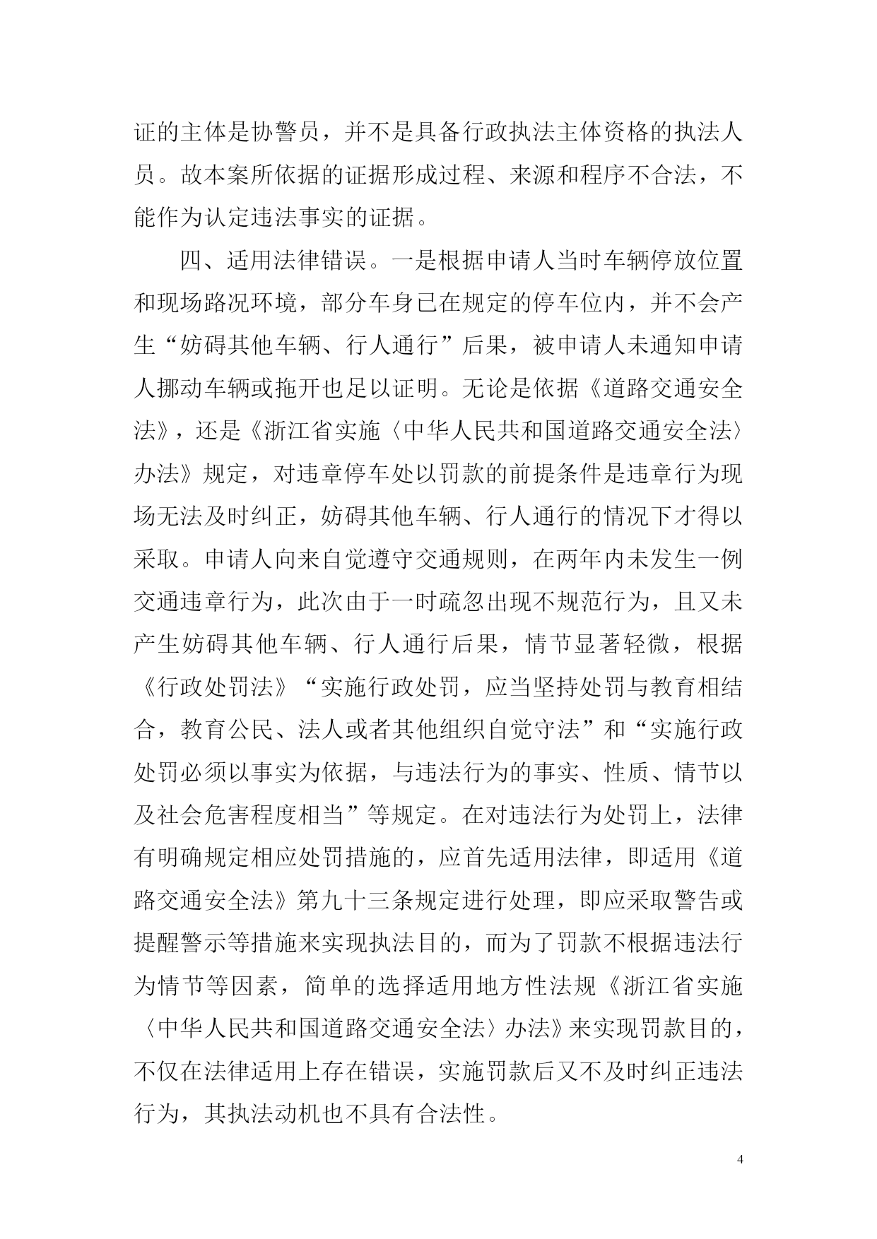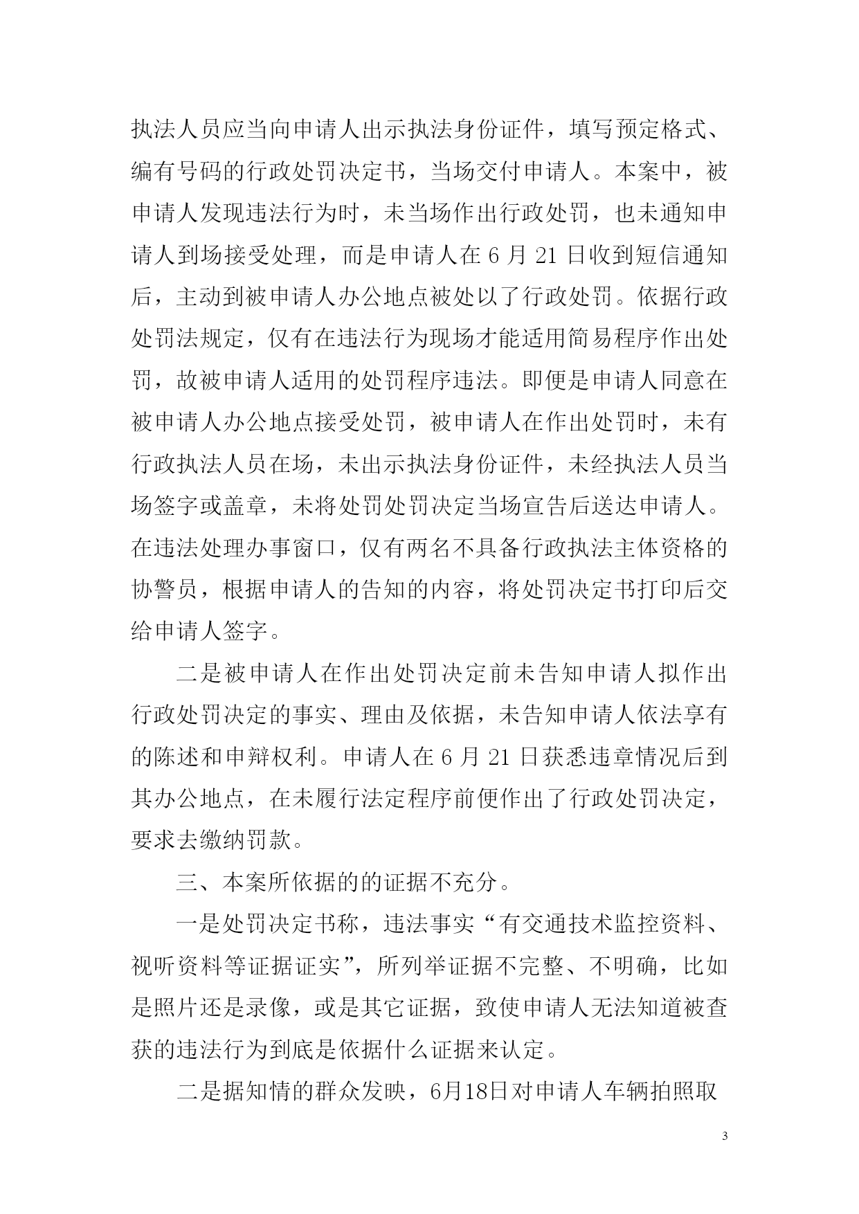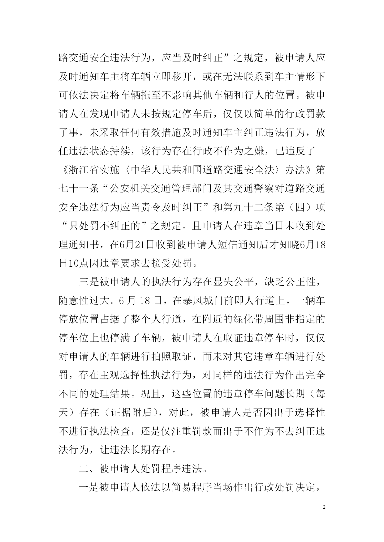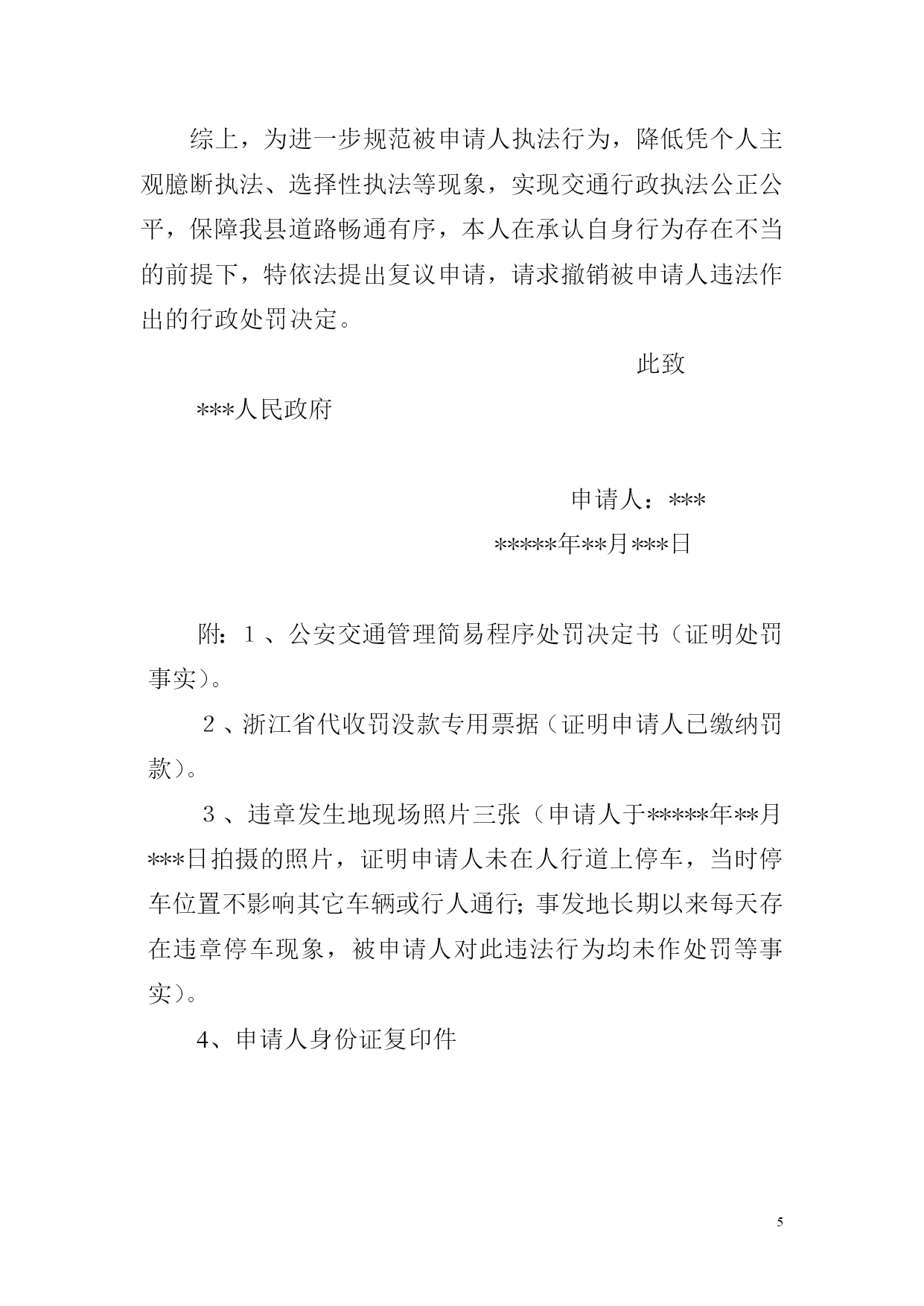 PAGEPAGE5交通违章行政处罚复议申请书申请人:***,男,****年**月***日出生,住址*************,联系电话*********。被申请人:***公安局交通警察大队住所地:***********法定代表人:***,大队长。复议请求请求撤销编号3310211000851211号公安交通管理简易程序处罚决定书。事实与理由被申请人认定的未按规定停车,影响其它车辆和行人通行的事实不清。一是2010年6月18日,***路暴风城路停放的车辆较为拥护,已无多余的停车位置,即便是在绿化带周围非停车位也停满了车辆。为不妨碍其它车辆或行人通行,经仔细观察后在***路暴风城正面紧接着一辆多出一半停车位的车辆后停车,车辆前身在规定的停车位内,由于划定的人行道不规范,车辆后身距人行道1米外,但未占用人行道位置,车身后部周围遗留空间较大,并不存在影响其他车辆和行人通行的可能。故被申请人认定的违章事实不清,缺乏依据。二是被申请人执法行为违反道路交通法律法规立法精神和相应规定。如果被申请人认定存在影响其它车辆和行人通行的事实成立,那么根据交通行政执法目的和《道路交通安全法》第86条“公安机关交通管理部门及其交通警察对道路交通安全违法行为,应当及时纠正”之规定,被申请人应及时通知车主将车辆立即移开,或在无法联系到车主情形下可依法决定将车辆拖至不影响其他车辆和行人的位置。被申请人在发现申请人未按规定停车后,仅仅以简单的行政罚款了事,未采取任何有效措施及时通知车主纠正违法行为,放任违法状态持续,该行为存在行政不作为之嫌,已违反了《浙江省实施〈中华人民共和国道路交通安全法〉办法》第七十一条“公安机关交通管理部门及其交通警察对道路交通安全违法行为应当责令及时纠正”和第九十二条第(四)项“只处罚不纠正的”之规定。且申请人在违章当日未收到处理通知书,在6月21日收到被申请人短信通知后才知晓6月18日10点因违章要求去接受处罚。三是被申请人的执法行为存在显失公平,缺乏公正性,随意性过大。6月18日,在暴风城门前即人行道上,一辆车停放位置占据了整个人行道,在附近的绿化带周围非指定的停车位上也停满了车辆,被申请人在取证违章停车时,仅仅对申请人的车辆进行拍照取证,而未对其它违章车辆进行处罚,存在主观选择性执法行为,对同样的违法行为作出完全不同的处理结果。况且,这些位置的违章停车问题长期(每天)存在(证据附后),对此,被申请人是否因出于选择性不进行执法检查,还是仅注重罚款而出于不作为不去纠正违法行为,让违法长期存在。二、被申请人处罚程序违法。一是被申请人依法以简易程序当场作出行政处罚决定,执法人员应当向申请人出示执法身份证件,填写预定格式、编有号码的行政处罚决定书,当场交付申请人。本案中,被申请人发现违法行为时,未当场作出行政处罚,也未通知申请人到场接受处理,而是申请人在6月21日收到短信通知后,主动到被申请人办公地点被处以了行政处罚。依据行政处罚法规定,仅有在违法行为现场才能适用简易程序作出处罚,故被申请人适用的处罚程序违法。即便是申请人同意在被申请人办公地点接受处罚,被申请人在作出处罚时,未有行政执法人员在场,未出示执法身份证件,未经执法人员当场签字或盖章,未将处罚处罚决定当场宣告后送达申请人。在违法处理办事窗口,仅有两名不具备行政执法主体资格的协警员,根据申请人的告知的内容,将处罚决定书打印后交给申请人签字。二是被申请人在作出处罚决定前未告知申请人拟作出行政处罚决定的事实、理由及依据,未告知申请人依法享有的陈述和申辩权利。申请人在6月21日获悉违章情况后到其办公地点,在未履行法定程序前便作出了行政处罚决定,要求去缴纳罚款。三、本案所依据的的证据不充分。一是处罚决定书称,违法事实“有交通技术监控资料、视听资料等证据证实”,所列举证据不完整、不明确,比如是照片还是录像,或是其它证据,致使申请人无法知道被查获的违法行为到底是依据什么证据来认定。二是据知情的群众发映,6月18日对申请人车辆拍照取证的主体是协警员,并不是具备行政执法主体资格的执法人员。故本案所依据的证据形成过程、来源和程序不合法,不能作为认定违法事实的证据。适用法律错误。一是根据申请人当时车辆停放位置和现场路况环境,部分车身已在规定的停车位内,并不会产生“妨碍其他车辆、行人通行”后果,被申请人未通知申请人挪动车辆或拖开也足以证明。无论是依据《道路交通安全法》,还是《浙江省实施〈中华人民共和国道路交通安全法〉办法》规定,对违章停车处以罚款的前提条件是违章行为现场无法及时纠正,妨碍其他车辆、行人通行的情况下才得以采取。申请人向来自觉遵守交通规则,在两年内未发生一例交通违章行为,此次由于一时疏忽出现不规范行为,且又未产生妨碍其他车辆、行人