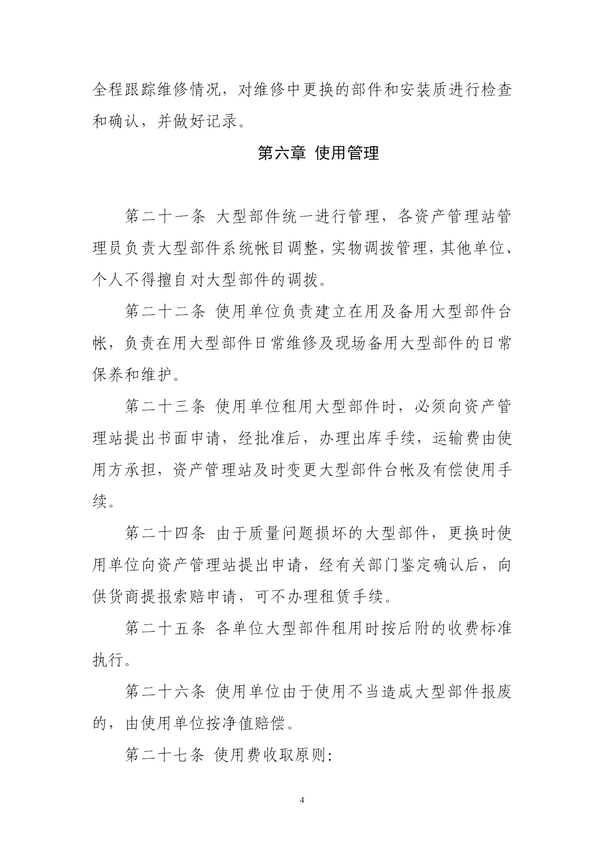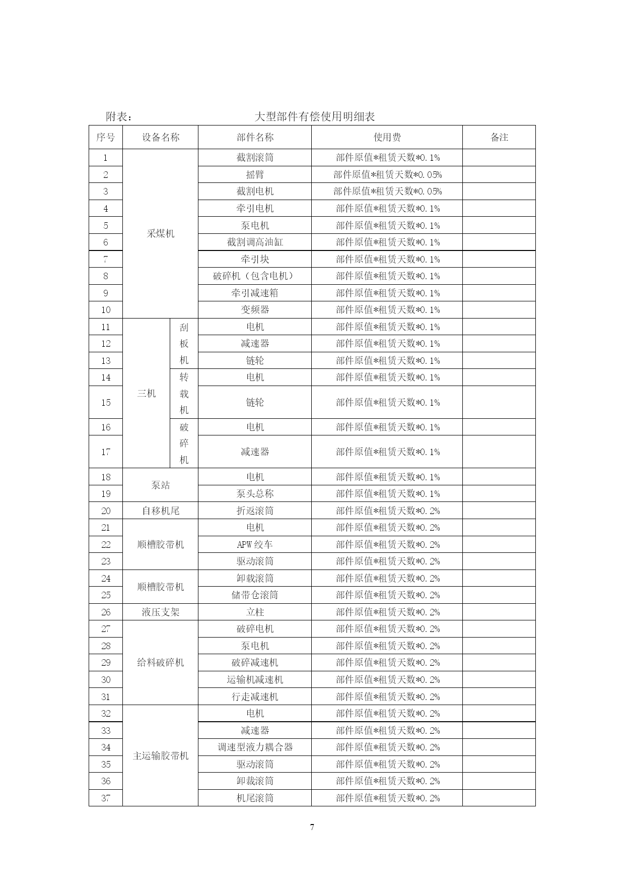 PAGEPAGE8机电设备大型部件管理及有偿使用办法(试行)第一章总则第一条为了加强公司各资产管理站对储备库的大型部件的管理,提高大型部件使用率,保障生产,特制定本办法。第二条本办法适用于伊东煤炭公司所属各生产矿井。第三条大型部件:综采、主运、洗选系统中重要设备部件,指具有可修复性,能重复使用,价值昂贵的部件。具体范围如下:1、采煤机:截割电机、减速器、牵引箱、摇臂、调高油缸、变频器。2、主运皮带机:电机和配套的减速器及各种滚筒。3、工作面运输机转载机:电机减速器、链轮组件。(大型部件明细详见附表)第四条大型部件由资产管理部管理,矿区资产站储备,生产单位申请有偿租用,其它部件由生产单位按配件自行储备。第二章职责第五条资产管理部负责大型部件采购计划协议的签订及全寿命管理。第六条物资供应部负责大型部件的采购、验收。第七条各矿区资产管理站负责储备库大型部件的储备,负责配合使用单位对部件的保养。第三章前期管理第八条大型部件需订货时,使用单位编制建议计划,报资产管理部组织相关部门审核后上报公司。第九条公司批准大型部件购置计划后,由资产管理部签订购货合同(指代储代销商品),物资供应部执行采购程序。第十条资产管理部每季对大型部件库存、期货、使用情况进行调研,分类汇总,根据实际需要及时编制购置计划和维修计划,组织有关部门和单位审核后上报公司。大型部件购置,出库列专项资金。第十一条物资供应部每周向资产管理部反馈大型部件采购,到货情况。第四章验收管理第十二条新到大型部件由物资供应部组织相关单位验收,验收不合格的大型部件不予办理结算等手续,各资产管理站负责建立大型部件台帐。第十三条使用单位返回的大型部件由各资产管理站组织使用单位共同验收。第十四条外委修复的大型部件,由资产管理部组织有关部门人员,承修单位共同验收,验收合格后由资产管理站负责保管。第十五条使用单位从大型部件投运后三天内,应返回旧件,并将部件清理干净,交到指定地点,特殊情况不能按时返回,使用单位需向资产管理站提出申请,经同意后方可延迟。第五章维修管理第十六条大型部件的日常维修保养由使用单位负责,发生的费用由使用单位承担。第十七条使用中的大型部件需要大修时,使用单位提出申请,经资产管理部确认,可更换完好的大型部件。更换后待修的大型部件,由资产管理部统一委托维修单位进行维修。第十八条大型部件的大修由资产管理部组织使用单位确定大修计划,并与委托维修单位签订大修合同。第十九条大型部件维修费用进入大修专项资金,由于违反操作规程,维护不当,发生的维修费由使用单位承担。第二十条大型部件维修过程中,资产管理部安排专人全程跟踪维修情况,对维修中更换的部件和安装质进行检查和确认,并做好记录。第六章使用管理第二十一条大型部件统一进行管理,各资产管理站管理员负责大型部件系统帐目调整,实物调拨管理,其他单位、个人不得擅自对大型部件的调拨。第二十二条使用单位负责建立在用及备用大型部件台帐,负责在用大型部件日常维修及现场备用大型部件的日常保养和维护。第二十三条使用单位租用大型部件时,必须向资产管理站提出书面申请,经批准后,办理出库手续,运输费由使用方承担,资产管理站及时变更大型部件台帐及有偿使用手续。第二十四条由于质量问题损坏的大型部件,更换时使用单位向资产管理站提出申请,经有关部门鉴定确认后,向供货商提报索赔申请,可不办理租赁手续。第二十五条各单位大型部件租用时按后附的收费标准执行。第二十六条使用单位由于使用不当造成大型部件报废的,由使用单位按净值赔偿。第二十七条使用费收取原则:1、综采设备:部件原值大于100万元日使用费=部件原值×0.05%部件原值小于100万元日使用费=部件原值×0.1%2、皮带运输系统设备部件日使用费=部件原值×0.2%3、煤机截割滚筒、摇臂、三机链轮日使用费=部件原值×0.1%4、退租前(部件安排大修)累计收费总额不超过部件原值60%。如部件没有维修价值直接报废,收费总额为100%。5、租用大修后的部件,日折旧费收取标准与租用新部件相同,退租前的累计收费标准按新部件的40%计算。第二十八条大型部件利用大修专项资金,安排大修参考的条件:1、租用费达到60%;2、工作面推进量或过煤量:一般采煤机部件按照工作面推进量达到数值安排大修,运输设备部件按照过煤量达到数值安排大修。第二十九条矿区资产管理站应全面跟踪大型部件的使用情况,切实掌握大部件及配套设备的工作环境和使用操作情况,为合理的安排部件的大修和提高大型部件的管理质量提供基础资料。第七章报废及处置第三十条资产管理站根据大型部件使用情况,定期向公司提交报废申请,经公司有关部门人员鉴定后按相关办法处置。第八章奖励