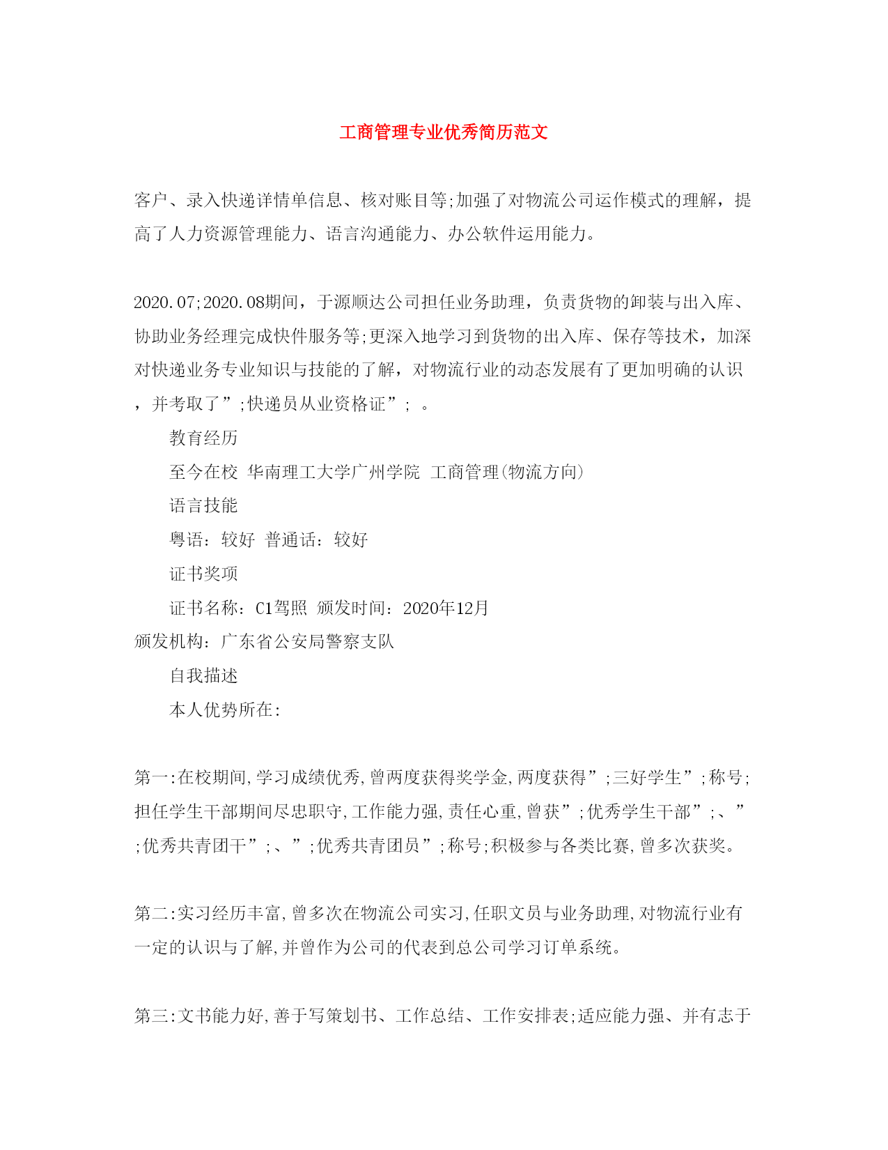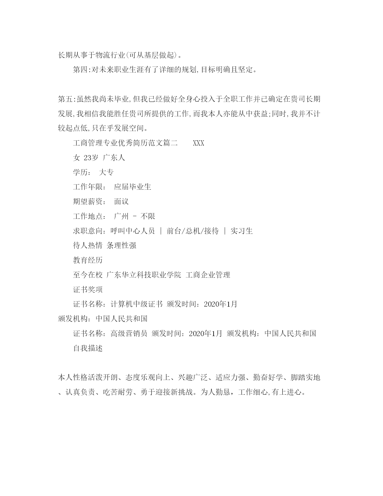 此资料由网络收集而来,如有侵权请告知上传者立即删除。资料共分享,我们负责传递知识。工商管理专业优秀简历范文客户、录入快递详情单信息、核对账目等;加强了对物流公司运作模式的理解,提高了人力资源管理能力、语言沟通能力、办公软件运用能力。2020.07;2020.08期间,于源顺达公司担任业务助理,负责货物的卸装与出入库、协助业务经理完成快件服务等;更深入地学习到货物的出入库、保存等技术,加深对快递业务专业知识与技能的了解,对物流行业的动态发展有了更加明确的认识,并考取了”;快递员从业资格证”;。教育经历至今在校华南理工大学广州学院工商管理(物流方向)语言技能粤语:较好普通话:较好证书奖项证书名称:C1驾照颁发时间:2020年12月颁发机构:广东省公安局警察支队自我描述本人优势所在:第一:在校期间,学习成绩优秀,曾两度获得奖学金,两度获得”;三好学生”;称号;担任学生干部期间尽忠职守,工作能力强,责任心重,曾获”;优秀学生干部”;、”;优秀共青团干”;、”;优秀共青团员”;称号;积极参与各类比赛,曾多次获奖。第二:实习经历丰富,曾多次在物流公司实习,任职文员与业务助理,对物流行业有一定的认识与了解,并曾作为公司的代表到总公司学习订单系统。第三:文书能力好,善于写策划书、工作总结、工作安排表;适应能力强、并有志于长期从事于物流行业(可从基层做起)。第四:对未来职业生涯有了详细的规划,目标明确且坚定。第五:虽然我尚未毕业,但我已经做好全身心投入于全职工作并已确定在贵司长期发展,我相信我能胜任贵司所提供的工作,而我本人亦能从中获益;同时,我并不计较起点低,只在乎发展空间。工商管理专业优秀简历范文篇二XXX女23岁广东人学历:大专工作年限:应届毕业生期望薪资:面议工作地点:广州-不限求职意向:呼叫中心人员|前台/总机/接待|实习生待人热情条理性强教育经历至今在校广东华立科技职业学院工商企业管理证书奖项证书名称:计算机中级证书颁发时间:2020年1月颁发机构:中国人民共和国证书名称:高级营销员颁发时间:2020年1月颁发机构:中国人民共和国自我描述本人性格活泼开朗、态度乐观向上、兴趣广泛、适应力强、勤奋好学、脚踏实地、认真负责、吃苦耐劳、勇于迎接新挑战。为人勤恳,工作细心,有上进心。