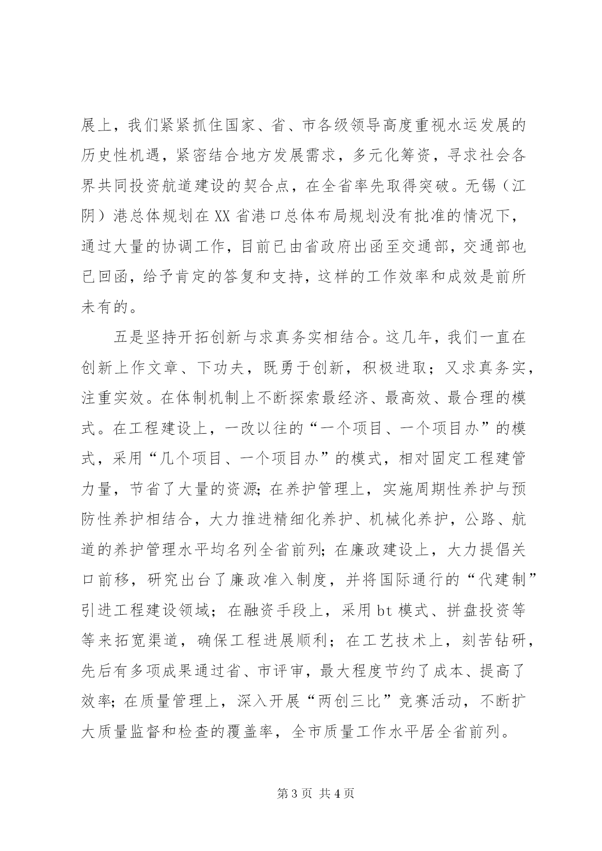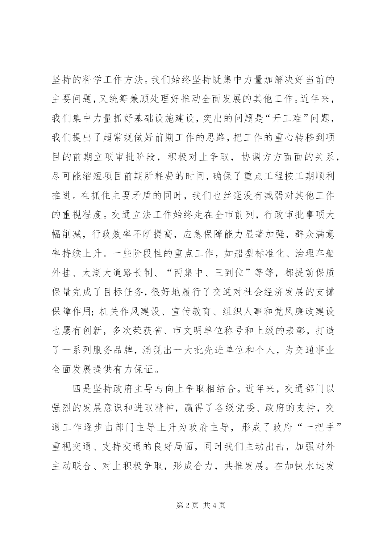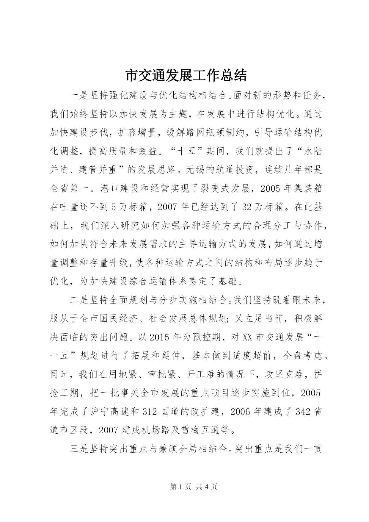 第PAGE\*Arabic\*MERGEFORMAT4页共NUMPAGES\*MERGEFORMAT4页市交通发展工作总结一是坚持强化建设与优化结构相结合。面对新的形势和任务,我们始终坚持以加快发展为主题,在发展中进行结构优化。通过加快建设步伐,扩容增量,缓解路网瓶颈制约,引导运输结构优化调整,提高质量和效益。“十五”期间,我们就提出了“水陆并进、建管并重”的发展思路。无锡的航道投资,连续几年都是全省第一。港口建设和经营实现了裂变式发展,2005年集装箱吞吐量还不到5万标箱,2007年已经达到了32万标箱。在此基础上,我们深入研究如何加强各种运输方式的合理分工与协作,如何加快符合未来发展需求的主导运输方式的发展,如何通过增量调整和存量升级,使各种运输方式之间的结构和布局逐步趋于优化,为加快建设综合运输体系奠定了基础。二是坚持全面规划与分步实施相结合。我们坚持既着眼未来,服从于全市国民经济、社会发展总体规划;又立足当前,积极解决面临的突出问题。以2015年为预控期,对XX市交通发展“十一五”规划进行了拓展和延伸,基本做到适度超前,全盘考虑。同时,我们在用地紧、审批紧、开工难的情况下,攻坚克难,拼抢工期,把一批事关全市发展的重点项目逐步实施到位,2005年完成了沪宁高速和312国道的改扩建,2006年建成了342省道市区段,2007建成机场路及雪梅互通等。三是坚持突出重点与兼顾全局相结合。突出重点是我们一贯坚持的科学工作方法。我们始终坚持既集中力量加解决好当前的主要问题,又统筹兼顾处理好推动全面发展的其他工作。近年来,我们集中力量抓好基础设施建设,突出的问题是“开工难”问题,我们提出了超常规做好前期工作的思路,把工作的重心转移到项目的前期立项审批阶段,积极对上争取,协调方方面面的关系,尽可能缩短项目前期所耗费的时间,确保了重点工程按工期顺利推进。在抓住主要矛盾的同时,我们也丝毫没有减弱对其他工作的重视程度。交通立法工作始终走在全市前列,行政审批事项大幅削减,行政效率不断提高,应急保障能力显著加强,群众满意率持续上升。一些阶段性的重点工作,如船型标准化、治理车船外挂、太湖大道路长制、“两集中、三到位”等等,都提前保质保量完成了目标任务,很好地履行了交通对社会经济发展的支撑保障作用;机关作风建设、宣传教育、组织人事和党风廉政建设也屡有创新,多次荣获省、市文明单位称号和上级的表彰,打造了一系列服务品牌,涌现出一大批先进单位和个人,为交通事业全面发展提供有力保证。四是坚持政府主导与向上争取相结合。近年来,交通部门以强烈的发展意识和进取精神,赢得了各级党委、政府的支持,交通工作逐步由部门主导上升为政府主导,形成了政府“一把手”重视交通、支持交通的良好局面,同时我们主动出击,加强对外主动联合、对上积极争取,形成合力,共推发展。在加快水运发展上,我们紧紧抓住国家、省、市各级领导高度重视水运发展的历史性机遇,紧密结合地方发展需求,多元化筹资,寻求社会各界共同投资航道建设的契合点,在全省率先取得突破。无锡(江阴)港总体规划在XX省港口总体布局规划没有批准的情况下,通过大量的协调工作,目前已由省政府出函至交通部,交通部也已回函,给予肯定的答复和支持,这样的工作效率和成效是前所未有的。五是坚持开拓创新与求真务实相结合。这几年,我们一直在创新上作文章、下功夫,既勇于创新,积极进取;又求真务实,注重实效。在体制机制上不断探索最经济、最高效、最合理的模式。在工程建设上,一改以往的“一个项目、一个项目办”的模式,采用“几个项目、一个项目办”的模式,相对固定工程建管力量,节省了大量的资源;在养护管理上,实施周期性养护与预防性养护相结合,大力推进精细化养护、机械化养护,公路、航道的养护管理水平均名列全省前列;在廉政建设上,大力提倡关口前移,研究出台了廉政准入制度,并将国际通行的“代建制”引进工程建设领域;在融资手段上,采用bt模式、拼盘投资等等来拓宽渠道,确保工程进展顺利;在工艺技术上,刻苦钻研,先后有多项成果通过省、市评审,最大程度节约了成本、提高了效率;在质量管理上,深入开展“两创三比”竞赛活动,不断扩大质量监督和检查的覆盖率,全市质量工作水平居全省前列。六是坚持发展自身与服务社会相结合。这几年,通过同志们的共同努力,交通自身的环境建设也上了新台阶,实力也得到了加强。这为我们更好地服务群众、奉献社会创造了条件。我们按照构建社会主义和谐社会的要求,关注弱势群体、特殊群体,开展了爱心助学、结对帮困、捐衣捐物、农民工平安返乡等活动,充分彰显了交通的人本关怀,尽到了交通的社会责任。