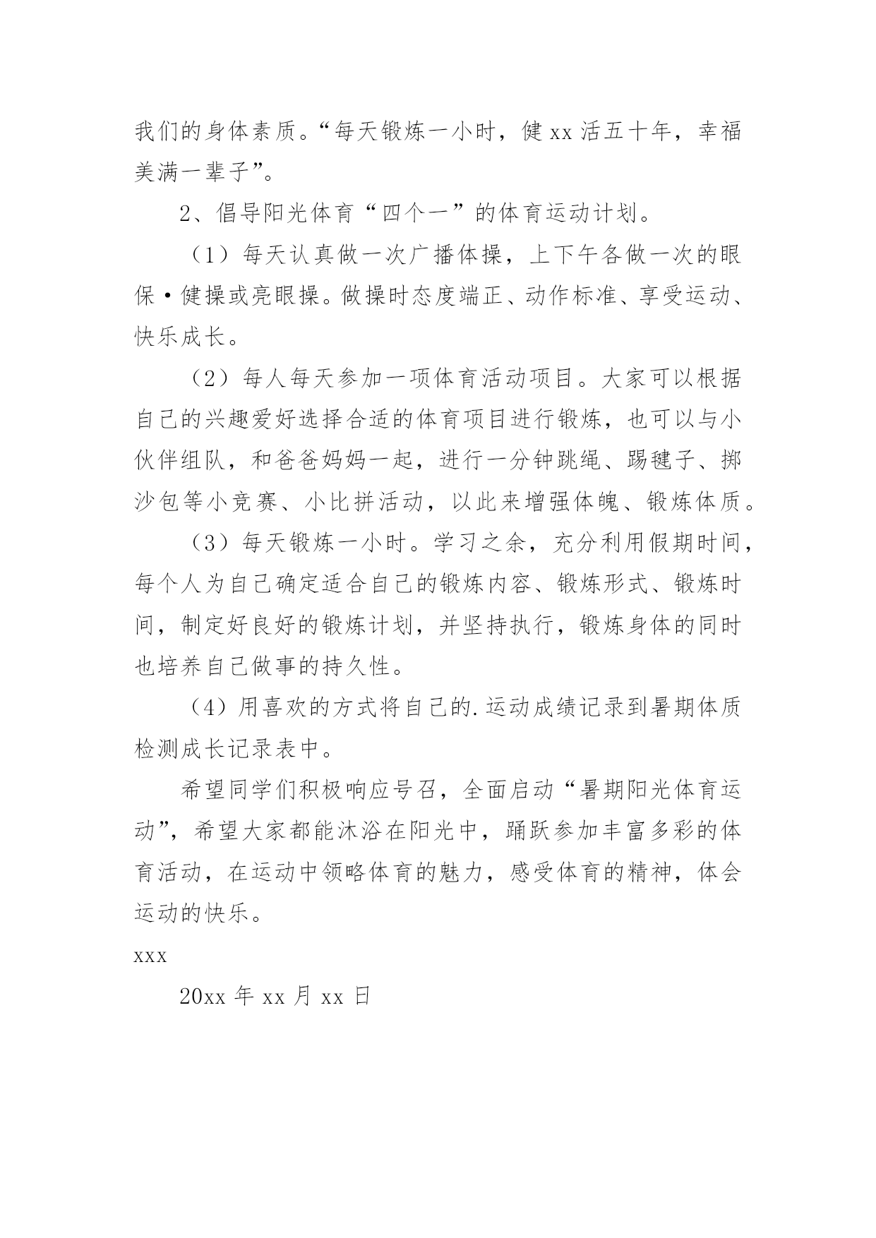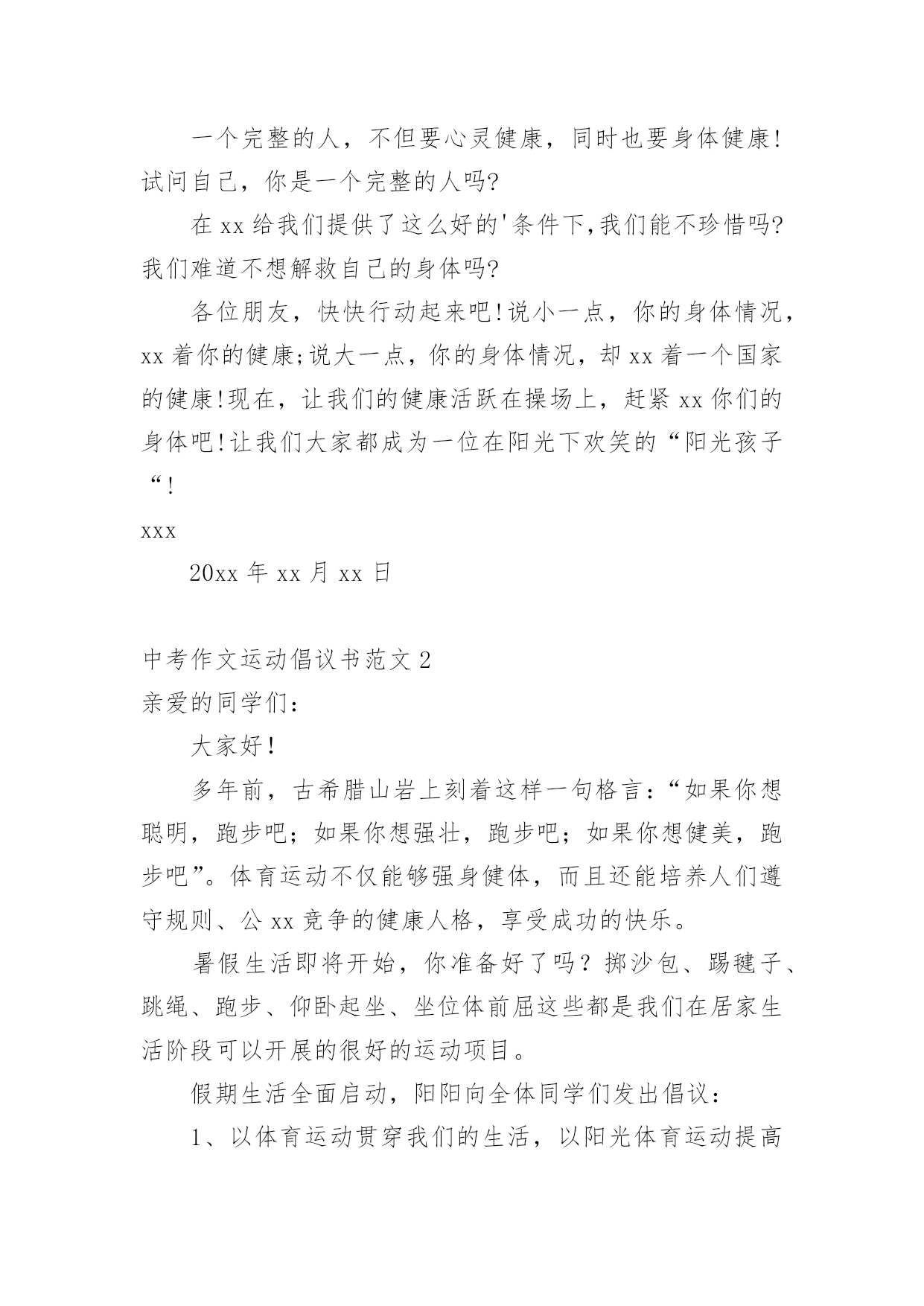 中考作文运动倡议书中考作文运动倡议书范文在现实社会中,在很多情况下我们需要用到倡议书,不同的倡议书内容同样也是不同的。相信很多朋友都对写倡议书感到非常苦恼吧,下面是小编收集整理的中考作文运动倡议书范文,欢迎阅读与收藏。中考作文运动倡议书范文1亲爱的朋友们:上午好!不知大家是否有这种感觉:跑步不到两分钟,就气喘吁吁;楼梯没上几步,就脚软无力;书页没翻几篇,就身心疲惫;作业没做多久,就头昏脑胀……是啊,这正是本该青春蓬勃的我们现在的写照,难道我们就这样算了吗?不!不能xx啊!我们还这么年轻!这么向上!只怪这身体,不能给我们提供更多的能量!但是,在这天气也来恭贺的日子里,也是十万火急的时候,xx给我们送来了温暖与关怀:看看这刚清扫过的干净宽阔的操场;四周音质清透的扬声器;周围绿色青葱的树木;台上满脸慈爱的老师……对!加上一张张稚气活脱的笑脸,呵!是我们的!因为我们好高兴,我们将告别过去疲乏的身体,加入拯救身体的行动了!从今以后,我们将拥抱健康了!一个完整的人,不但要心灵健康,同时也要身体健康!试问自己,你是一个完整的人吗?在xx给我们提供了这么好的'条件下,我们能不珍惜吗?我们难道不想解救自己的身体吗?各位朋友,快快行动起来吧!说小一点,你的身体情况,xx着你的健康;说大一点,你的身体情况,却xx着一个国家的健康!现在,让我们的健康活跃在操场上,赶紧xx你们的身体吧!让我们大家都成为一位在阳光下欢笑的“阳光孩子“!xxx20xx年xx月xx日中考作文运动倡议书范文2亲爱的同学们:大家好!多年前,古希腊山岩上刻着这样一句格言:“如果你想聪明,跑步吧;如果你想强壮,跑步吧;如果你想健美,跑步吧”。体育运动不仅能够强身健体,而且还能培养人们遵守规则、公xx竞争的健康人格,享受成功的快乐。暑假生活即将开始,你准备好了吗?掷沙包、踢毽子、跳绳、跑步、仰卧起坐、坐位体前屈这些都是我们在居家生活阶段可以开展的很好的运动项目。假期生活全面启动,阳阳向全体同学们发出倡议:1、以体育运动贯穿我们的生活,以阳光体育运动提高我们的身体素质。“每天锻炼一小时,健xx活五十年,幸福美满一辈子”。2、倡导阳光体育“四个一”的体育运动计划。(1)每天认真做一次广播体操,上下午各做一次的眼保·健操或亮眼操。做操时态度端正、动作标准、享受运动、快乐成长。(2)每人每天参加一项体育活动项目。大家可以根据自己的兴趣爱好选择合适的体育项目进行锻炼,也可以与小伙伴组队,和爸爸妈妈一起,进行一分钟跳绳、踢毽子、掷沙包等小竞赛、小比拼活动,以此来增强体魄、锻炼体质。(3)每天锻炼一小时。学习之余,充分利用假期时间,每个人为自己确定适合自己的锻炼内容、锻炼形式、锻炼时间,制定好良好的锻炼计划,并坚持执行,锻炼身体的同时也培养自己做事的持久性。(4)用喜欢的方式将自己的.运动成绩记录到暑期体质检测成长记录表中。希望同学们积极响应号召,全面启动“暑期阳光体育运动”,希望大家都能沐浴在阳光中,踊跃参加丰富多彩的体育活动,在运动中领略体育的魅力,感受体育的精神,体会运动的快乐。xxx20xx年xx月xx日